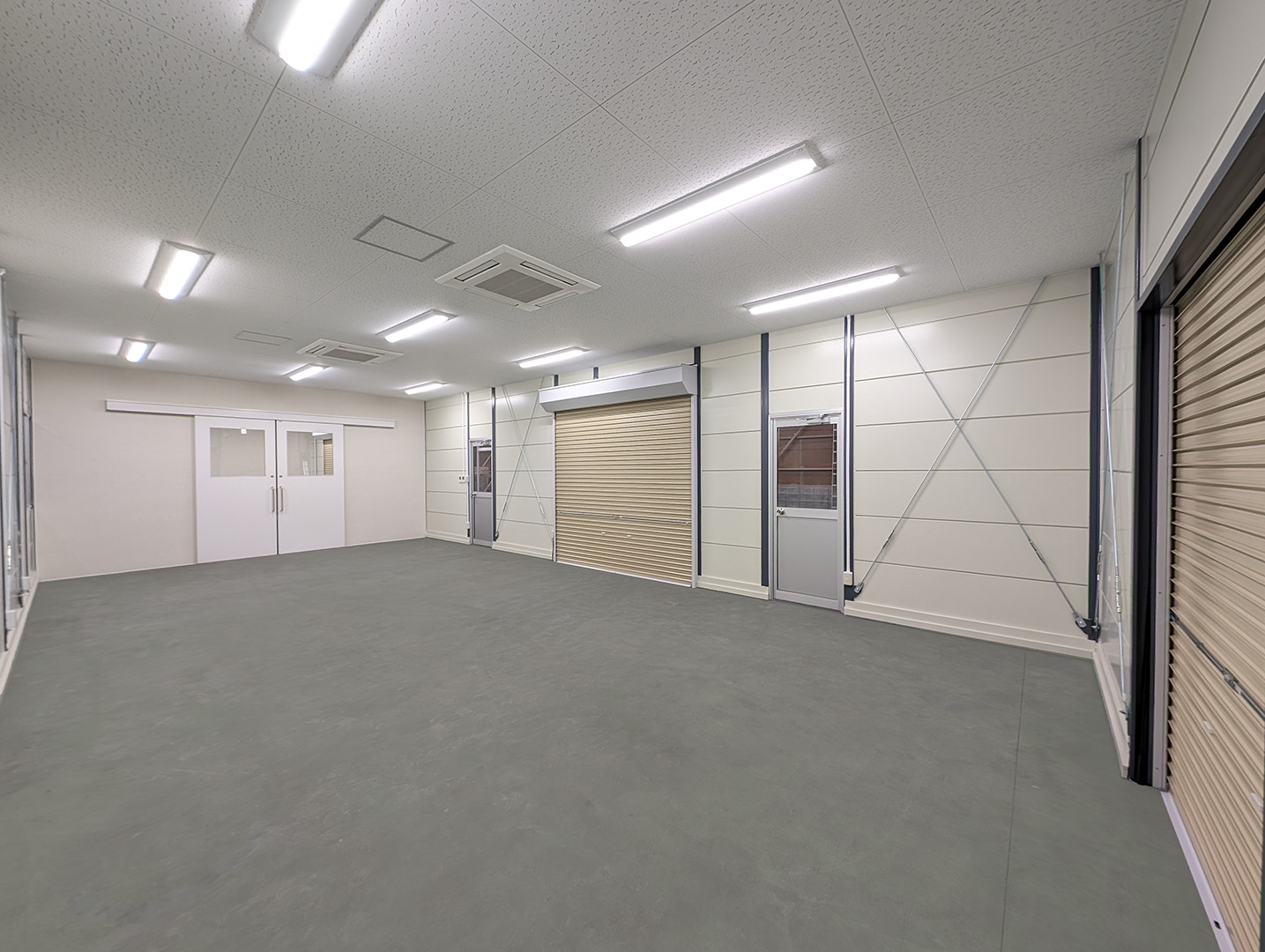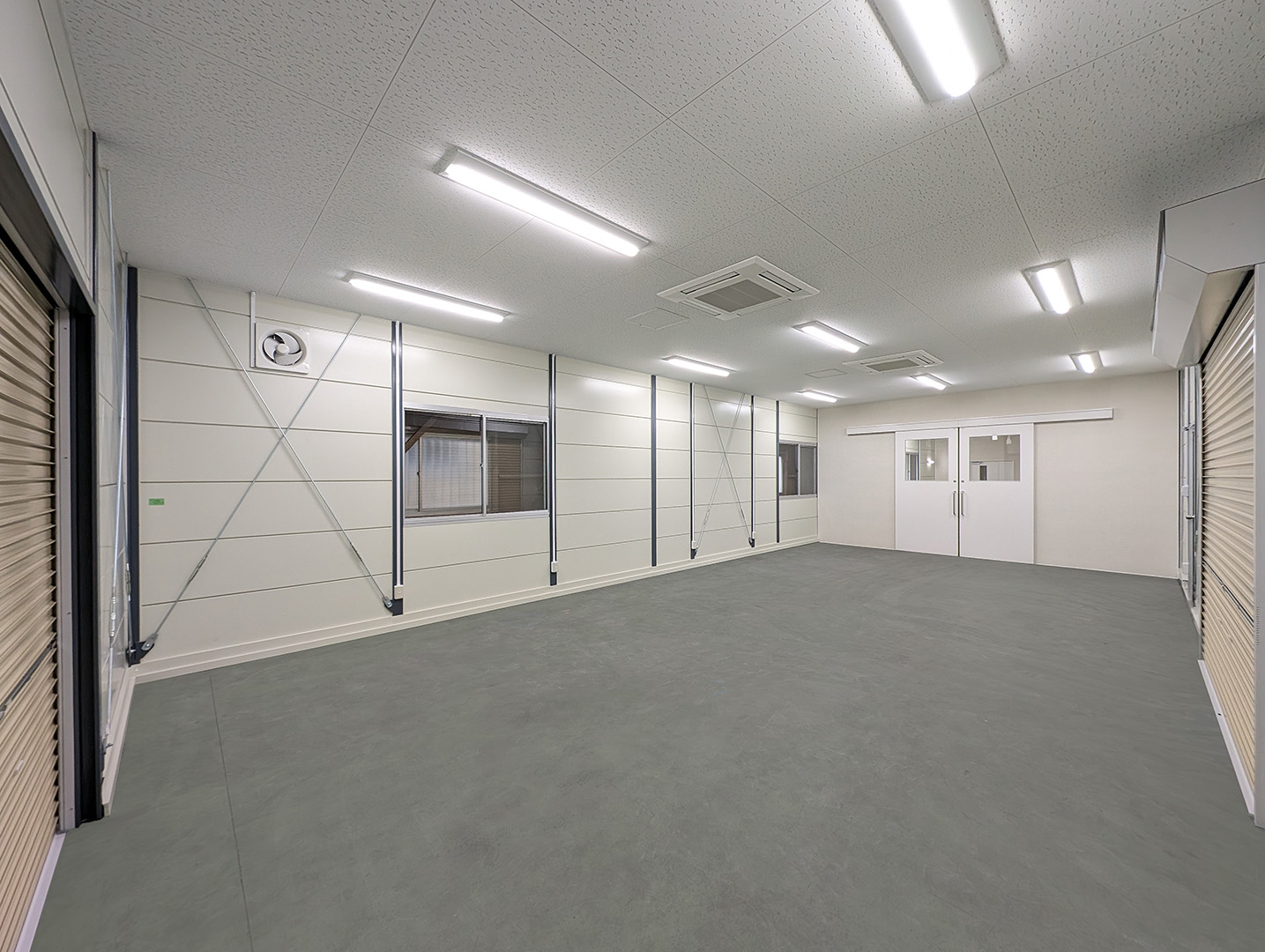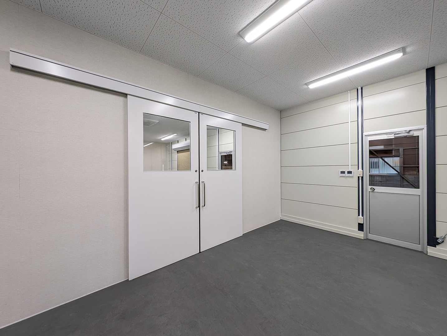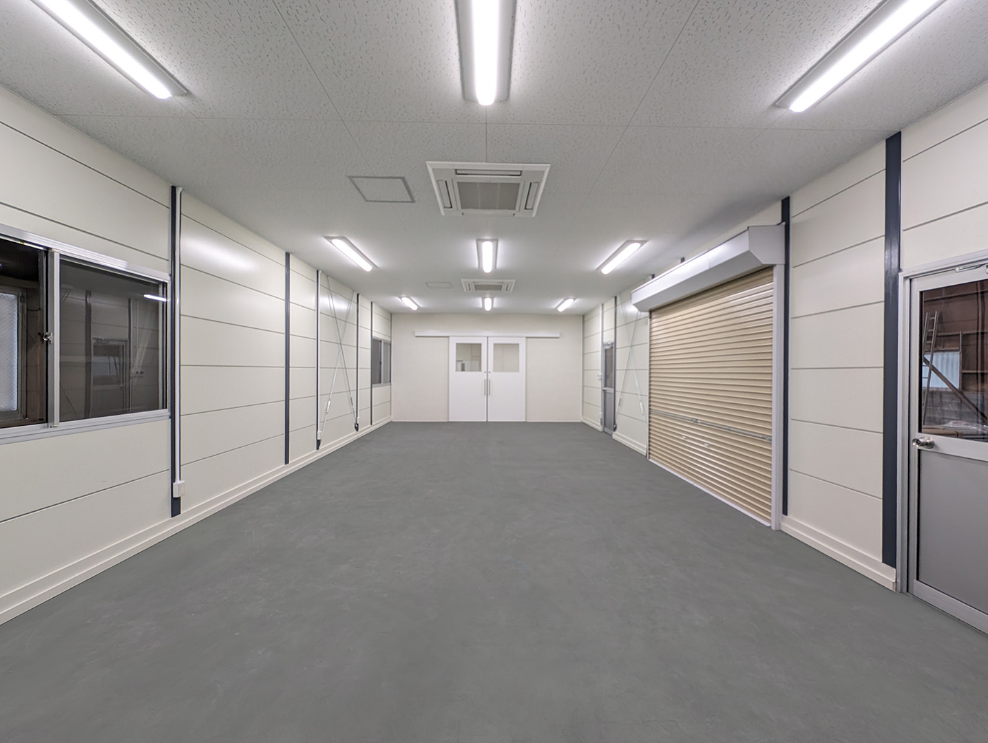 既存の工場内に、従業員用の更衣室と休憩スペースを新設しました。パーテーションによる間仕切りも検討されましたが、ご希望のサイズでは実現が難しいとのことでした。そこで、希望のサイズに対応した設計をご提案するとともに、更衣室の防犯性、休憩スペースの空調効率、室内の明るさにも配慮し、天井付きの設計をご提案。内装は白を基調とし、明るく開放的な空間を演出。外周の建物に合わせて窓を配置し自然光を取り入れることで、閉塞感を軽減しました。天井高は3mを確保し、出入り口には高さ2.4m×幅2.6mの手動シャッターを設置しています。施工にあたっては、工場内のコンクリート床を活かし、アンカーボルトで地面と土台を固定することで 基礎 「基礎」 建物を地面に支える重要な部分です。軽量鉄骨ブレース構造のプレハブ建築では、相性のいい「コンクリート布基礎」がよく採用されます。more 工事を省略。部屋の間には床をフラットにできるハンガー引き戸を採用。台車などでの荷物の運搬に配慮しています。建物内に設置されているため、直接天候等の外部環境の影響を受けにくいという利点を活かし、最小限の部材でコンパクトかつ機能的な設計を実現しました。