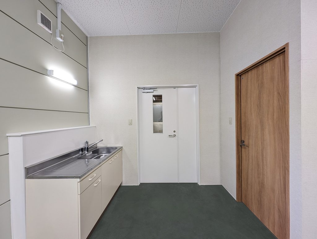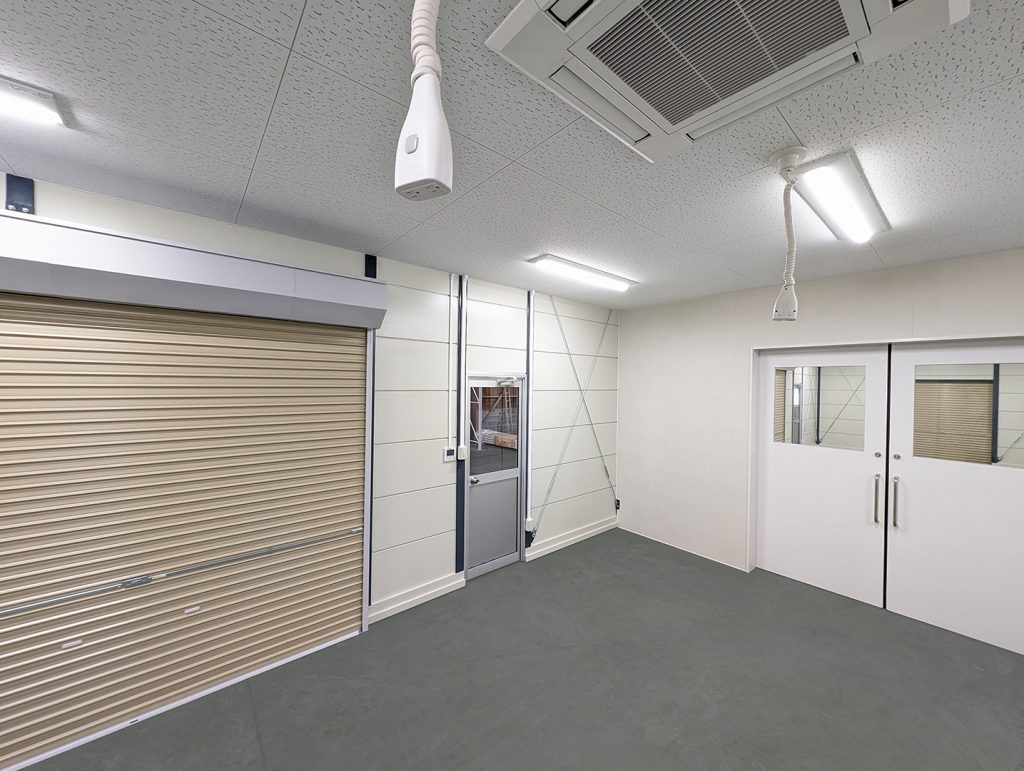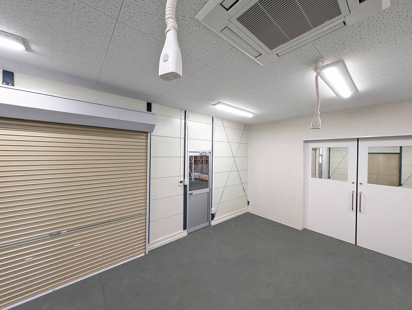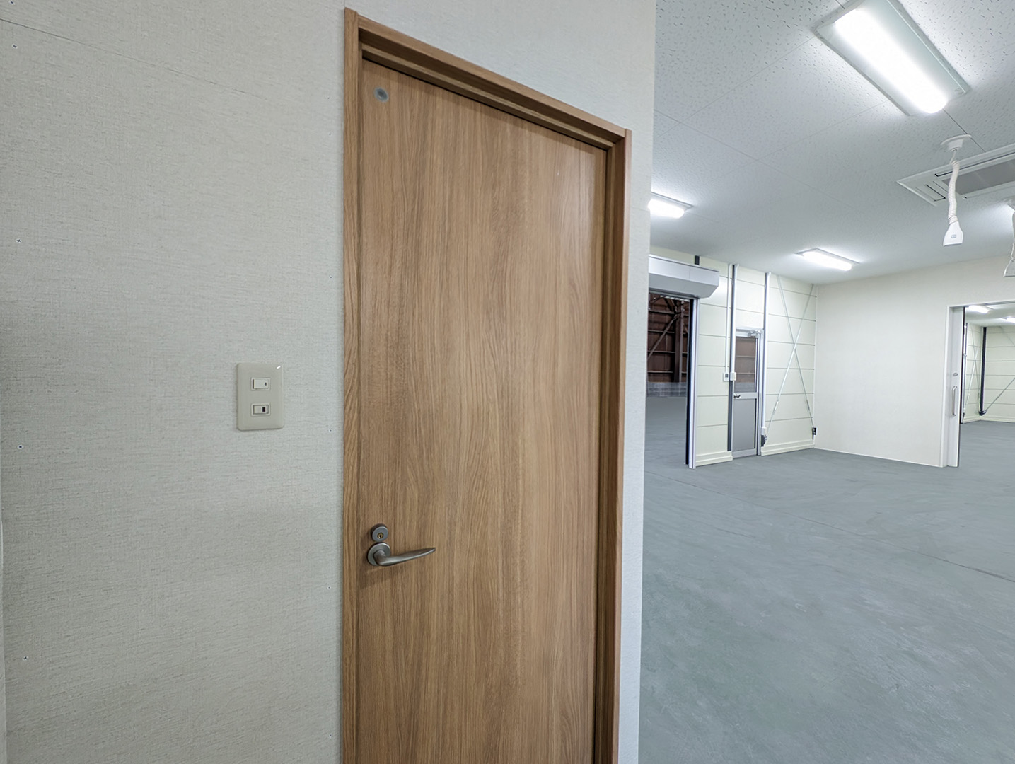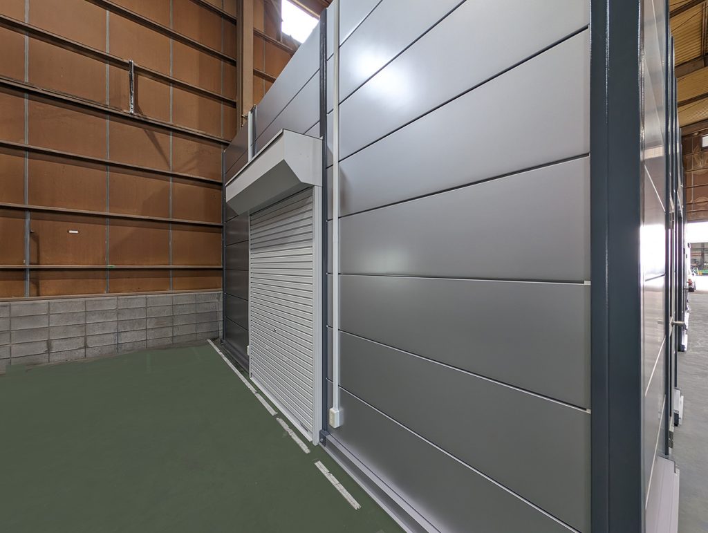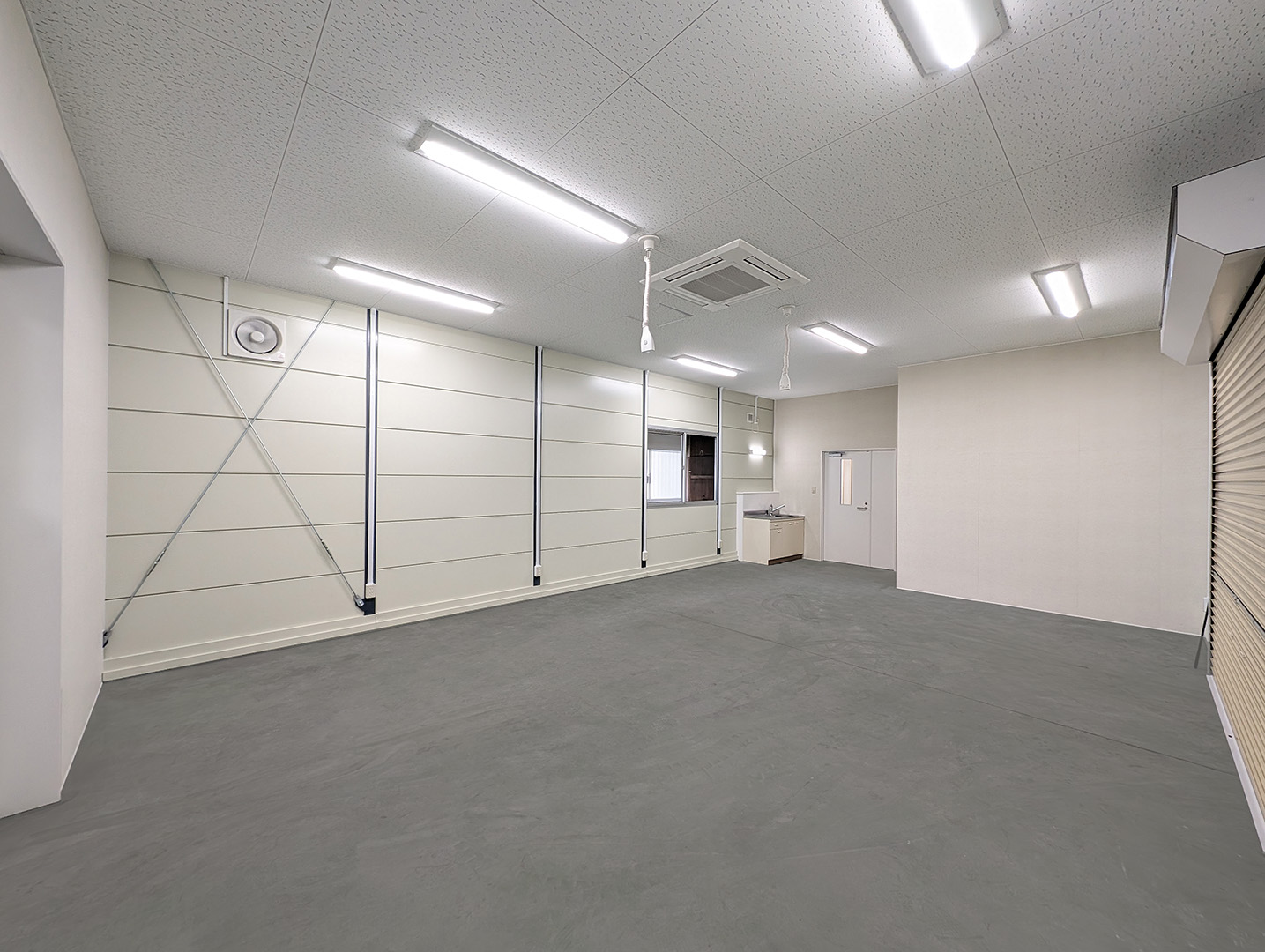 既存の工場内に、従業員用の更衣室と休憩スペースを新設しました。パーテーションによる間仕切りも検討されましたが、ご希望のサイズでは実現が難しいとのことでした。そこで、希望のサイズに対応した設計をご提案するとともに、更衣室の防犯性、休憩スペースの空調効率、室内の明るさにも配慮し、天井付きの設計をご提案。内装は白を基調とし、明るく開放的な空間を演出。外周の建物に合わせて窓を配置し自然光を取り入れることで、閉塞感を軽減しました。天井高は3mを確保し、出入り口には高さ2.4m×幅2.6mの手動シャッターを設置しています。施工にあたっては、工場内のコンクリート床を活かし、アンカーボルトで地面と土台を固定することで 基礎 「基礎」 建物を地面に支える重要な部分です。軽量鉄骨ブレース構造のプレハブ建築では、相性のいい「コンクリート布基礎」がよく採用されます。more 工事を省略。部屋の間には床をフラットにできるハンガー引き戸を採用。台車などでの荷物の運搬に配慮しています。建物内に設置されているため、直接天候等の外部環境の影響を受けにくいという利点を活かし、最小限の部材でコンパクトかつ機能的な設計を実現しました。