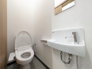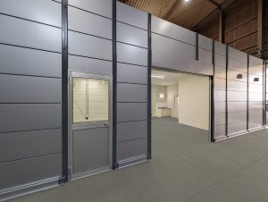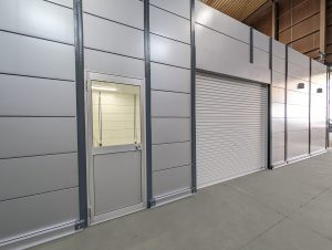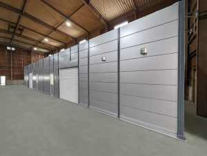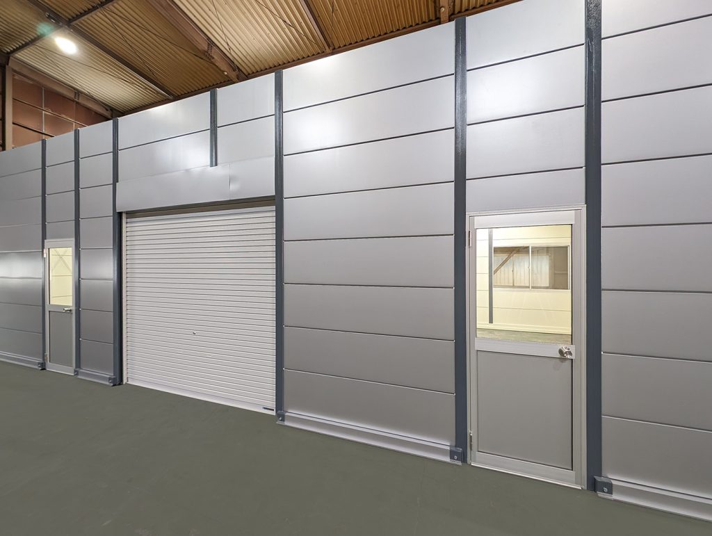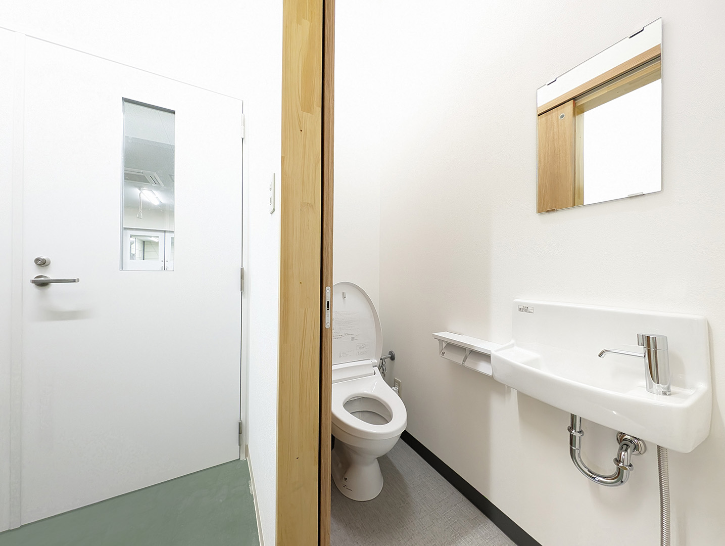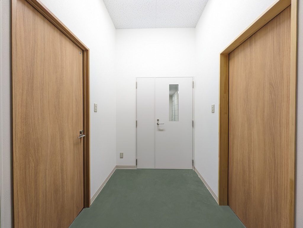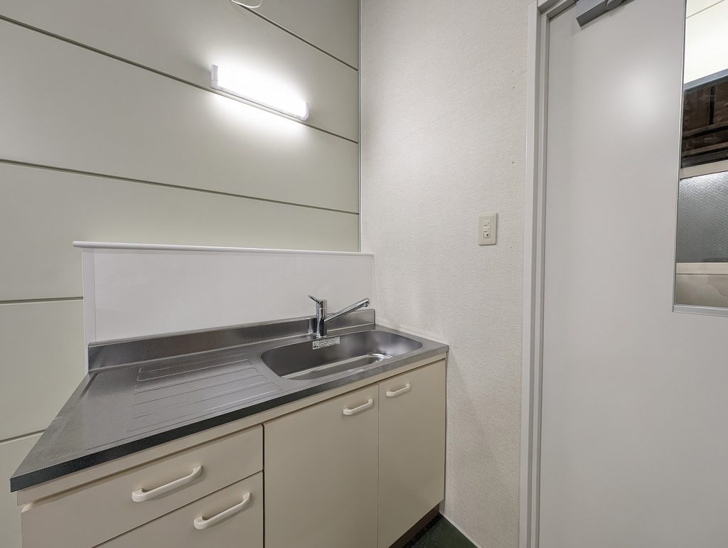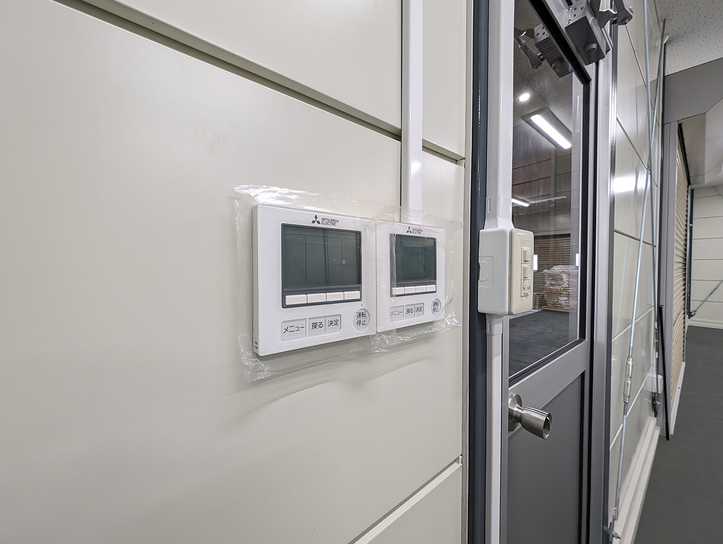 既存の工場内に、従業員用の更衣室と休憩スペースを新設しました。パーテーションによる間仕切りも検討されましたが、ご希望のサイズでは実現が難しいとのことでした。そこで、希望のサイズに対応した設計をご提案するとともに、更衣室の防犯性、休憩スペースの空調効率、室内の明るさにも配慮し、天井付きの設計をご提案。内装は白を基調とし、明るく開放的な空間を演出。外周の建物に合わせて窓を配置し自然光を取り入れることで、閉塞感を軽減しました。天井高は3mを確保し、出入り口には高さ2.4m×幅2.6mの手動シャッターを設置しています。施工にあたっては、工場内のコンクリート床を活かし、アンカーボルトで地面と土台を固定することで 基礎 「基礎」 建物を地面に支える重要な部分です。軽量鉄骨ブレース構造のプレハブ建築では、相性のいい「コンクリート布基礎」がよく採用されます。more 工事を省略。部屋の間には床をフラットにできるハンガー引き戸を採用。台車などでの荷物の運搬に配慮しています。建物内に設置されているため、直接天候等の外部環境の影響を受けにくいという利点を活かし、最小限の部材でコンパクトかつ機能的な設計を実現しました。