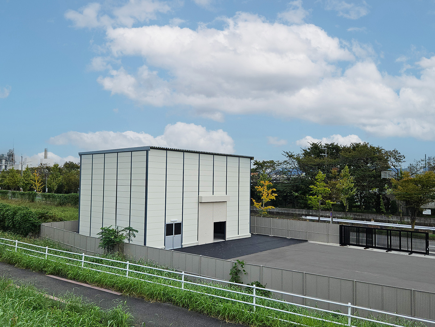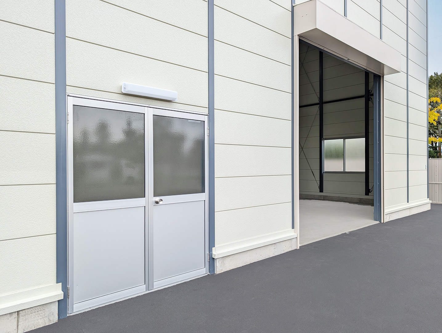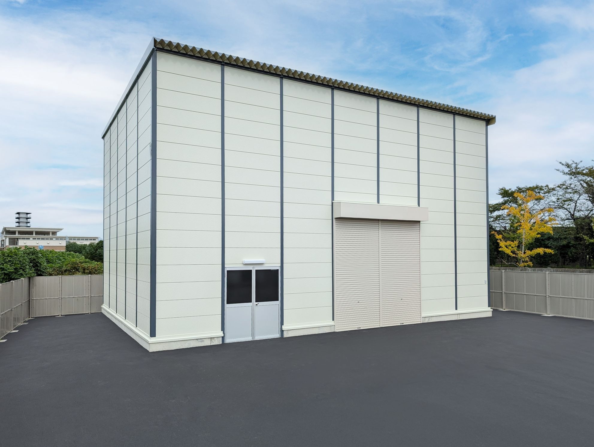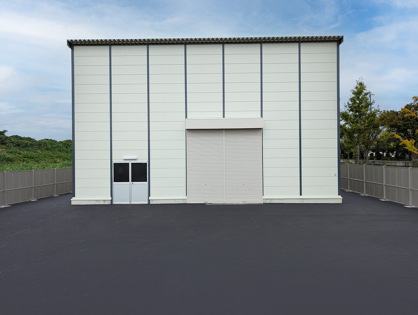OLシリーズで設計施工した配管などの保管倉庫です。これまで別々の場所に保管されていた材料や関連部品等を一箇所に集約し、緊急時に必要な材料を迅速に取り出せるよう計画されたものです。部品の紫外線劣化を防ぐために、屋内で適切に保管できる環境を整備しました。外壁には、夜間でも視認性の高い明るいエンボスアイボリーのパネルを採用。建物前面には大型の軽量手動シャッター(高さ3.5m×幅3.5m)を設置しています。内部は、天井高( 梁下 「梁下」 梁(はり)の下端から床仕上げ面までの高さを示す寸法。意匠的な天井仕上げの高さ(天井高)とは異なり、構造体としての制限寸法を表す。 梁下:梁の下端まで 天井高:内装仕上げ後の天井面ま...more 高)を約7.1m確保しており、長尺の配管等を保管するための十分な収納スペースを備えています。さらに、柱には補強材を取り付け、高い天井高を維持しつつ安全性を向上させた構造としました。これにより、有事の際でも安心してご利用いただける倉庫となっています。