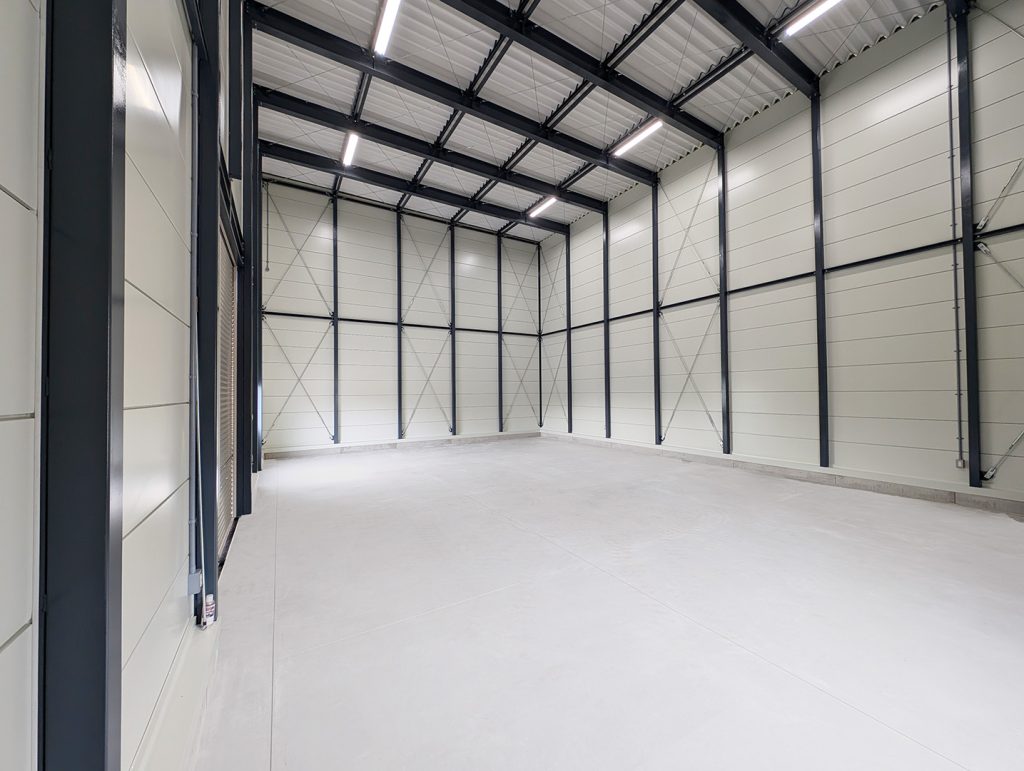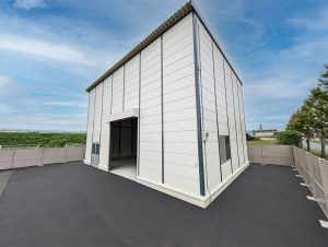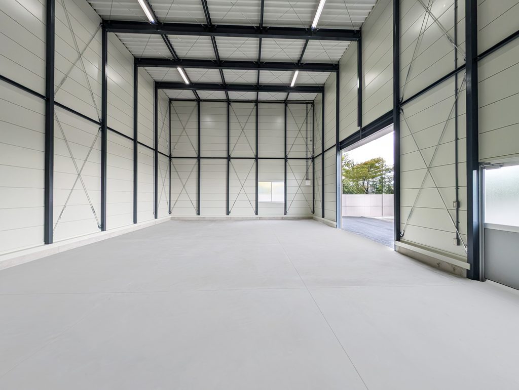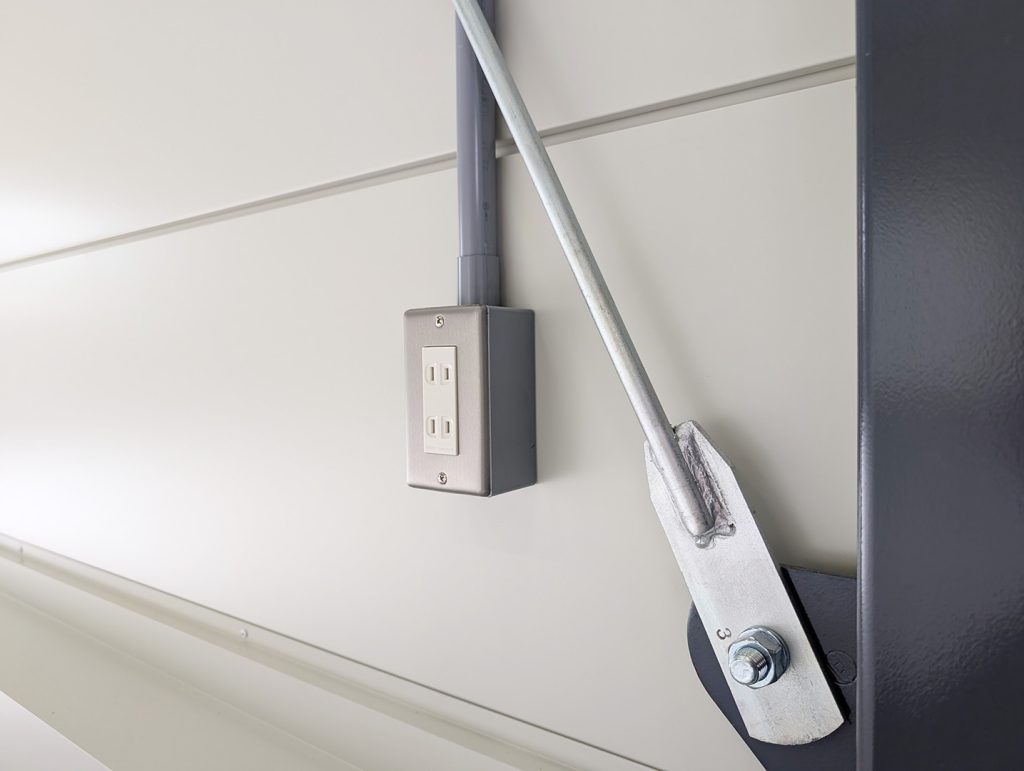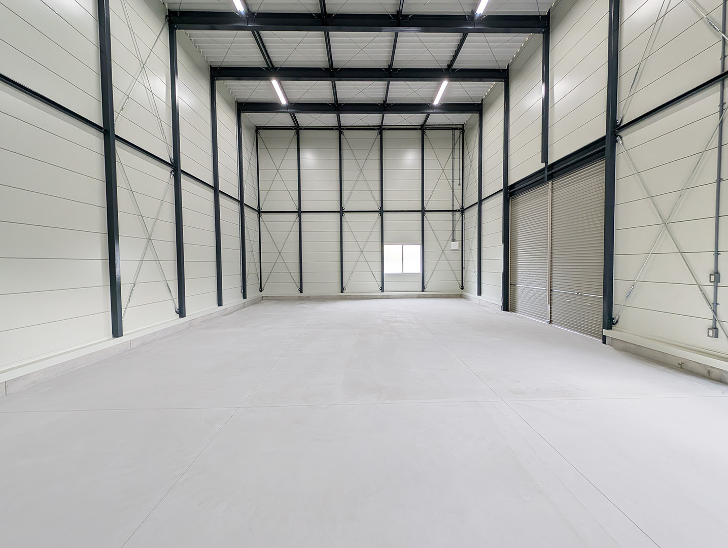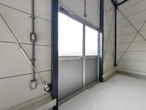 OLシリーズで設計施工した配管などの保管倉庫です。これまで別々の場所に保管されていた材料や関連部品等を一箇所に集約し、緊急時に必要な材料を迅速に取り出せるよう計画されたものです。部品の紫外線劣化を防ぐために、屋内で適切に保管できる環境を整備しました。外壁には、夜間でも視認性の高い明るいエンボスアイボリーのパネルを採用。建物前面には大型の軽量手動シャッター(高さ3.5m×幅3.5m)を設置しています。内部は、天井高( 梁下 「梁下」 梁(はり)の下端から床仕上げ面までの高さを示す寸法。意匠的な天井仕上げの高さ(天井高)とは異なり、構造体としての制限寸法を表す。 梁下:梁の下端まで 天井高:内装仕上げ後の天井面ま...more 高)を約7.1m確保しており、長尺の配管等を保管するための十分な収納スペースを備えています。さらに、柱には補強材を取り付け、高い天井高を維持しつつ安全性を向上させた構造としました。これにより、有事の際でも安心してご利用いただける倉庫となっています。