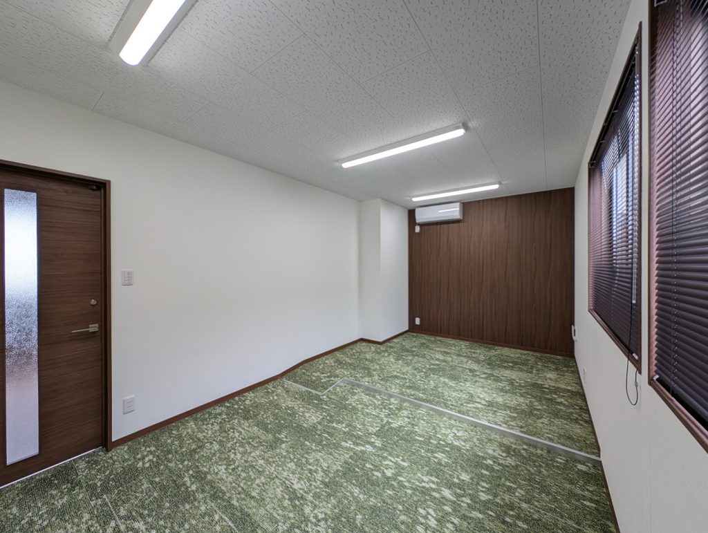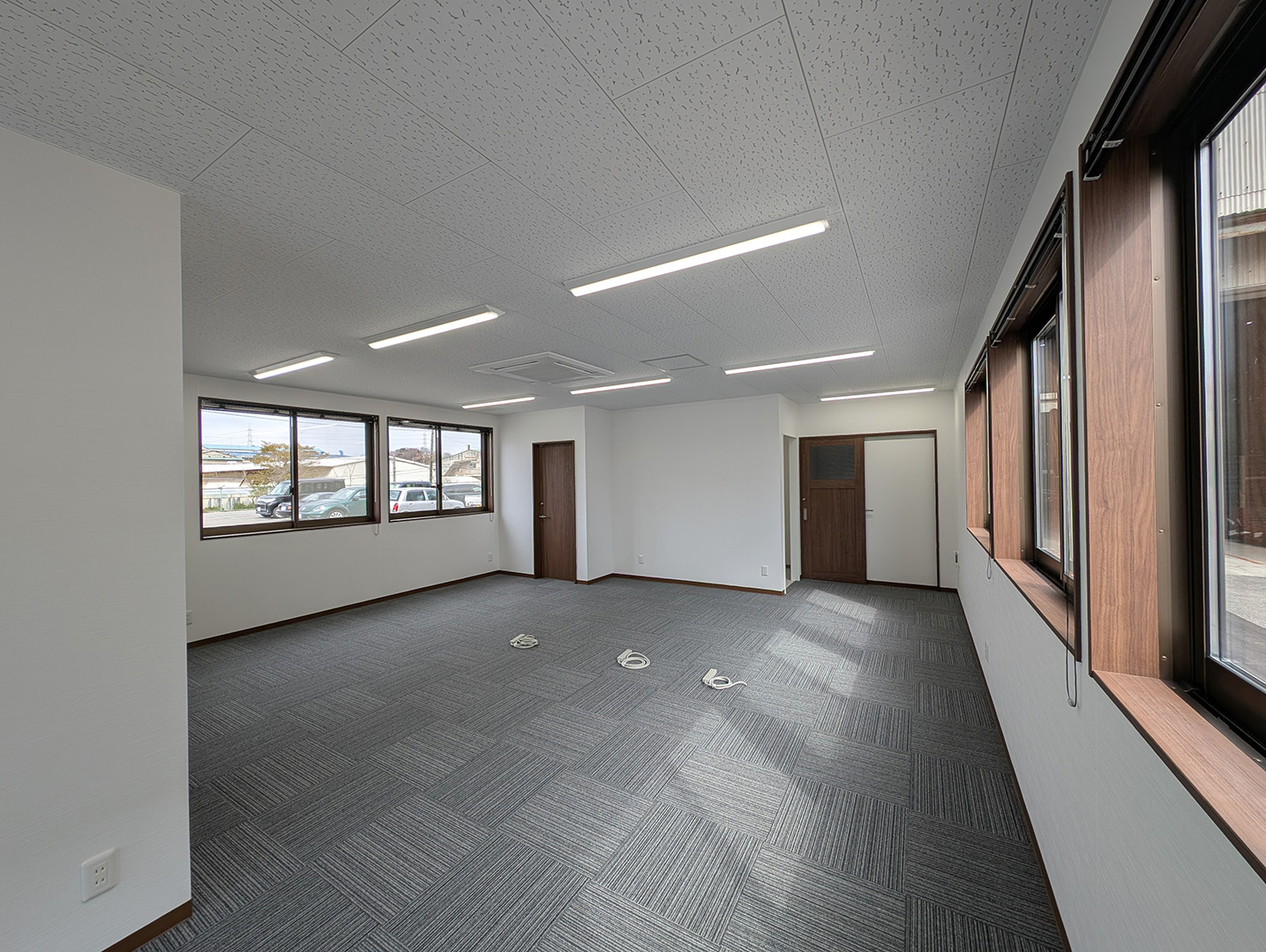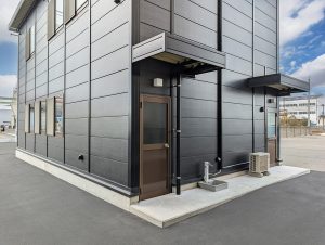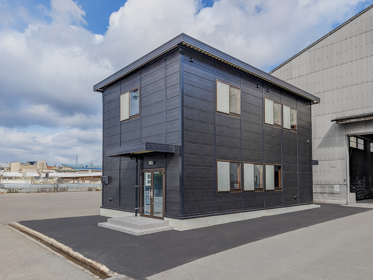 OLライトシリーズ 「OLライトシリーズ」 オリエントハウスプレハブシリーズの短工期&低コストの汎用モデル。外装・内装を兼ねることが出来る高断熱の壁パネルを使用しています。シリーズ詳細はこちら>more で設計・施工した事務所です。既存の事務所を建て替え、働きやすい環境を整えた事務所を新設しました。断熱性能を高めるためにビル用サッシ(複層ガラス)を導入し、空調負荷を軽減。また、トイレや会議室には遮音性を重視し、石膏ボードの二重貼りとグラスウールを用いた施工を行っています。2階は従業員の休憩スペースとなるため、勝手口横に階段を設けて直接2階へ移動しやすい動線を確保しました。室内はタイルカーペットを採用して落ち着いた印象に仕上げ、専務室には木目調のアクセントクロスで高級感を演出。外観は、木目調ブラックの外壁パネルを使用し、洗練された印象に仕上げました。