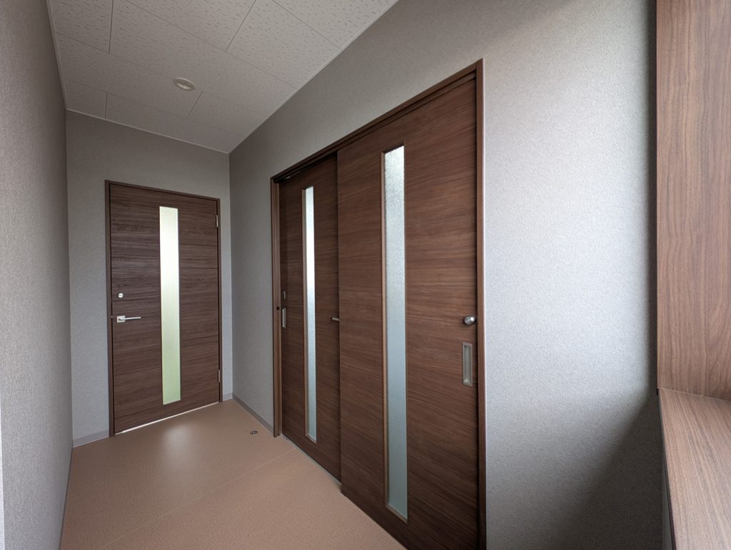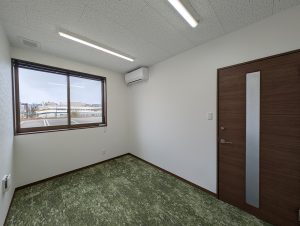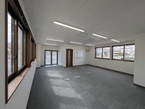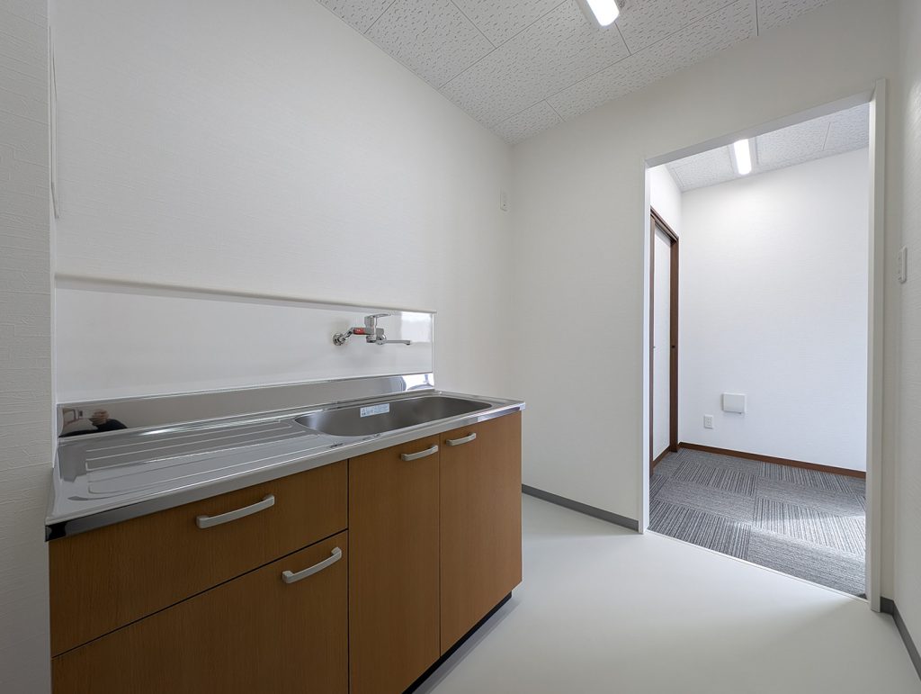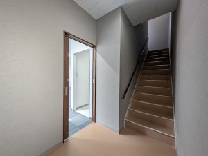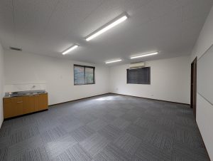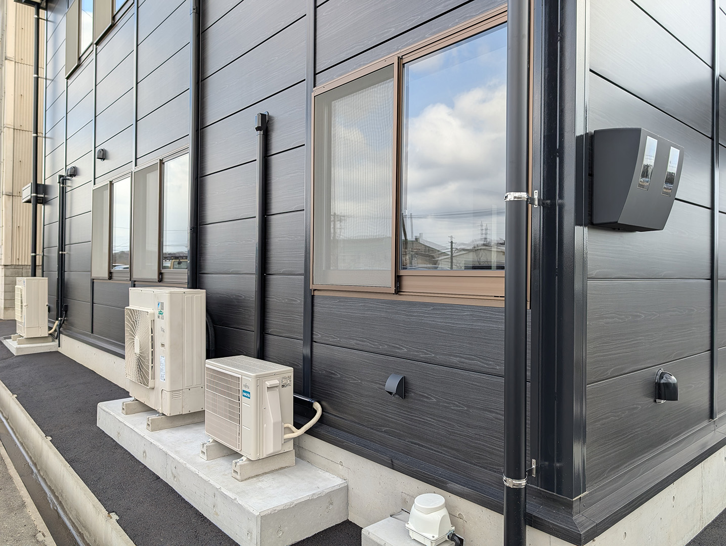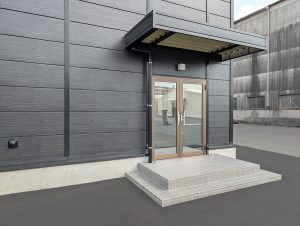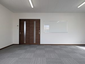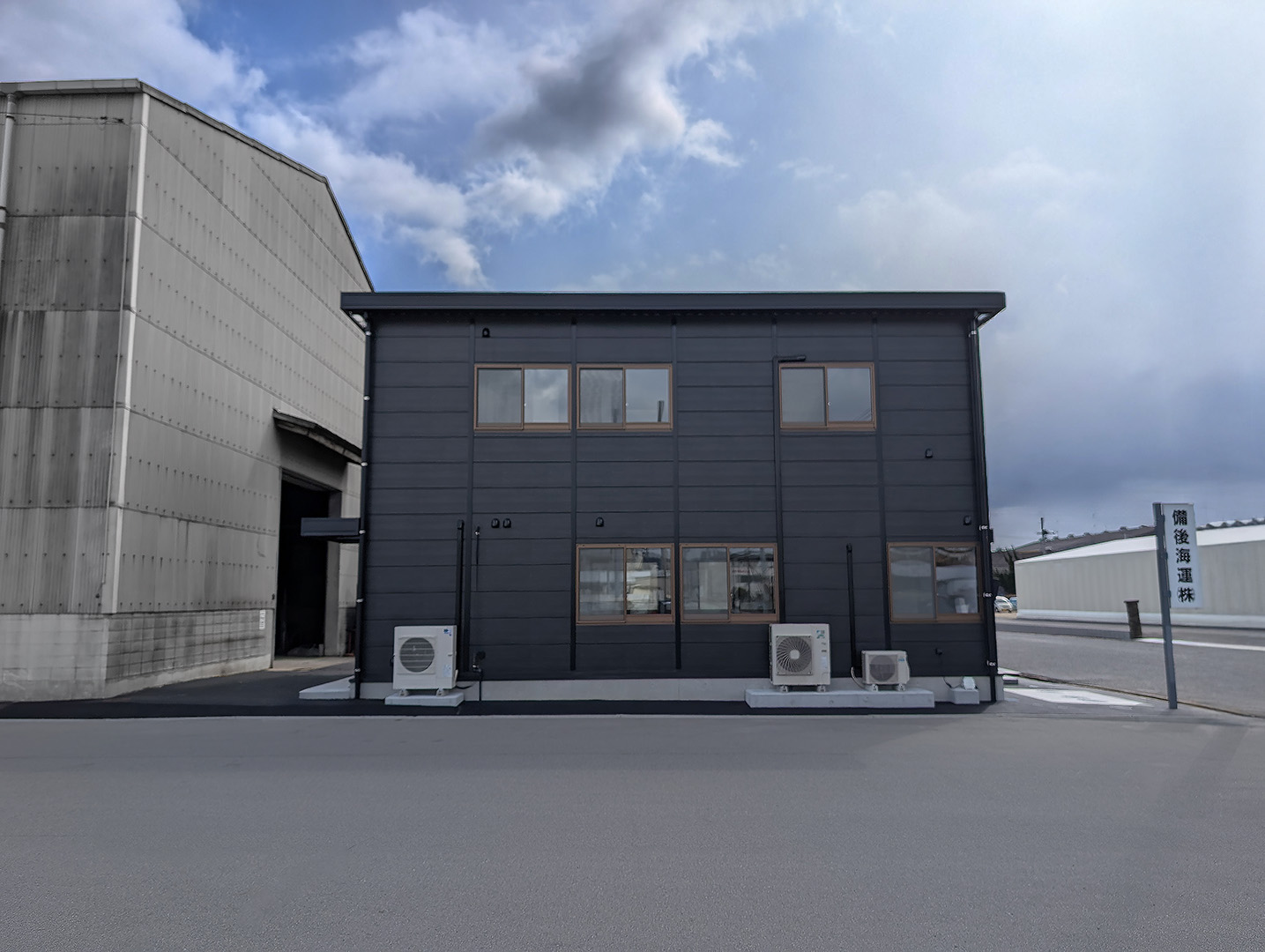 OLライトシリーズ 「OLライトシリーズ」 オリエントハウスプレハブシリーズの短工期&低コストの汎用モデル。外装・内装を兼ねることが出来る高断熱の壁パネルを使用しています。シリーズ詳細はこちら>more で設計・施工した事務所です。既存の事務所を建て替え、働きやすい環境を整えた事務所を新設しました。断熱性能を高めるためにビル用サッシ(複層ガラス)を導入し、空調負荷を軽減。また、トイレや会議室には遮音性を重視し、石膏ボードの二重貼りとグラスウールを用いた施工を行っています。2階は従業員の休憩スペースとなるため、勝手口横に階段を設けて直接2階へ移動しやすい動線を確保しました。室内はタイルカーペットを採用して落ち着いた印象に仕上げ、専務室には木目調のアクセントクロスで高級感を演出。外観は、木目調ブラックの外壁パネルを使用し、洗練された印象に仕上げました。
