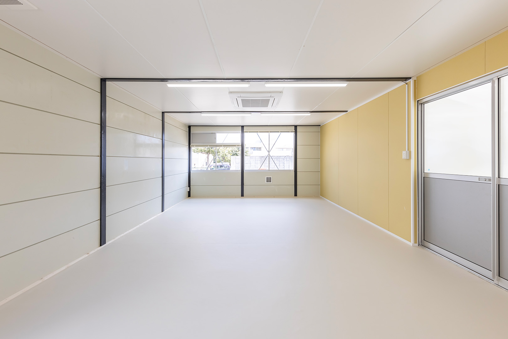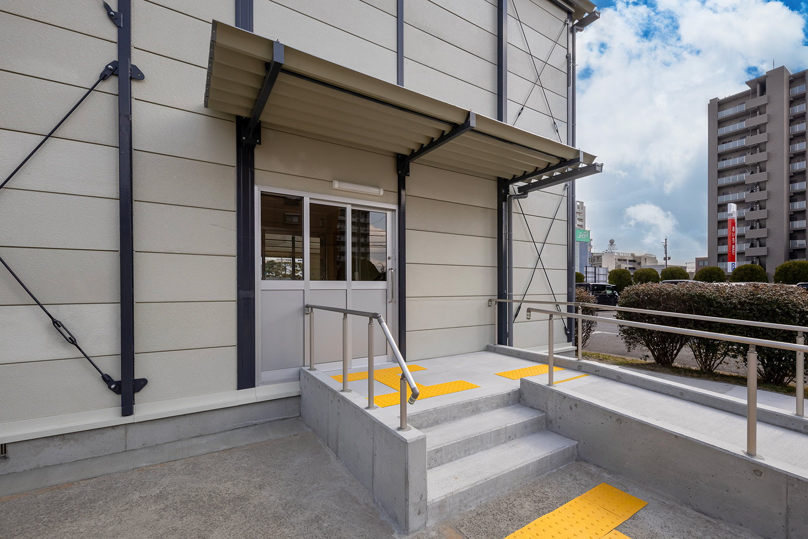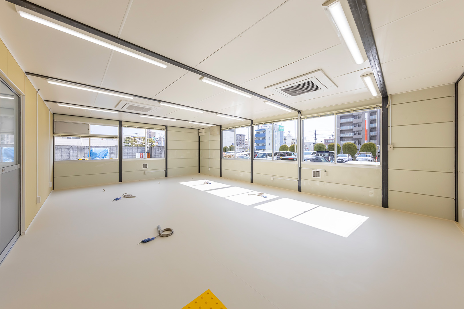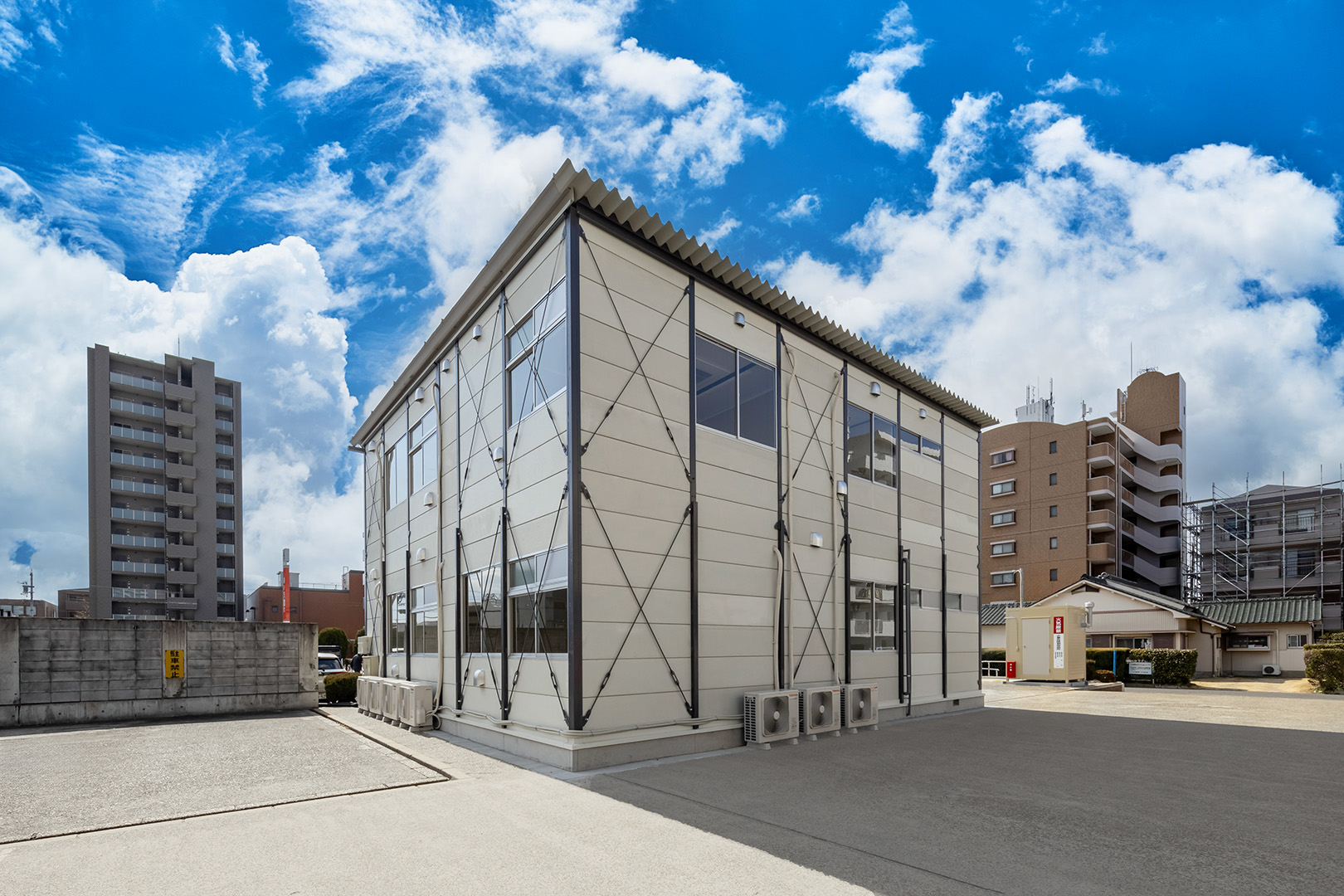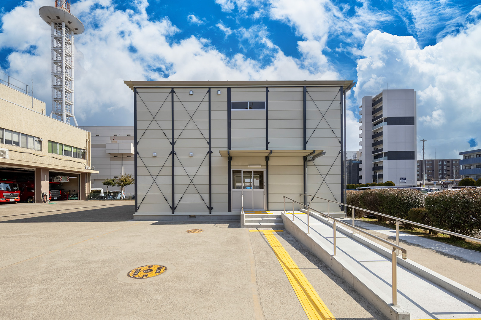 OLライトシリーズ 「OLライトシリーズ」 オリエントハウスプレハブシリーズの短工期&低コストの汎用モデル。外装・内装を兼ねることが出来る高断熱の壁パネルを使用しています。シリーズ詳細はこちら>more で施工した消防署の仮設庁舎です。消防署の改修工事に伴い、敷地内に設置しました。1階には書庫と事務室、男女トイレを配置し、2階には事務室や会議室、倉庫、更衣室などを備えています。内階段を設け、階段下は物置スペースとして有効活用しました。玄関入口には、階段とスロープ、さらに点字ブロックを設置し、歩道からのアクセス性とバリアフリー性を確保しています。施工にあたっては、敷地内での工事となるため、出動する救急隊員や消防士の動線を妨げないよう作業範囲を調整。また、弱電や通信設備の移設作業が円滑に進むよう、業者と消防署との打ち合わせを密に行い、スムーズな施工を実現しました。