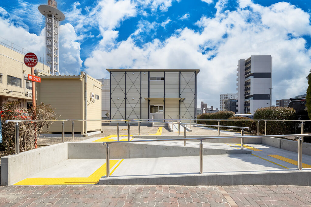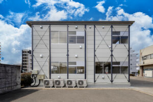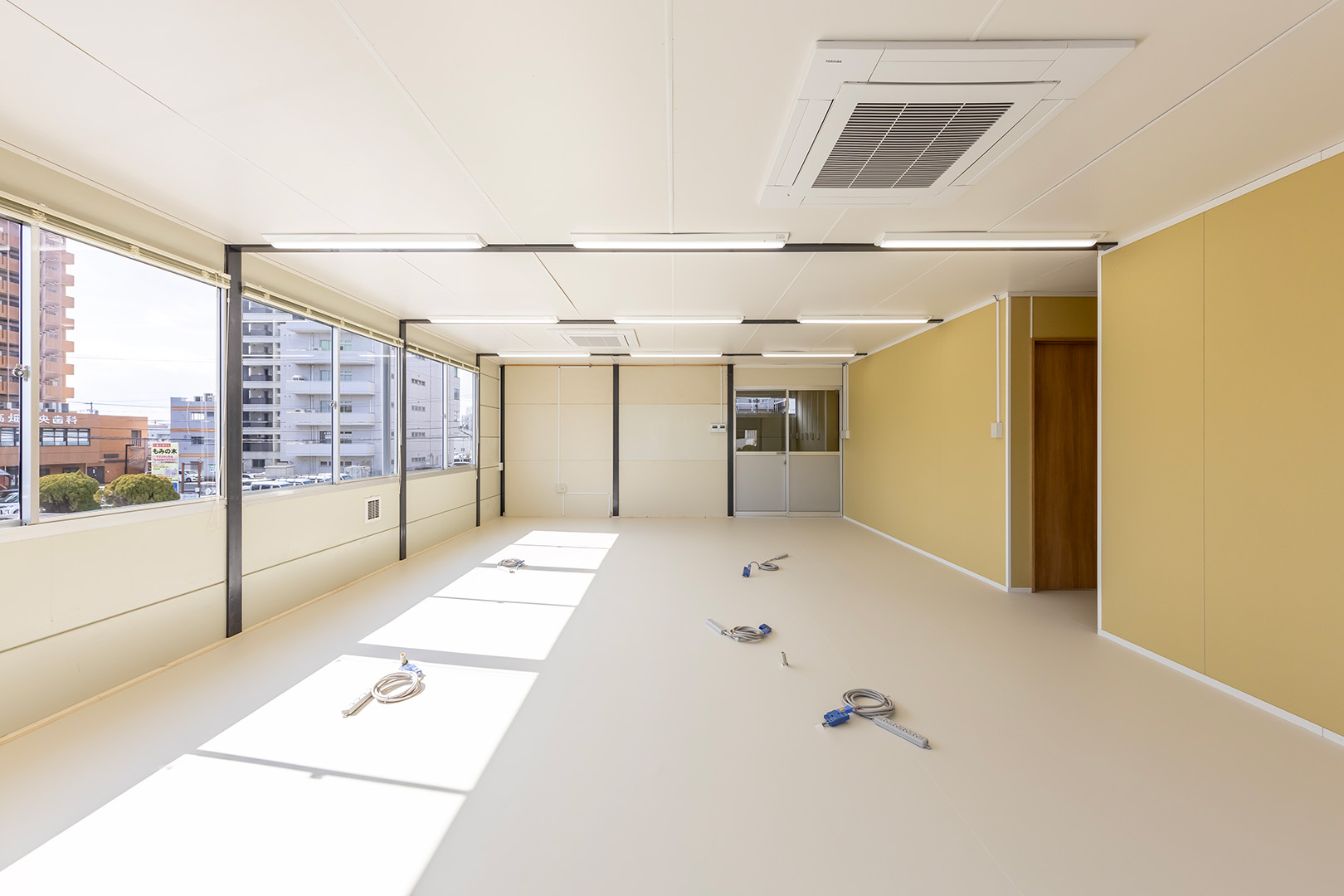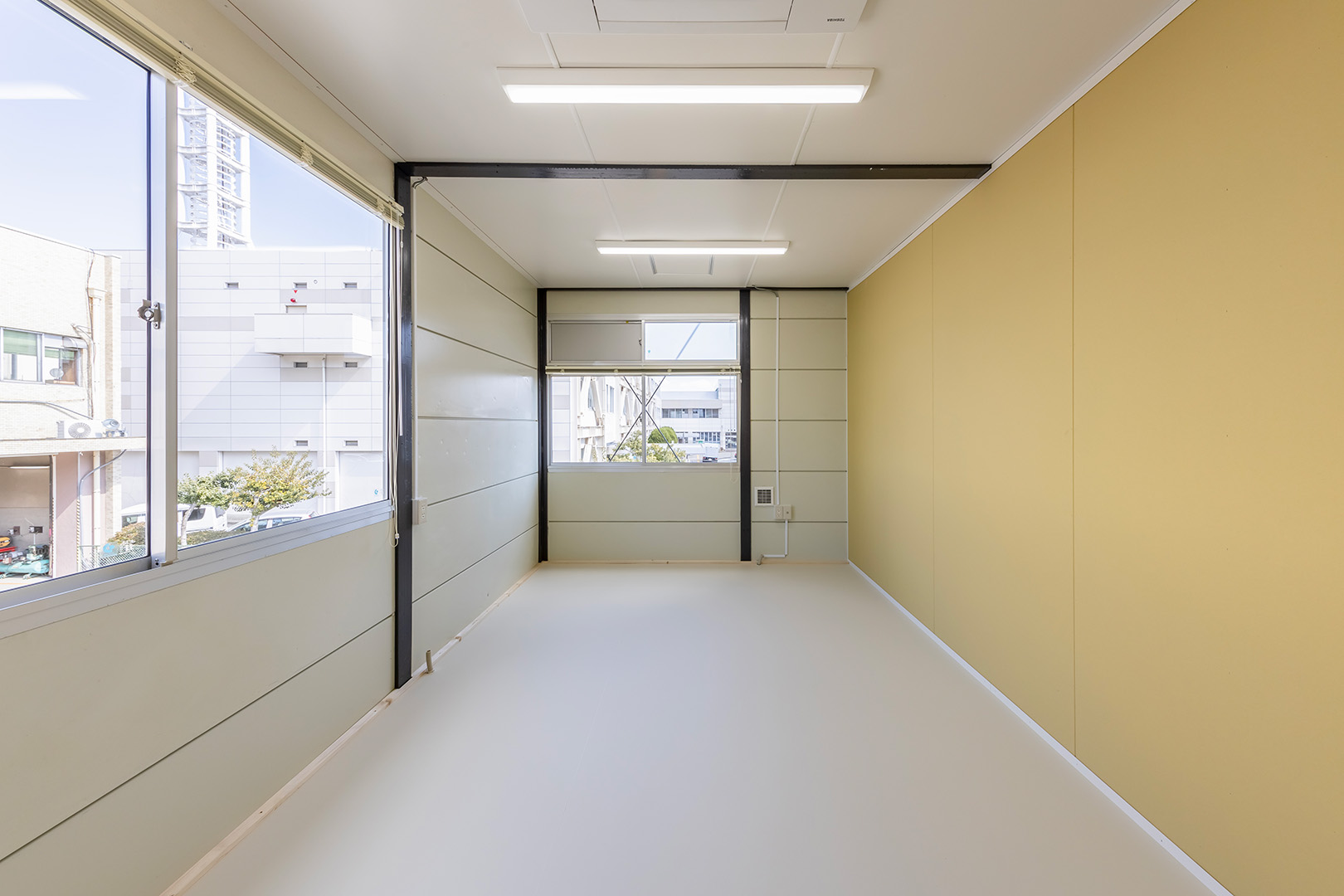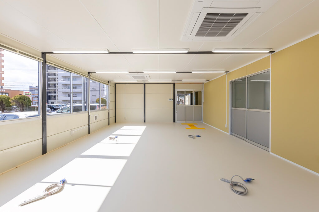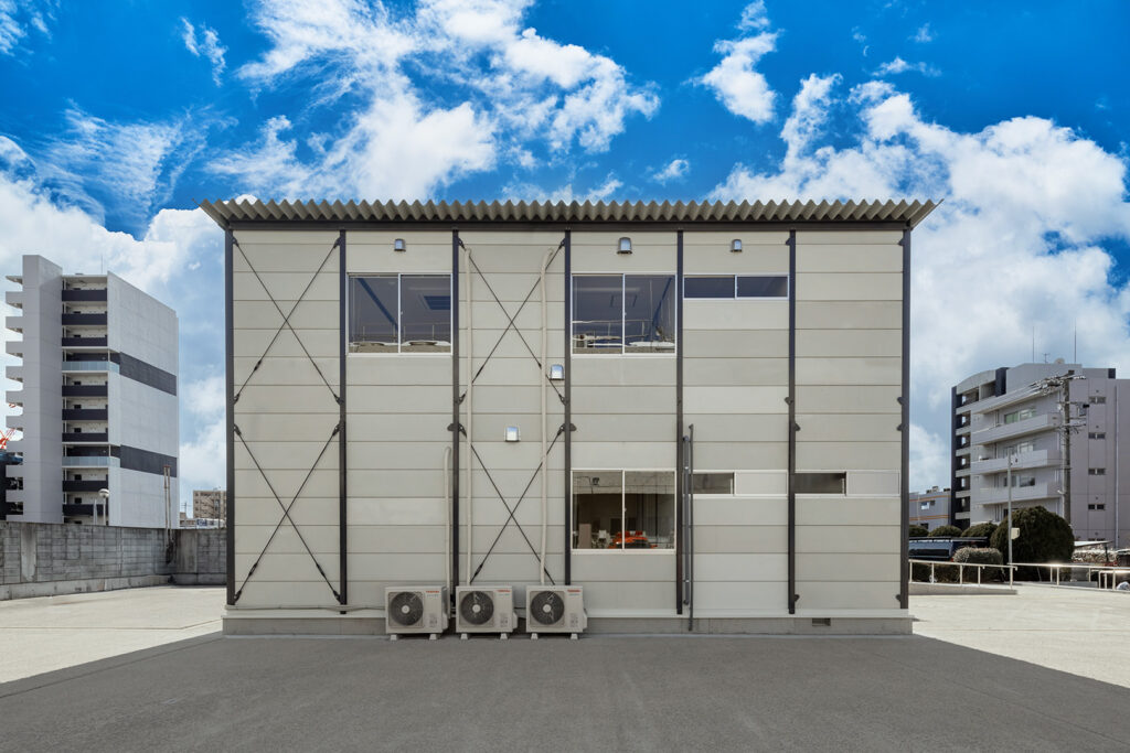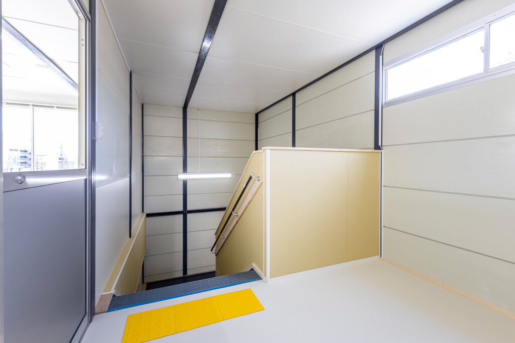 OLライトシリーズ 「OLライトシリーズ」 オリエントハウスプレハブシリーズの短工期&低コストの汎用モデル。外装・内装を兼ねることが出来る高断熱の壁パネルを使用しています。シリーズ詳細はこちら>more で施工した消防署の仮設庁舎です。消防署の改修工事に伴い、敷地内に設置しました。1階には書庫と事務室、男女トイレを配置し、2階には事務室や会議室、倉庫、更衣室などを備えています。内階段を設け、階段下は物置スペースとして有効活用しました。玄関入口には、階段とスロープ、さらに点字ブロックを設置し、歩道からのアクセス性とバリアフリー性を確保しています。施工にあたっては、敷地内での工事となるため、出動する救急隊員や消防士の動線を妨げないよう作業範囲を調整。また、弱電や通信設備の移設作業が円滑に進むよう、業者と消防署との打ち合わせを密に行い、スムーズな施工を実現しました。