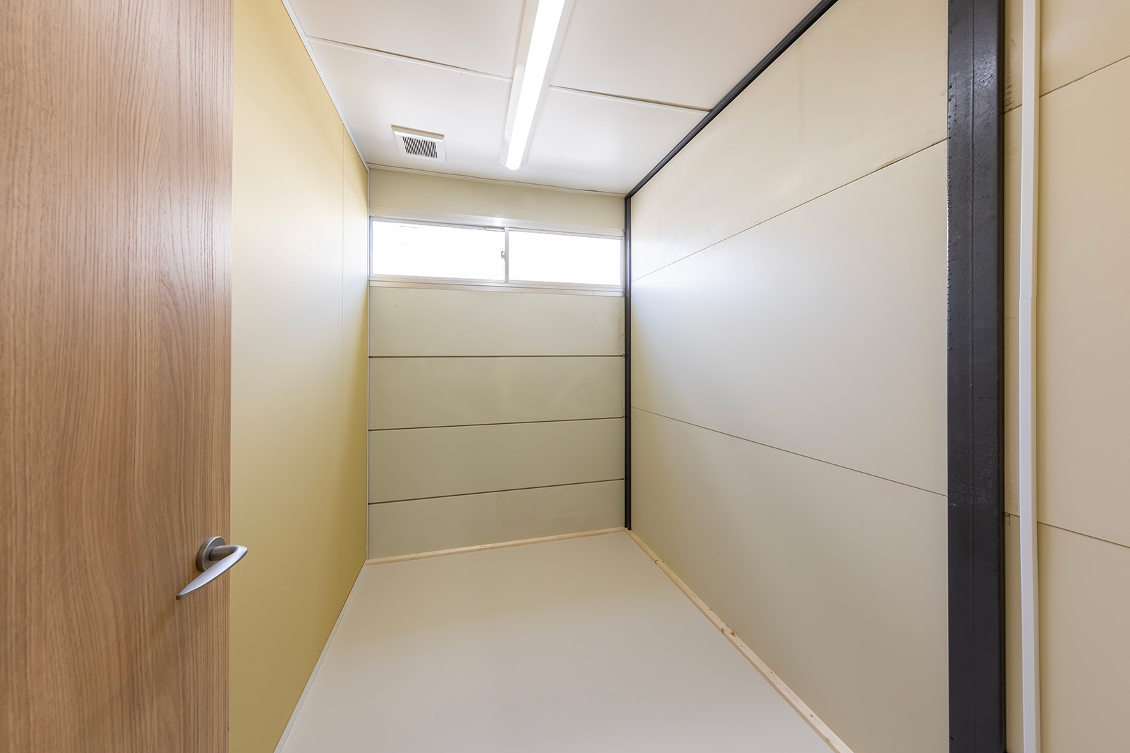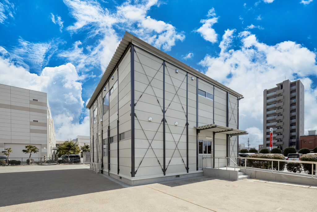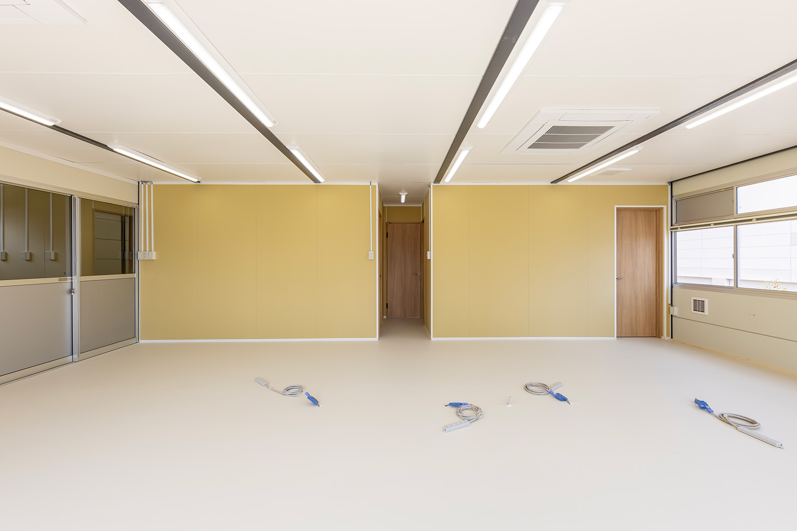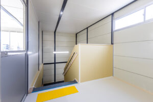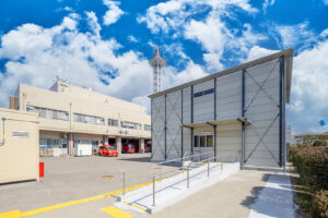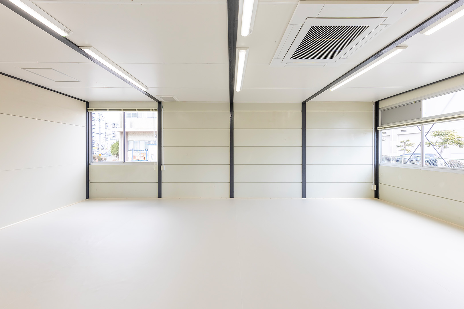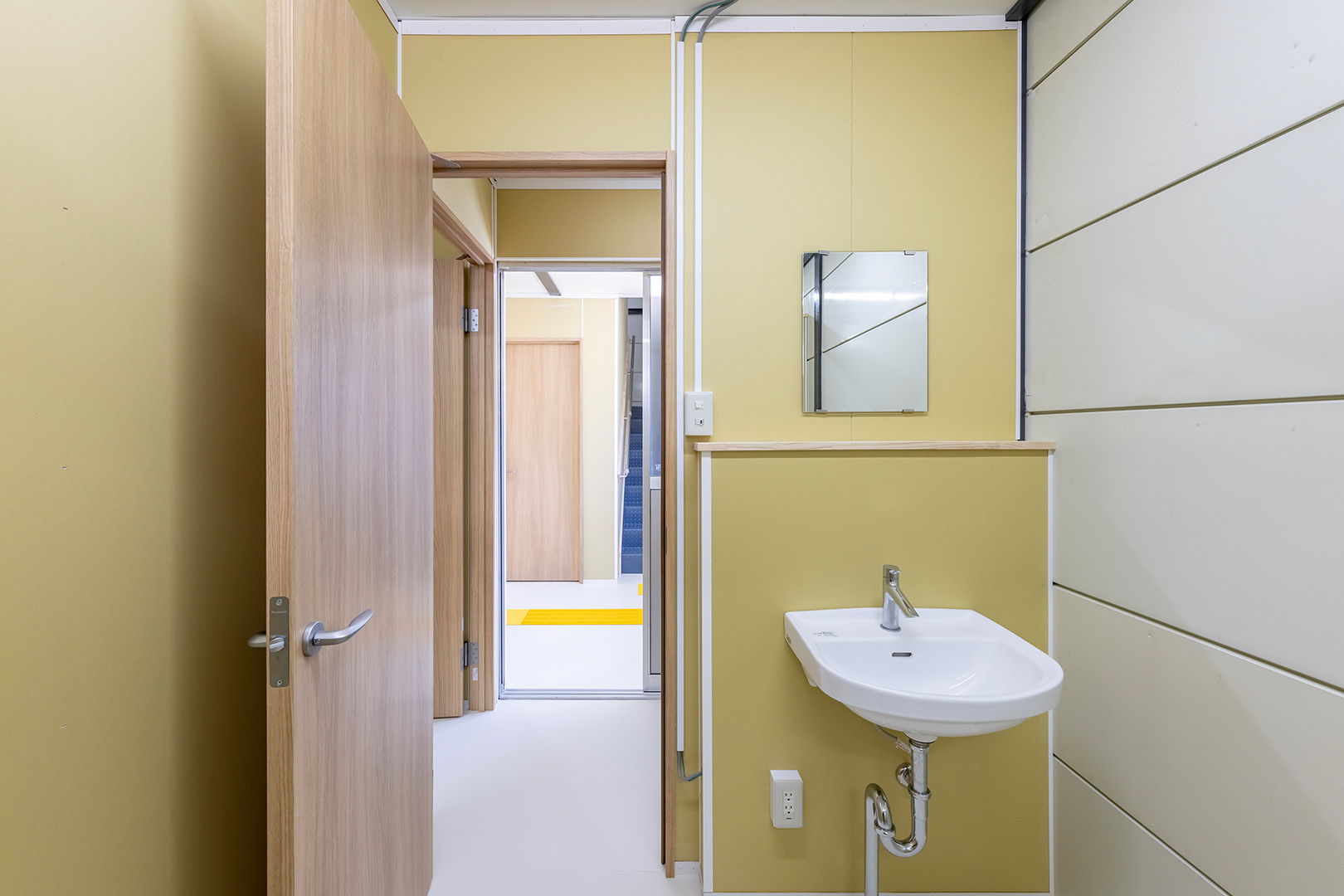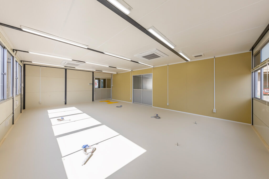 OLライトシリーズ 「OLライトシリーズ」 オリエントハウスプレハブシリーズの短工期&低コストの汎用モデル。外装・内装を兼ねることが出来る高断熱の壁パネルを使用しています。シリーズ詳細はこちら>more で施工した消防署の仮設庁舎です。消防署の改修工事に伴い、敷地内に設置しました。1階には書庫と事務室、男女トイレを配置し、2階には事務室や会議室、倉庫、更衣室などを備えています。内階段を設け、階段下は物置スペースとして有効活用しました。玄関入口には、階段とスロープ、さらに点字ブロックを設置し、歩道からのアクセス性とバリアフリー性を確保しています。施工にあたっては、敷地内での工事となるため、出動する救急隊員や消防士の動線を妨げないよう作業範囲を調整。また、弱電や通信設備の移設作業が円滑に進むよう、業者と消防署との打ち合わせを密に行い、スムーズな施工を実現しました。