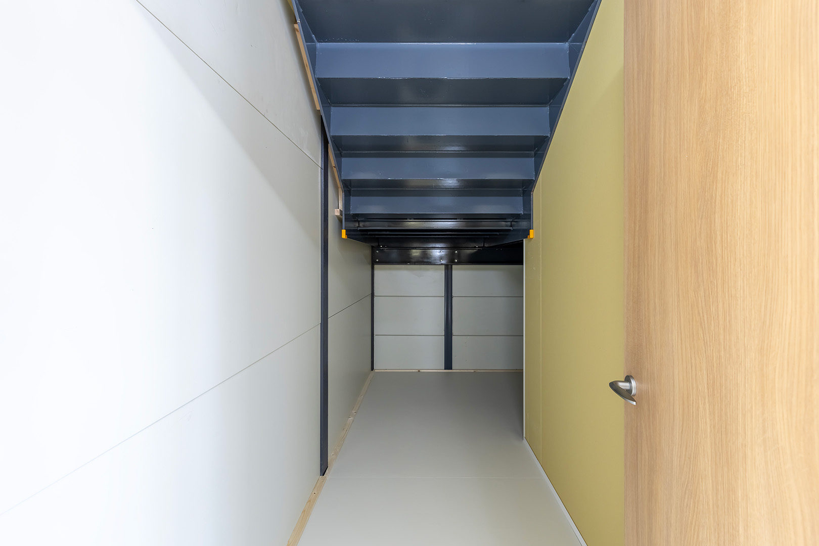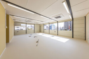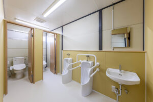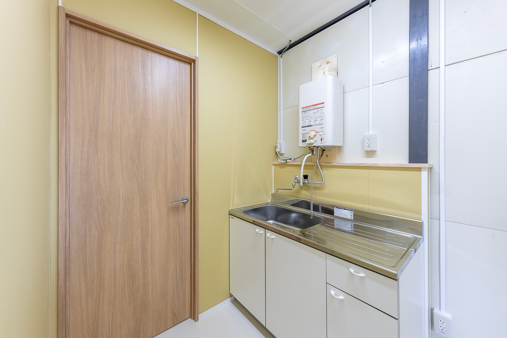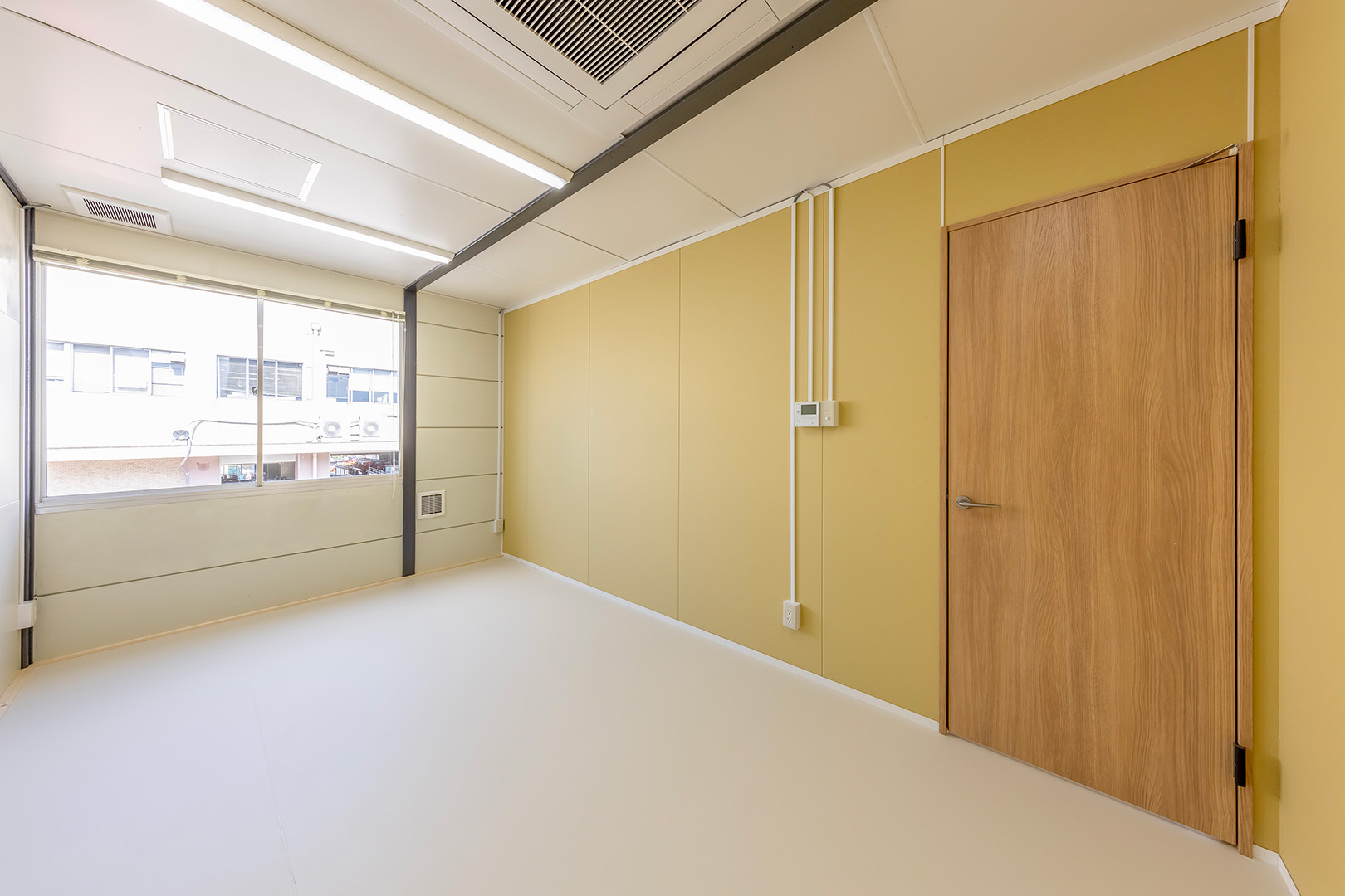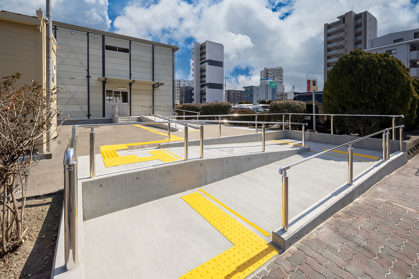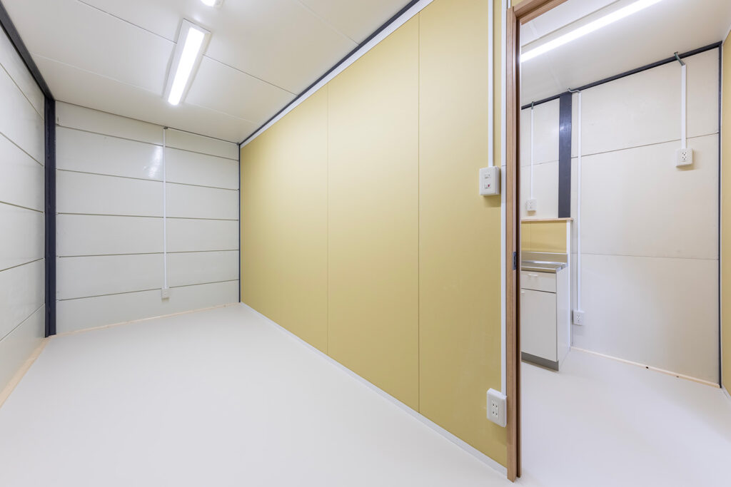 OLライトシリーズ 「OLライトシリーズ」 オリエントハウスプレハブシリーズの短工期&低コストの汎用モデル。外装・内装を兼ねることが出来る高断熱の壁パネルを使用しています。シリーズ詳細はこちら>more で施工した消防署の仮設庁舎です。消防署の改修工事に伴い、敷地内に設置しました。1階には書庫と事務室、男女トイレを配置し、2階には事務室や会議室、倉庫、更衣室などを備えています。内階段を設け、階段下は物置スペースとして有効活用しました。玄関入口には、階段とスロープ、さらに点字ブロックを設置し、歩道からのアクセス性とバリアフリー性を確保しています。施工にあたっては、敷地内での工事となるため、出動する救急隊員や消防士の動線を妨げないよう作業範囲を調整。また、弱電や通信設備の移設作業が円滑に進むよう、業者と消防署との打ち合わせを密に行い、スムーズな施工を実現しました。