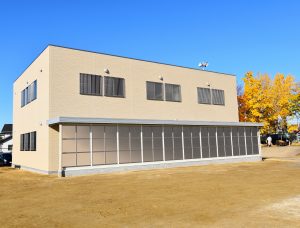 主に低学年(小学1年~3年)の生徒向けの、放課後児童クラブです。建物入口へのアプローチは、車椅子でも余裕のあるスロープ及び手すり付きのバリアフリー仕様。室内の手洗いエリアは壁で仕切らずにカウンター面台形式になっているので、児童の行動を少しでも見逃すことがない様に配慮してあります。