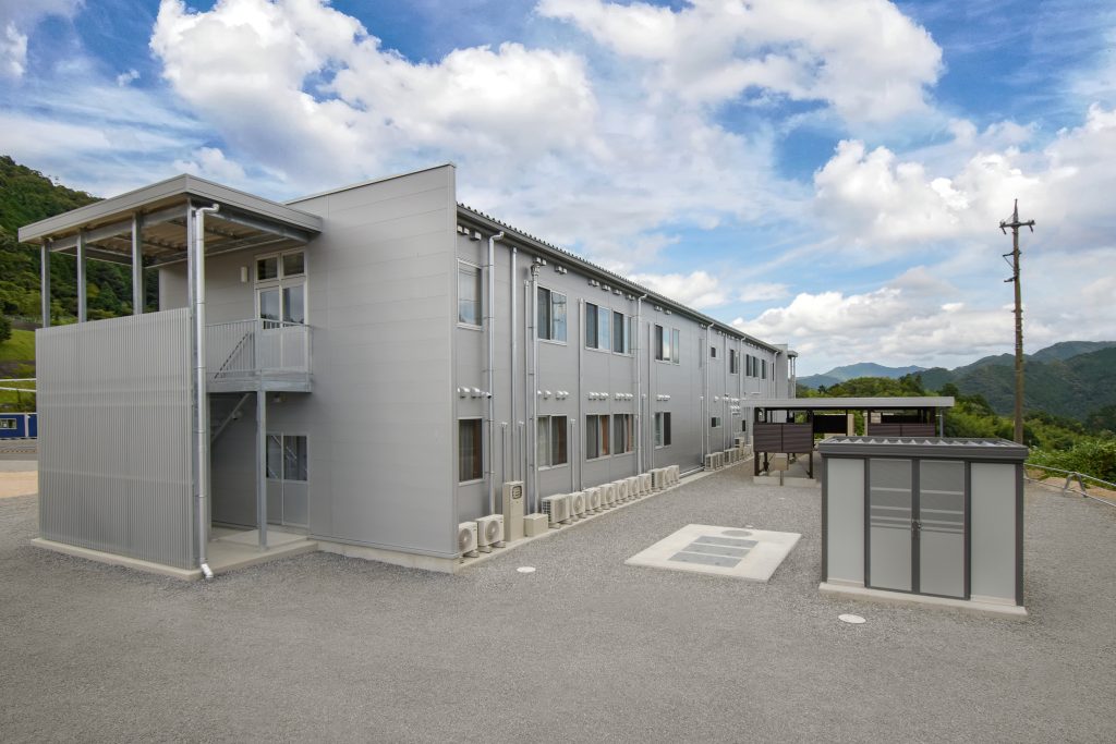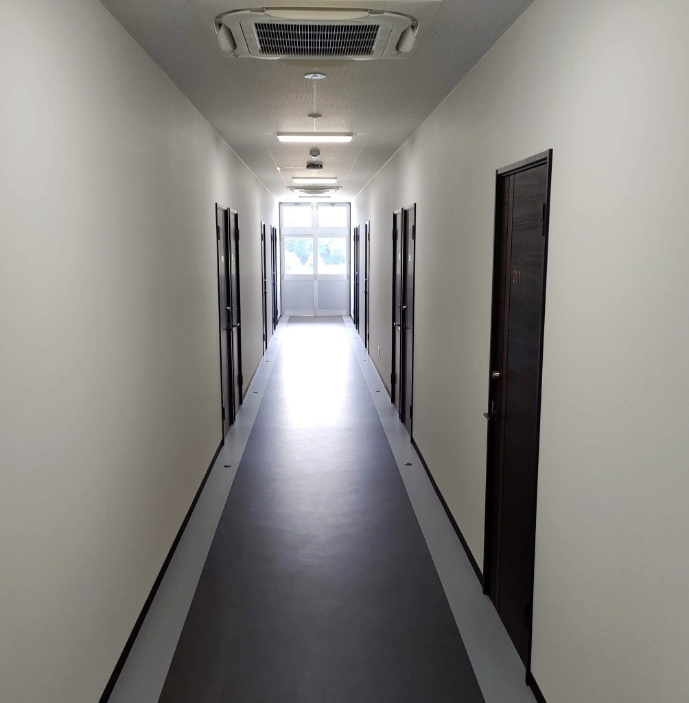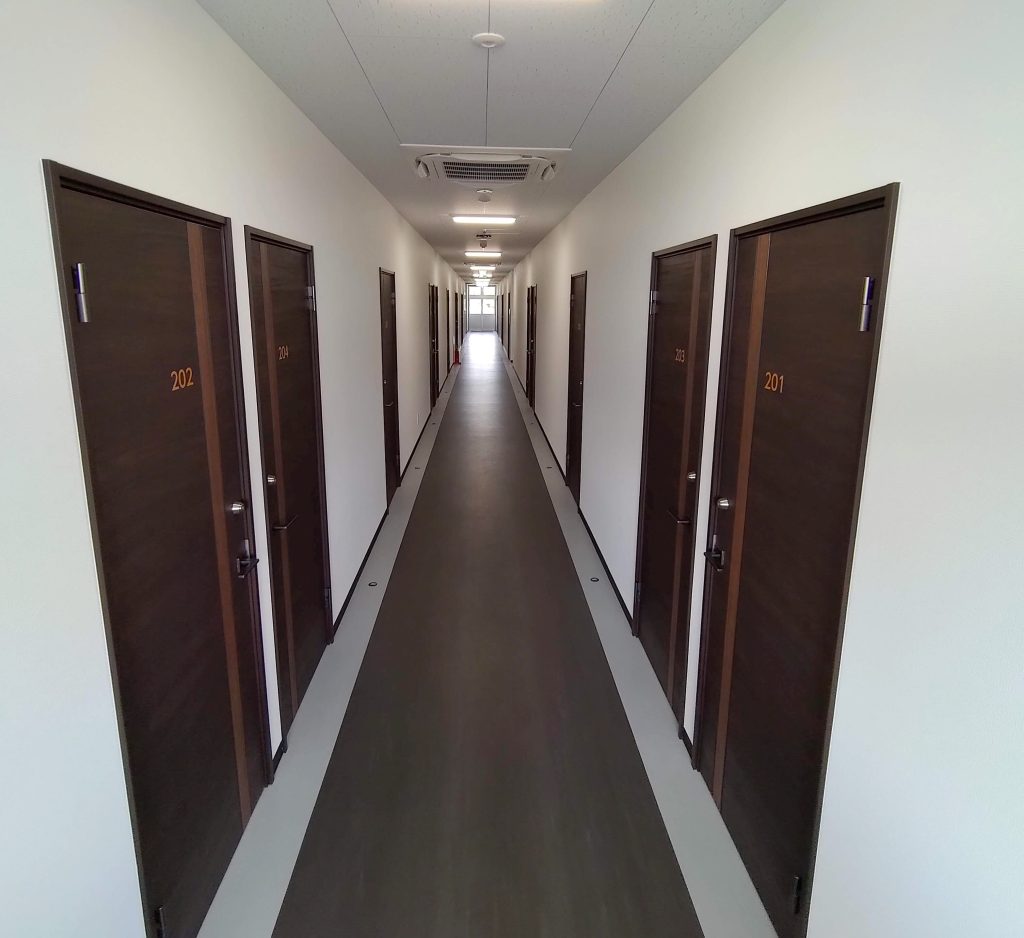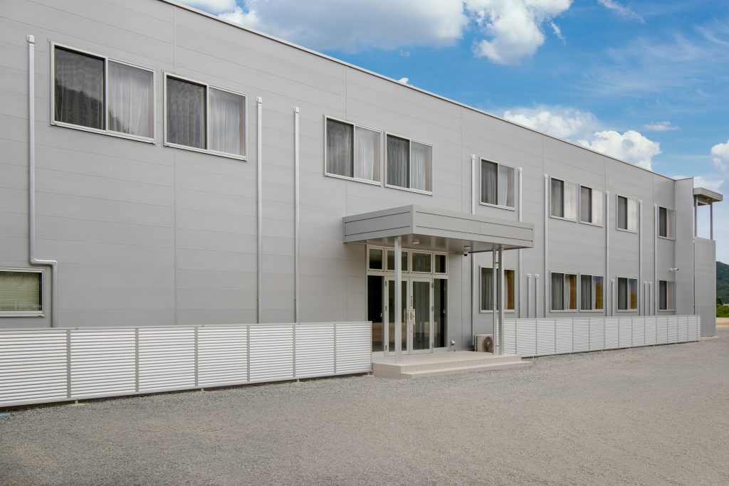 食堂や厨房・バスルームなどの設備を完備した、約40人が居住できる社員寮です。各室の間仕切内に断熱材を入れることにより、遮音性・断熱性を高め居住性に配慮。玄関はFIX付の建具を使用することで明るく開放的な空間となっており、外部避難階段はアルミ縦格子にて建物全体の統一感をだしてます。