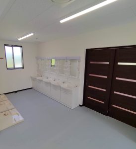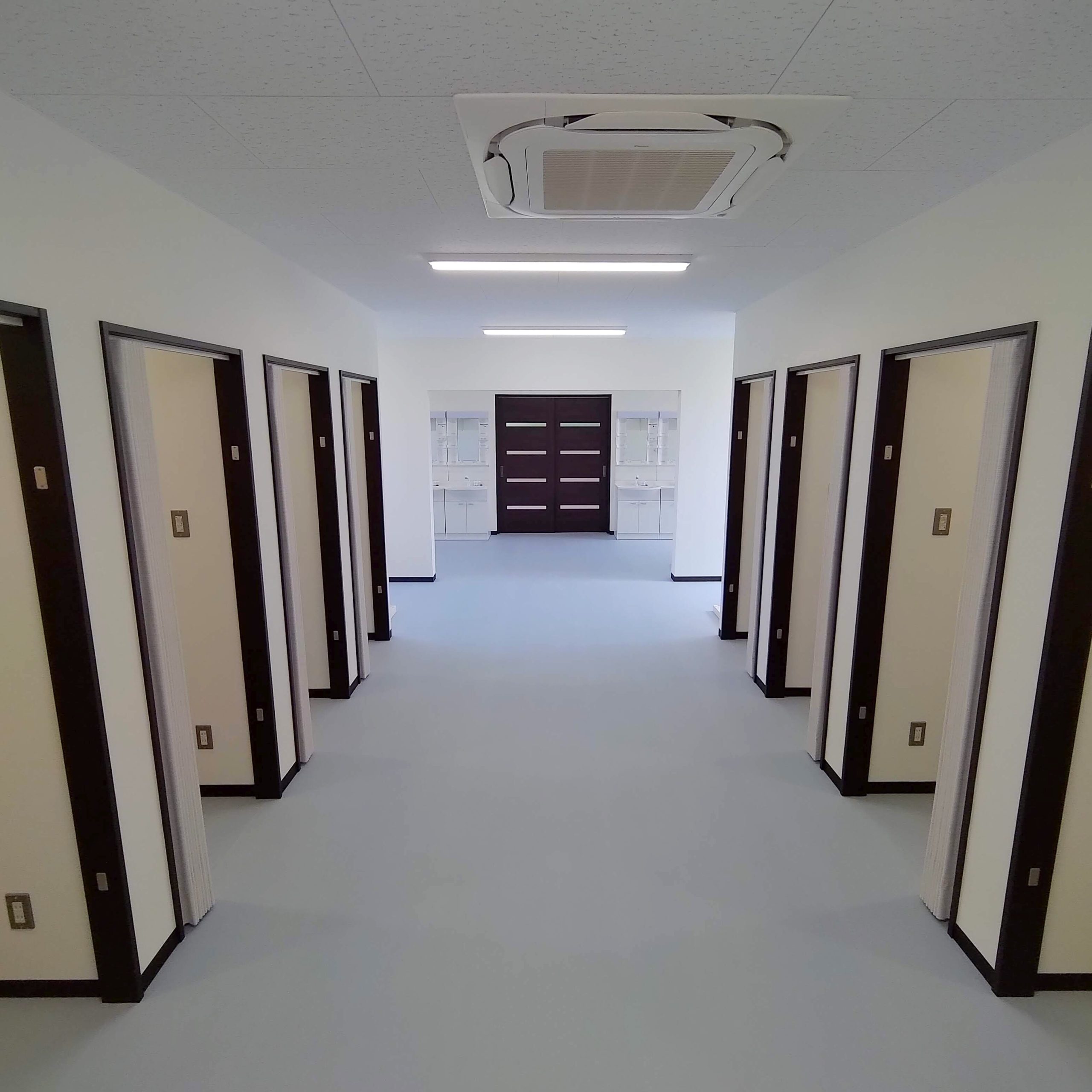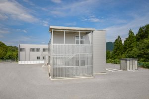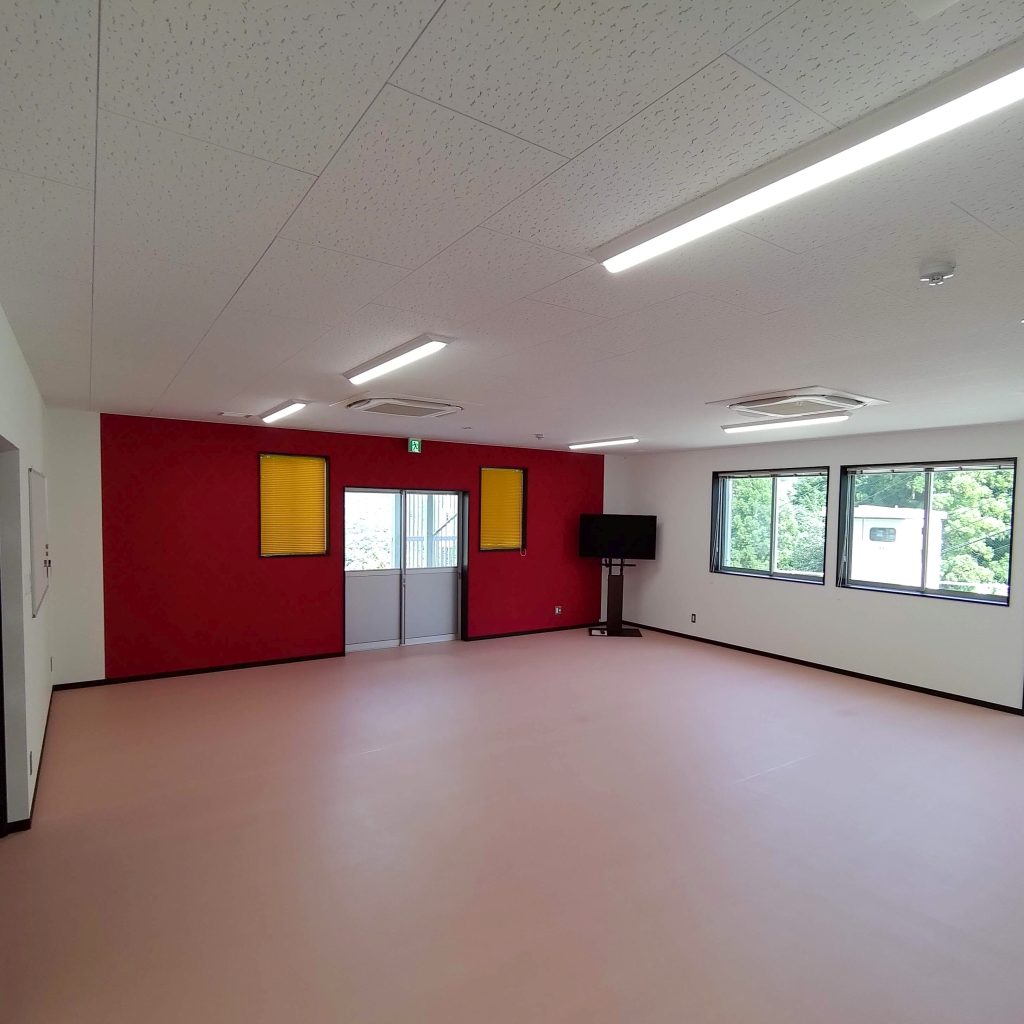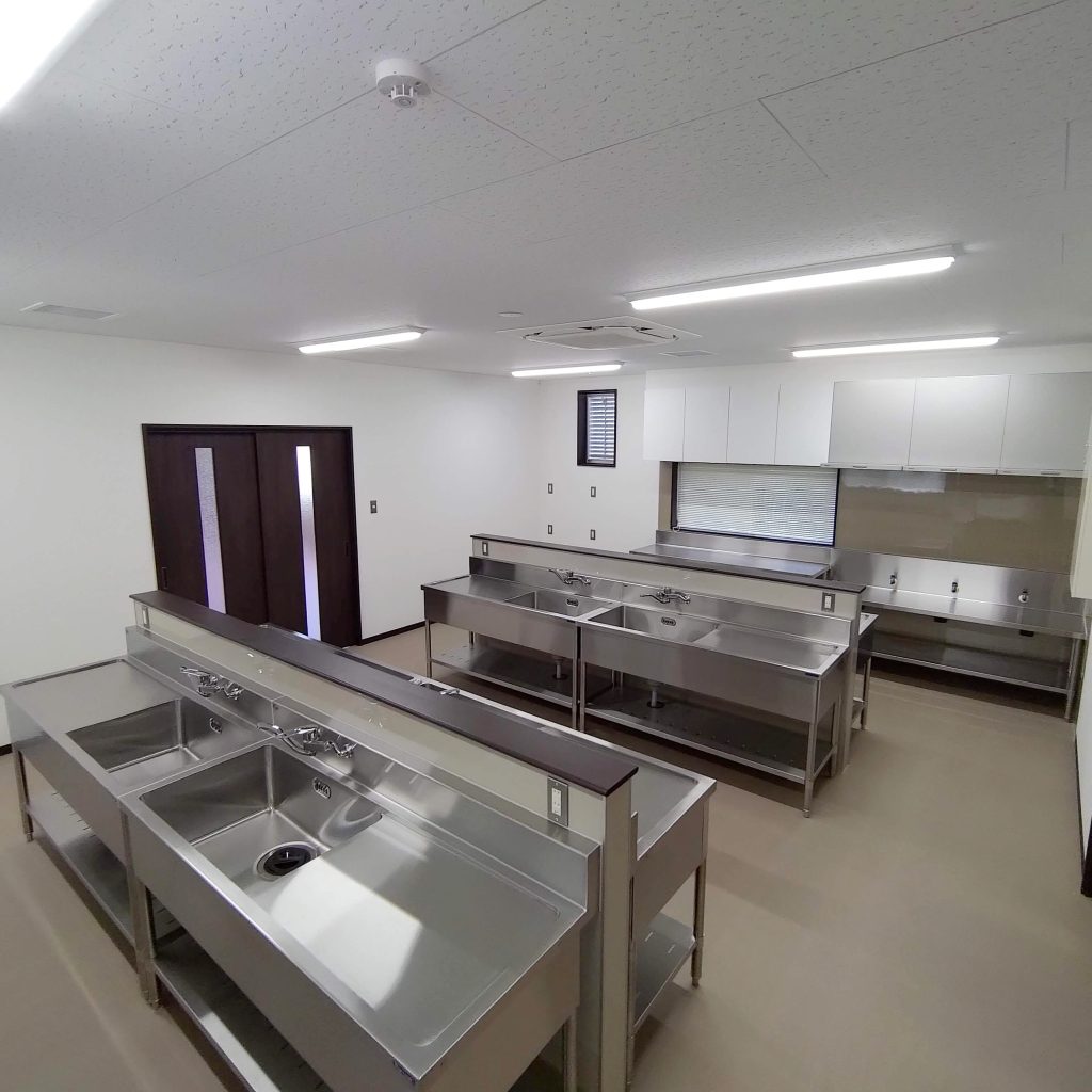 食堂や厨房・バスルームなどの設備を完備した、約40人が居住できる社員寮です。各室の間仕切内に断熱材を入れることにより、遮音性・断熱性を高め居住性に配慮。玄関はFIX付の建具を使用することで明るく開放的な空間となっており、外部避難階段はアルミ縦格子にて建物全体の統一感をだしてます。