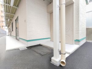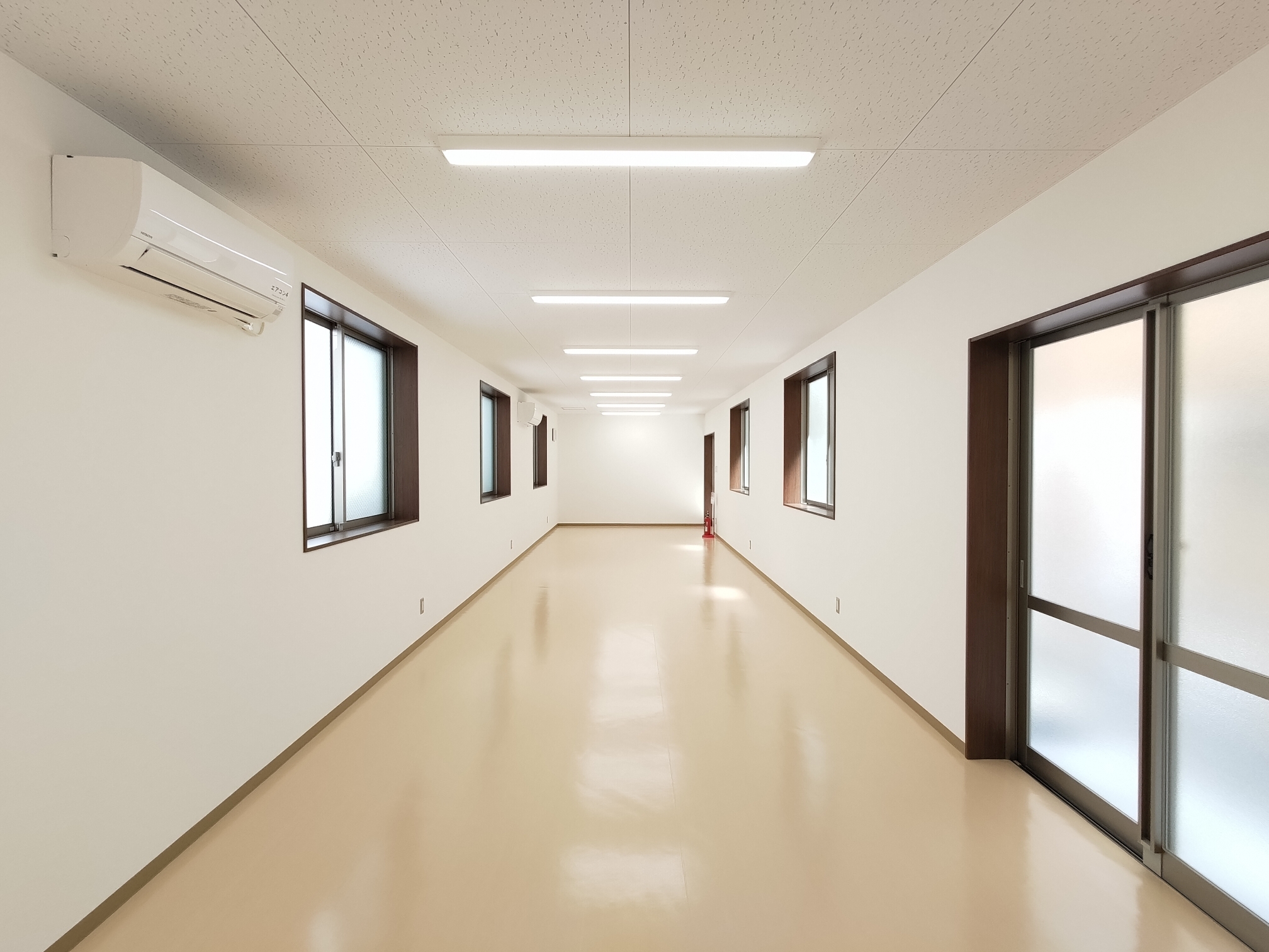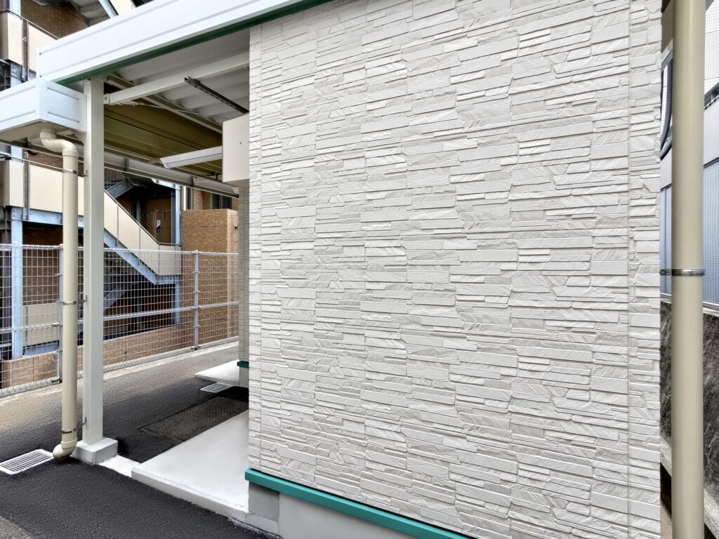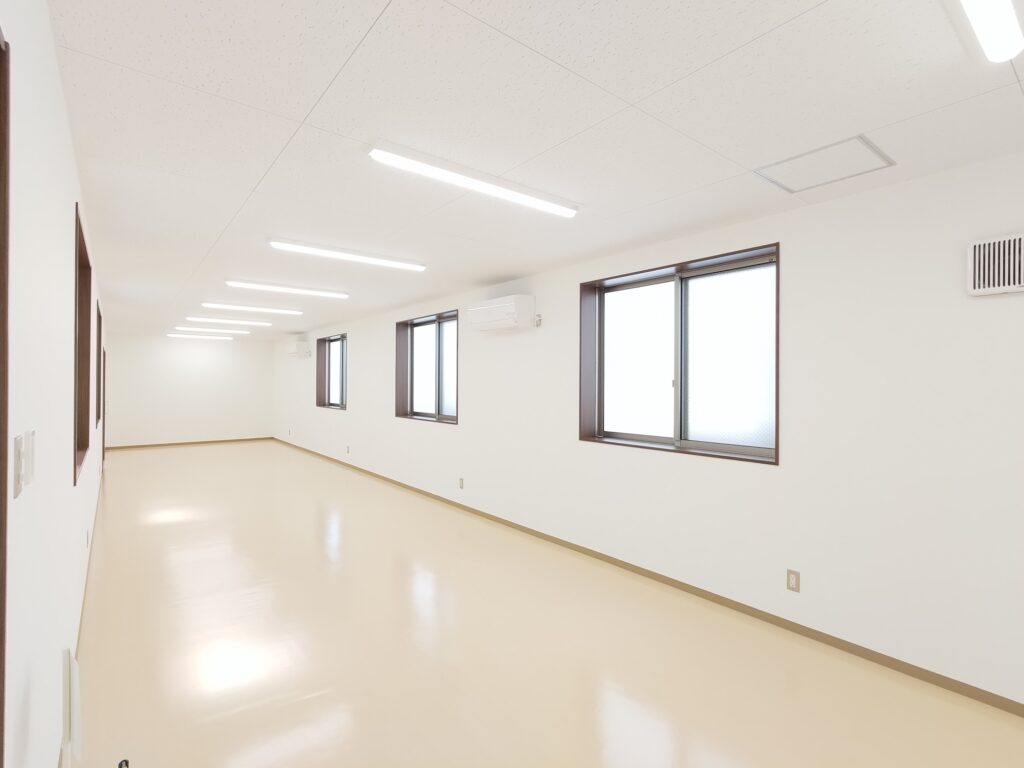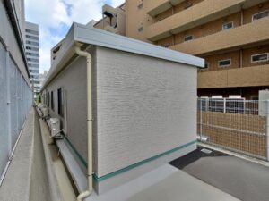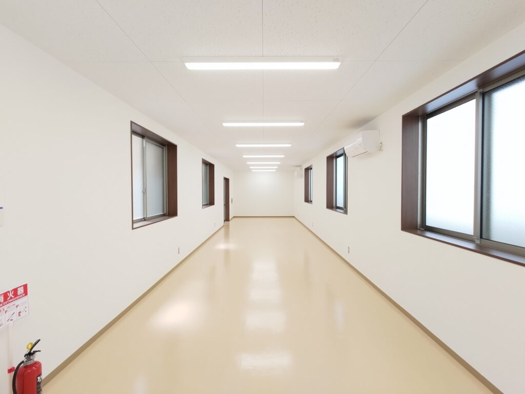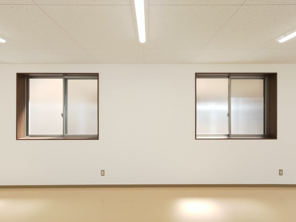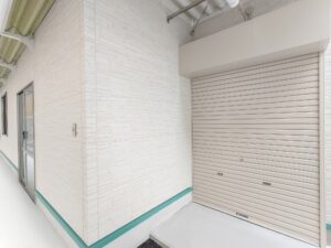 大学構内に設置された職員用の休憩室になります。外壁は明るい色調の石目調窯業系サイディングボードを採用。それに合わせて雨樋や柱・屋根なども色調を統一し、上品な質感に仕上がりました。視認性を高めるために水切りはライトグリーンのものを使用し、機能性を高めるとともに、外観のアクセントにもなっています。内装については、壁・天井はホワイト・床はベージュとし、大型の窓を通常より多めに配置した設計も相まって、外部からの光を多く取り込んだとても明るい部屋になっています。3.2㎡の物置室の入り口は延焼の恐れのある部分の為、ドアとシャッター(幅1.7mx高さ2.0m)の二重の仕様になっています。
