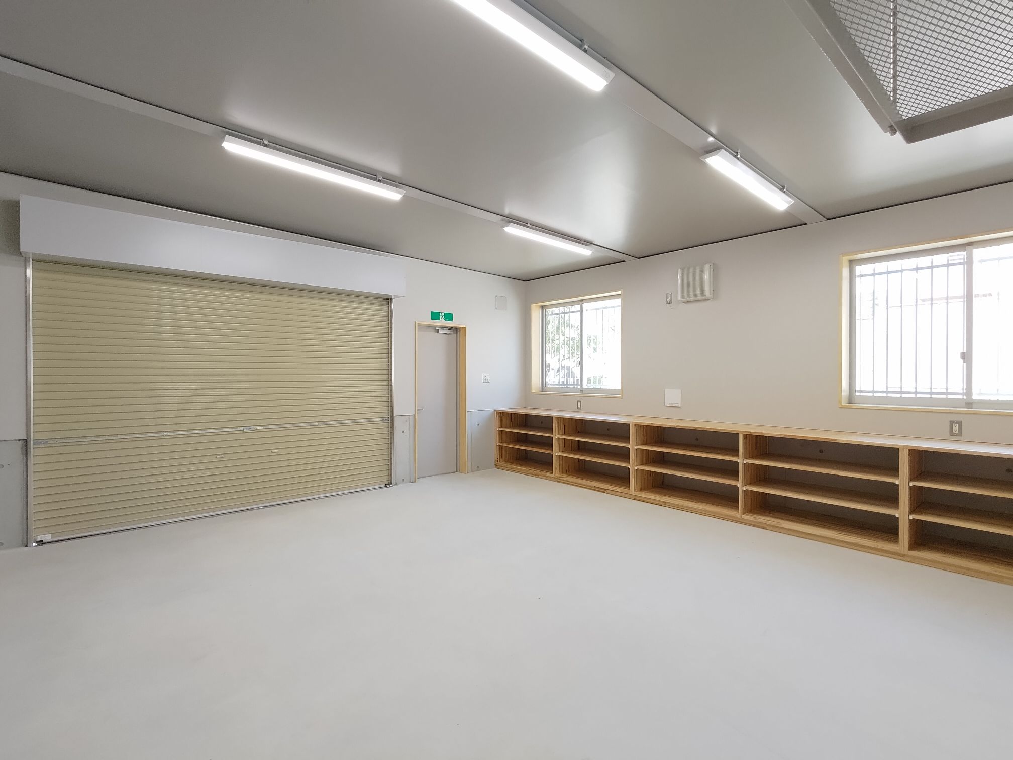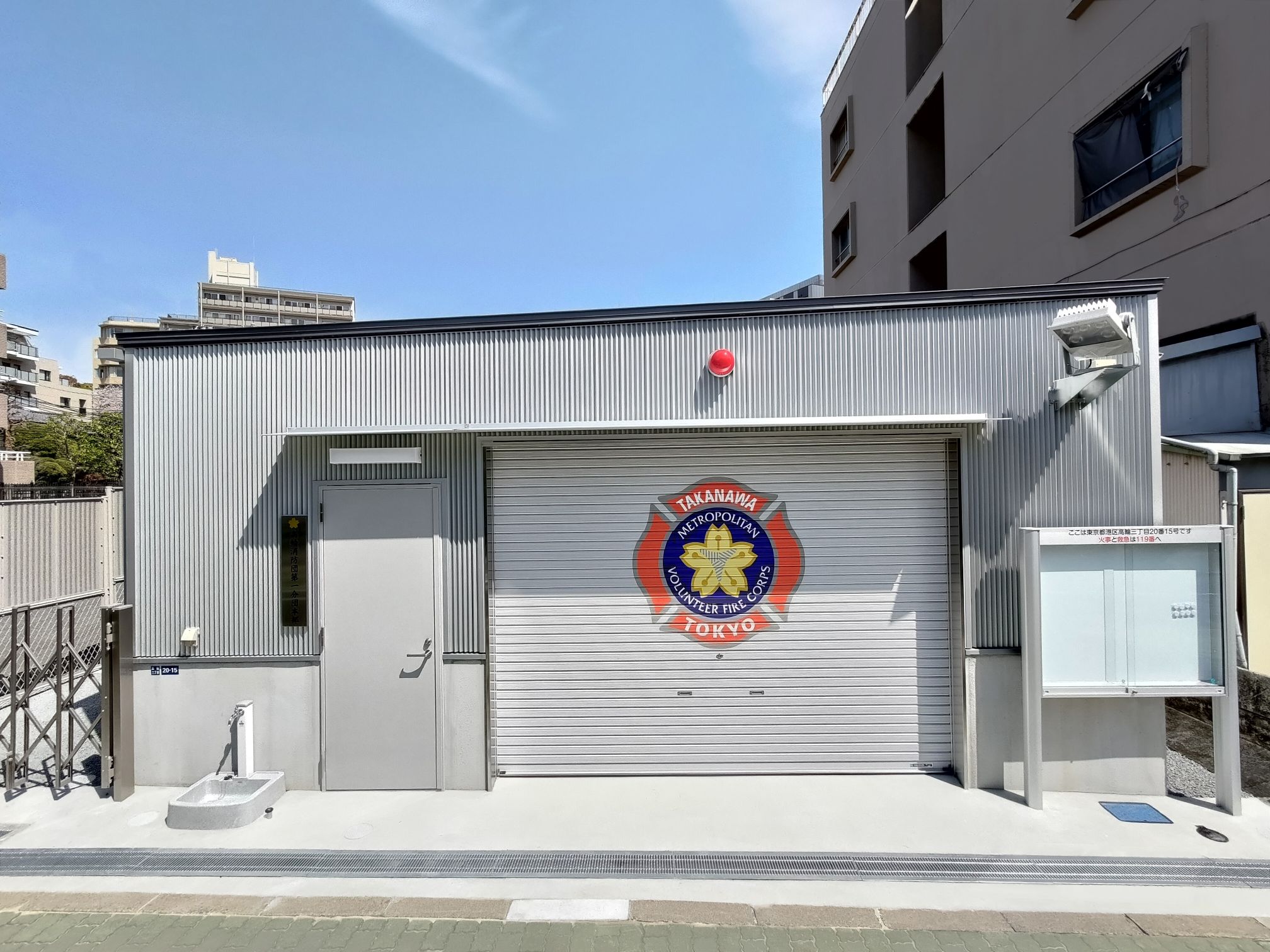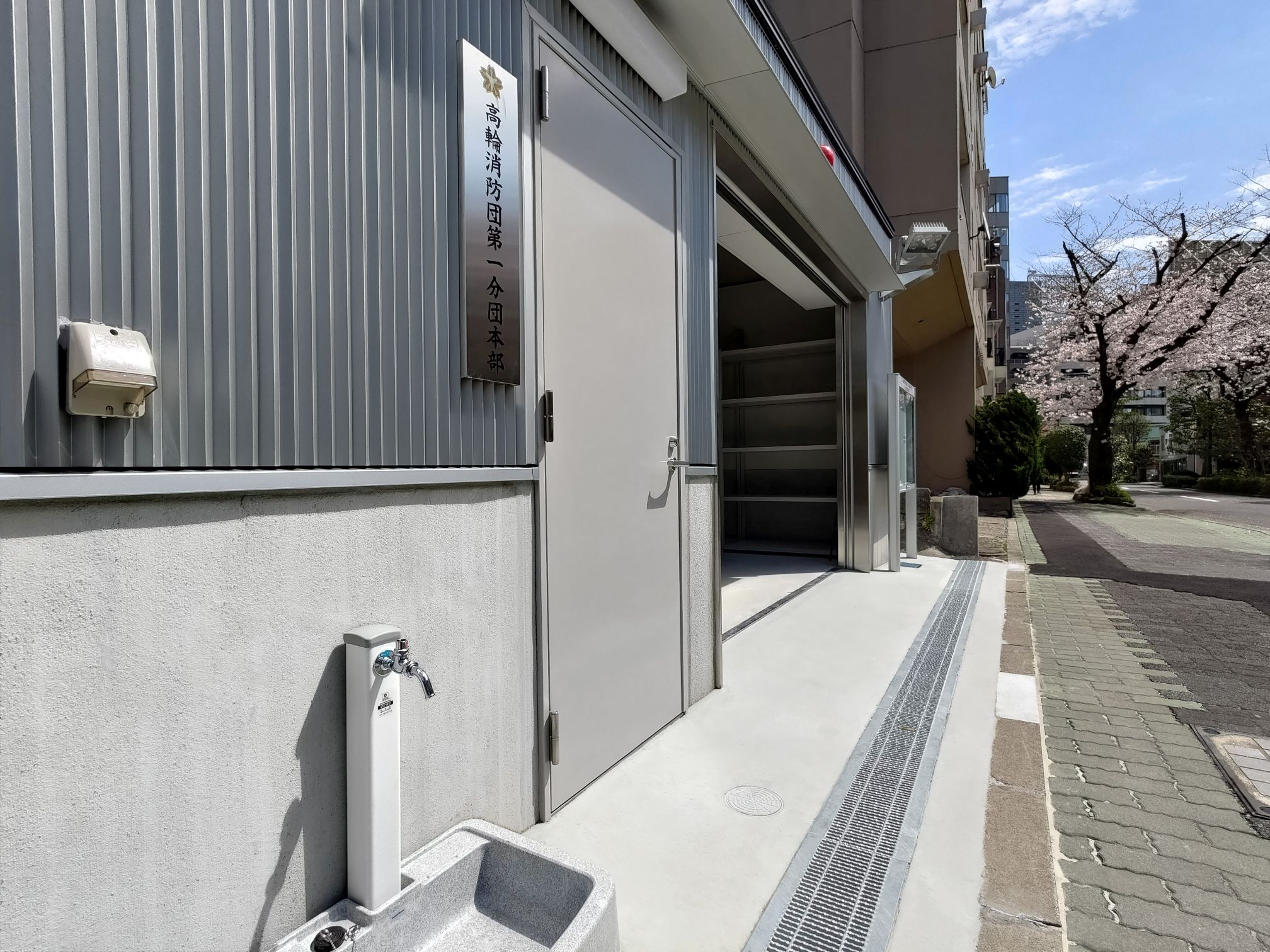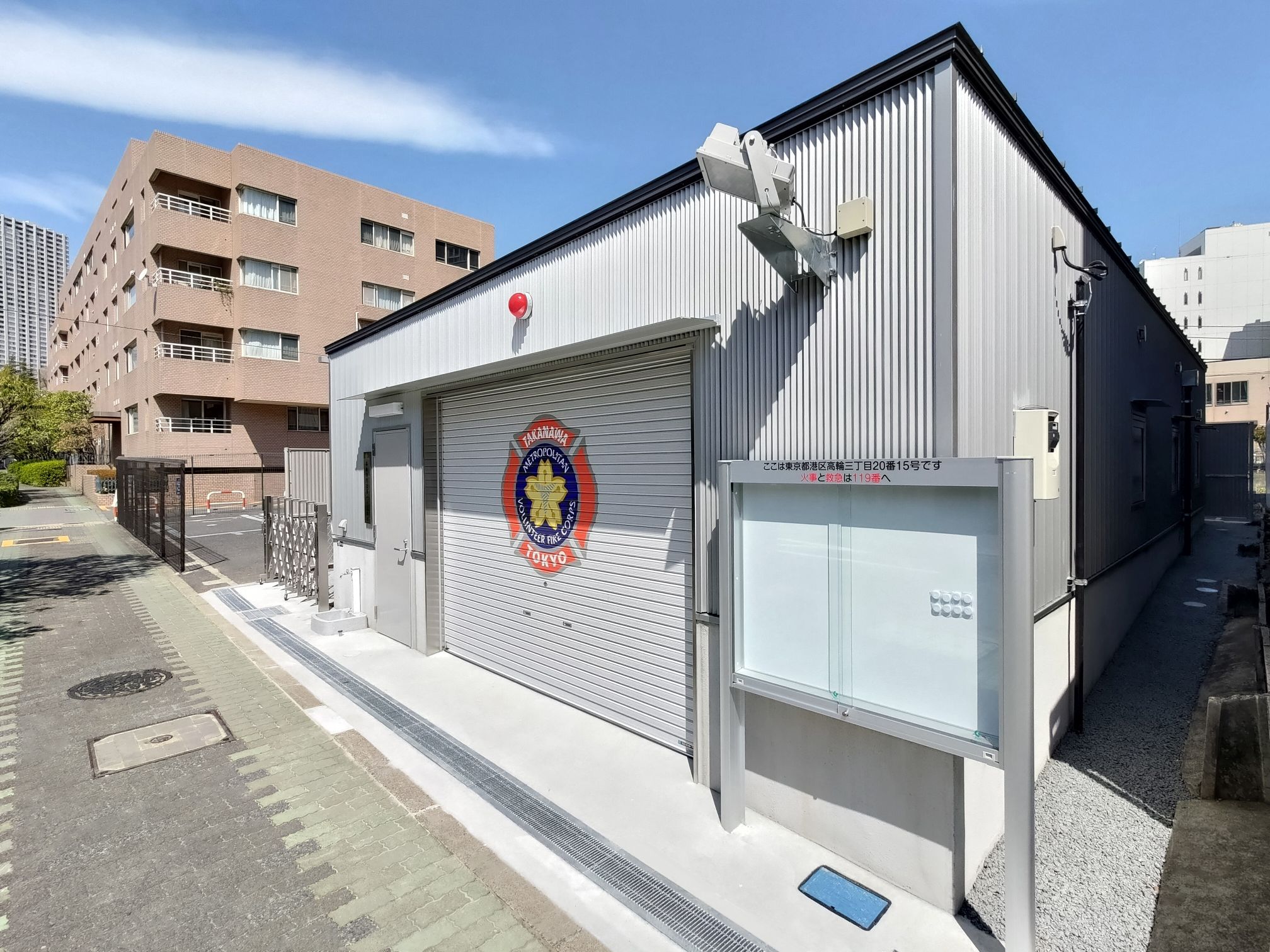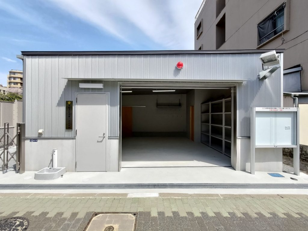 広い待機室・格納庫を備えた地域の消防団事務所です。間口3.1m、高さ2.3mの大型軽量シャッターを採用する事で、災害時の搬出入が容易に行え、建物脇の作業スペースも最大限確保し段差を無くす事で、狭い敷地でも防災活動が可能になっています。待機室の内装はアイボリーを基調とした仕上げで落ち着いた雰囲気にし、格納庫には各所でトーンの違うグレーを使う事でメリハリのある空間の仕上がり。また、待機室に設置された収納タイプの4連の吊戸は、引出すことにより簡易な更衣室の仕切りになり、プライバシーの保護に役立ちます。天井高を約3m確保した広々とした格納庫には、ホース類を収納するラックを始め、カウンター収納棚を通常よりも多く設置した事で、備蓄品の保管量が増え、避難場所としての役割も向上しています。建物の外壁にはシルバーの金属製三角スパンドレルを使用し、スマートな印象になっています。