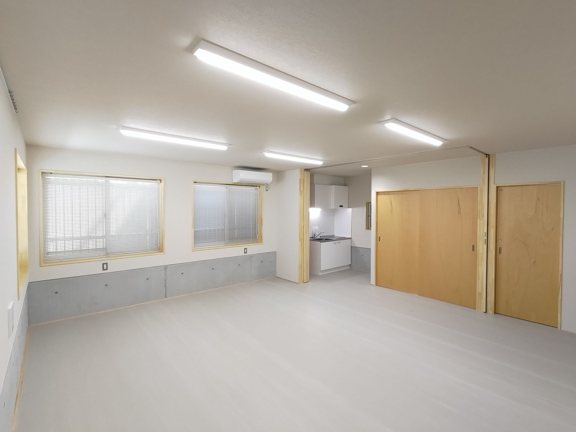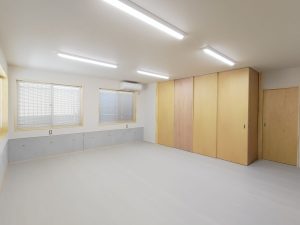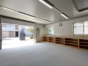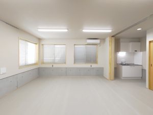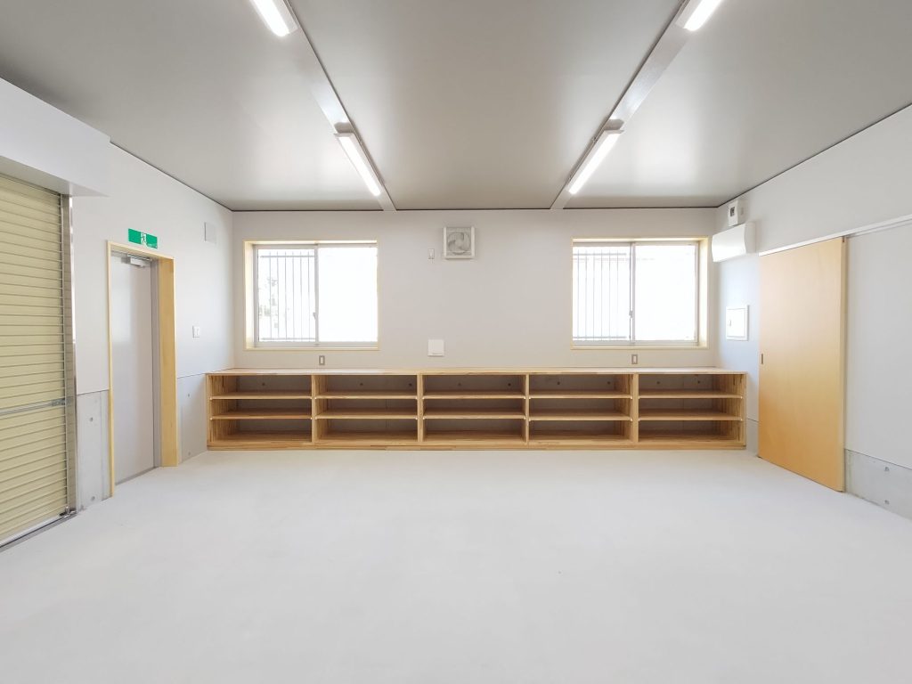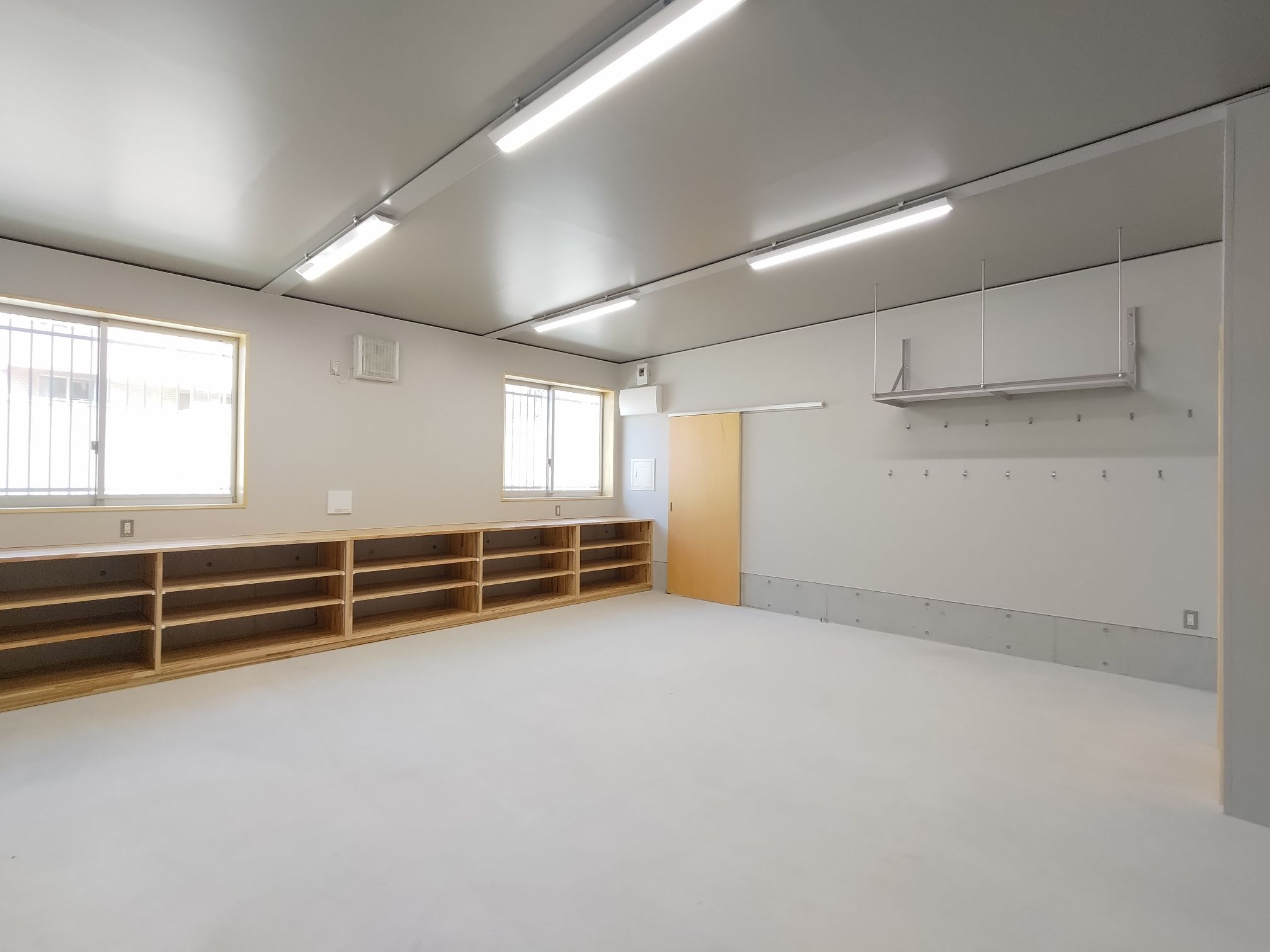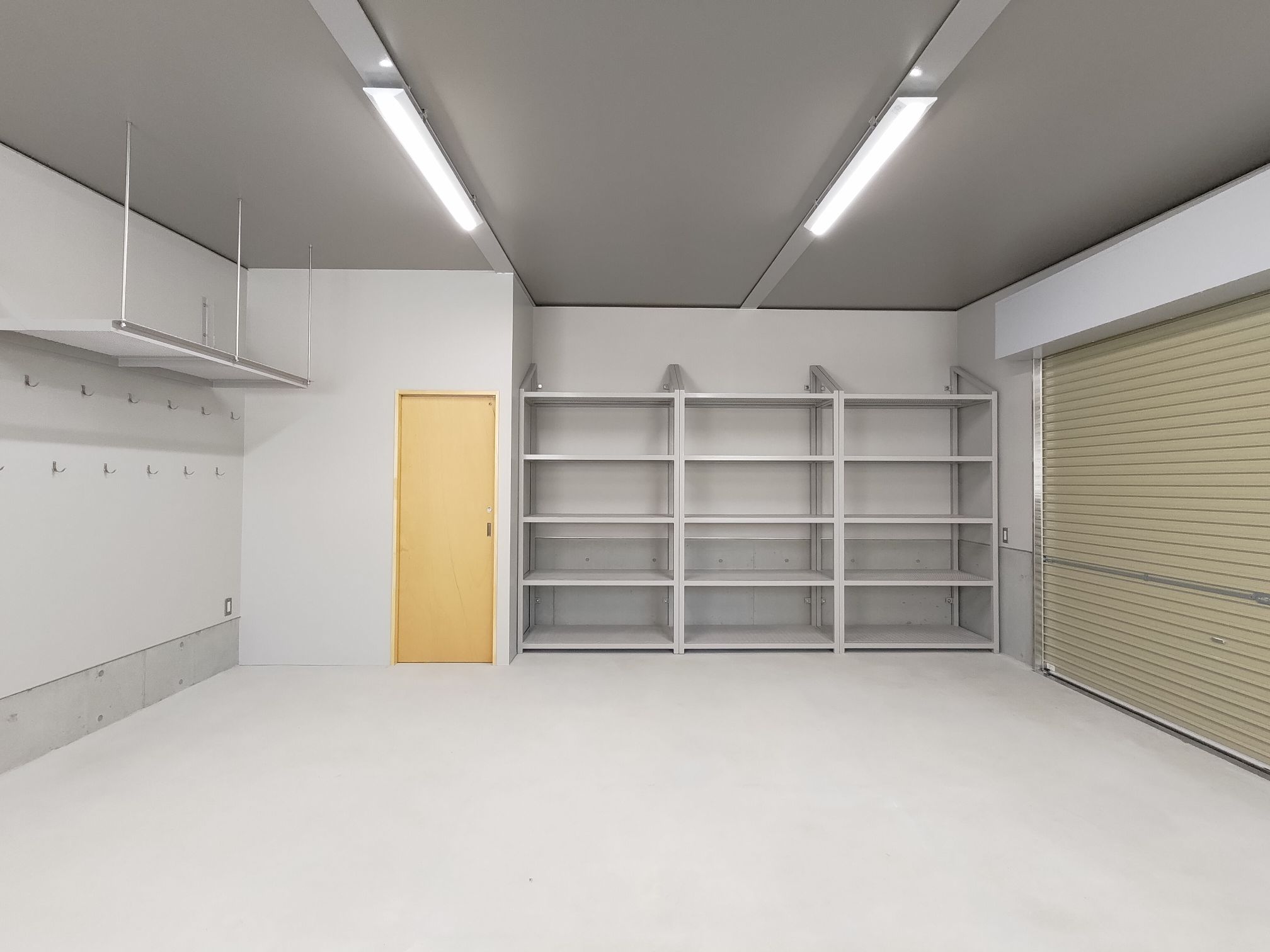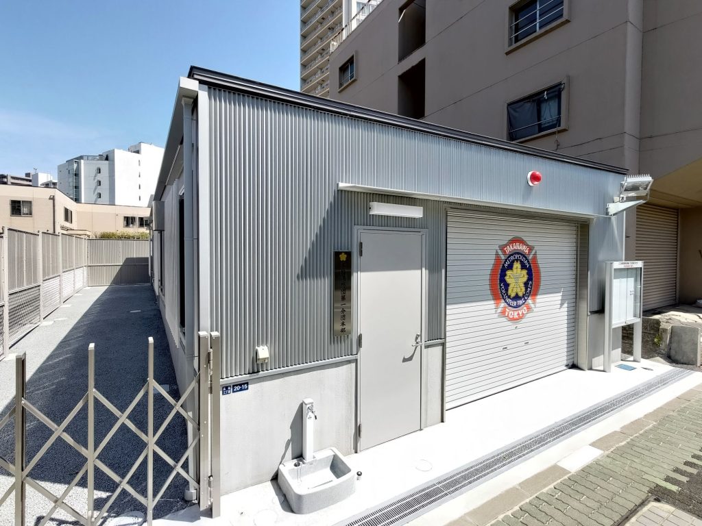 広い待機室・格納庫を備えた地域の消防団事務所です。間口3.1m、高さ2.3mの大型軽量シャッターを採用する事で、災害時の搬出入が容易に行え、建物脇の作業スペースも最大限確保し段差を無くす事で、狭い敷地でも防災活動が可能になっています。待機室の内装はアイボリーを基調とした仕上げで落ち着いた雰囲気にし、格納庫には各所でトーンの違うグレーを使う事でメリハリのある空間の仕上がり。また、待機室に設置された収納タイプの4連の吊戸は、引出すことにより簡易な更衣室の仕切りになり、プライバシーの保護に役立ちます。天井高を約3m確保した広々とした格納庫には、ホース類を収納するラックを始め、カウンター収納棚を通常よりも多く設置した事で、備蓄品の保管量が増え、避難場所としての役割も向上しています。建物の外壁にはシルバーの金属製三角スパンドレルを使用し、スマートな印象になっています。