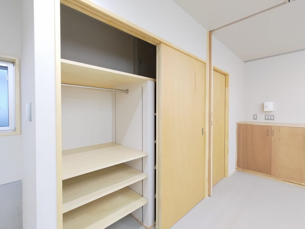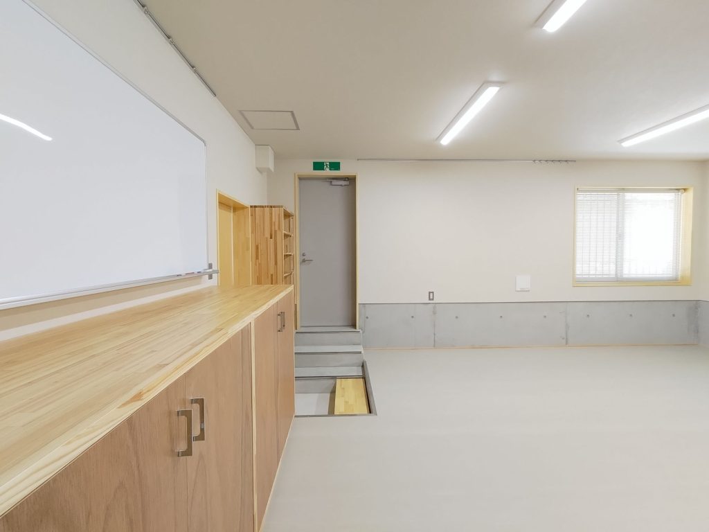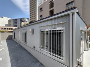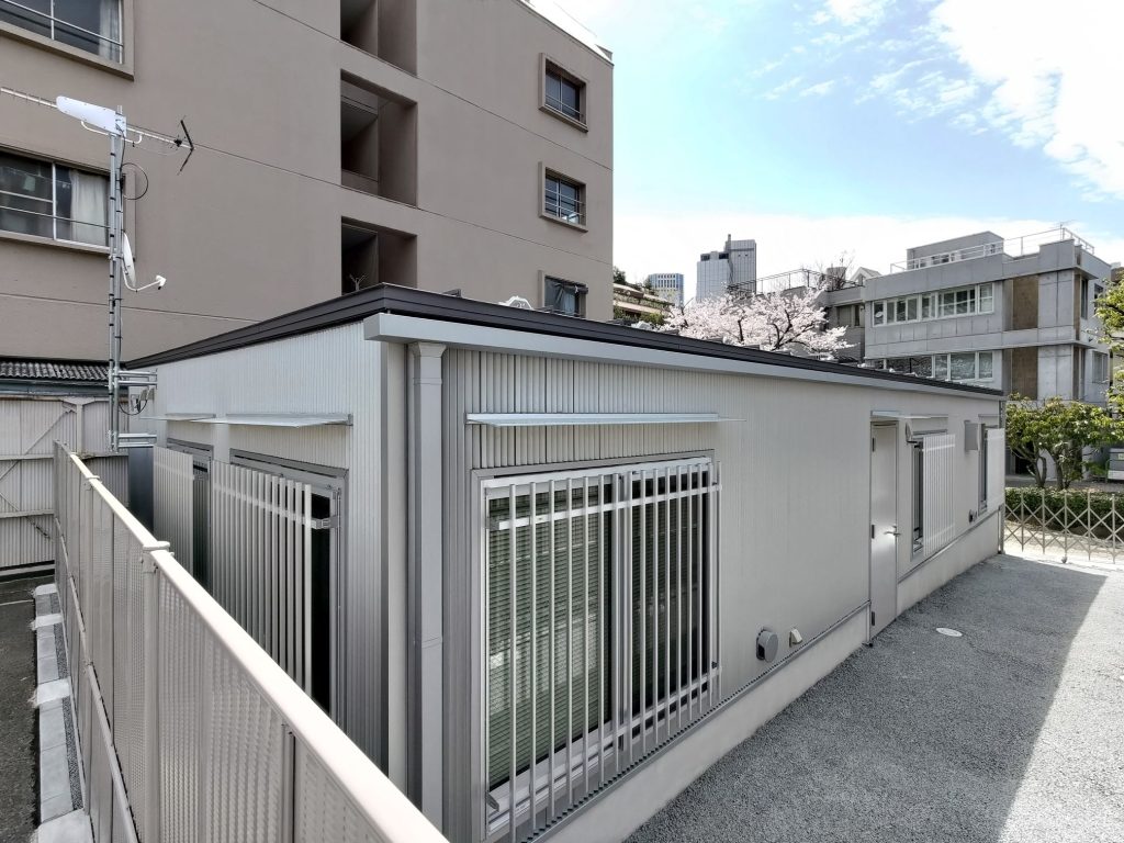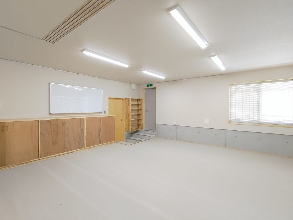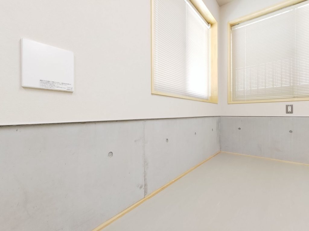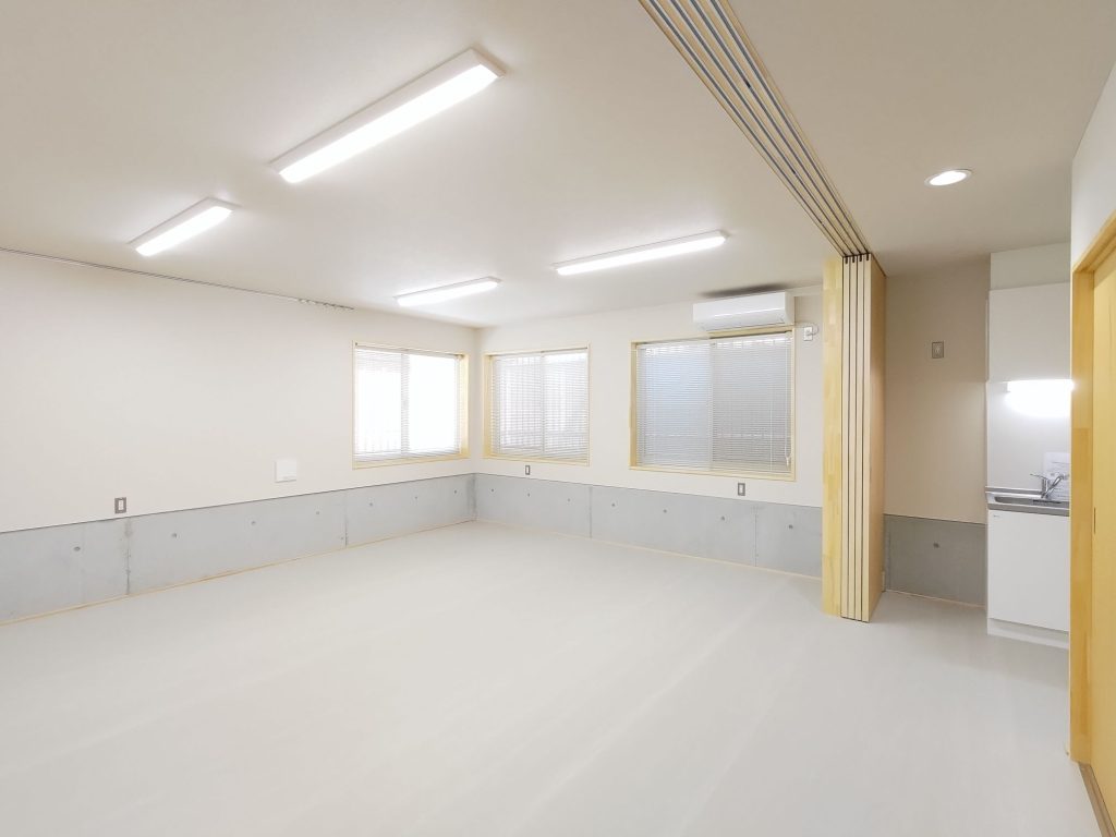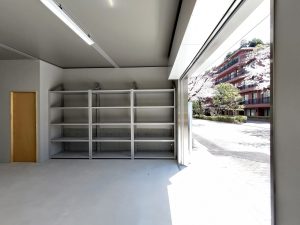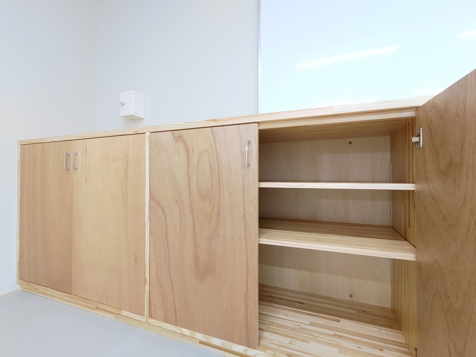 広い待機室・格納庫を備えた地域の消防団事務所です。間口3.1m、高さ2.3mの大型軽量シャッターを採用する事で、災害時の搬出入が容易に行え、建物脇の作業スペースも最大限確保し段差を無くす事で、狭い敷地でも防災活動が可能になっています。待機室の内装はアイボリーを基調とした仕上げで落ち着いた雰囲気にし、格納庫には各所でトーンの違うグレーを使う事でメリハリのある空間の仕上がり。また、待機室に設置された収納タイプの4連の吊戸は、引出すことにより簡易な更衣室の仕切りになり、プライバシーの保護に役立ちます。天井高を約3m確保した広々とした格納庫には、ホース類を収納するラックを始め、カウンター収納棚を通常よりも多く設置した事で、備蓄品の保管量が増え、避難場所としての役割も向上しています。建物の外壁にはシルバーの金属製三角スパンドレルを使用し、スマートな印象になっています。