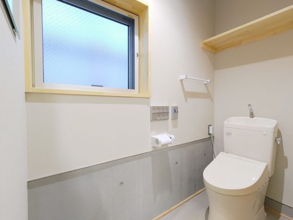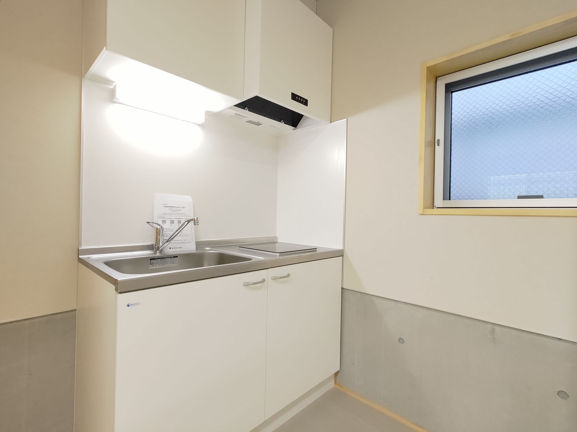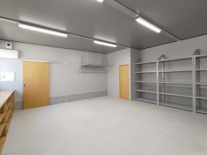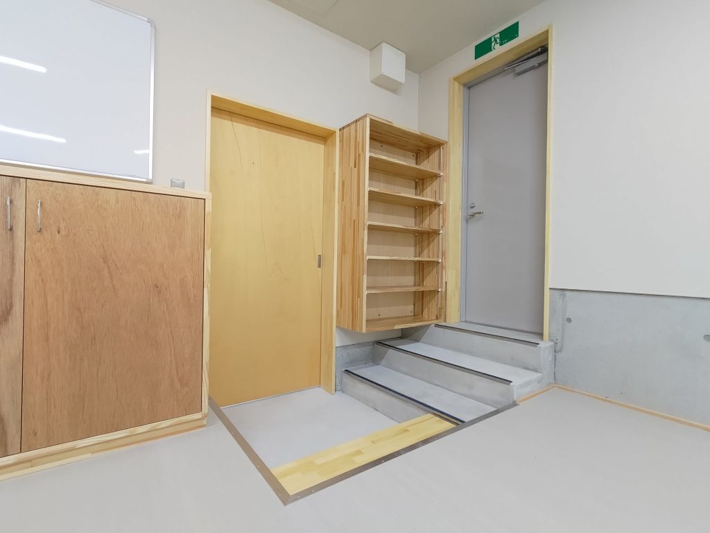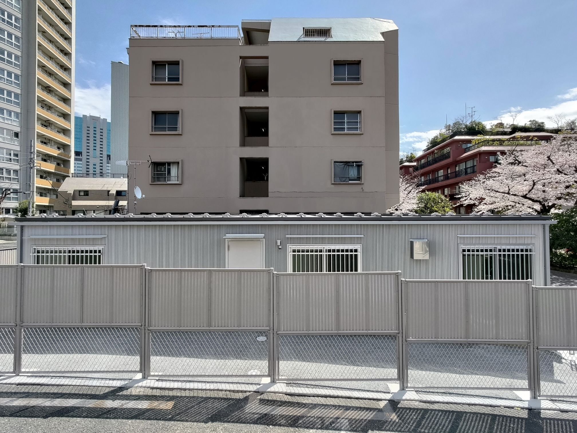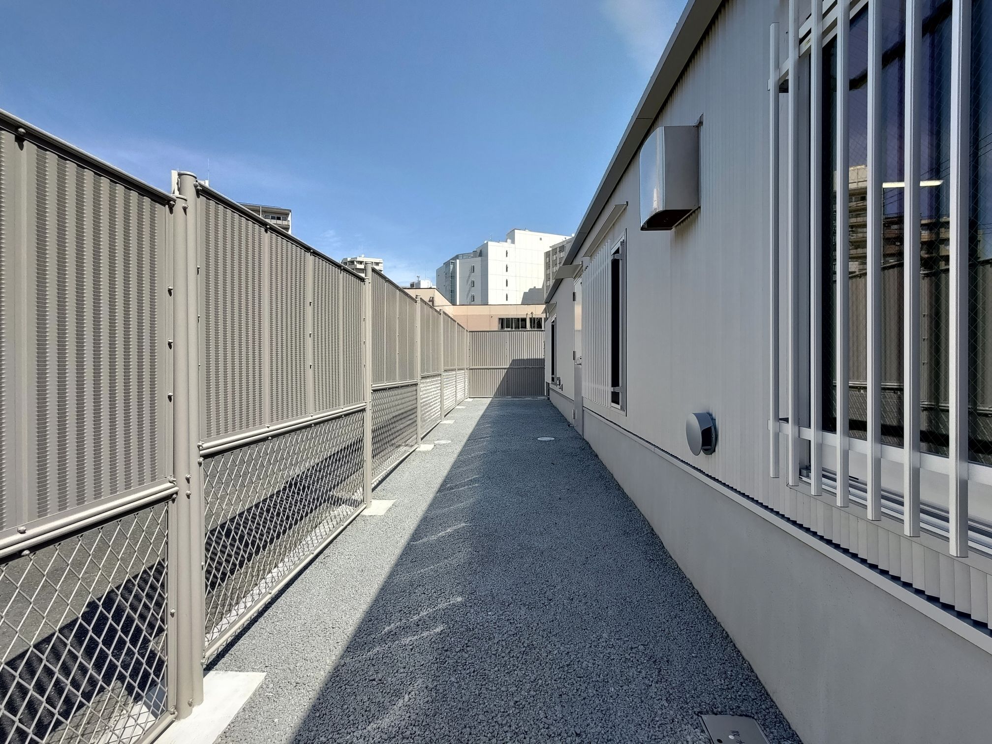 広い待機室・格納庫を備えた地域の消防団事務所です。間口3.1m、高さ2.3mの大型軽量シャッターを採用する事で、災害時の搬出入が容易に行え、建物脇の作業スペースも最大限確保し段差を無くす事で、狭い敷地でも防災活動が可能になっています。待機室の内装はアイボリーを基調とした仕上げで落ち着いた雰囲気にし、格納庫には各所でトーンの違うグレーを使う事でメリハリのある空間の仕上がり。また、待機室に設置された収納タイプの4連の吊戸は、引出すことにより簡易な更衣室の仕切りになり、プライバシーの保護に役立ちます。天井高を約3m確保した広々とした格納庫には、ホース類を収納するラックを始め、カウンター収納棚を通常よりも多く設置した事で、備蓄品の保管量が増え、避難場所としての役割も向上しています。建物の外壁にはシルバーの金属製三角スパンドレルを使用し、スマートな印象になっています。