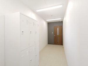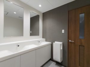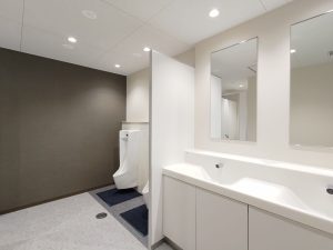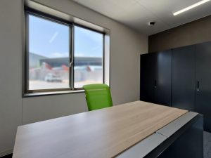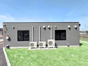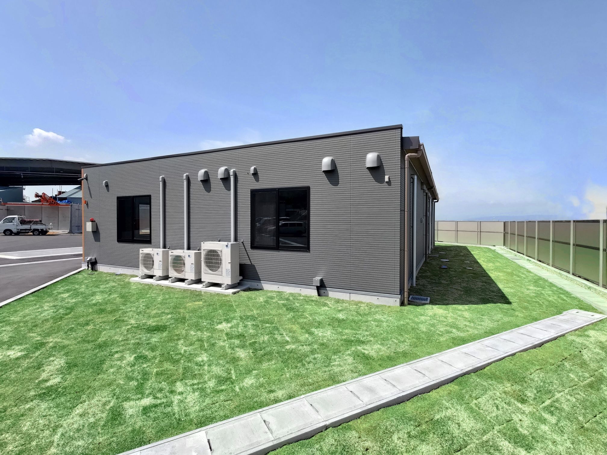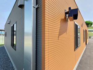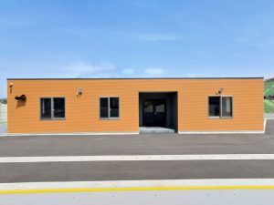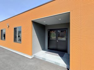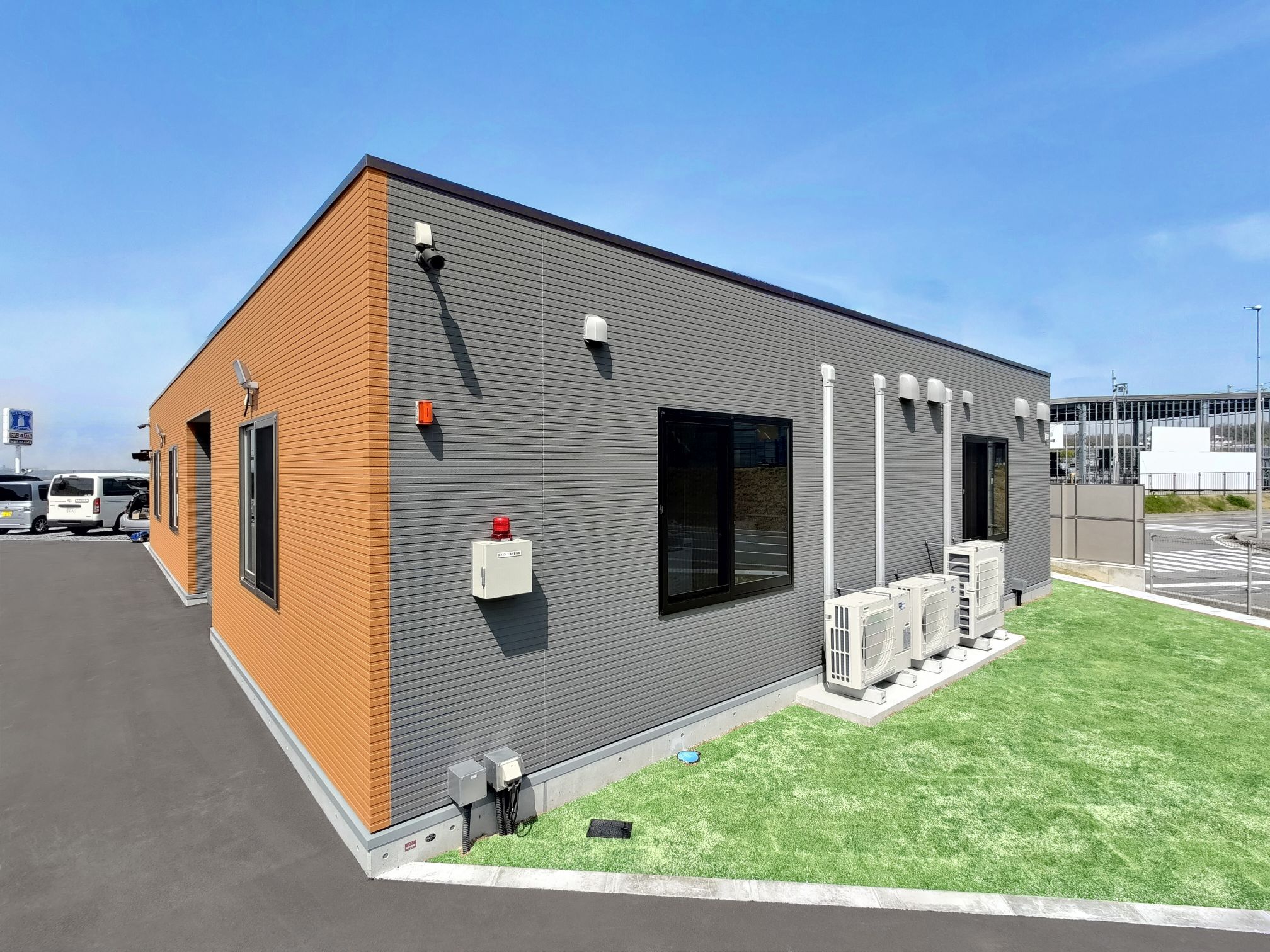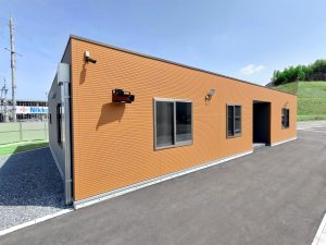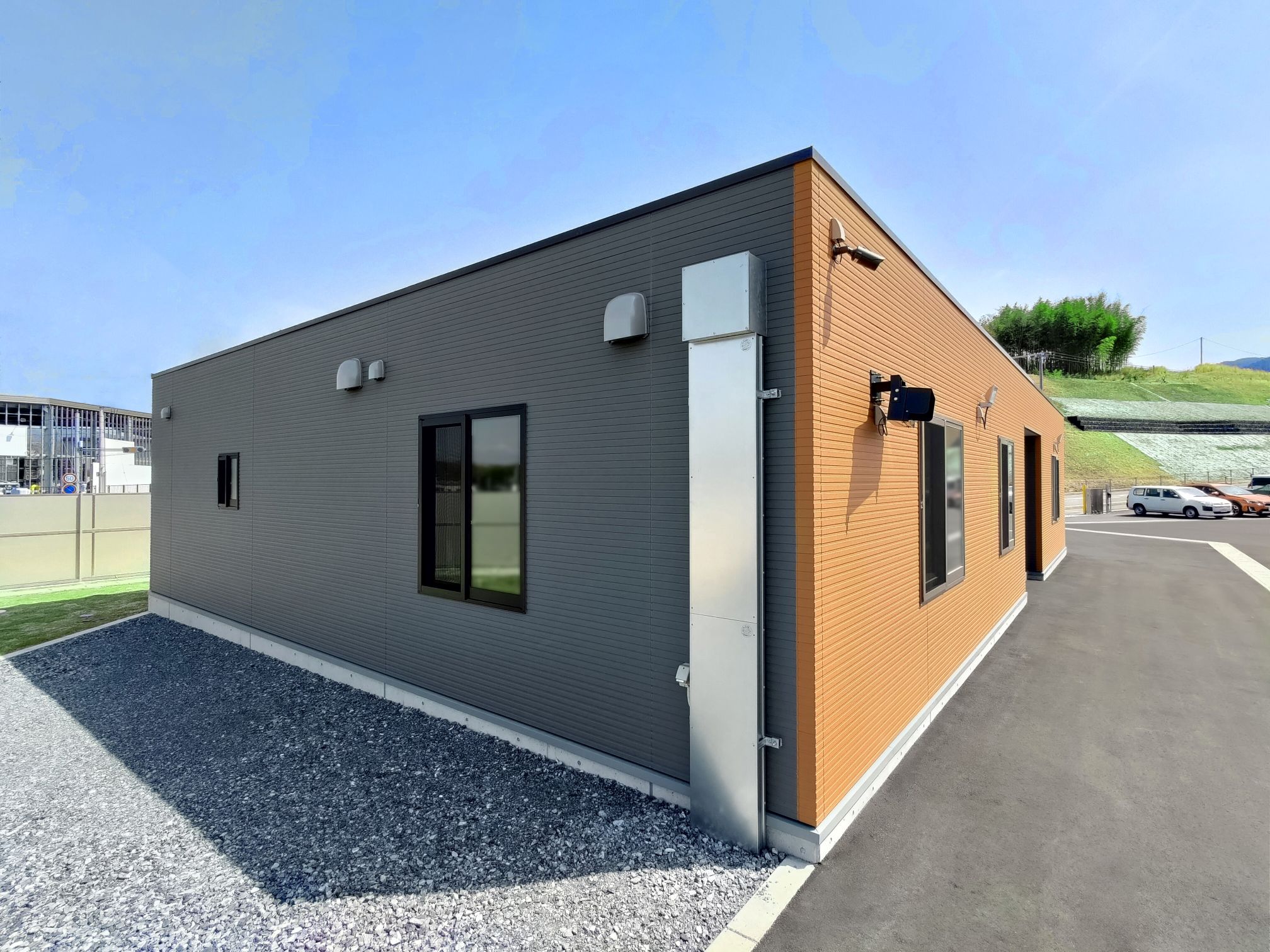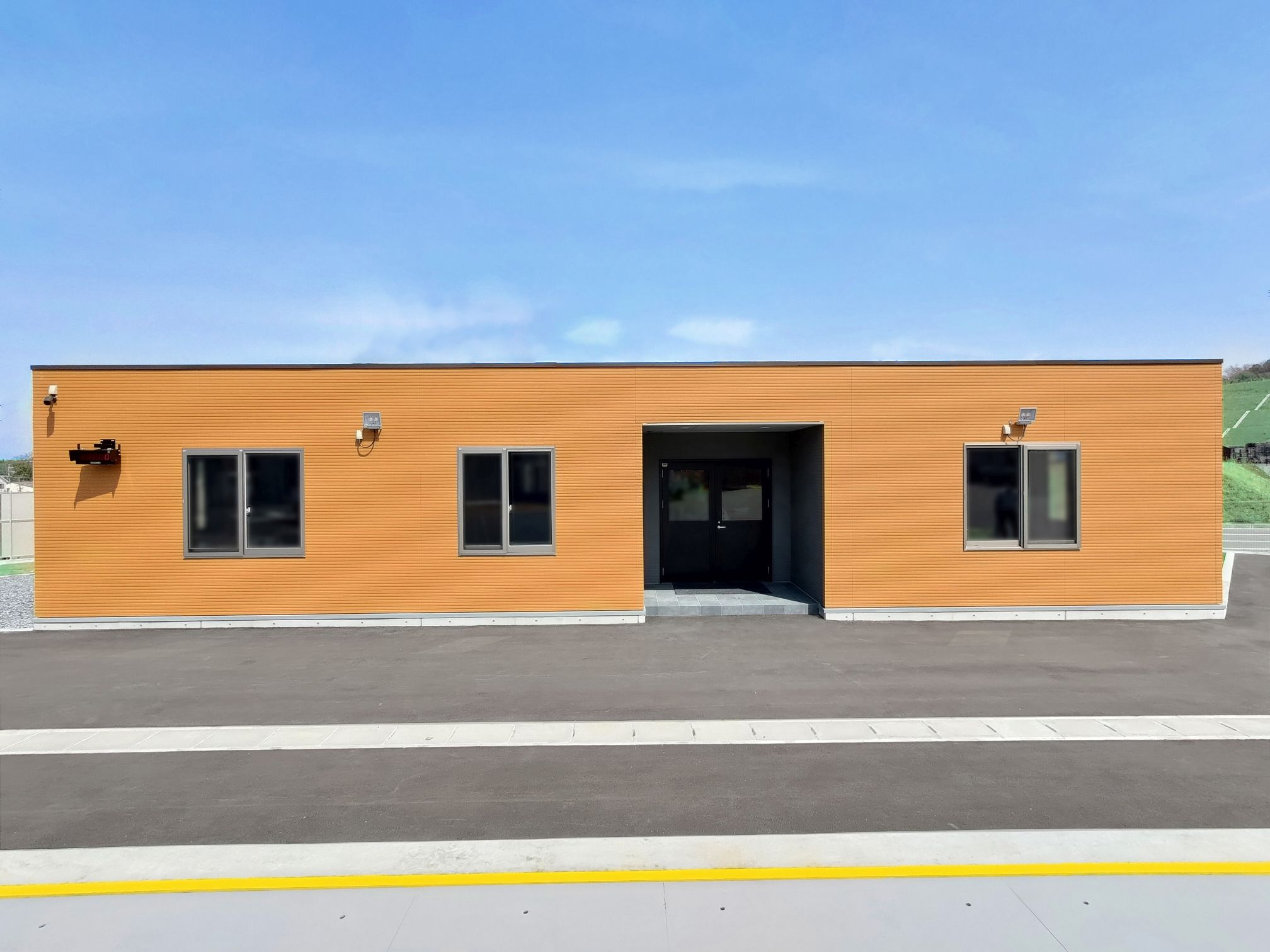 リサイクル工場敷地内に建てられたTDシリーズの事務所。工業地帯に立地していることもあり、外壁3方は周囲の景観に馴染むグレーを採用。玄関側にはオレンジの外壁をアクセントとして取り入れています。事務所の前面がトラックの計量所も兼ねているため、トラックと干渉する庇は設置せずに、玄関を奥に入れることで、雨がかりを解消しております。