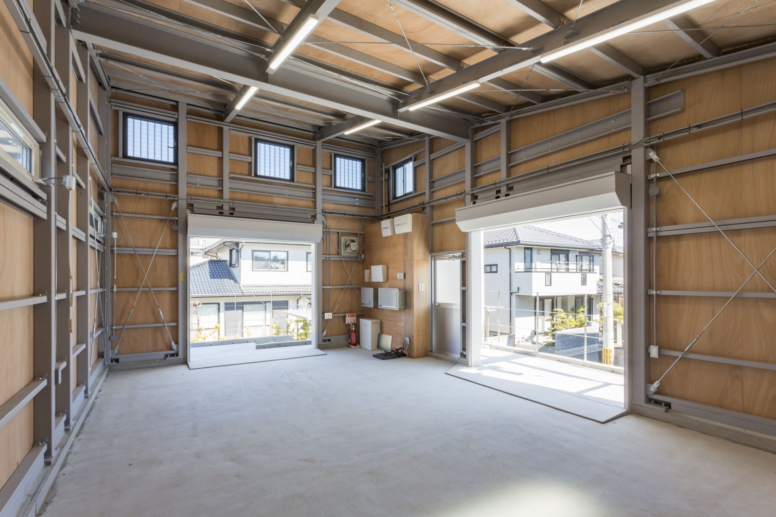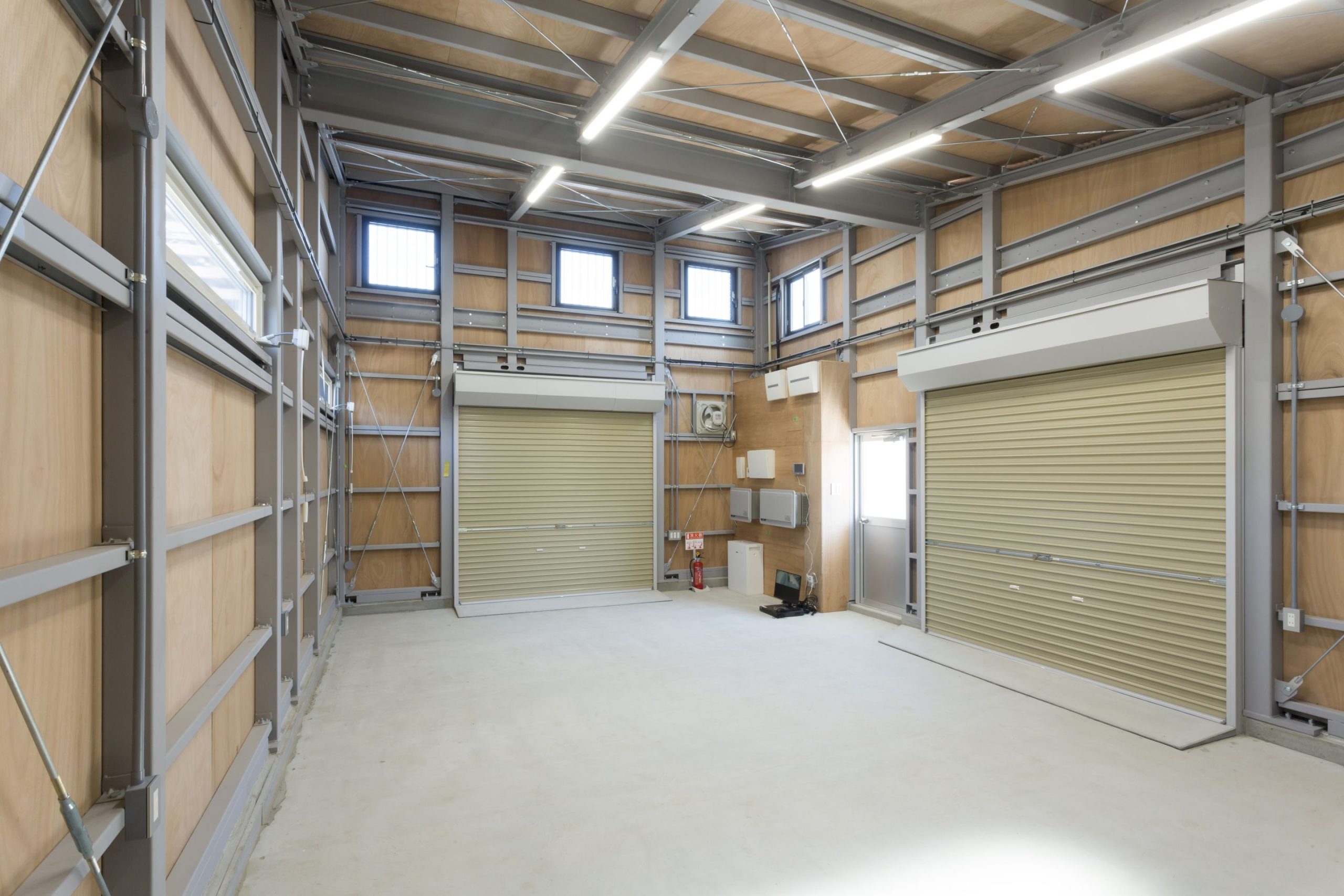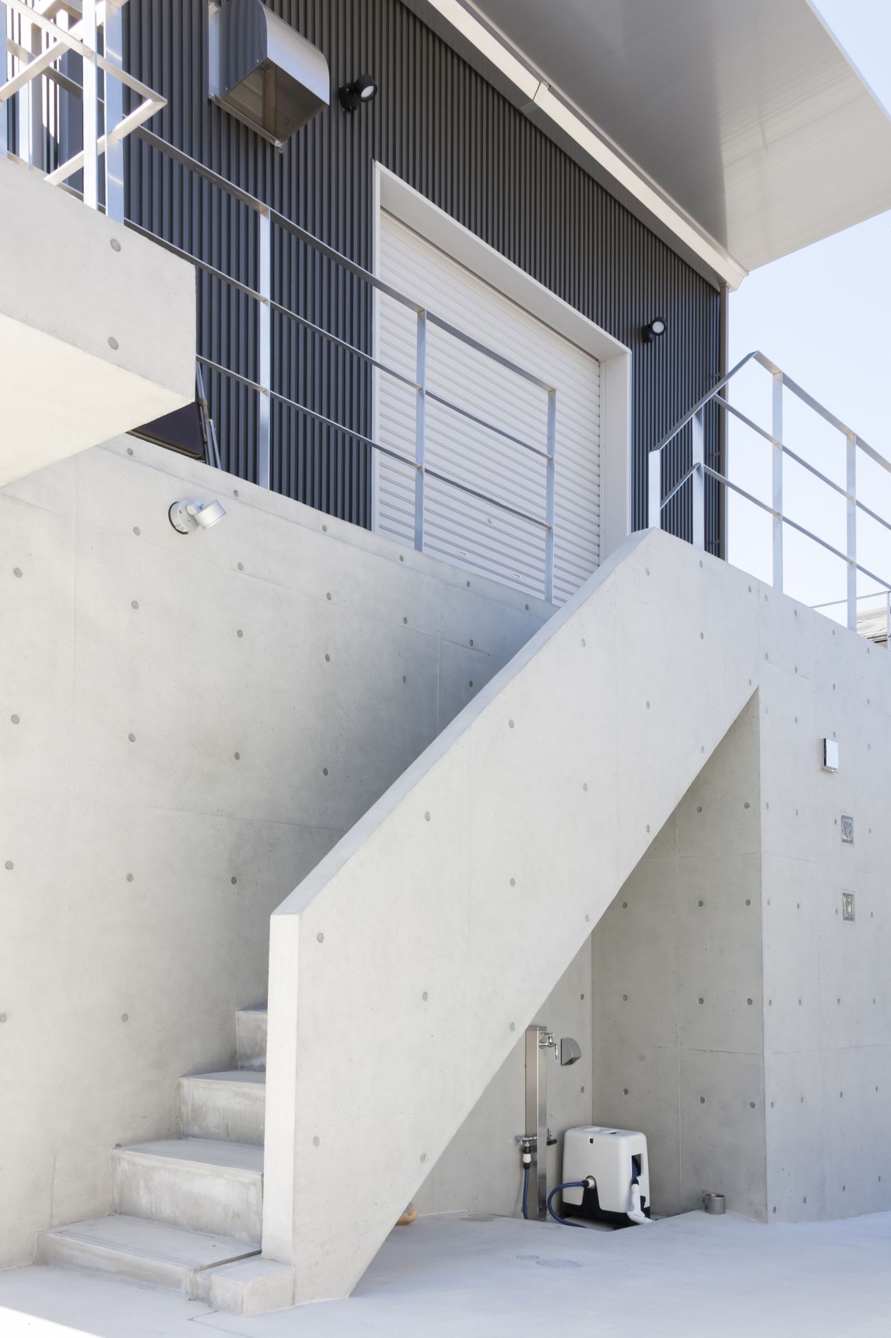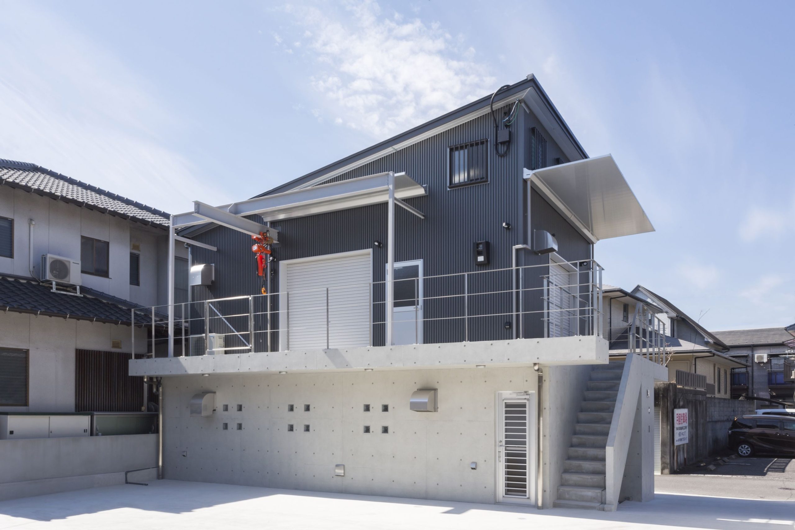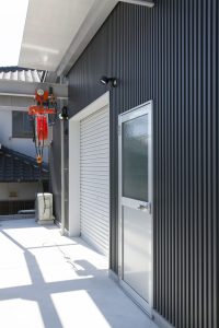 1階が車庫、2階が資材倉庫になっている案件です。1階の天井高は2.4mを確保。さらに幅5.5m高さ2.3mの大型電動シャッターを設置し、車庫として利便性を向上。2階には幅2.3m高さ2.2mの軽量手動シャッターを採用。また2階の屋根上に太陽光パネルを設置するため、パネルメーカーと協議し屋根勾配を10°としました。この屋根勾配は外観のアクセントにもなっており、2階の天井高にも3.0m~4.1mという幅を持たせることができ、資材の保管レイアウトに自由度を持たせています。窓には横長のスリット窓を採光として配置し、換気用のルーバー窓も取り付けています。外壁は銀黒色の角波鋼板で、深彫タイプのものを使用し、引き締まったイメージになっています。倉庫には建設資材などを保管する予定で、そのため外部にチェーンブロックをつけて荷揚げしたいとの要望があり、補強用の柱と梁を外部に設置し、外部通路は雨に濡れないようアルミ庇を採用しすっきりと仕上げました。