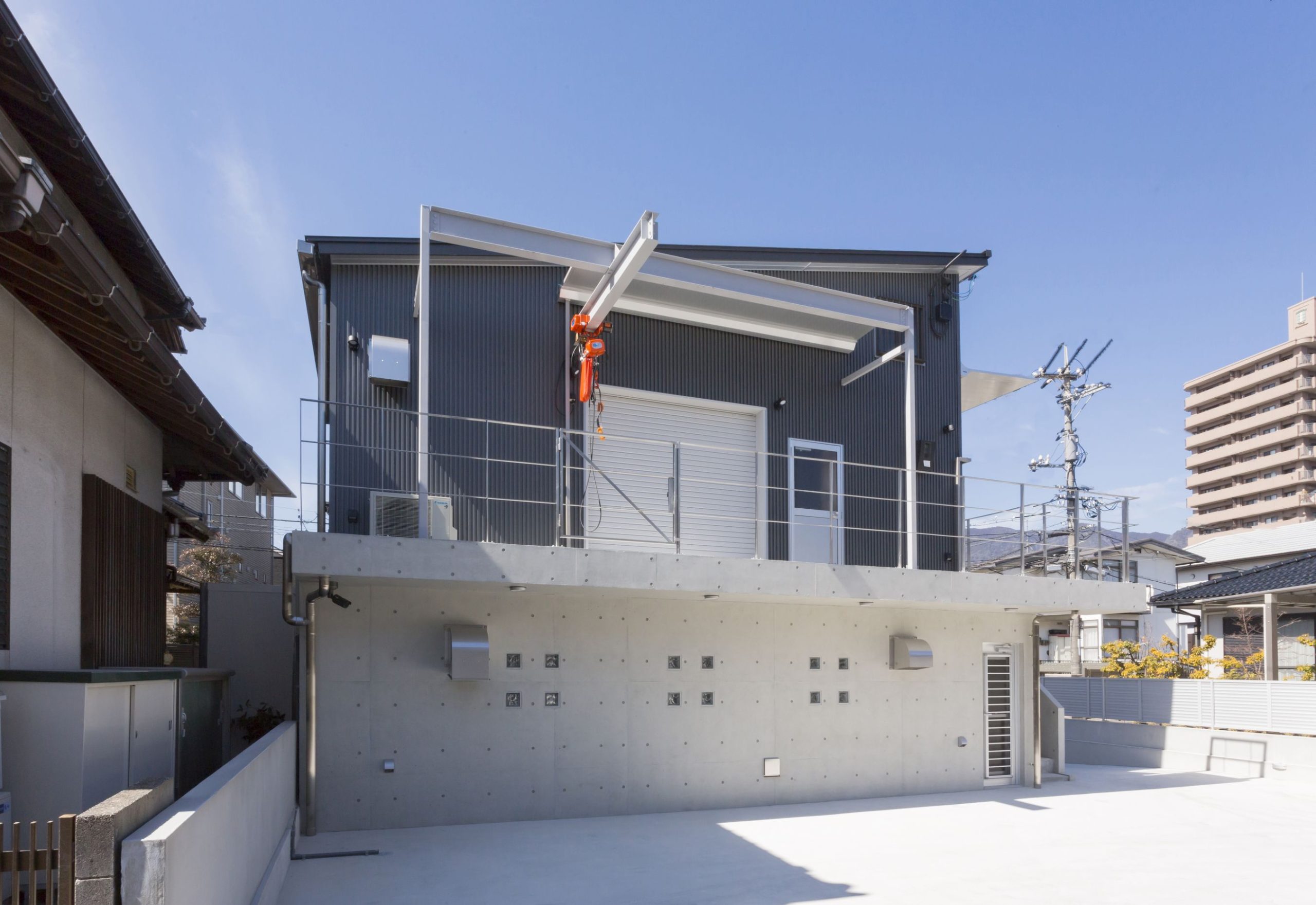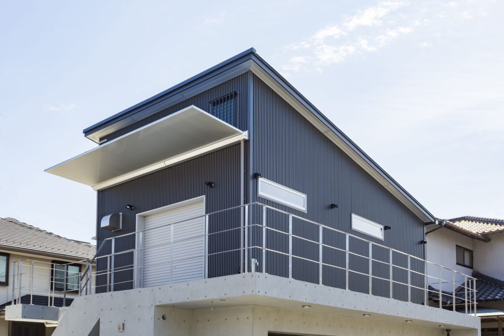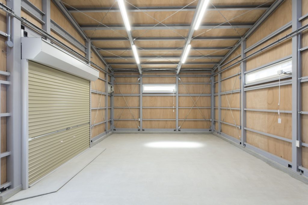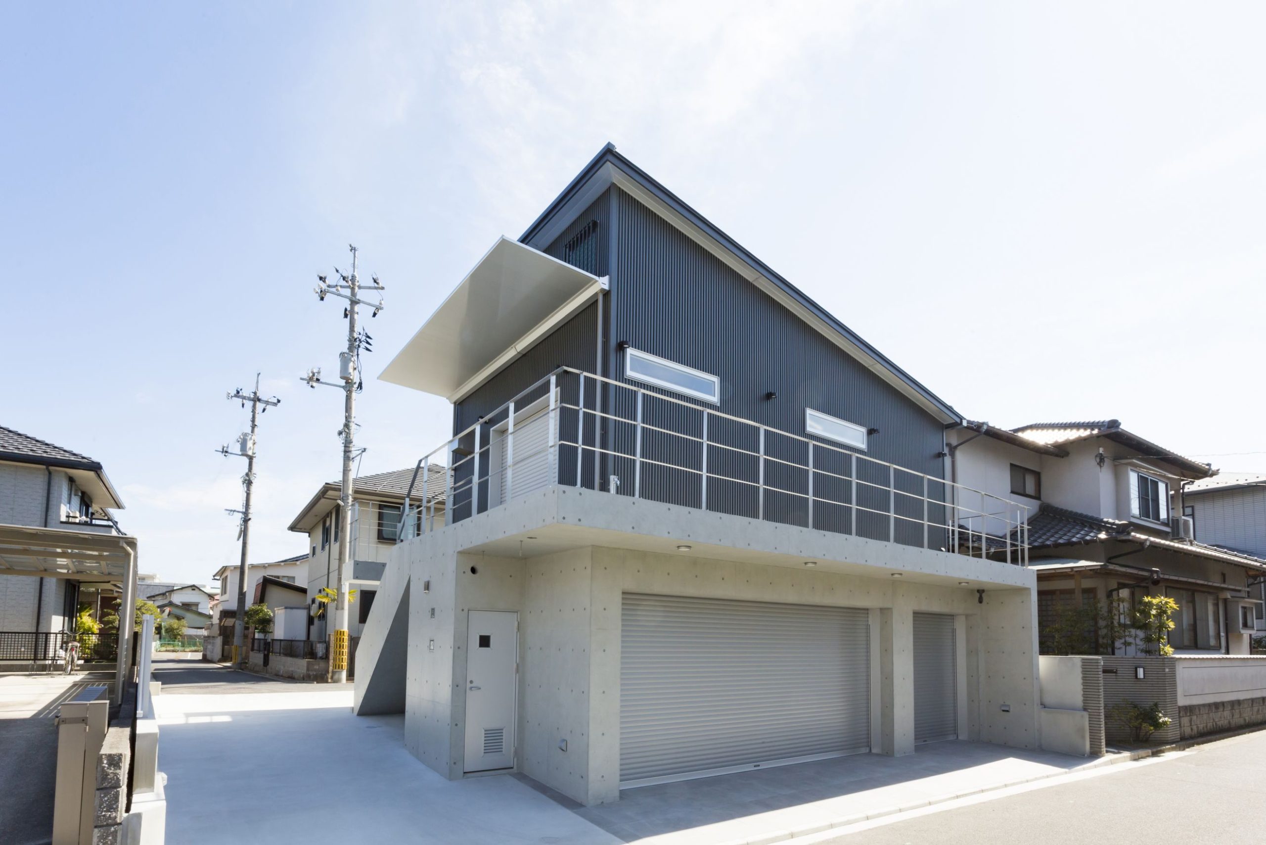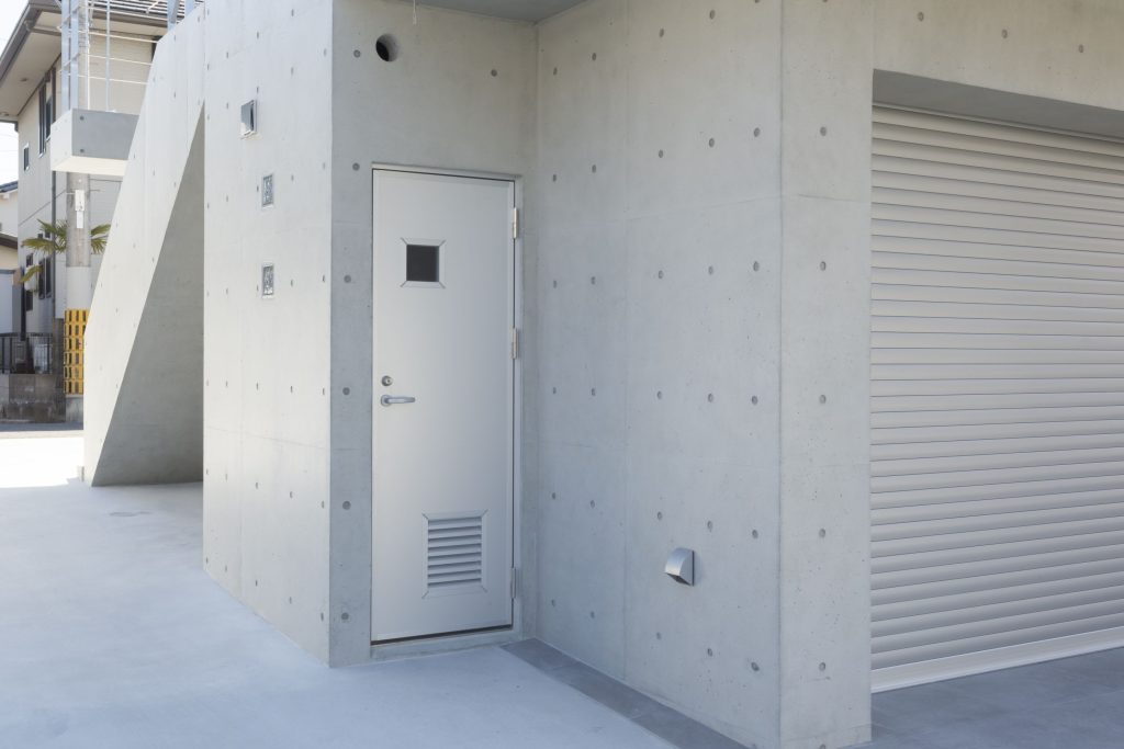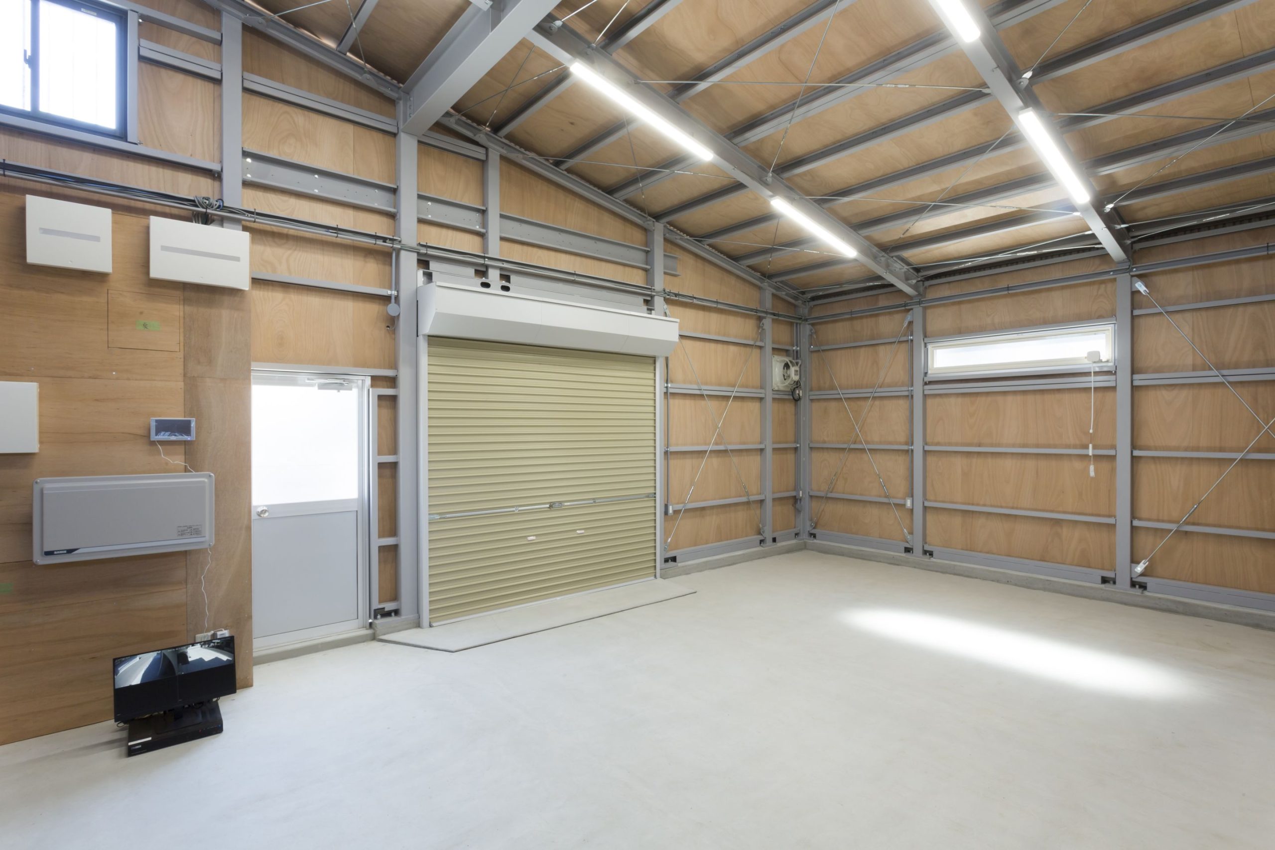 1階が車庫、2階が資材倉庫になっている案件です。1階の天井高は2.4mを確保。さらに幅5.5m高さ2.3mの大型電動シャッターを設置し、車庫として利便性を向上。2階には幅2.3m高さ2.2mの軽量手動シャッターを採用。また2階の屋根上に太陽光パネルを設置するため、パネルメーカーと協議し屋根勾配を10°としました。この屋根勾配は外観のアクセントにもなっており、2階の天井高にも3.0m~4.1mという幅を持たせることができ、資材の保管レイアウトに自由度を持たせています。窓には横長のスリット窓を採光として配置し、換気用のルーバー窓も取り付けています。外壁は銀黒色の角波鋼板で、深彫タイプのものを使用し、引き締まったイメージになっています。倉庫には建設資材などを保管する予定で、そのため外部にチェーンブロックをつけて荷揚げしたいとの要望があり、補強用の柱と梁を外部に設置し、外部通路は雨に濡れないようアルミ庇を採用しすっきりと仕上げました。