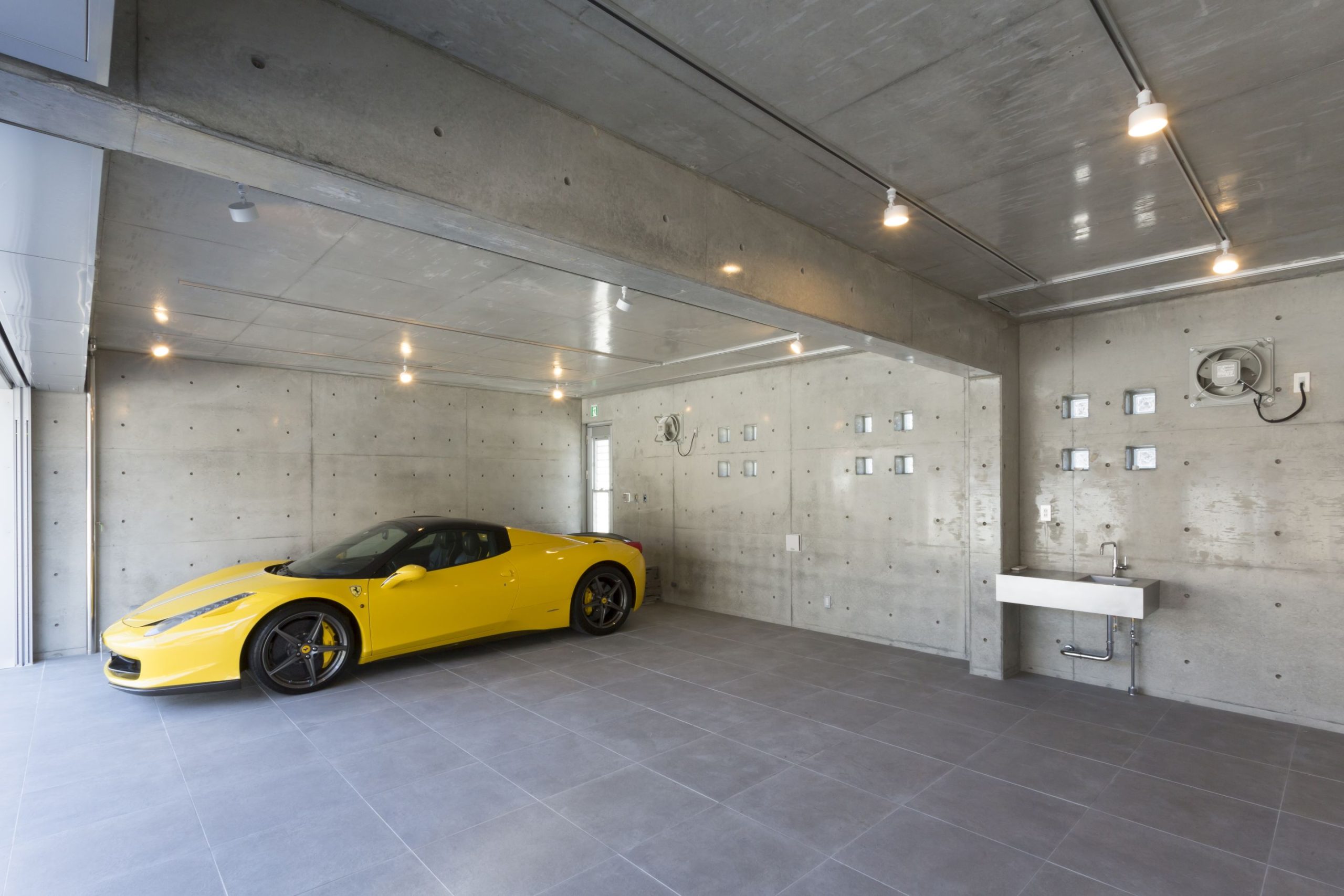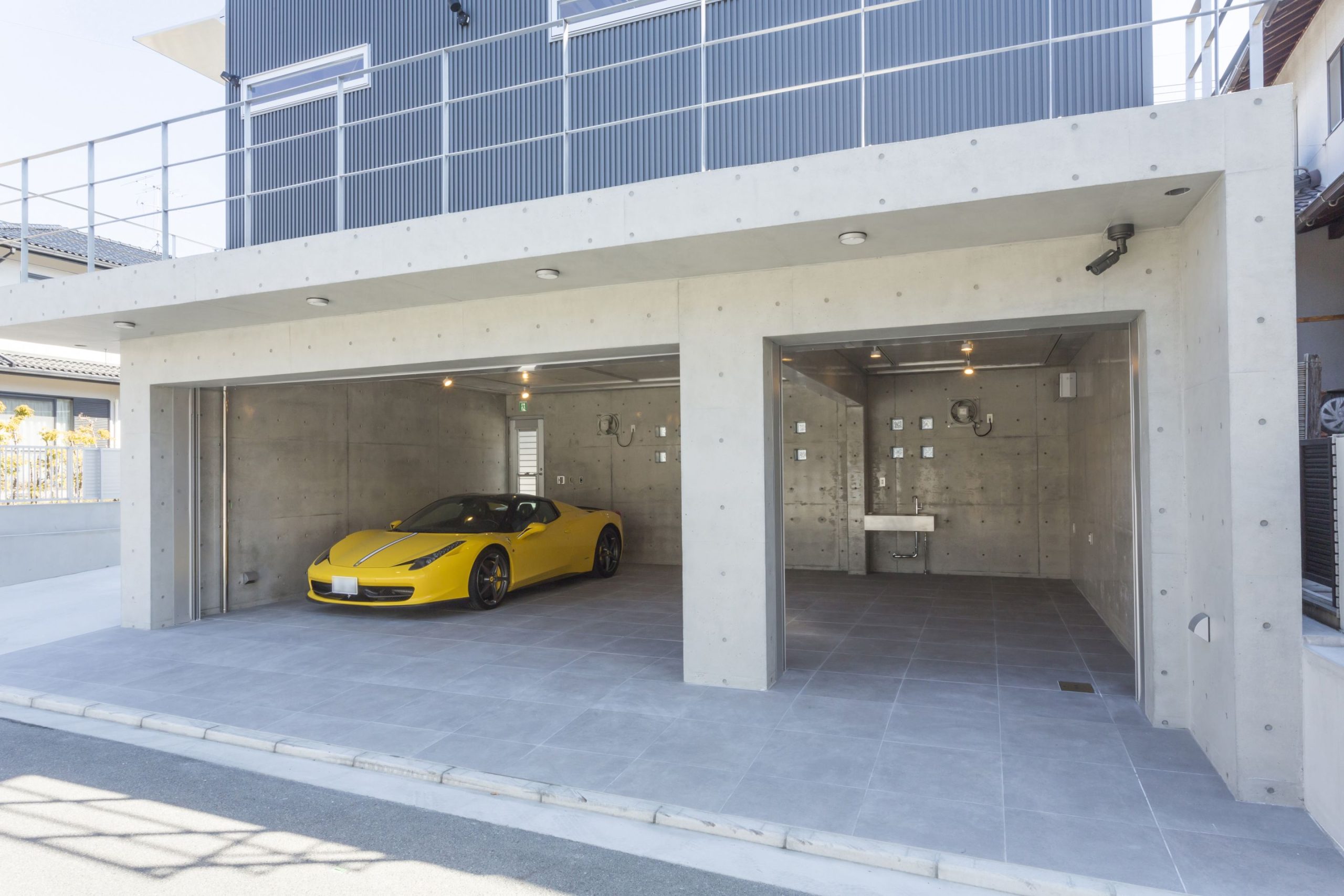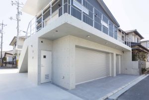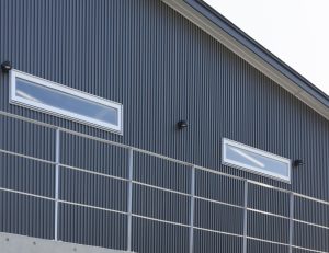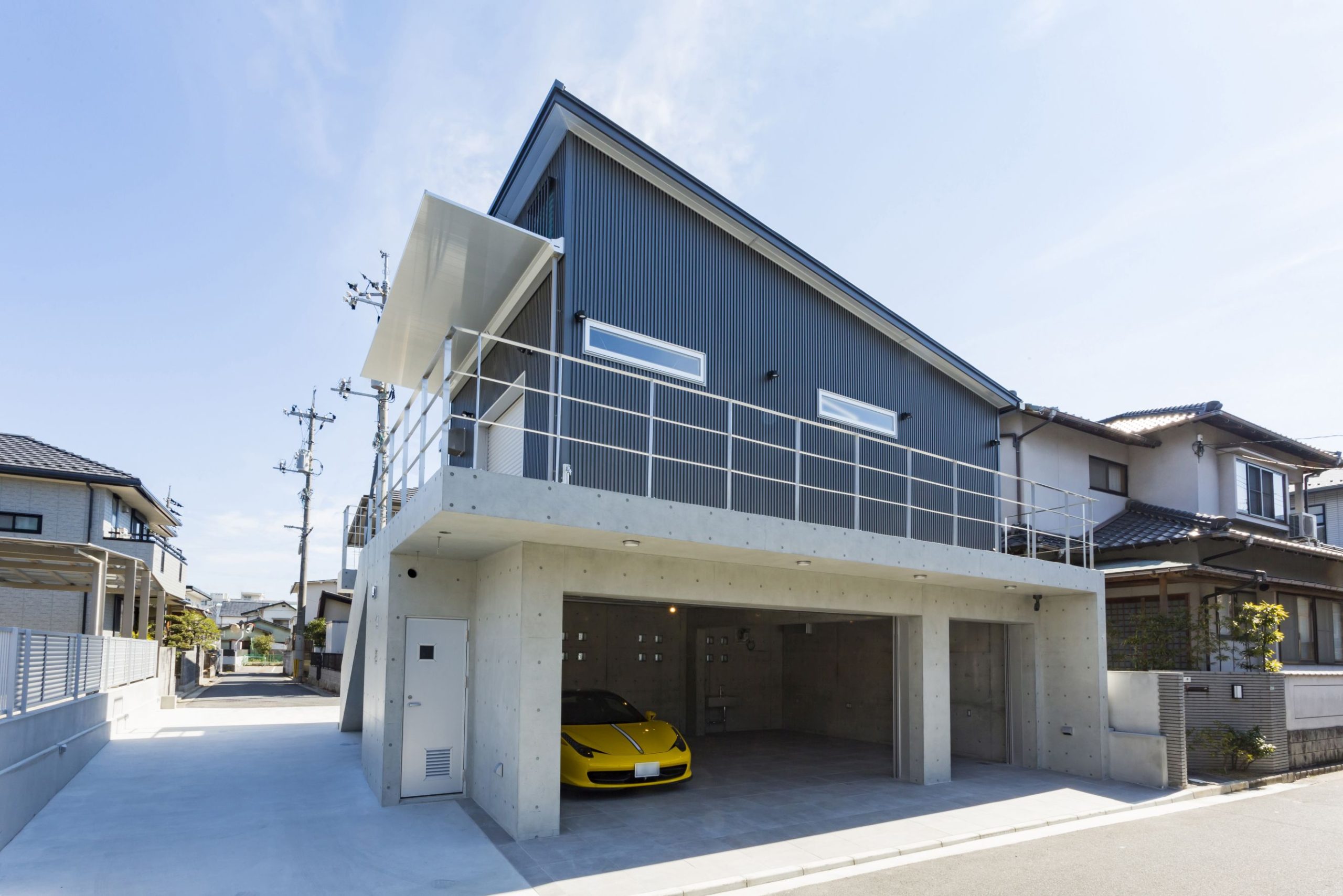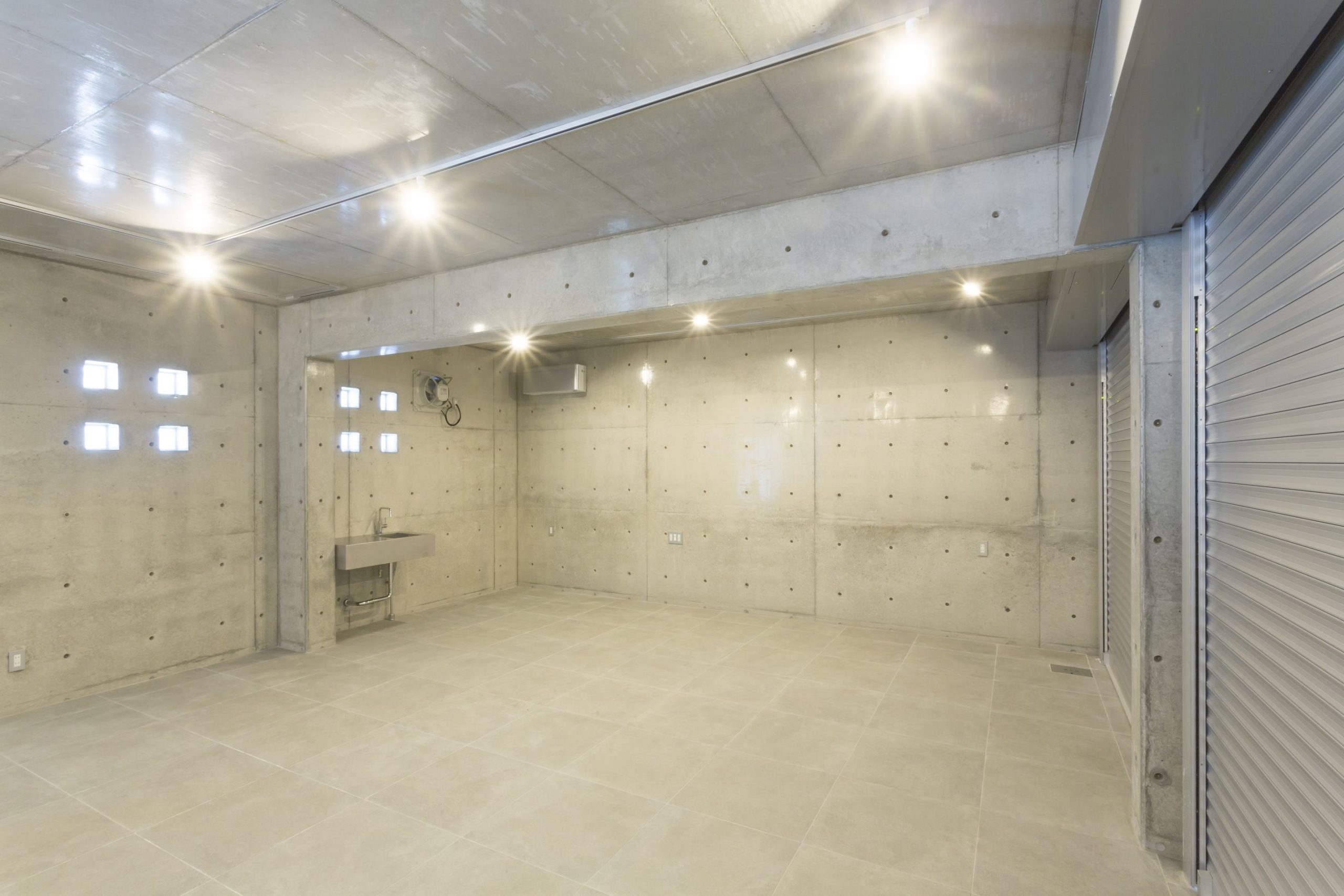1階が車庫、2階が資材倉庫になっている案件です。1階の天井高は2.4mを確保。さらに幅5.5m高さ2.3mの大型電動シャッターを設置し、車庫として利便性を向上。2階には幅2.3m高さ2.2mの軽量手動シャッターを採用。また2階の屋根上に太陽光パネルを設置するため、パネルメーカーと協議し屋根勾配を10°としました。この屋根勾配は外観のアクセントにもなっており、2階の天井高にも3.0m~4.1mという幅を持たせることができ、資材の保管レイアウトに自由度を持たせています。窓には横長のスリット窓を採光として配置し、換気用のルーバー窓も取り付けています。外壁は銀黒色の角波鋼板で、深彫タイプのものを使用し、引き締まったイメージになっています。倉庫には建設資材などを保管する予定で、そのため外部にチェーンブロックをつけて荷揚げしたいとの要望があり、補強用の柱と梁を外部に設置し、外部通路は雨に濡れないようアルミ庇を採用しすっきりと仕上げました。