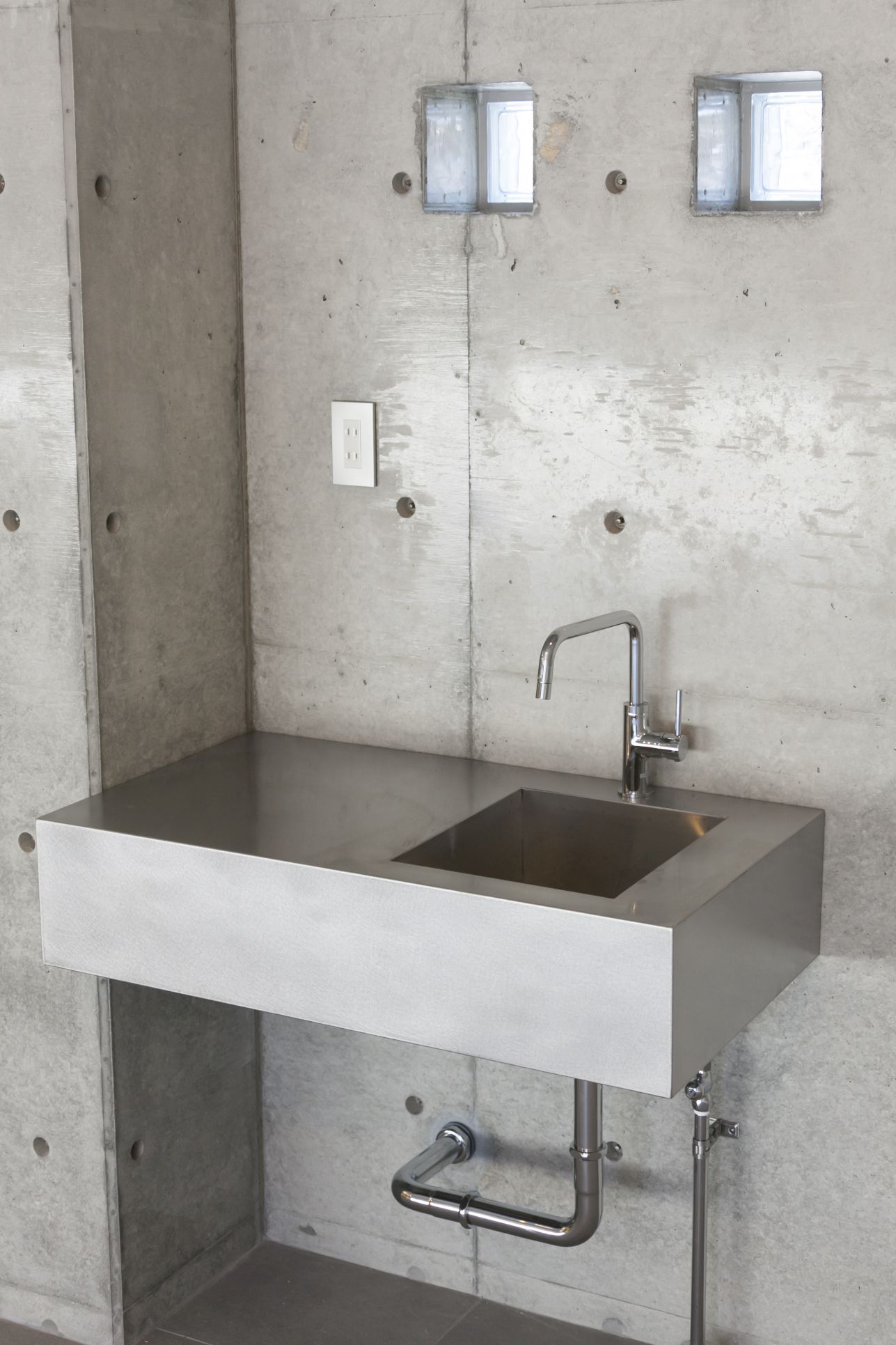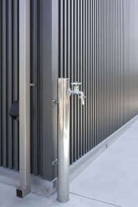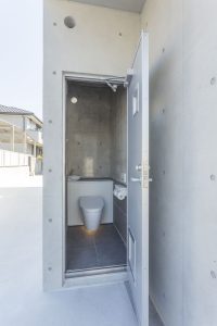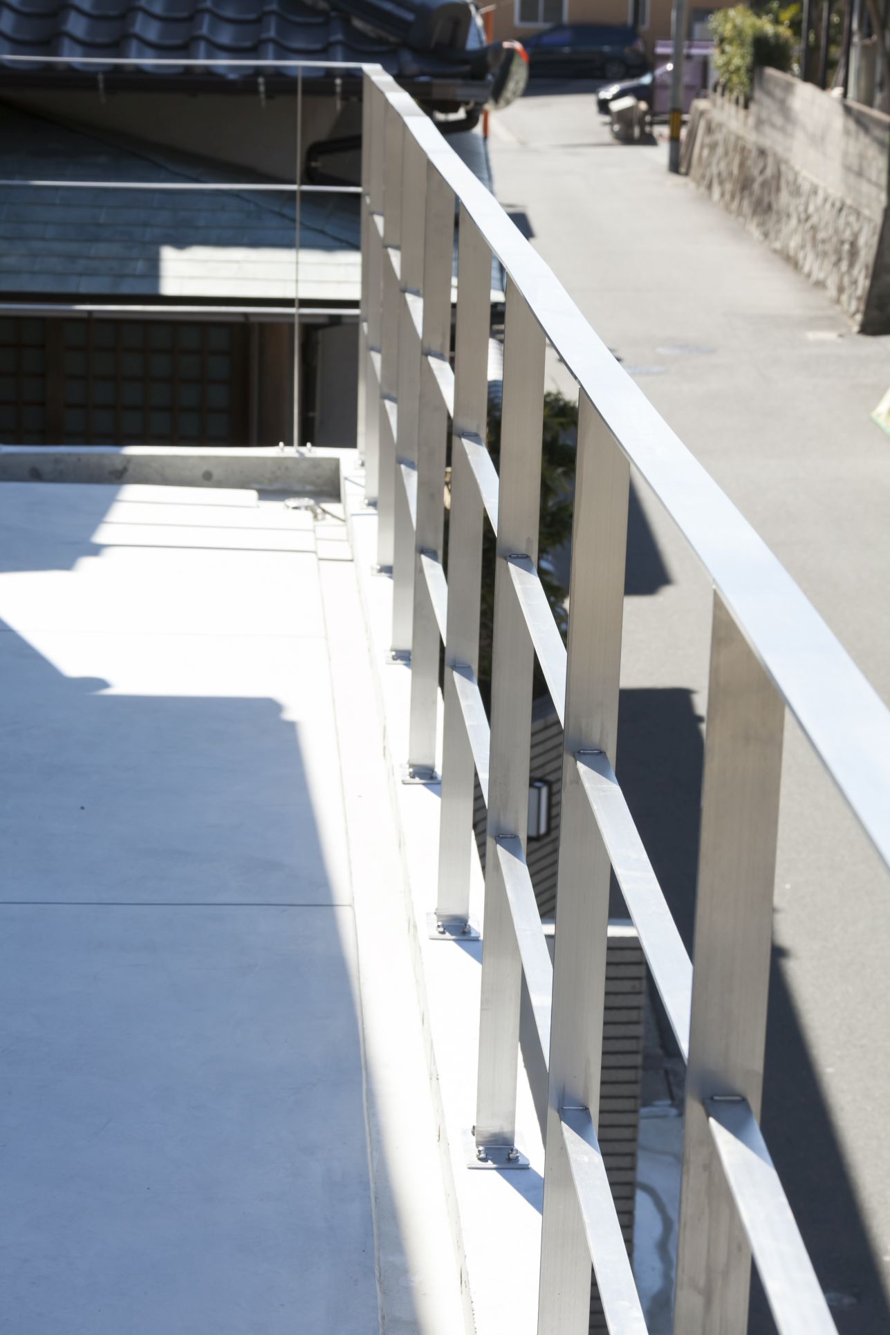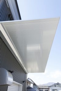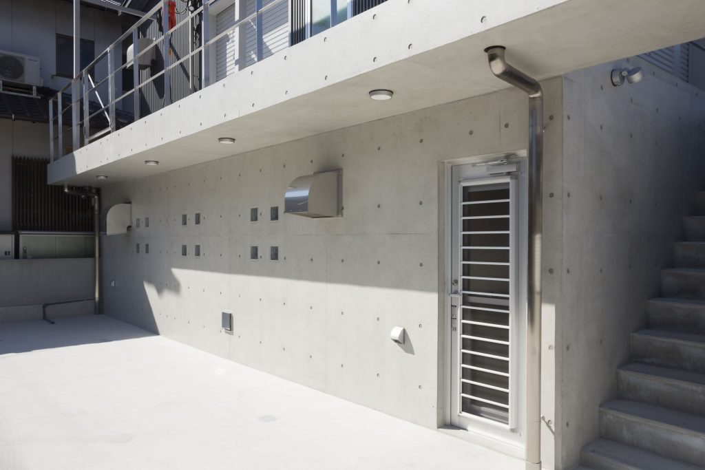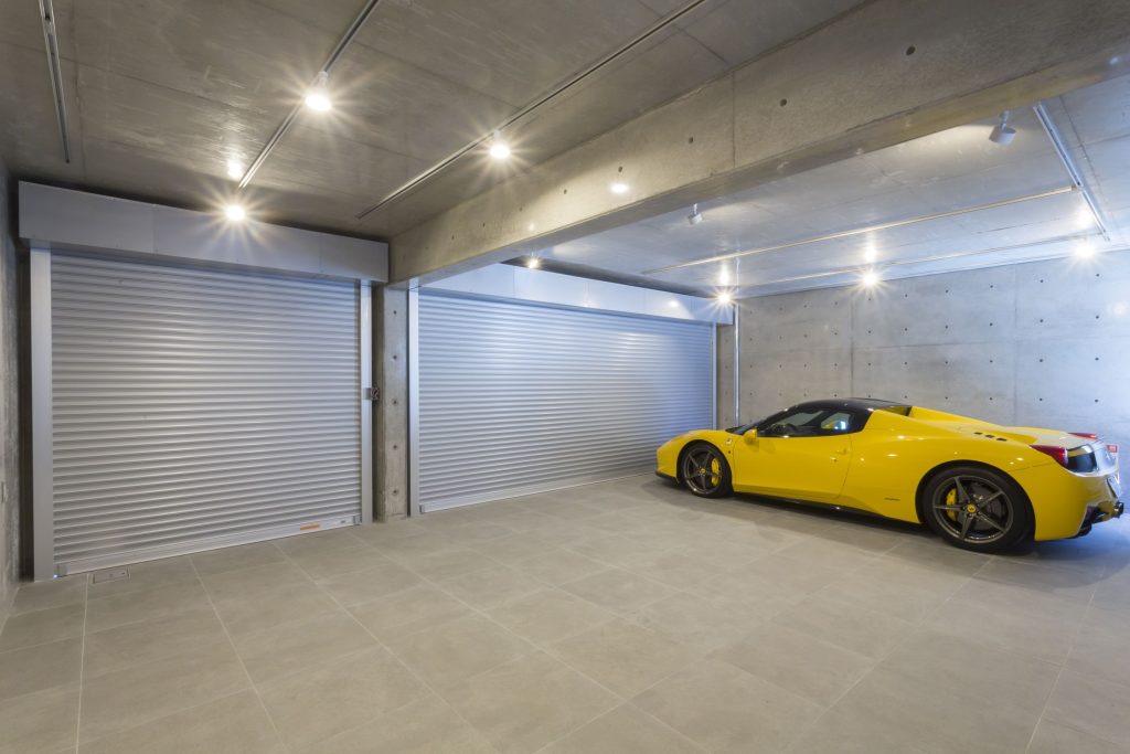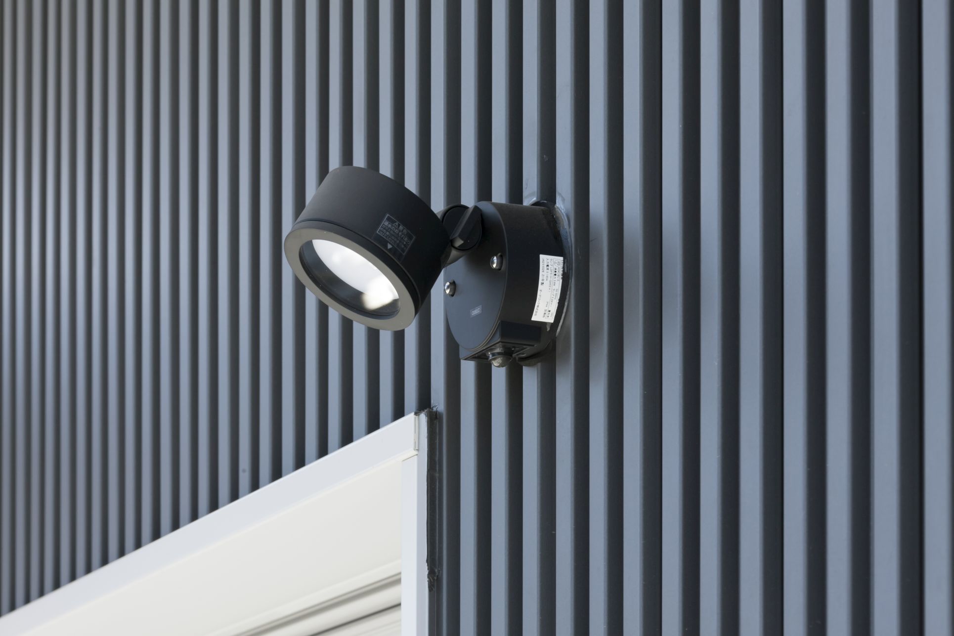 1階が車庫、2階が資材倉庫になっている案件です。1階の天井高は2.4mを確保。さらに幅5.5m高さ2.3mの大型電動シャッターを設置し、車庫として利便性を向上。2階には幅2.3m高さ2.2mの軽量手動シャッターを採用。また2階の屋根上に太陽光パネルを設置するため、パネルメーカーと協議し屋根勾配を10°としました。この屋根勾配は外観のアクセントにもなっており、2階の天井高にも3.0m~4.1mという幅を持たせることができ、資材の保管レイアウトに自由度を持たせています。窓には横長のスリット窓を採光として配置し、換気用のルーバー窓も取り付けています。外壁は銀黒色の角波鋼板で、深彫タイプのものを使用し、引き締まったイメージになっています。倉庫には建設資材などを保管する予定で、そのため外部にチェーンブロックをつけて荷揚げしたいとの要望があり、補強用の柱と梁を外部に設置し、外部通路は雨に濡れないようアルミ庇を採用しすっきりと仕上げました。