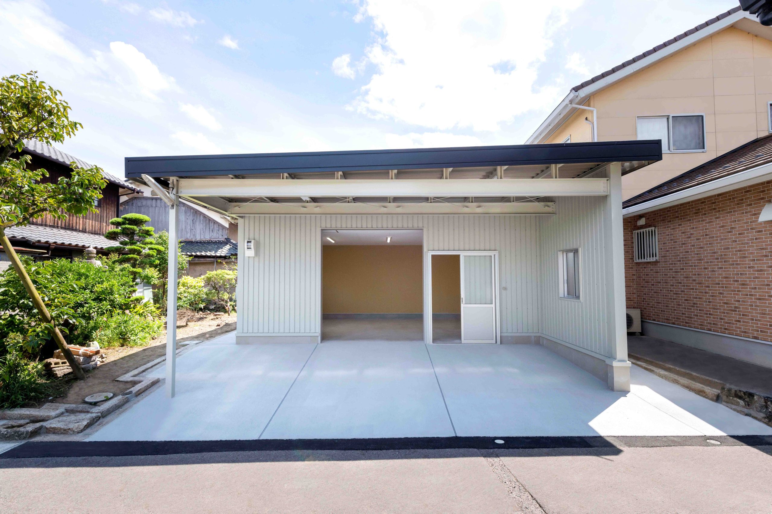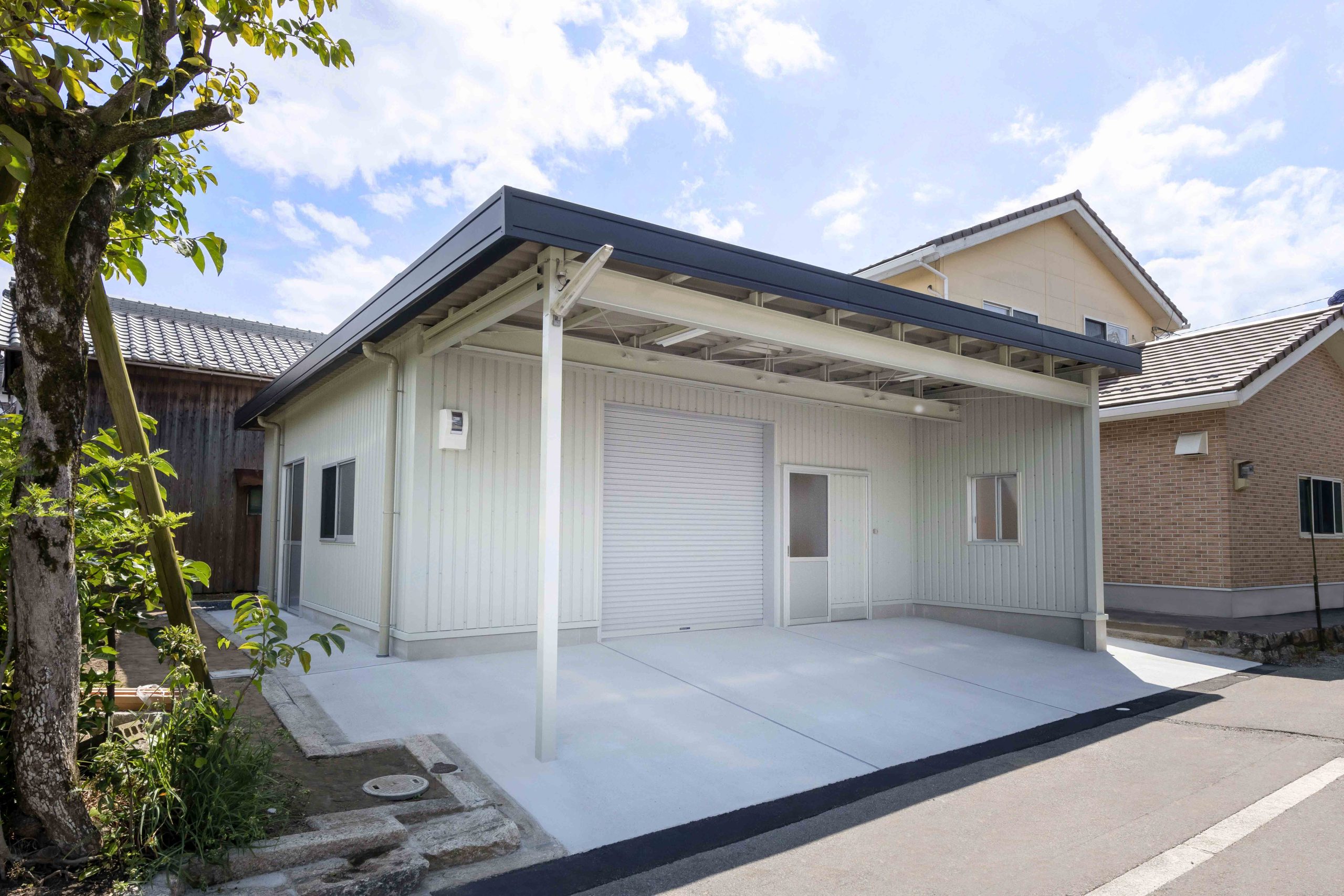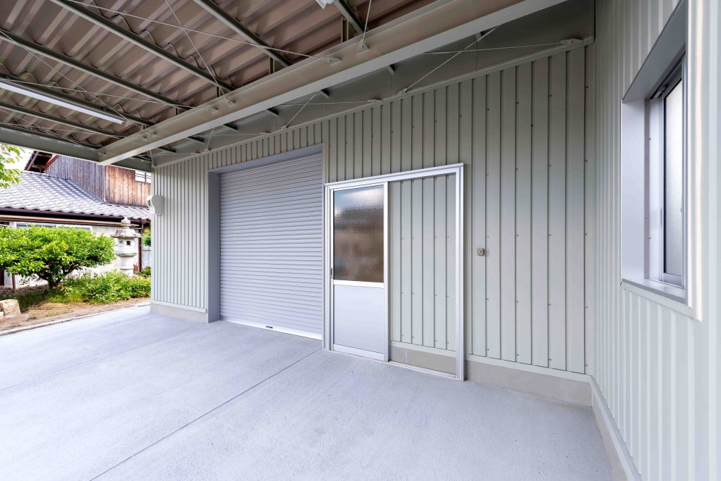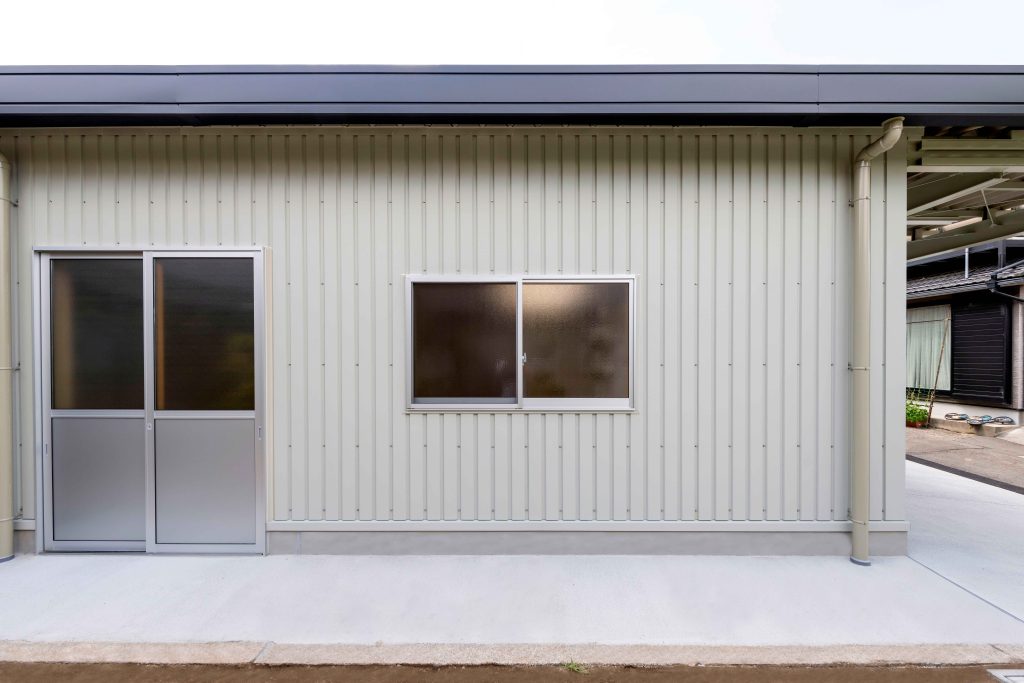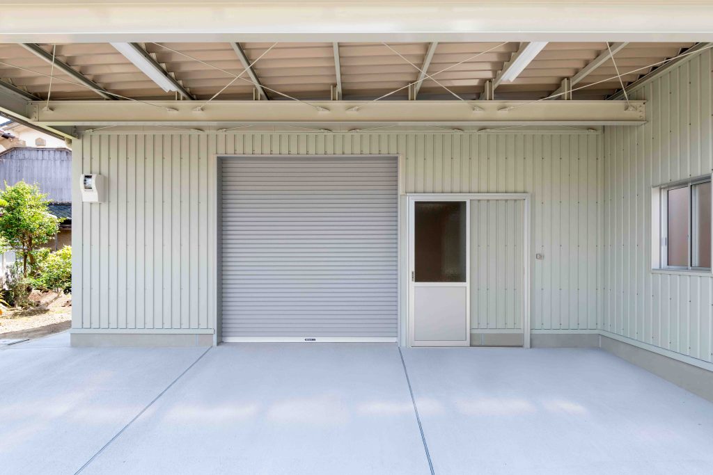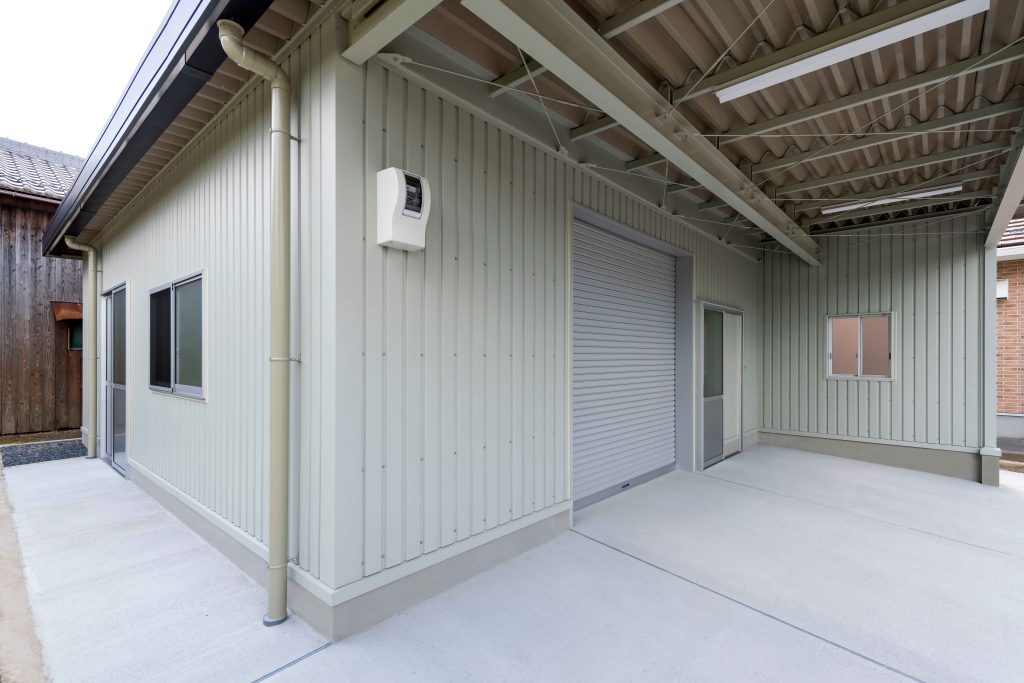 TDシリーズの農機具倉庫となります。お客様より比較的コストを抑え、意匠性も確保した倉庫にしたいとのご希望がありましたので、TDシリーズにて提案致しました。60㎡程の延床面積のうち、33㎡程を土間仕様、残りはフローリング仕様とし、用途別に倉庫スペースをわけています。外壁にはホワイトの金属製の角波サイディングを採用する事で、低コストでスタイリッシュな印象に仕上げました。また屋根もシルバーとする事で、夏場の壁・屋根からの太陽による熱にも配慮しています。出入口には幅2.5m・高さ2.6mの電動大型シャッターを採用。シャッター及び引戸の枠には、耐久性を考えアルミ製にしております。シャッターの外は、屋根を2.7mほど持ち出し、雨の日の作業にも対応できる20㎡程度のスペースを確保しました。