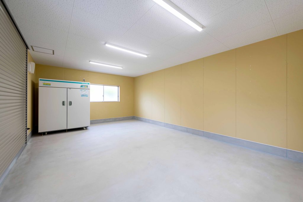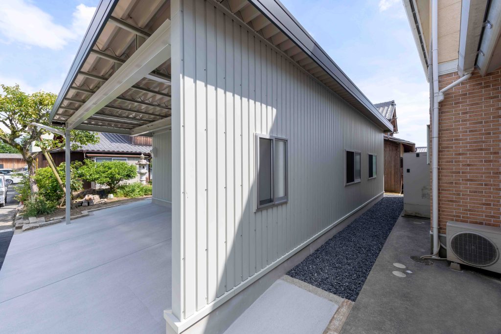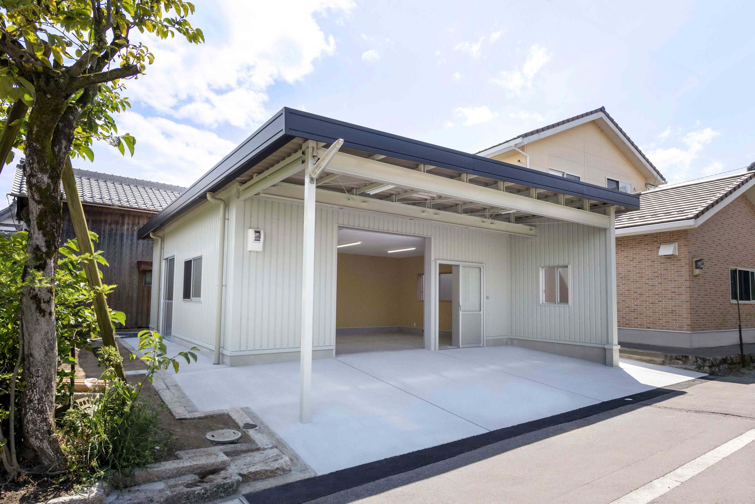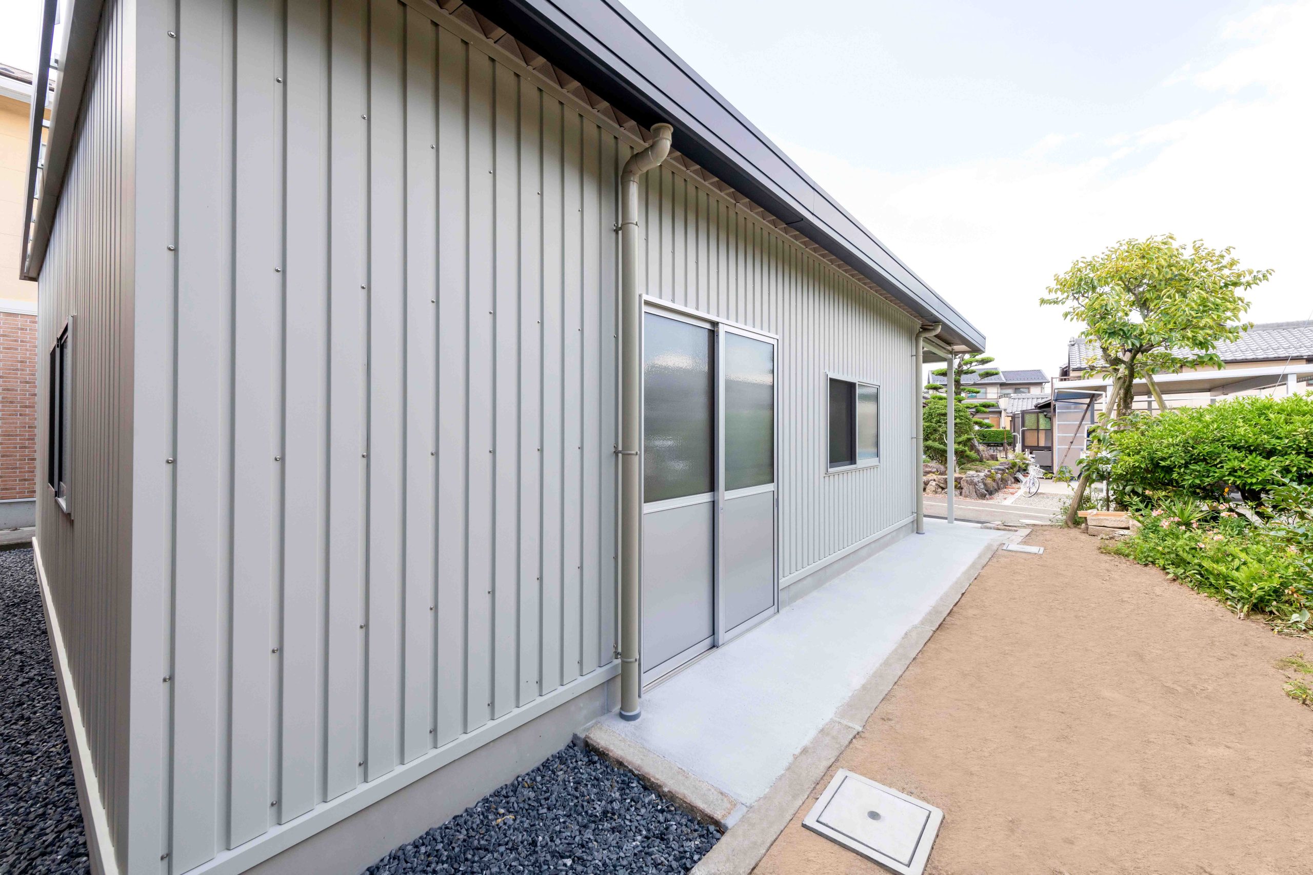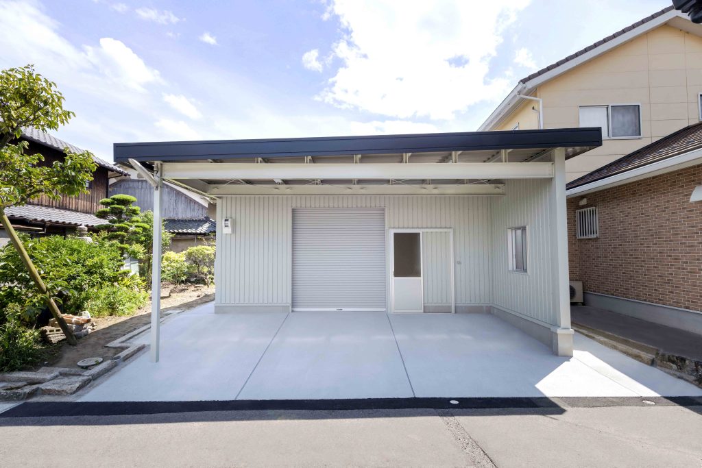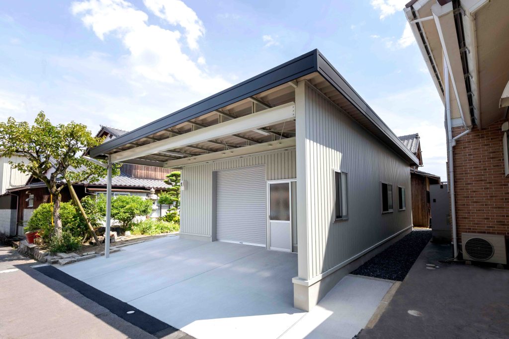 TDシリーズの農機具倉庫となります。お客様より比較的コストを抑え、意匠性も確保した倉庫にしたいとのご希望がありましたので、TDシリーズにて提案致しました。60㎡程の延床面積のうち、33㎡程を土間仕様、残りはフローリング仕様とし、用途別に倉庫スペースをわけています。外壁にはホワイトの金属製の角波サイディングを採用する事で、低コストでスタイリッシュな印象に仕上げました。また屋根もシルバーとする事で、夏場の壁・屋根からの太陽による熱にも配慮しています。出入口には幅2.5m・高さ2.6mの電動大型シャッターを採用。シャッター及び引戸の枠には、耐久性を考えアルミ製にしております。シャッターの外は、屋根を2.7mほど持ち出し、雨の日の作業にも対応できる20㎡程度のスペースを確保しました。