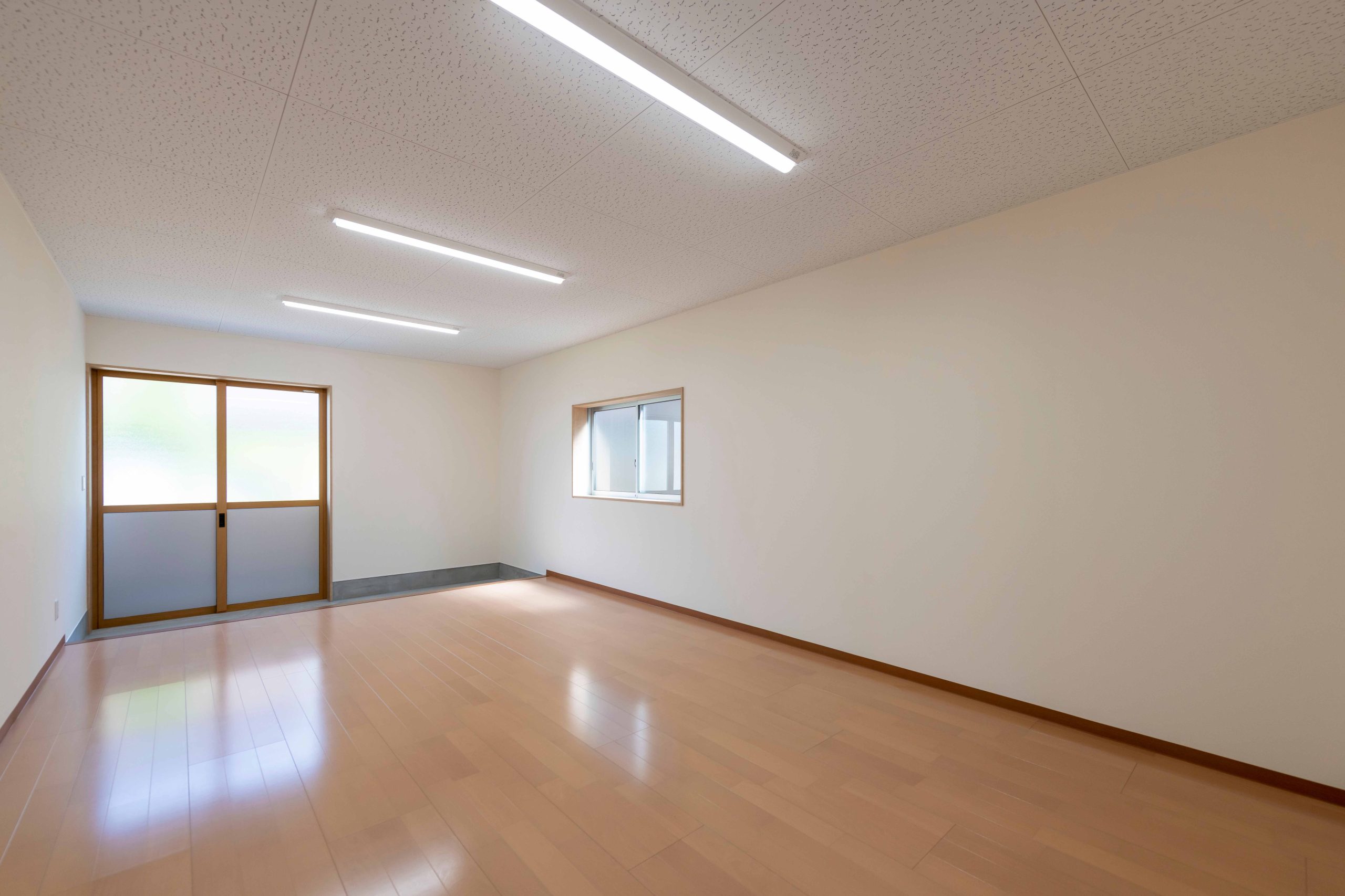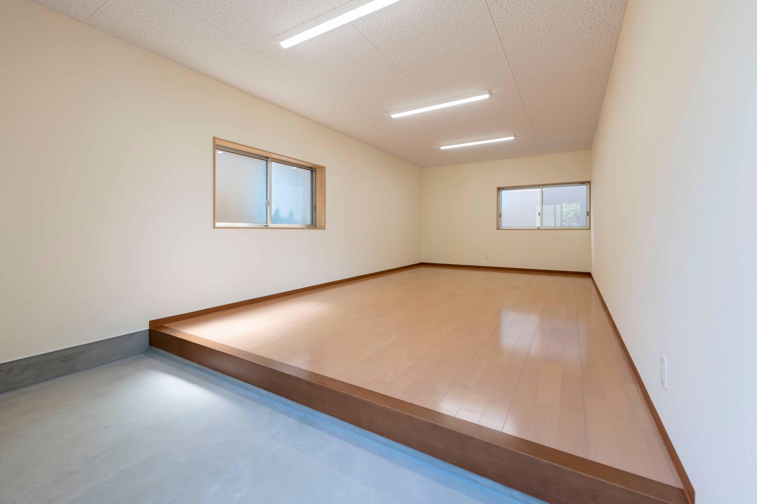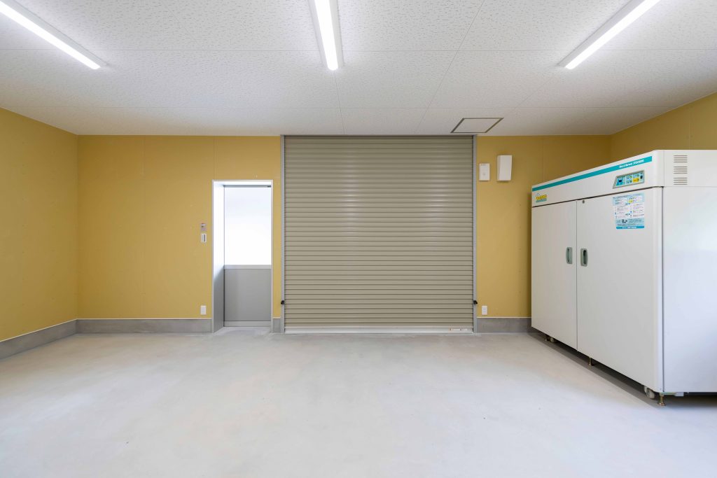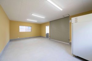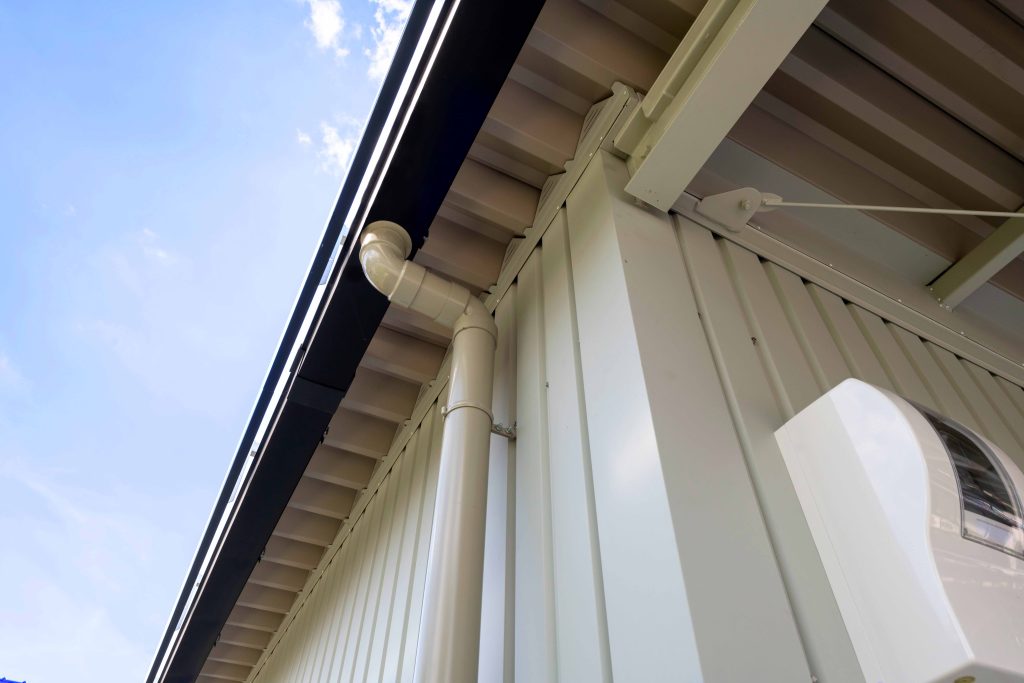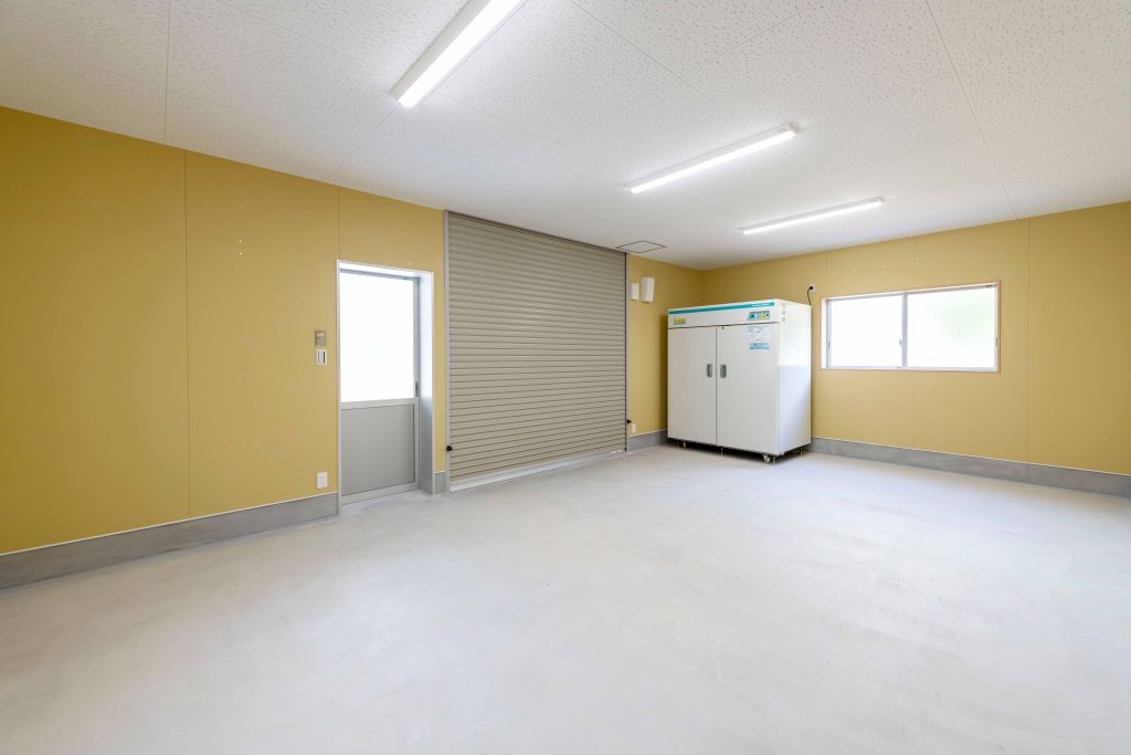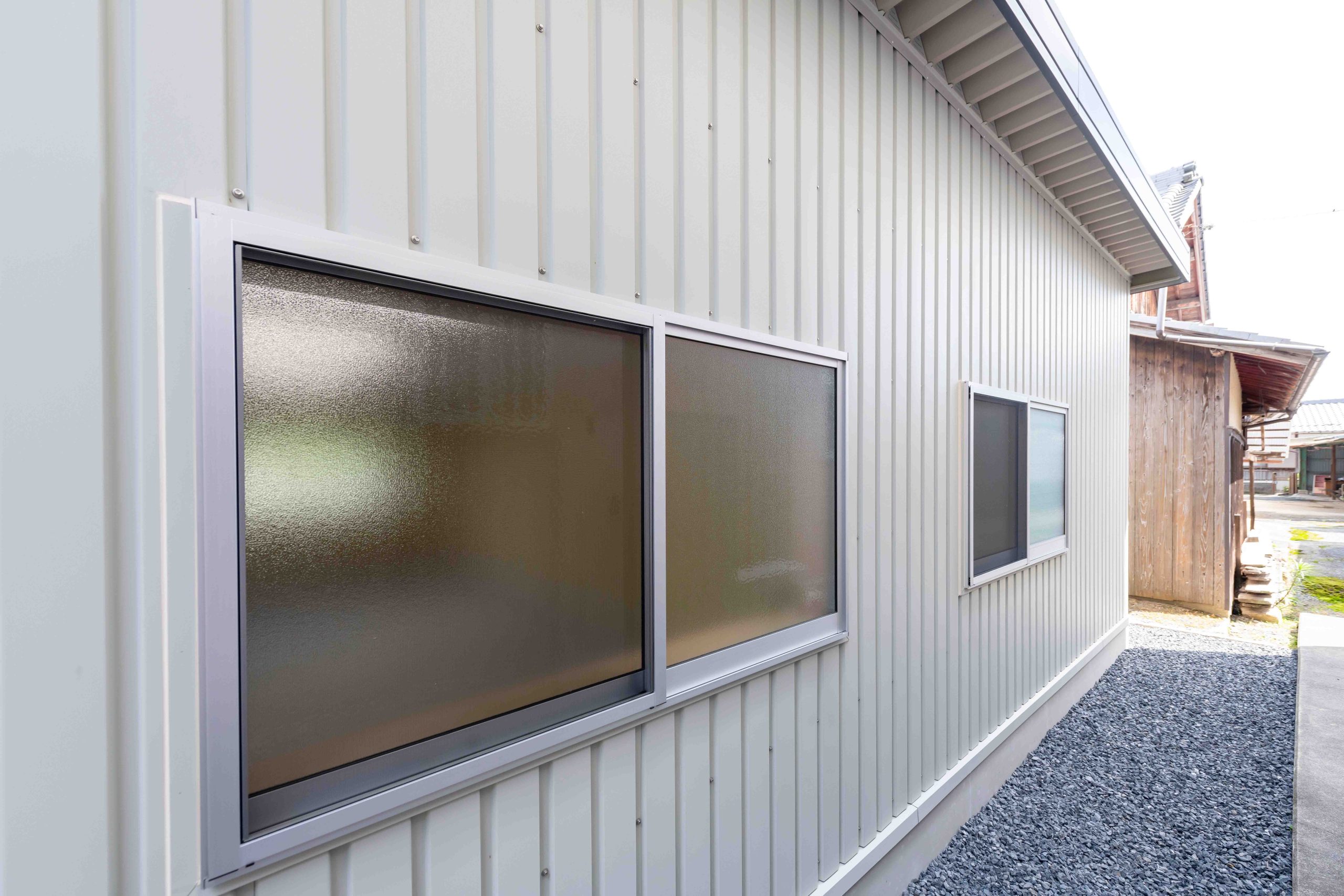 TDシリーズの農機具倉庫となります。お客様より比較的コストを抑え、意匠性も確保した倉庫にしたいとのご希望がありましたので、TDシリーズにて提案致しました。60㎡程の延床面積のうち、33㎡程を土間仕様、残りはフローリング仕様とし、用途別に倉庫スペースをわけています。外壁にはホワイトの金属製の角波サイディングを採用する事で、低コストでスタイリッシュな印象に仕上げました。また屋根もシルバーとする事で、夏場の壁・屋根からの太陽による熱にも配慮しています。出入口には幅2.5m・高さ2.6mの電動大型シャッターを採用。シャッター及び引戸の枠には、耐久性を考えアルミ製にしております。シャッターの外は、屋根を2.7mほど持ち出し、雨の日の作業にも対応できる20㎡程度のスペースを確保しました。