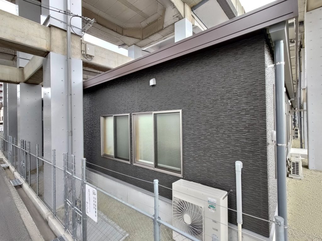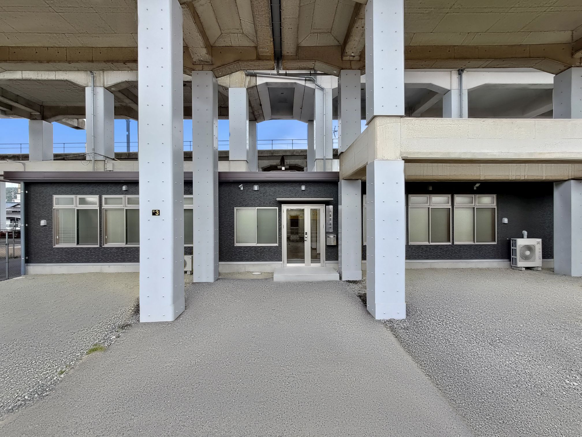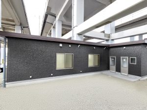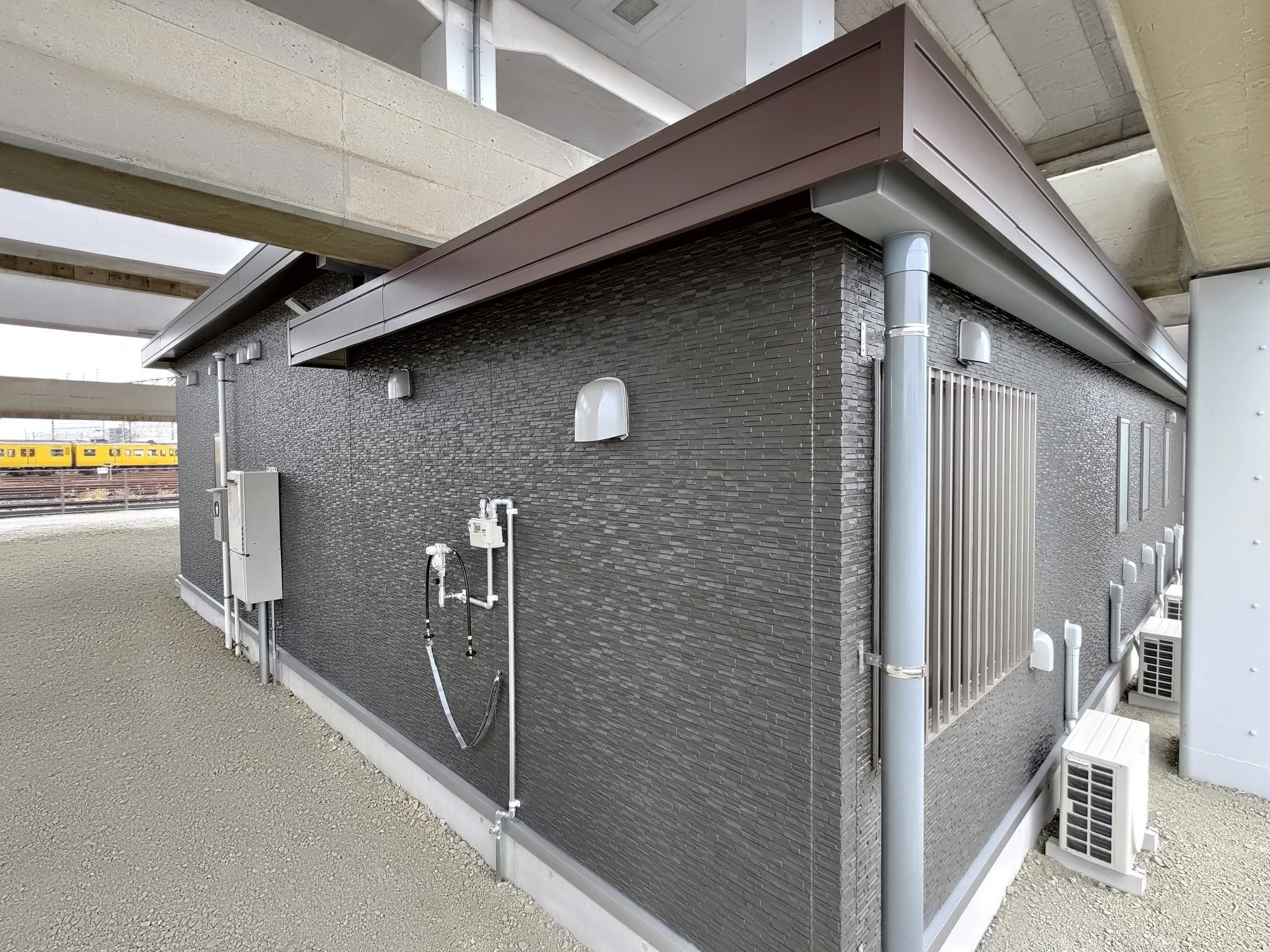 TDシリーズ 「TDシリーズ」 オリエントハウスプレハブシリーズのロングセラーシリーズです。設計の自由度が高くデザイン性の高い建築が可能で、準耐火建築物にも対応しています。シリーズ詳細はこちら>more にて設計した仮眠室併設の事務所になります。高架下の立地ということも有り、柱・梁・内部などの間取りはもちろん、施工の点においても様々な制限がありました。さらには電車の通過による振動や音の懸念といった要素もあり、細部の仕様を工夫しています。例えば、室内の内壁に関しては、壁紙クロスのひび割れ対策としてスリットを入れたり、また防音対策として、窓はすべて複層ガラスを採用。また、高架の干渉を考慮してプラン図を最適化しています。高架に干渉しない部分には会議室や事務所などを配置し、高めの天井高(2.7m)を確保。干渉する部分には、仮眠室や休憩室などを配置しました。また、外部から土足のままアクセスできるトイレも設置し、利便性にも配慮。外観に関しては、外壁には窯業系サイディングを採用し、玄関には大型のアルミ製透明ガラスドアとアルミ庇を採用することで、スタイリッシュに仕上げております。