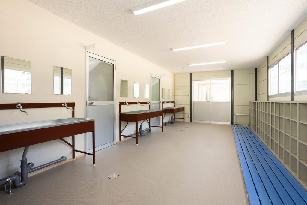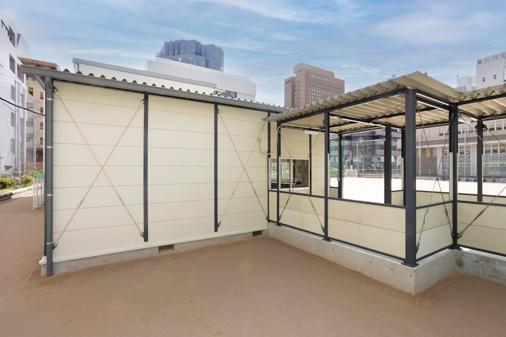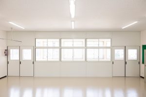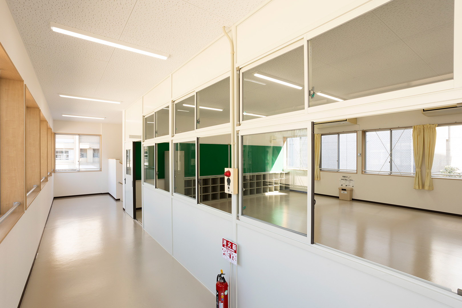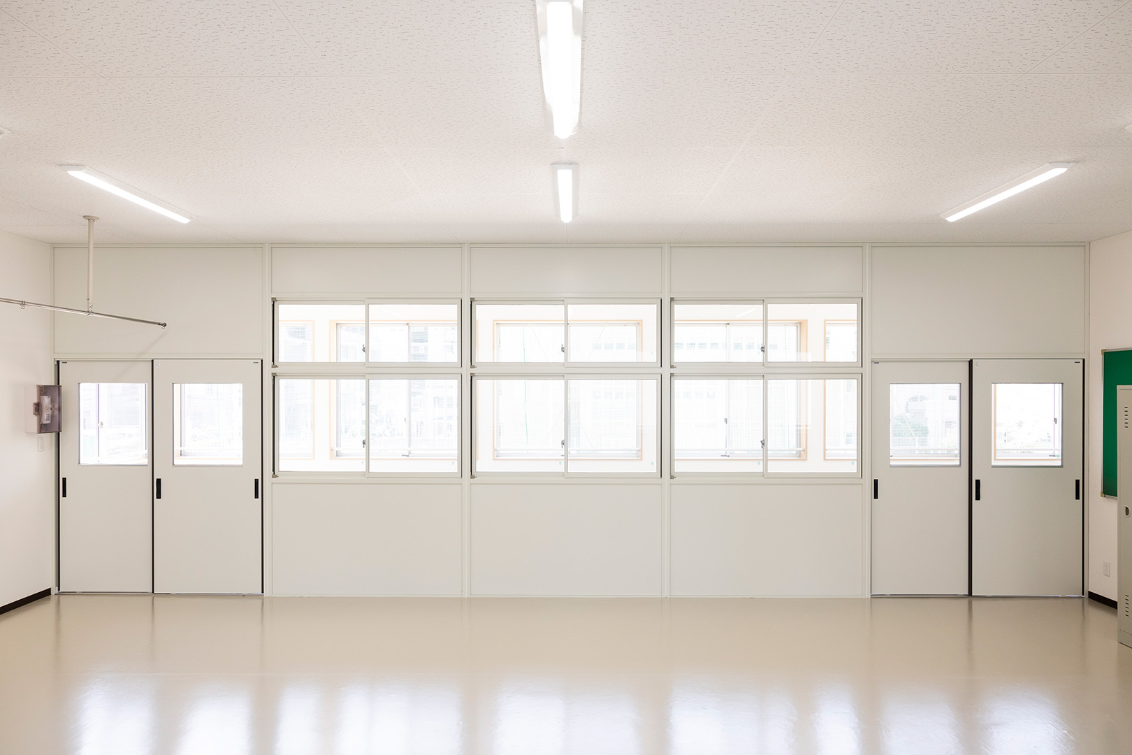 TDシリーズ 「TDシリーズ」 オリエントハウスプレハブシリーズのロングセラーシリーズです。設計の自由度が高くデザイン性の高い建築が可能で、準耐火建築物にも対応しています。シリーズ詳細はこちら>more で施工した小学校の仮設教室です。生徒数増加に伴う教室不足解消のため、普通教室2教室(219㎡)とトイレ(59㎡)を増築。 防火地域 「防火地域」 防火や延焼の防止を目的として指定される地域で、構造、屋根、外壁などの材料が厳しく制限される。それ以外では建築基準法22条指定区域という地域もある。more 内での施工であるため、耐火性能に優れた TDシリーズ 「TDシリーズ」 オリエントハウスプレハブシリーズのロングセラーシリーズです。設計の自由度が高くデザイン性の高い建築が可能で、準耐火建築物にも対応しています。シリーズ詳細はこちら>more を採用し、柱や梁には25mmのロックウール(断熱材)を被覆することで1時間の耐火性能を確保。外壁には強化石膏ボードと窯業系サイディングの金具工法を採用し、2階の床についてもデッキプレートの上にコンクリートスラブを打設することで、耐火性と耐久性を兼ね備えた仕様としました。内装に関しては、教室と廊下の間仕切りにスクールパーテーションを採用。天井の高さは3.0mを確保し、開放的な空間と快適な学習環境を提供しています。