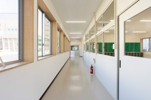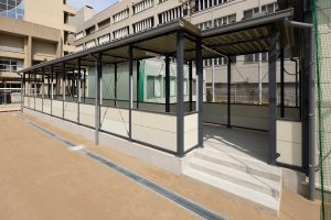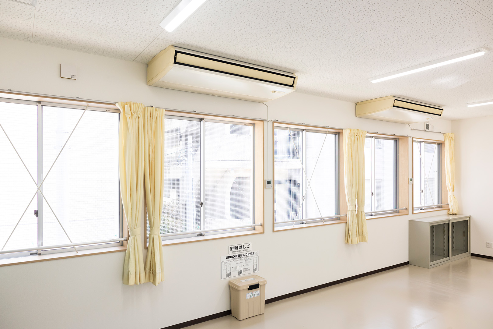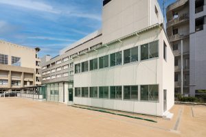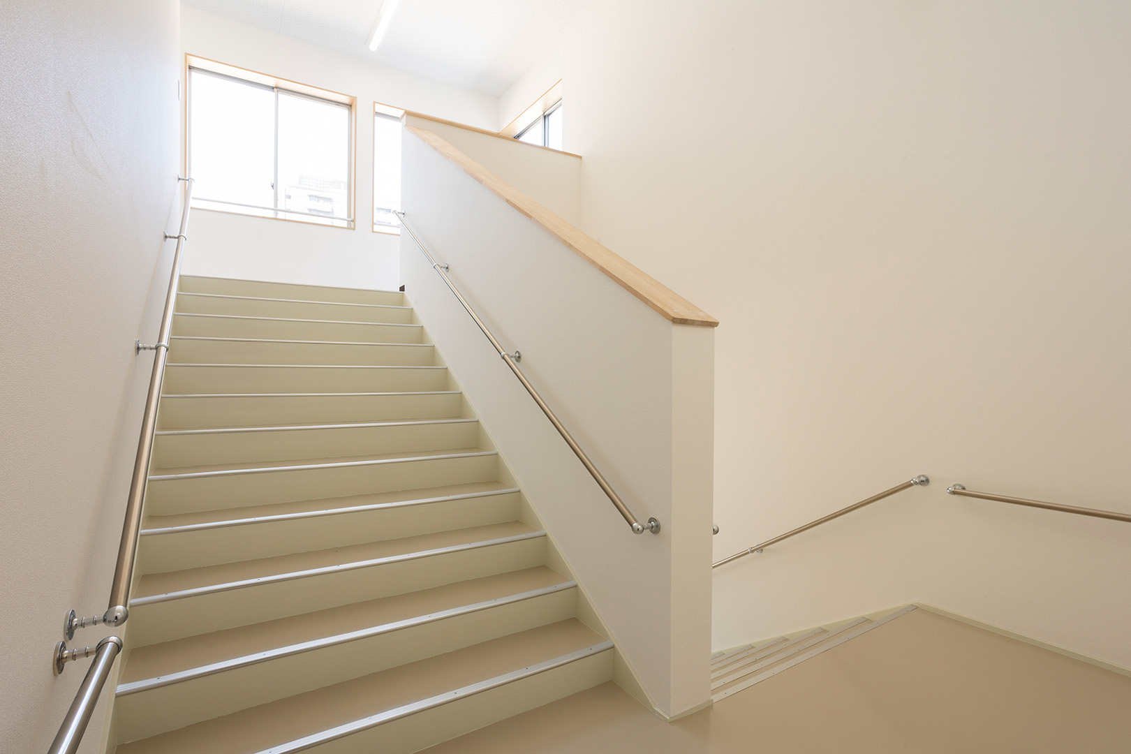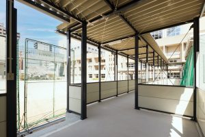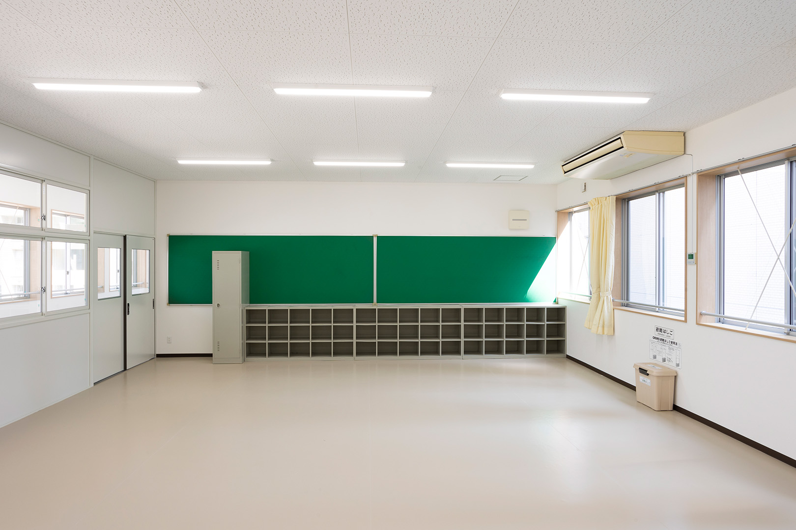 TDシリーズ 「TDシリーズ」 オリエントハウスプレハブシリーズのロングセラーシリーズです。設計の自由度が高くデザイン性の高い建築が可能で、準耐火建築物にも対応しています。シリーズ詳細はこちら>more で施工した小学校の仮設教室です。生徒数増加に伴う教室不足解消のため、普通教室2教室(219㎡)とトイレ(59㎡)を増築。 防火地域 「防火地域」 防火や延焼の防止を目的として指定される地域で、構造、屋根、外壁などの材料が厳しく制限される。それ以外では建築基準法22条指定区域という地域もある。more 内での施工であるため、耐火性能に優れた TDシリーズ 「TDシリーズ」 オリエントハウスプレハブシリーズのロングセラーシリーズです。設計の自由度が高くデザイン性の高い建築が可能で、準耐火建築物にも対応しています。シリーズ詳細はこちら>more を採用し、柱や梁には25mmのロックウール(断熱材)を被覆することで1時間の耐火性能を確保。外壁には強化石膏ボードと窯業系サイディングの金具工法を採用し、2階の床についてもデッキプレートの上にコンクリートスラブを打設することで、耐火性と耐久性を兼ね備えた仕様としました。内装に関しては、教室と廊下の間仕切りにスクールパーテーションを採用。天井の高さは3.0mを確保し、開放的な空間と快適な学習環境を提供しています。