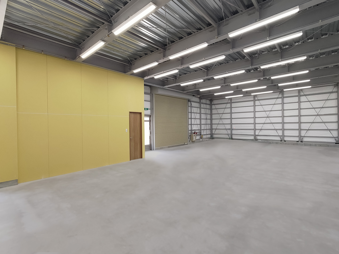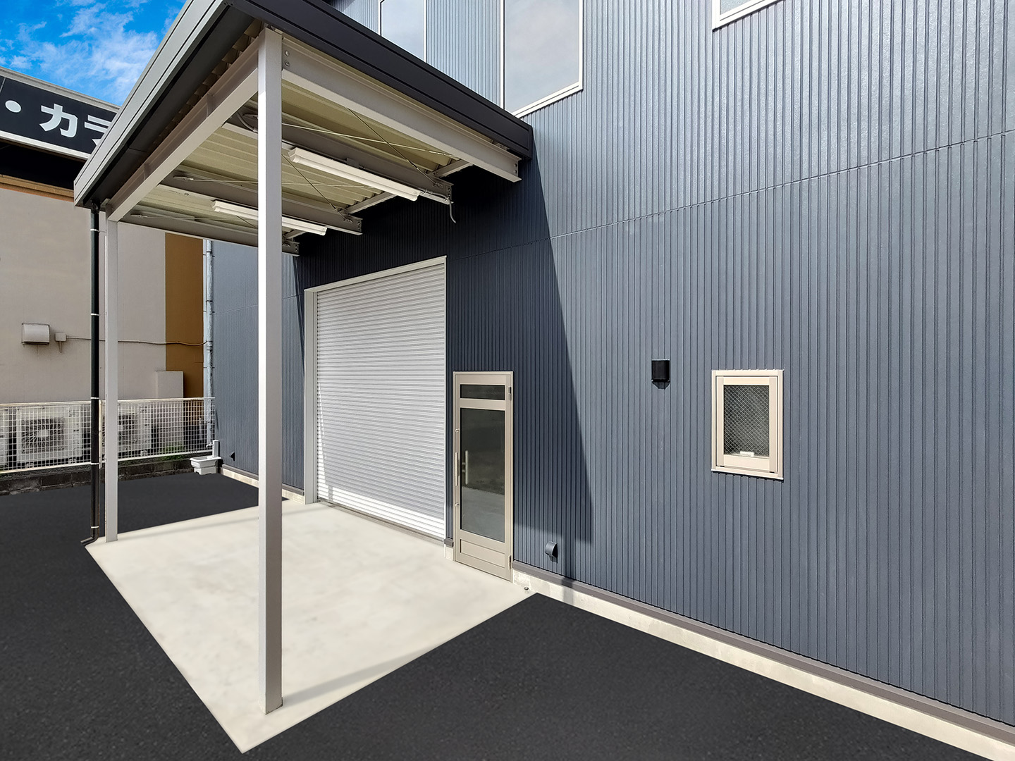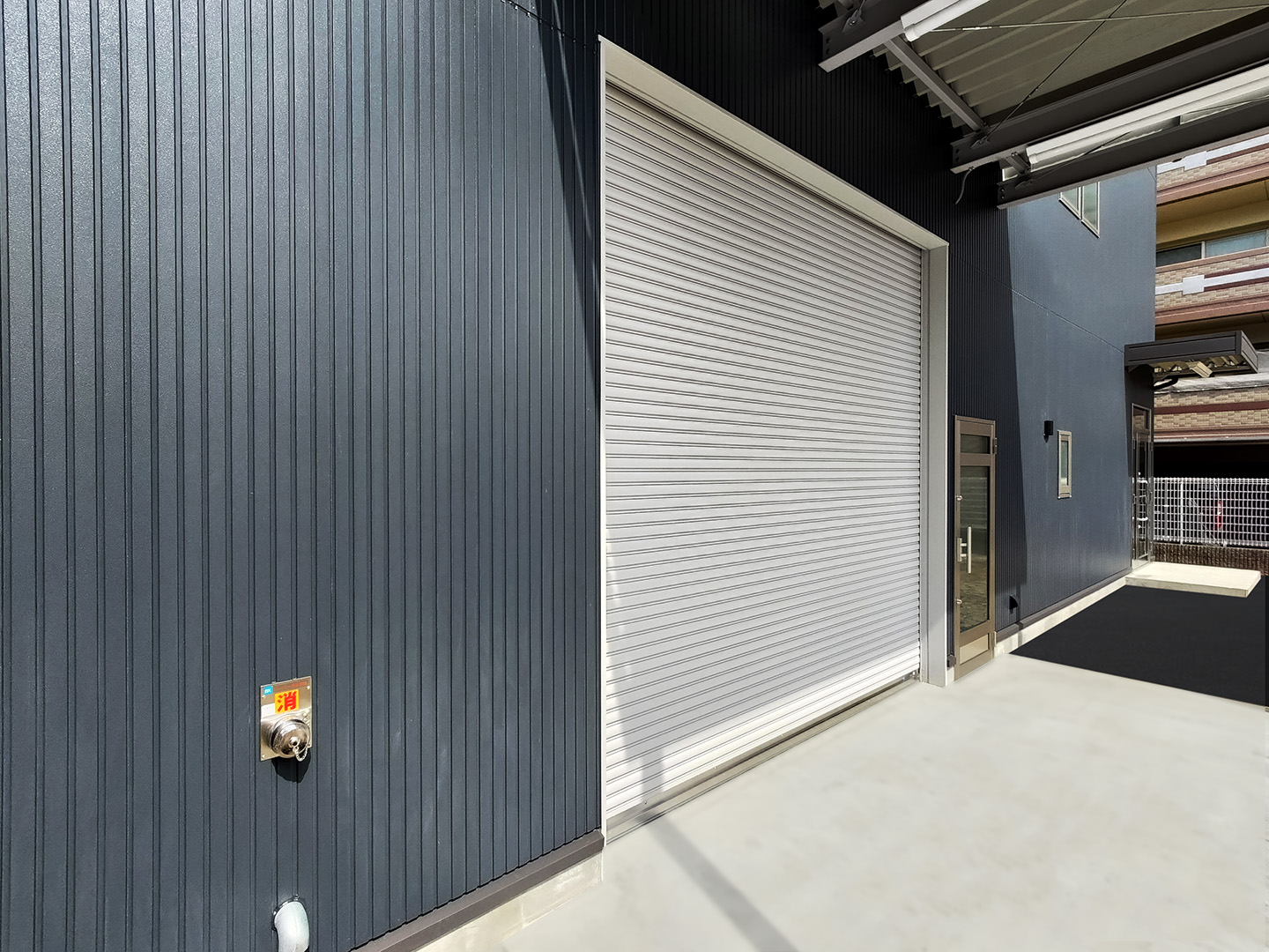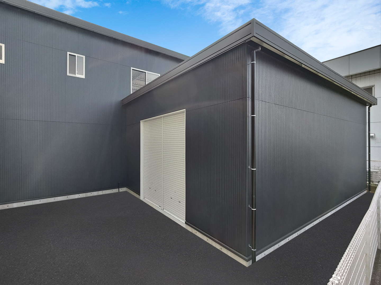 TDシリーズ 「TDシリーズ」 オリエントハウスプレハブシリーズのロングセラーシリーズです。設計の自由度が高くデザイン性の高い建築が可能で、準耐火建築物にも対応しています。シリーズ詳細はこちら>more による倉庫となります。幅のあるワイドな2階建ての区画と、天井高を持たせた1階建ての区画を組み合わせることにより、敷地の形状に合わせて無駄な部分が出ないよう計画。そのため、建屋前面に13㎡の敷地を確保でき、大型トラックでも建物内に入れるようになっています。室内は、内装無しの表しにした事で、2区画間のブレース部の壁がなくなり、作業時の見通しを向上。また照明も通常の2倍ほど設置した事で、夜間でも快適な作業空間を実現。隣地建物との差別化と重厚感を持つ建物にされたいとのお客様のお声から、外壁にはネイビーを採用し、重厚感のある印象になっています。建物正面には開口3.3m x 高さ3.3mの電動軽量シャッターを設置。上部には幅4.5m x 奥行き2.4mの庇を設けることにより、雨の日の作業を容易にし、外観のアクセントにもなっています。