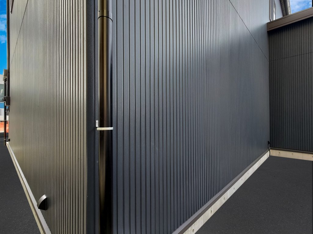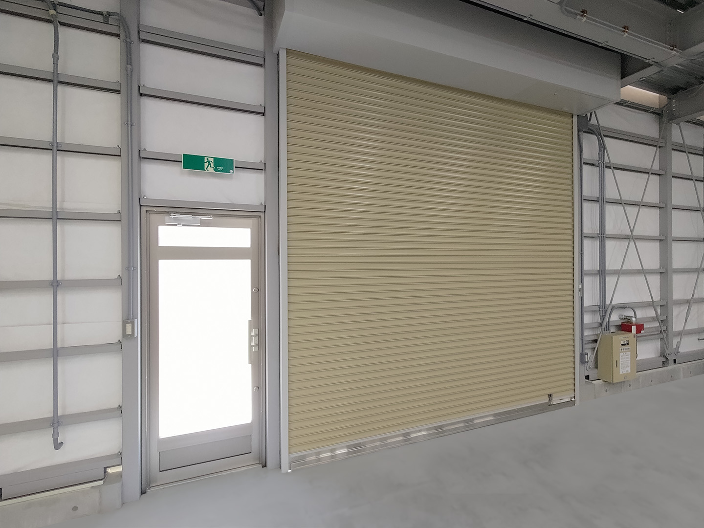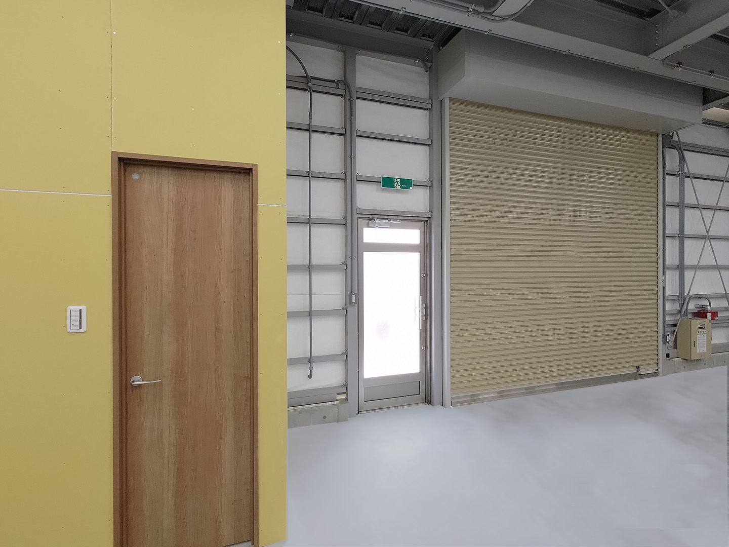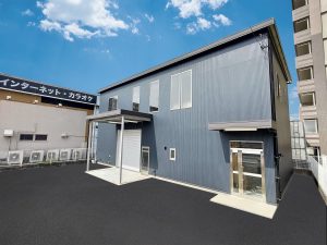 TDシリーズ 「TDシリーズ」 オリエントハウスプレハブシリーズのロングセラーシリーズです。設計の自由度が高くデザイン性の高い建築が可能で、準耐火建築物にも対応しています。シリーズ詳細はこちら>more による倉庫となります。幅のあるワイドな2階建ての区画と、天井高を持たせた1階建ての区画を組み合わせることにより、敷地の形状に合わせて無駄な部分が出ないよう計画。そのため、建屋前面に13㎡の敷地を確保でき、大型トラックでも建物内に入れるようになっています。室内は、内装無しの表しにした事で、2区画間のブレース部の壁がなくなり、作業時の見通しを向上。また照明も通常の2倍ほど設置した事で、夜間でも快適な作業空間を実現。隣地建物との差別化と重厚感を持つ建物にされたいとのお客様のお声から、外壁にはネイビーを採用し、重厚感のある印象になっています。建物正面には開口3.3m x 高さ3.3mの電動軽量シャッターを設置。上部には幅4.5m x 奥行き2.4mの庇を設けることにより、雨の日の作業を容易にし、外観のアクセントにもなっています。