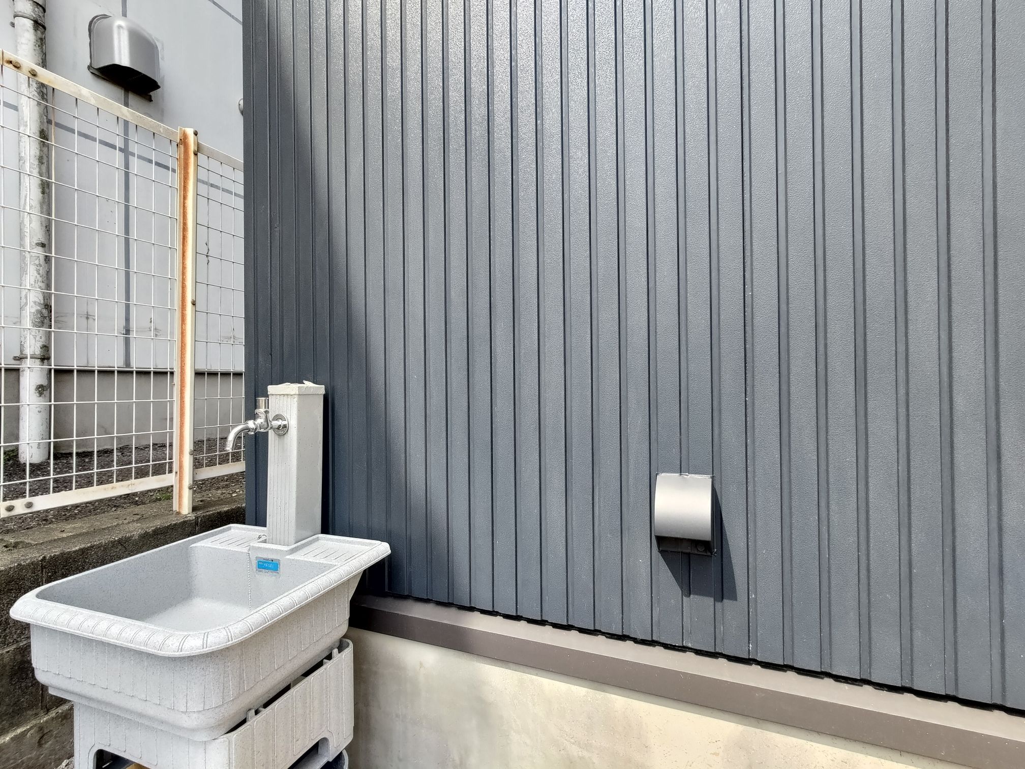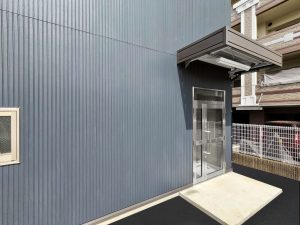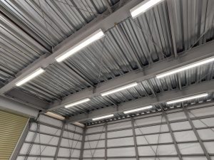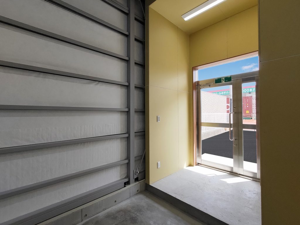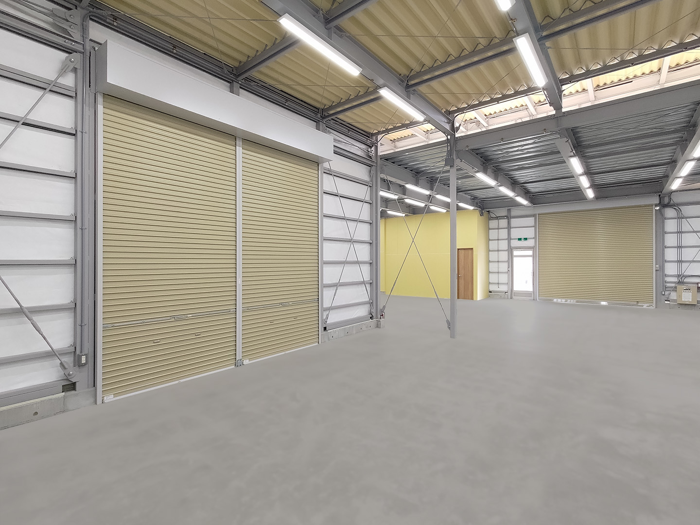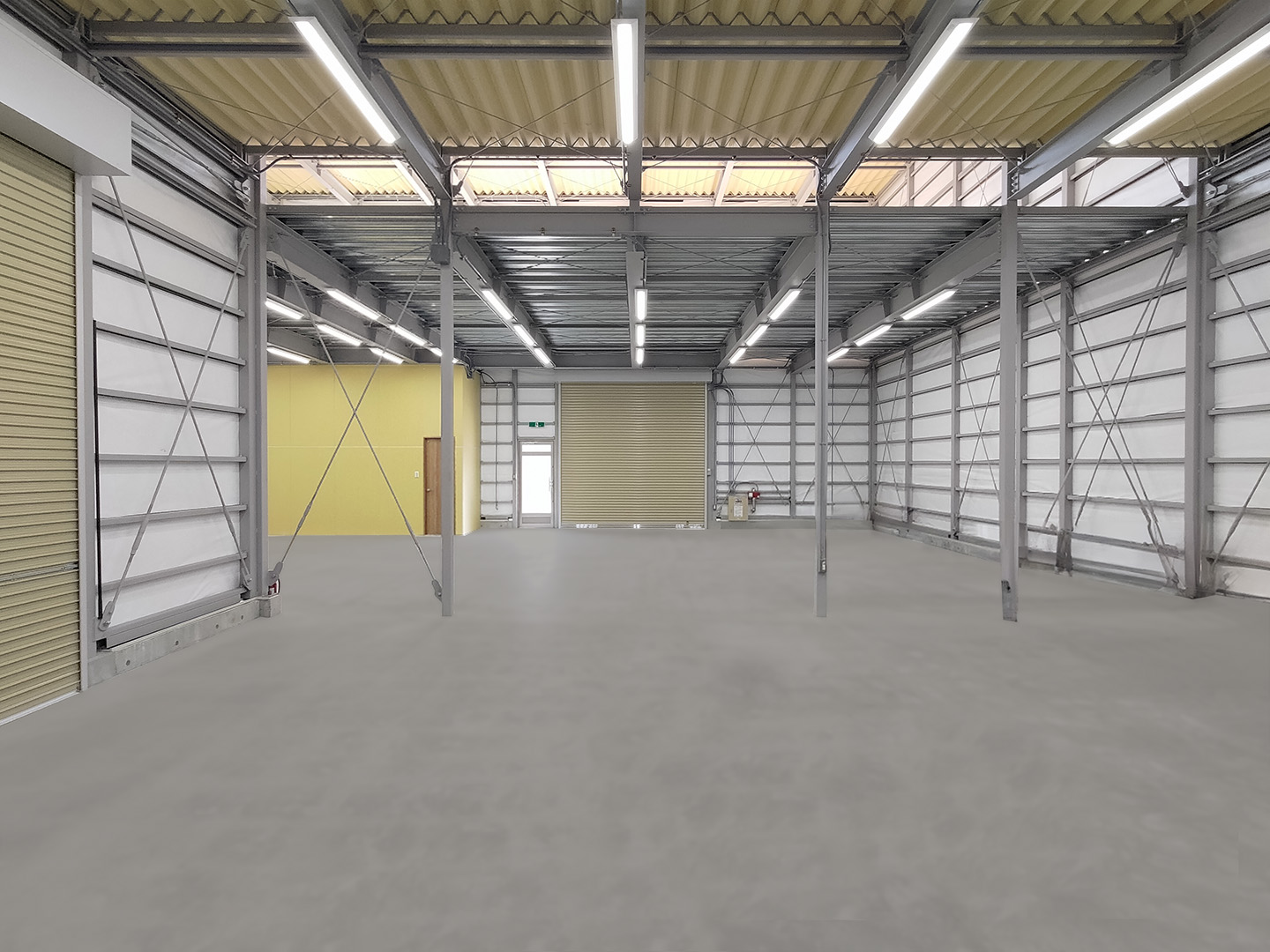 TDシリーズ 「TDシリーズ」 オリエントハウスプレハブシリーズのロングセラーシリーズです。設計の自由度が高くデザイン性の高い建築が可能で、準耐火建築物にも対応しています。シリーズ詳細はこちら>more による倉庫となります。幅のあるワイドな2階建ての区画と、天井高を持たせた1階建ての区画を組み合わせることにより、敷地の形状に合わせて無駄な部分が出ないよう計画。そのため、建屋前面に13㎡の敷地を確保でき、大型トラックでも建物内に入れるようになっています。室内は、内装無しの表しにした事で、2区画間のブレース部の壁がなくなり、作業時の見通しを向上。また照明も通常の2倍ほど設置した事で、夜間でも快適な作業空間を実現。隣地建物との差別化と重厚感を持つ建物にされたいとのお客様のお声から、外壁にはネイビーを採用し、重厚感のある印象になっています。建物正面には開口3.3m x 高さ3.3mの電動軽量シャッターを設置。上部には幅4.5m x 奥行き2.4mの庇を設けることにより、雨の日の作業を容易にし、外観のアクセントにもなっています。
