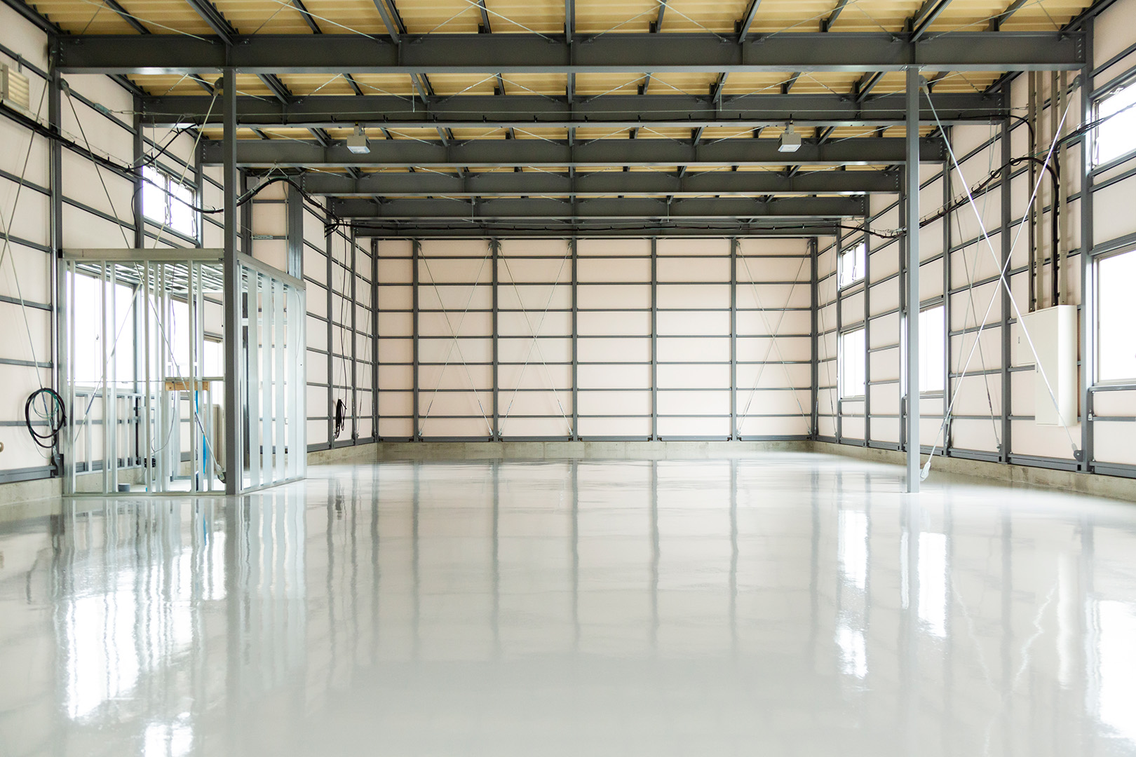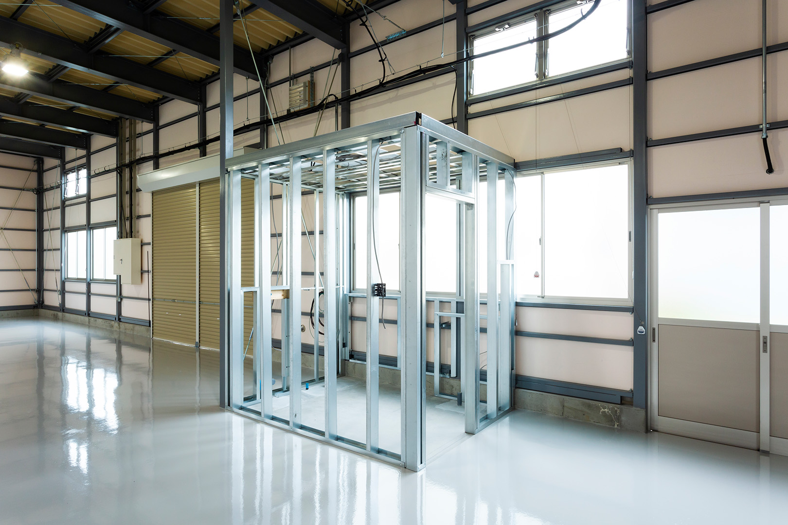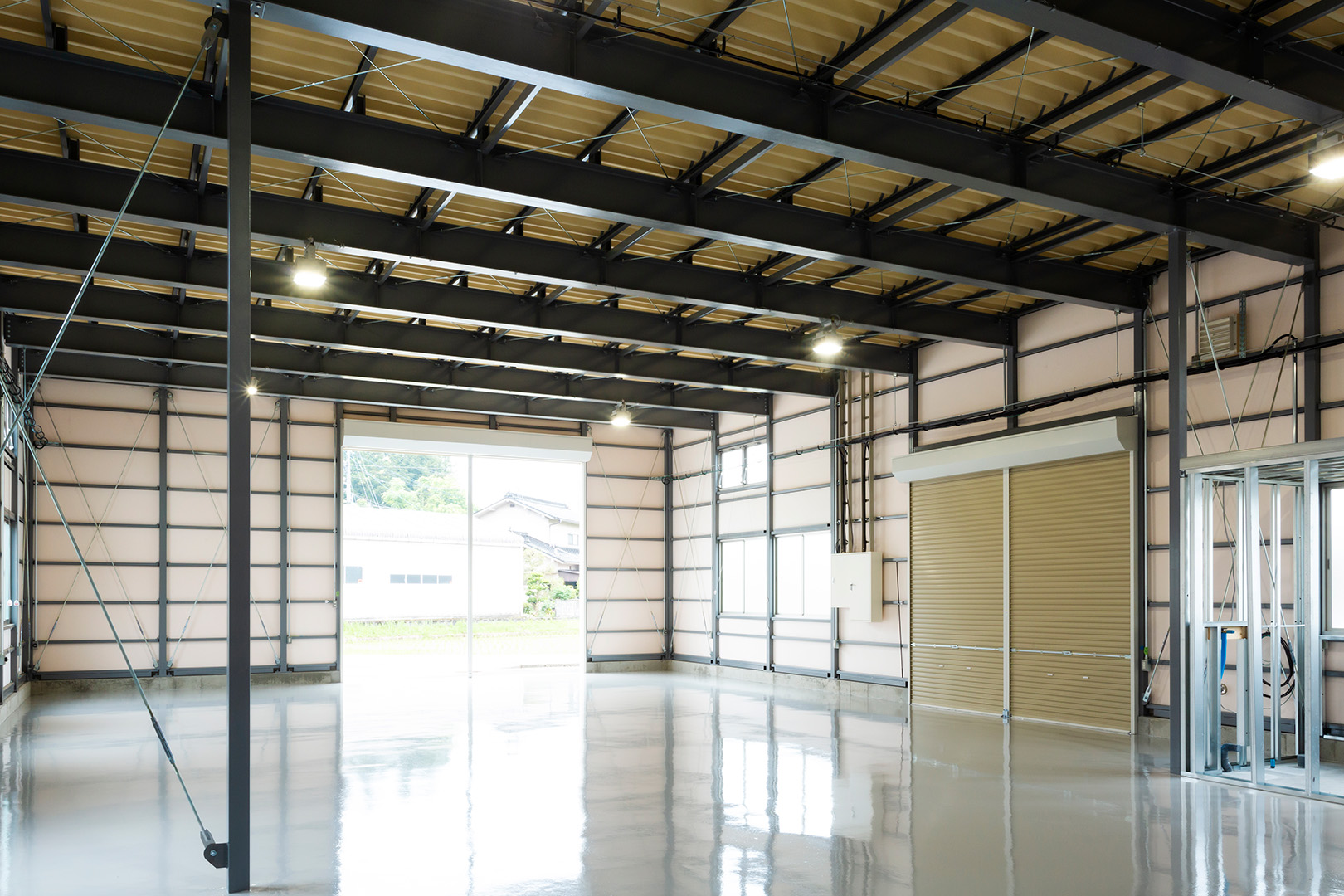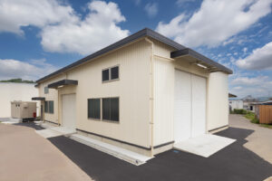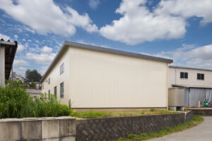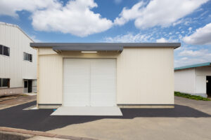 TDシリーズ 「TDシリーズ」 オリエントハウスプレハブシリーズのロングセラーシリーズです。設計の自由度が高くデザイン性の高い建築が可能で、準耐火建築物にも対応しています。シリーズ詳細はこちら>more で設計・施工した工場です。現場調査を行い、変形敷地に合わせて建物の形状やレイアウトを計画しました。工場内部は 梁下 「梁下」 梁(はり)の下端から床仕上げ面までの高さを示す寸法。意匠的な天井仕上げの高さ(天井高)とは異なり、構造体としての制限寸法を表す。 梁下:梁の下端まで 天井高:内装仕上げ後の天井面ま...more 高を4.5mとし、床は土間コンクリートに防塵塗装で仕上げました。5tを超える大型機械を設置する部分には、荷重に耐えられるよう 基礎 「基礎」 建物を地面に支える重要な部分です。軽量鉄骨ブレース構造のプレハブ建築では、相性のいい「コンクリート布基礎」がよく採用されます。more を強化し、土間コンクリートを厚くしました。トラックの搬出入に対応できるよう、開口部には軽量手動バランスシャッターを2か所設置(幅4.4m×高さ4.0m、幅3.5m×高さ3.0m)。外壁には施主様の会社イメージカラーであるアイボリーの角波サイディングを採用し、機能性とデザイン性を兼ね備えた仕上がりとしました。