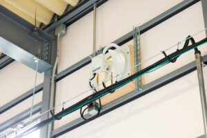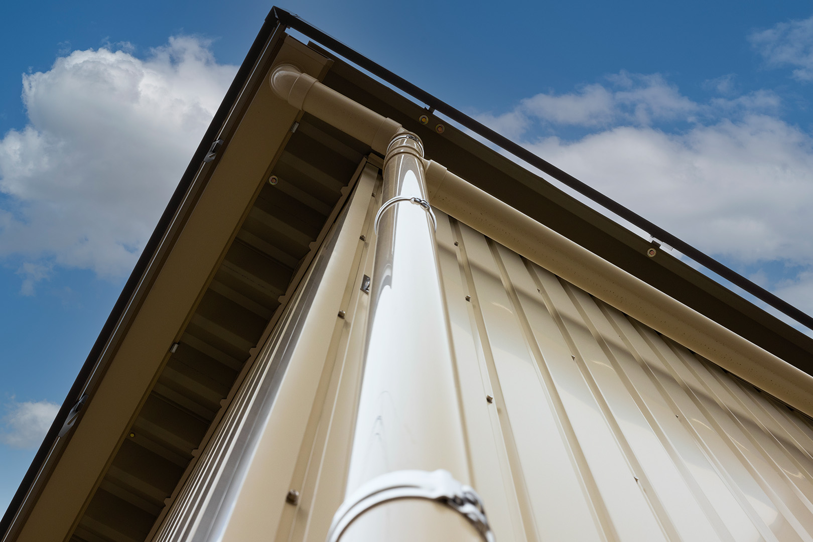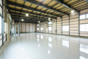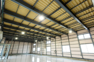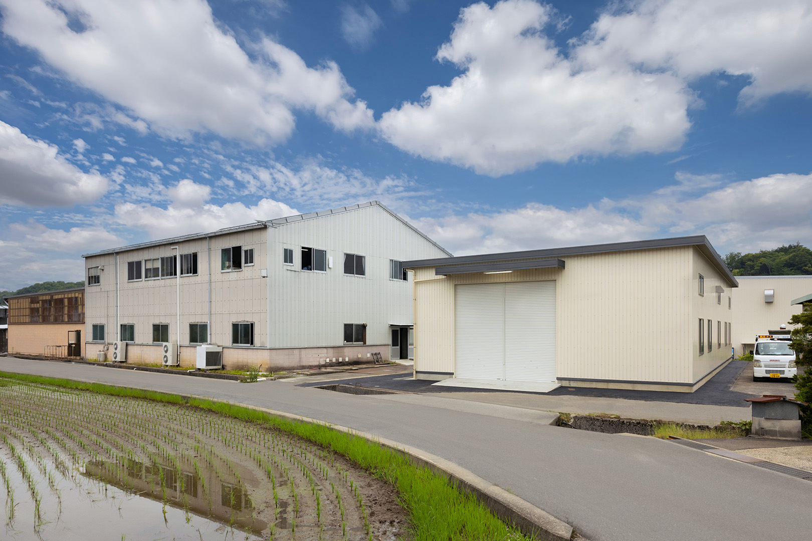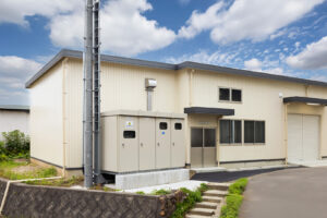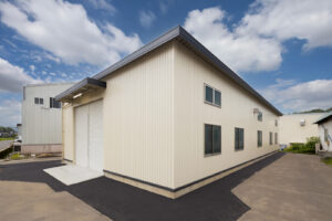 TDシリーズ 「TDシリーズ」 オリエントハウスプレハブシリーズのロングセラーシリーズです。設計の自由度が高くデザイン性の高い建築が可能で、準耐火建築物にも対応しています。シリーズ詳細はこちら>more で設計・施工した工場です。現場調査を行い、変形敷地に合わせて建物の形状やレイアウトを計画しました。工場内部は 梁下 「梁下」 梁(はり)の下端から床仕上げ面までの高さを示す寸法。意匠的な天井仕上げの高さ(天井高)とは異なり、構造体としての制限寸法を表す。 梁下:梁の下端まで 天井高:内装仕上げ後の天井面ま...more 高を4.5mとし、床は土間コンクリートに防塵塗装で仕上げました。5tを超える大型機械を設置する部分には、荷重に耐えられるよう 基礎 「基礎」 建物を地面に支える重要な部分です。軽量鉄骨ブレース構造のプレハブ建築では、相性のいい「コンクリート布基礎」がよく採用されます。more を強化し、土間コンクリートを厚くしました。トラックの搬出入に対応できるよう、開口部には軽量手動バランスシャッターを2か所設置(幅4.4m×高さ4.0m、幅3.5m×高さ3.0m)。外壁には施主様の会社イメージカラーであるアイボリーの角波サイディングを採用し、機能性とデザイン性を兼ね備えた仕上がりとしました。