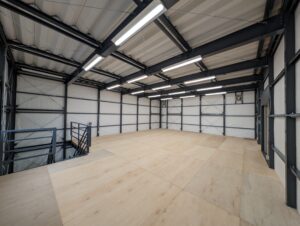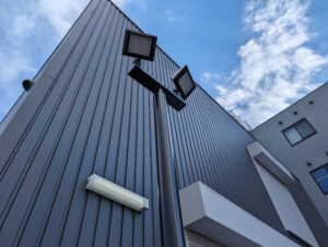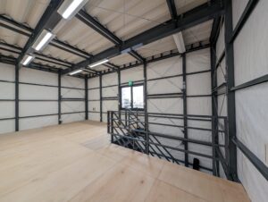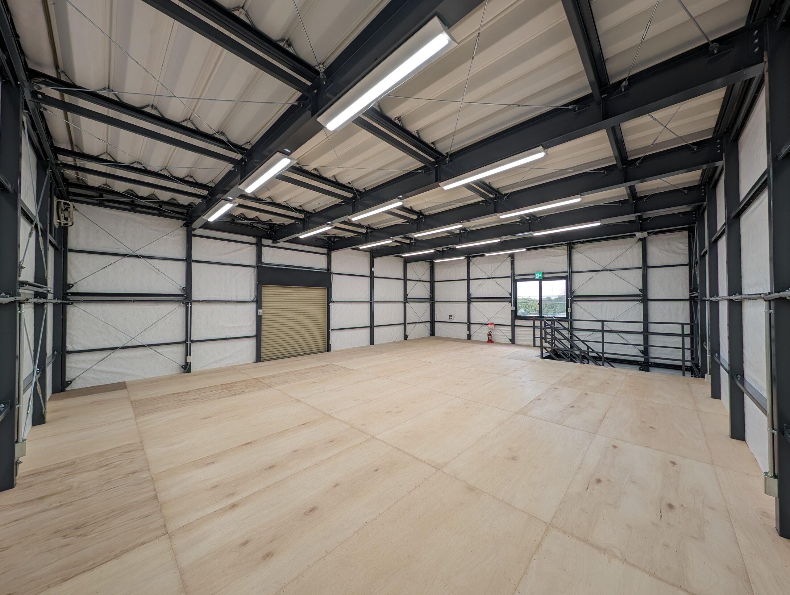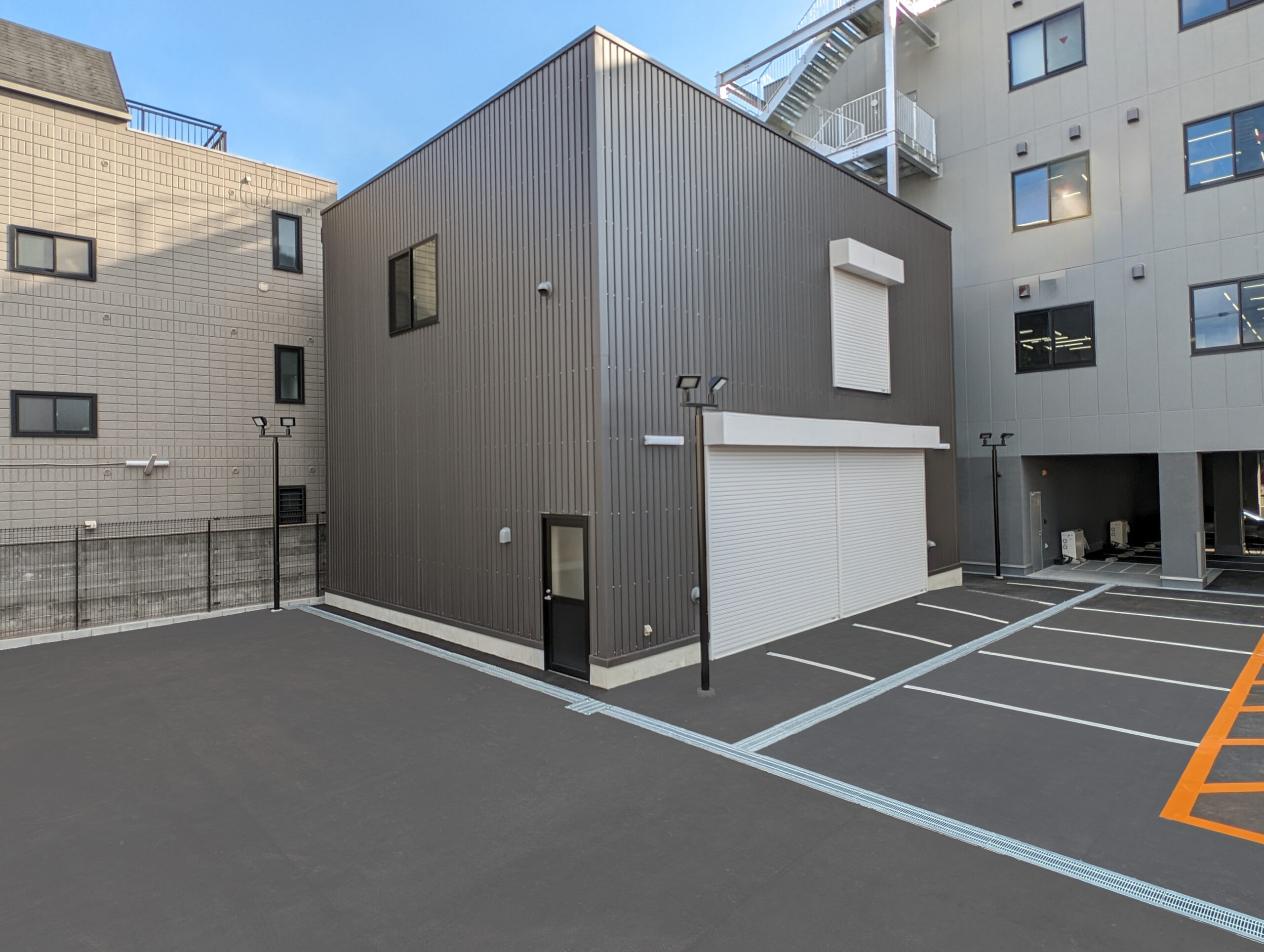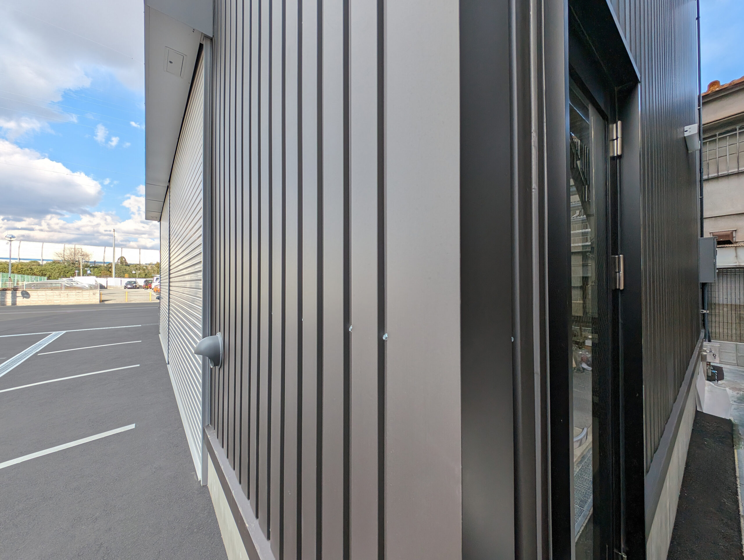 TDシリーズ 「TDシリーズ」 オリエントハウスプレハブシリーズのロングセラーシリーズです。設計の自由度が高くデザイン性の高い建築が可能で、準耐火建築物にも対応しています。シリーズ詳細はこちら>more で設計・施工した倉庫です。資材の搬出入のため、正面には幅3.5m×高さ3.0mの軽量電動シャッターを2台並べて設置し、開口幅7.0mを確保。さらに2階にも幅2.0m×高さ2.0mのシャッターを設け、直接搬入ができるようになっています。加えて、現場の作業員のために外部からトイレを利用できるようにするなど、日常の使いやすさにも配慮しています。内装については用途が倉庫であることから、室内の面積と高さをできるだけ有効に使えるよう、天井を設けず、壁面は鉄骨表しとしました。床は1階をコンクリート土間、2階を床パネル仕上げとしています。また、保管物に太陽光が直接当たらないよう、窓の設置は最小限に抑えました。外壁には角波鉄板を採用し、壁を3方向に立ち上げるパラペット仕様とすることで、外観に一体感のある印象となっています。