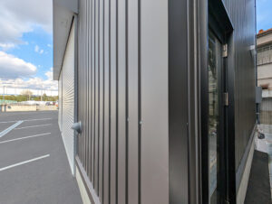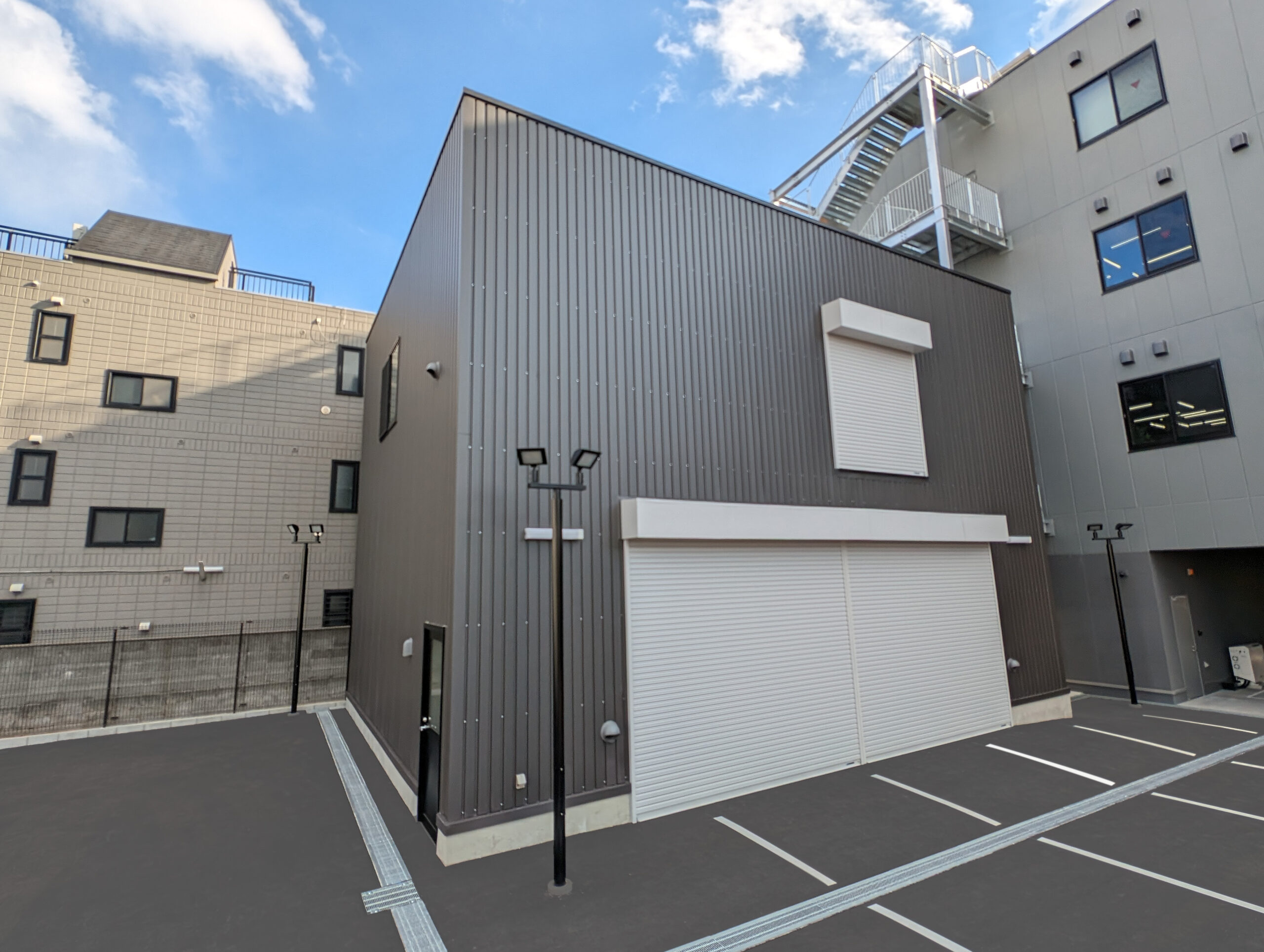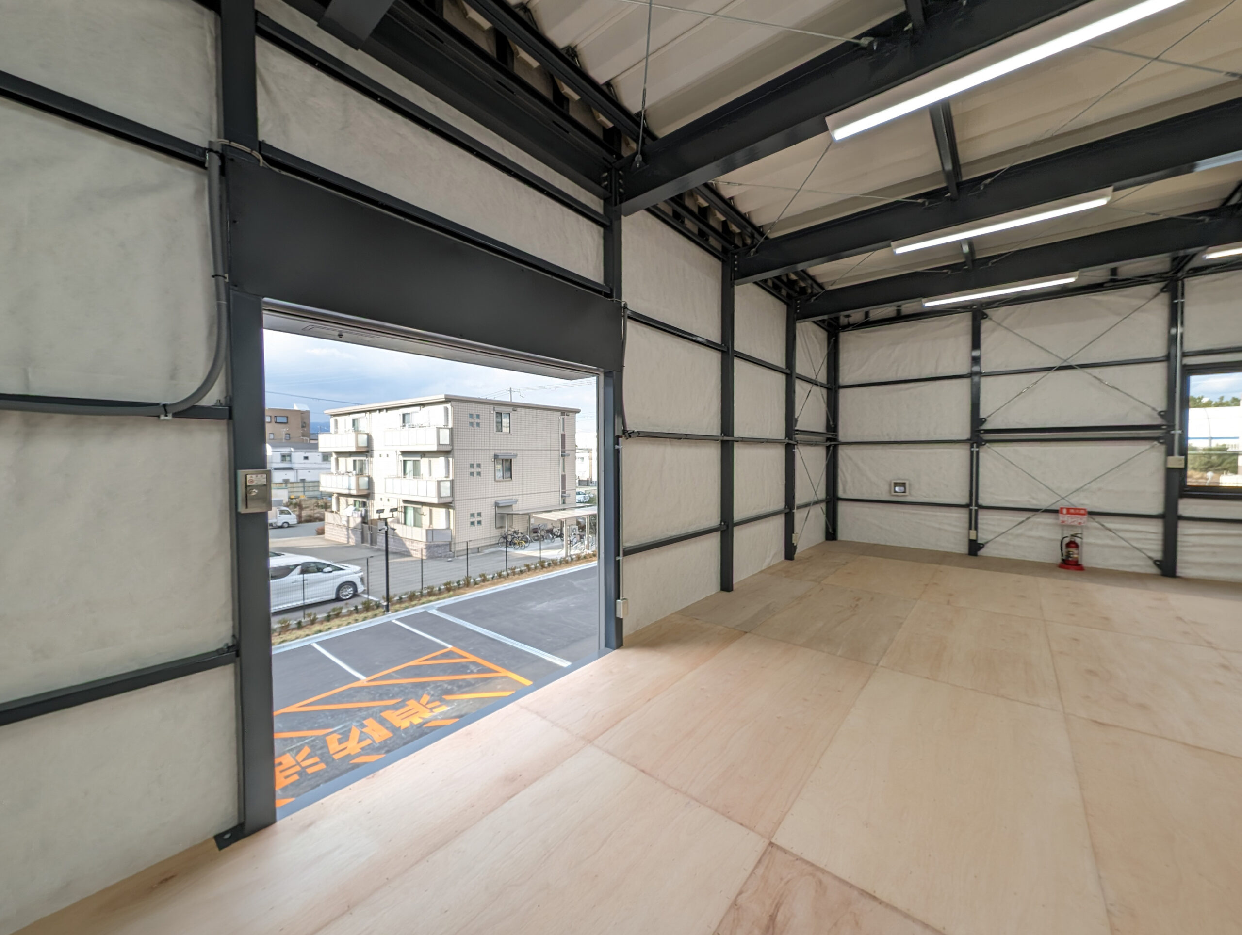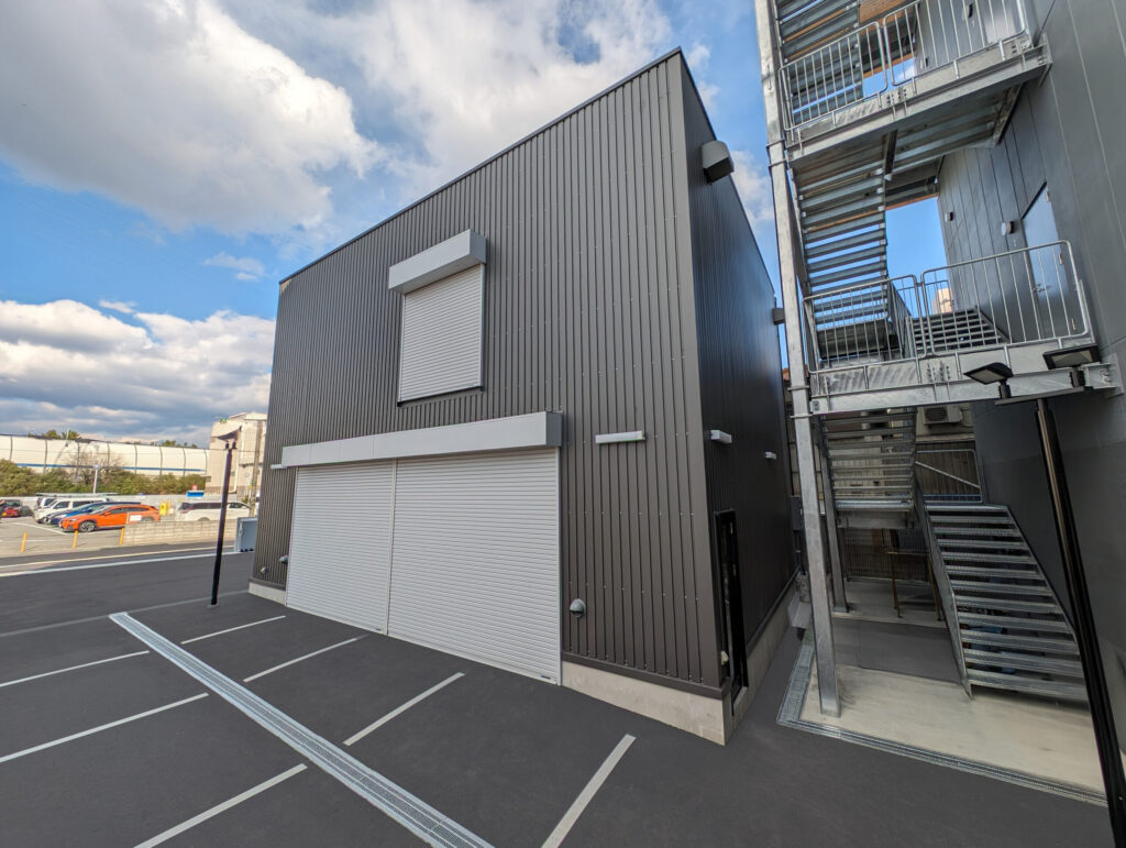 2階建て倉庫の外観1。正面から、1階と2階に設けられた軽量電動シャッターが写っている。 VIEW VIEW