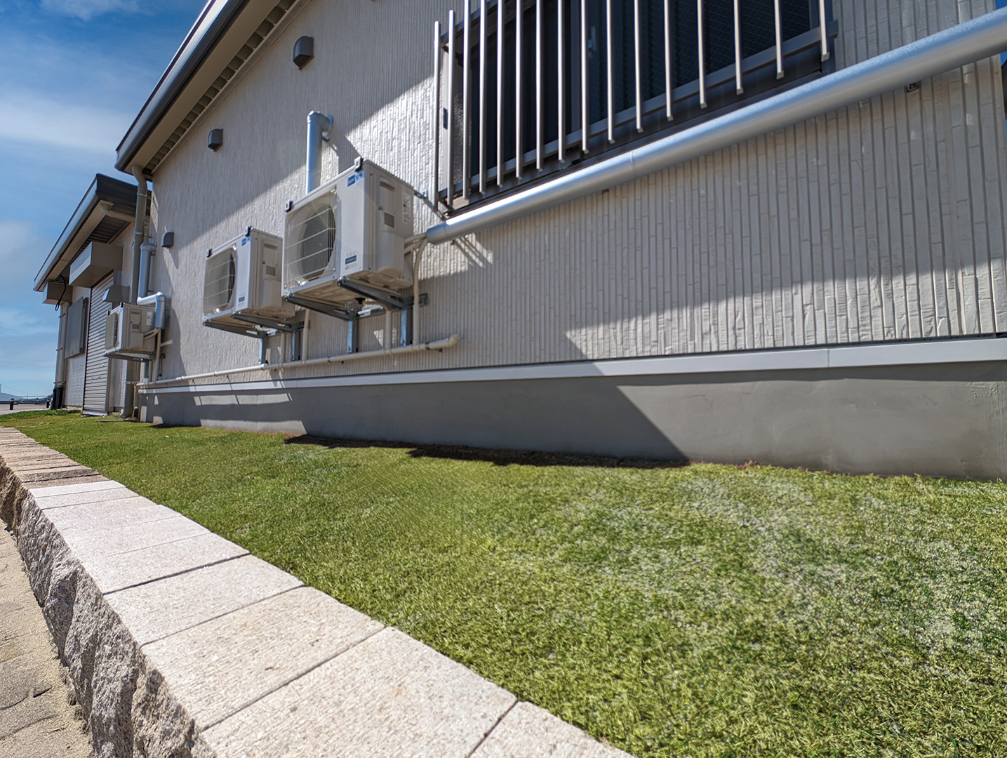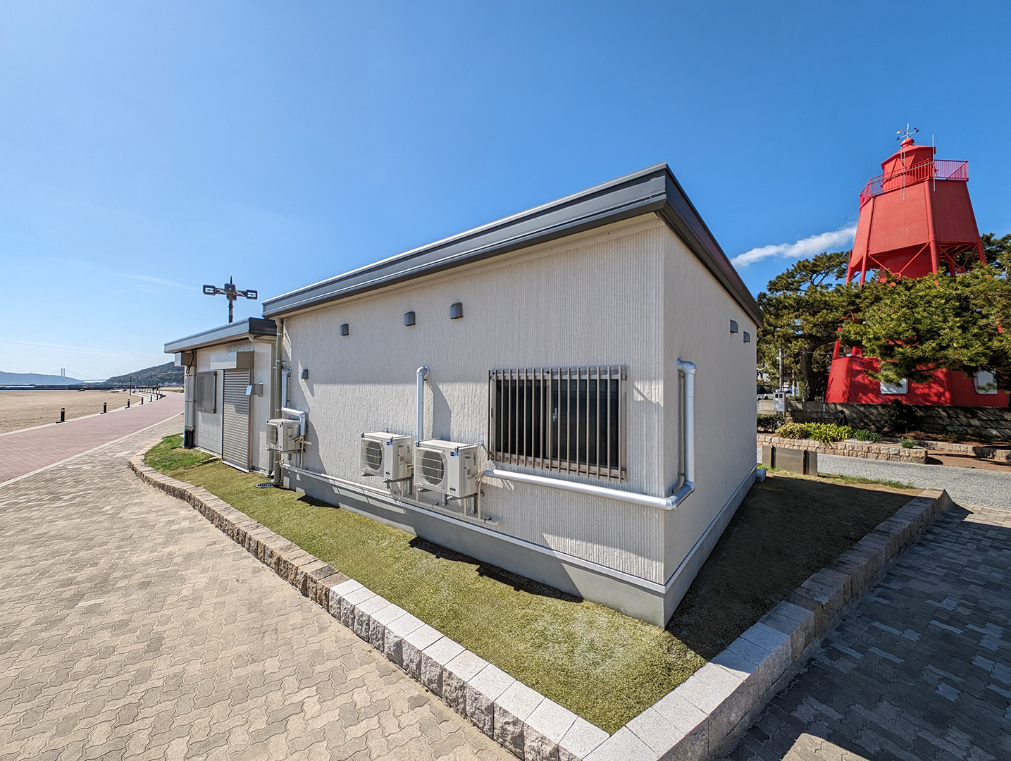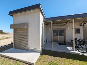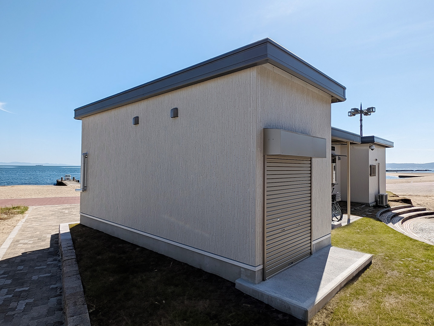 TDシリーズ 「TDシリーズ」 オリエントハウスプレハブシリーズのロングセラーシリーズです。設計の自由度が高くデザイン性の高い建築が可能で、準耐火建築物にも対応しています。シリーズ詳細はこちら>more で施工した海岸警備の管理事務所です。正面から向かって右側が既存の事務所で、左側が今回新たに増築した建物となります。既設事務所では手狭になったことから増築計画が上がりましたが、構造および施工上の理由から既存建物を直接拡張することが難しかったため、別棟として新たに建設しました。既存棟との接続にはエキスパンションジョイントを用い、通路でつなぐことで外部に出ることなく行き来できるレイアウトとなっております。新築部分には更衣室や休憩室、倉庫を新設しています。倉庫には高さ1.9m x 幅1.6mの軽量シャッターを設置。外壁には耐久性と耐塩害性を考慮し、窯業系サイディングを採用するとともに、鉄骨柱が外部に露出しない仕様にしました。