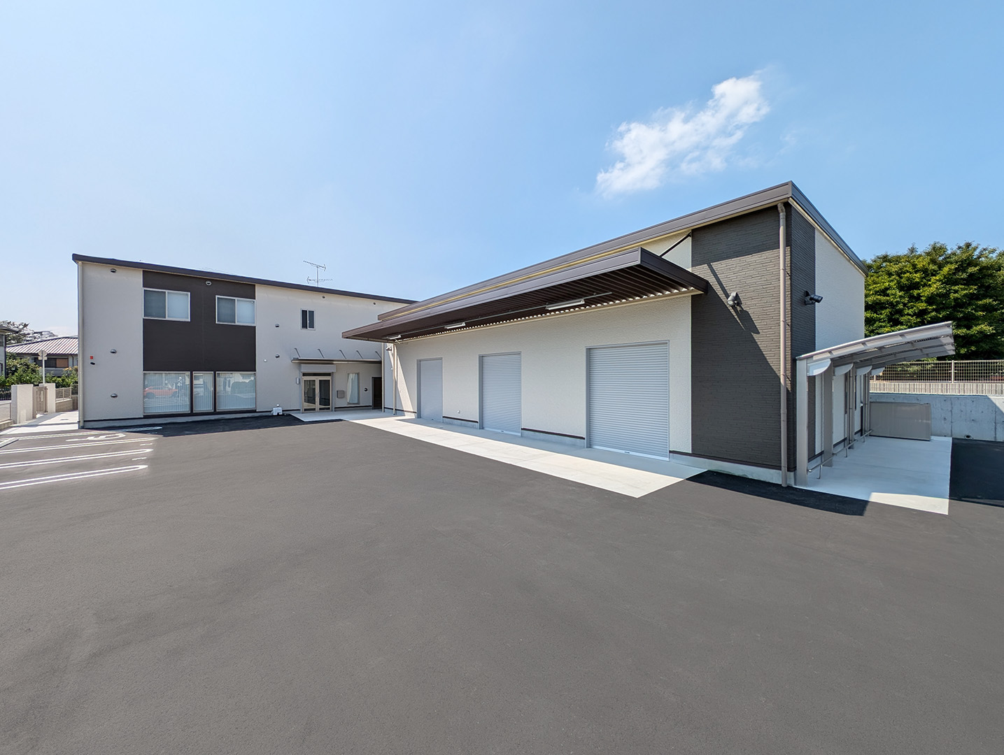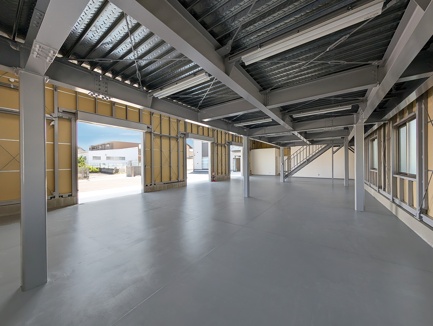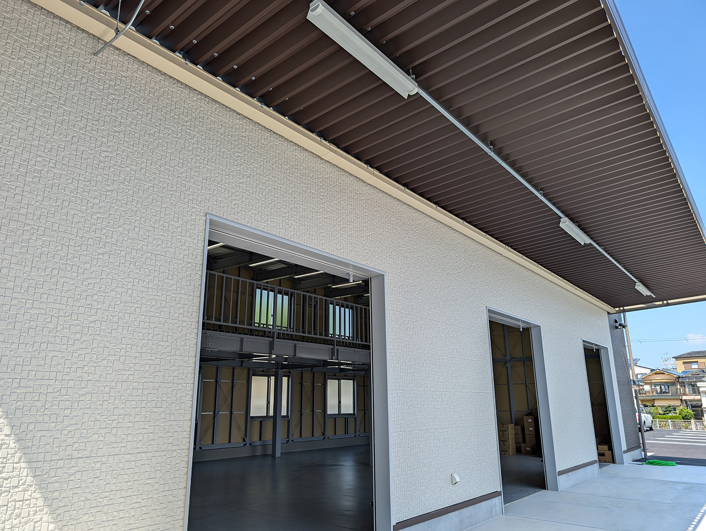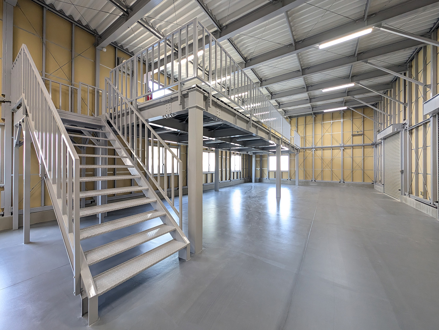 TDシリーズ 「TDシリーズ」 オリエントハウスプレハブシリーズのロングセラーシリーズです。設計の自由度が高くデザイン性の高い建築が可能で、準耐火建築物にも対応しています。シリーズ詳細はこちら>more で施工した事務所棟と倉庫棟です。設計段階では、施主様のご意向を踏まえて、建物の配置や出入り口の位置を慎重に決定。建物の構造には 軽量鉄骨造 「軽量鉄骨造」 主に板厚6mm未満の軽量鋼材を柱・梁などの主要骨組みに使用する鉄骨構造。部材が軽く、工場でのプレハブ化・ユニット化がしやすいため、短工期で高精度な施工が可能。more を採用しながらも、倉庫棟の中2階部分には 重量鉄骨造 「重量鉄骨造」 主にH形鋼などの厚みのある鋼材(板厚6mm以上)を柱・梁などの主要骨組みに使用する鉄骨構造。柱や梁が太く剛性が高いため、大スパンや高層建築、大型倉庫・工場などに適している。軽量鉄骨...more を採用することで、重さのある荷物にも対応した耐久性を確保しました。事務所棟の正面には 風除室 「風除室」 風や外気が直接居室に流入しないよう、建物の玄関前などに設けられる小部屋です。more を設置し、暴風対策や防犯性にも配慮。また、倉庫棟には軽量電動シャッター(高さ3.0m x 幅2.5m)を3か所に設置し、製品の搬入出をスムーズに行える設計としました。シャッター前面には、動線の確保に優れている柱の無い大型の吊り庇(幅16.8 m x 奥行き3.0 m)を採用し、雨の日の作業にも配慮。倉庫棟の 梁下 「梁下」 梁(はり)の下端から床仕上げ面までの高さを示す寸法。意匠的な天井仕上げの高さ(天井高)とは異なり、構造体としての制限寸法を表す。 梁下:梁の下端まで 天井高:内装仕上げ後の天井面ま...more 有効高は5.3mで、広い空間を確保しています。倉庫1階の床面積は177㎡、中2階の床面積55㎡とし、中2階の高さは既存倉庫に合わせ約2.5mに調整しました。外壁には16mm厚の窯業系サイディングを採用し、一部を張り分けることでアクセントをつけたデザインに仕上げています。