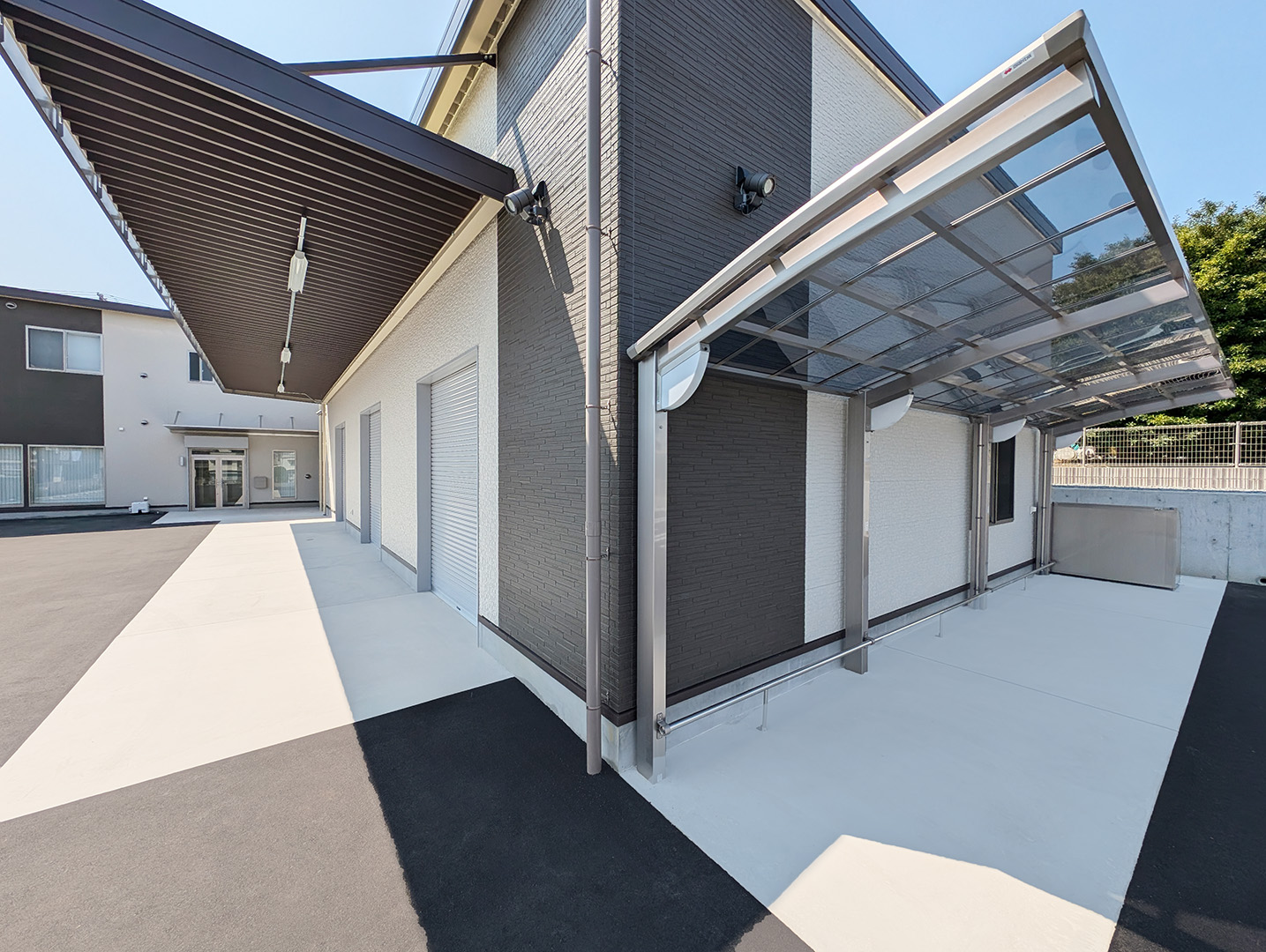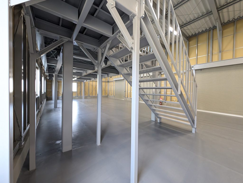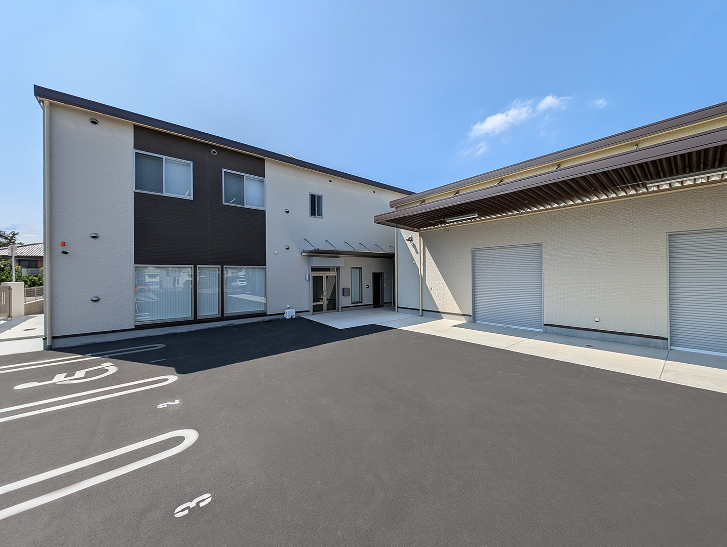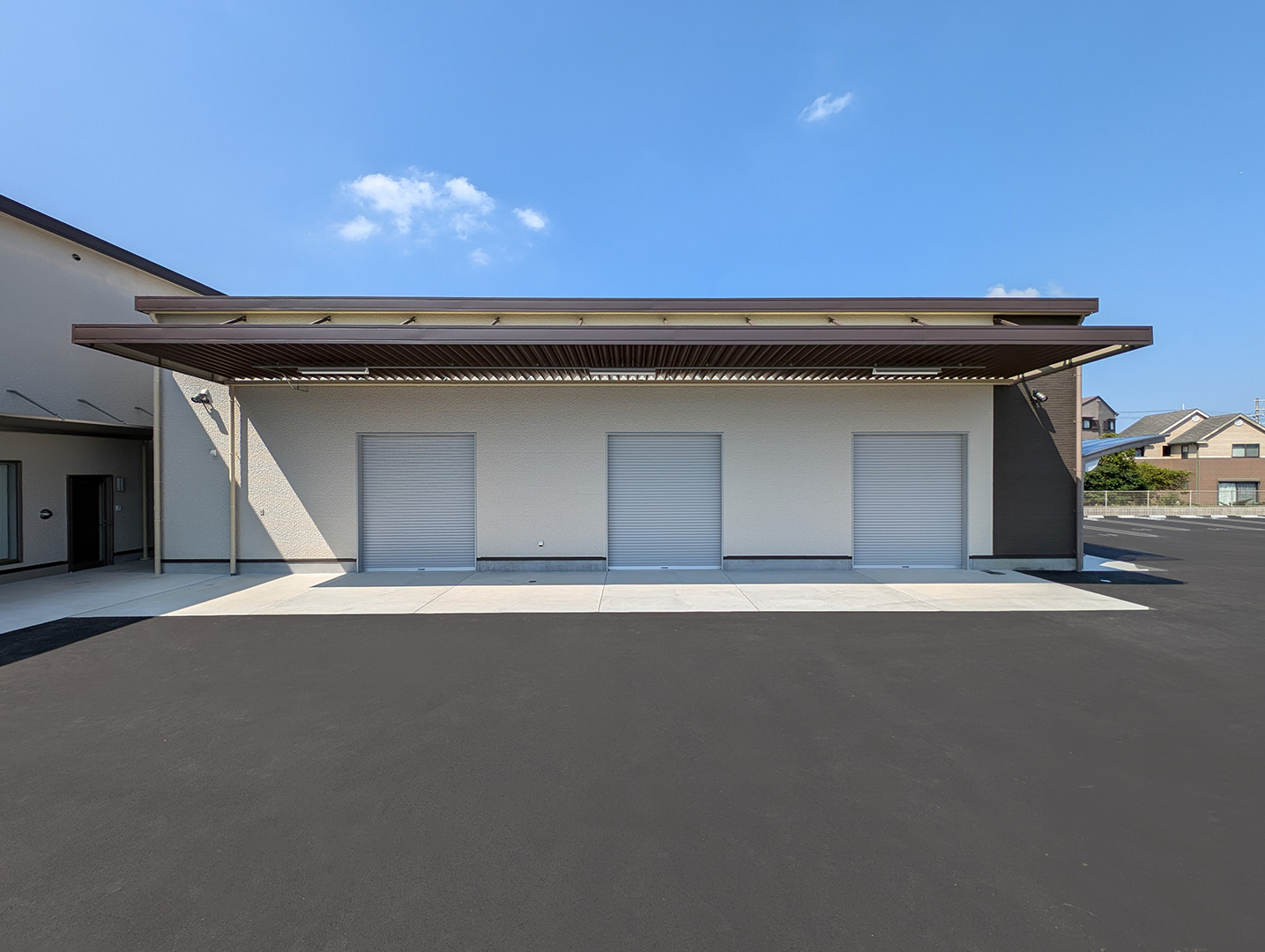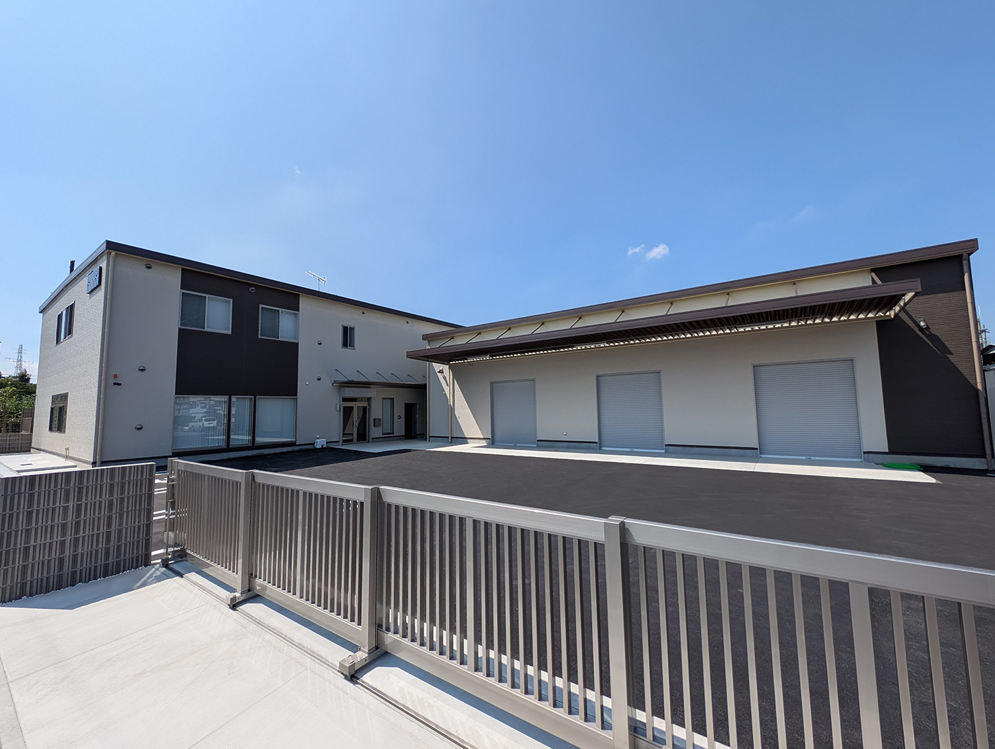 TDシリーズ 「TDシリーズ」 オリエントハウスプレハブシリーズのロングセラーシリーズです。設計の自由度が高くデザイン性の高い建築が可能で、準耐火建築物にも対応しています。シリーズ詳細はこちら>more で施工した事務所棟と倉庫棟です。設計段階では、施主様のご意向を踏まえて、建物の配置や出入り口の位置を慎重に決定。建物の構造には 軽量鉄骨造 「軽量鉄骨造」 主に板厚6mm未満の軽量鋼材を柱・梁などの主要骨組みに使用する鉄骨構造。部材が軽く、工場でのプレハブ化・ユニット化がしやすいため、短工期で高精度な施工が可能。more を採用しながらも、倉庫棟の中2階部分には 重量鉄骨造 「重量鉄骨造」 主にH形鋼などの厚みのある鋼材(板厚6mm以上)を柱・梁などの主要骨組みに使用する鉄骨構造。柱や梁が太く剛性が高いため、大スパンや高層建築、大型倉庫・工場などに適している。軽量鉄骨...more を採用することで、重さのある荷物にも対応した耐久性を確保しました。事務所棟の正面には 風除室 「風除室」 風や外気が直接居室に流入しないよう、建物の玄関前などに設けられる小部屋です。more を設置し、暴風対策や防犯性にも配慮。また、倉庫棟には軽量電動シャッター(高さ3.0m x 幅2.5m)を3か所に設置し、製品の搬入出をスムーズに行える設計としました。シャッター前面には、動線の確保に優れている柱の無い大型の吊り庇(幅16.8 m x 奥行き3.0 m)を採用し、雨の日の作業にも配慮。倉庫棟の 梁下 「梁下」 梁(はり)の下端から床仕上げ面までの高さを示す寸法。意匠的な天井仕上げの高さ(天井高)とは異なり、構造体としての制限寸法を表す。 梁下:梁の下端まで 天井高:内装仕上げ後の天井面ま...more 有効高は5.3mで、広い空間を確保しています。倉庫1階の床面積は177㎡、中2階の床面積55㎡とし、中2階の高さは既存倉庫に合わせ約2.5mに調整しました。外壁には16mm厚の窯業系サイディングを採用し、一部を張り分けることでアクセントをつけたデザインに仕上げています。