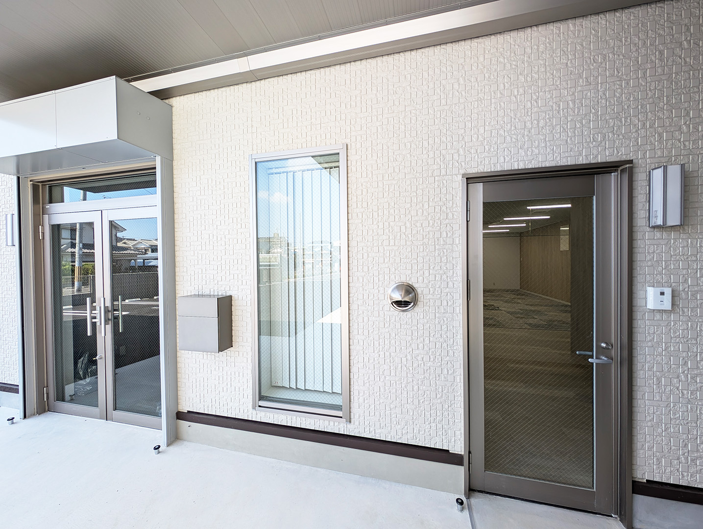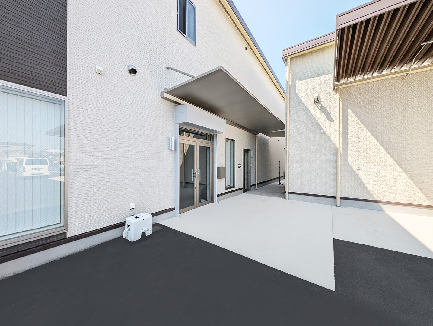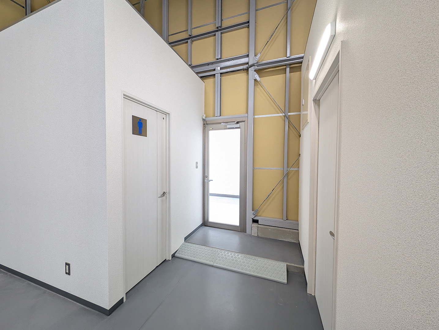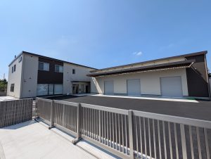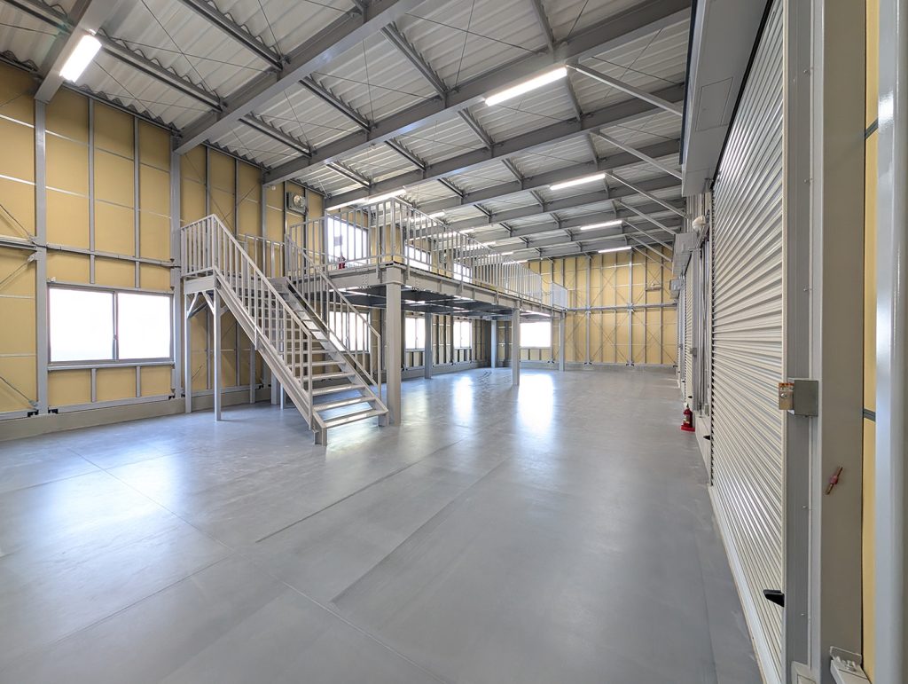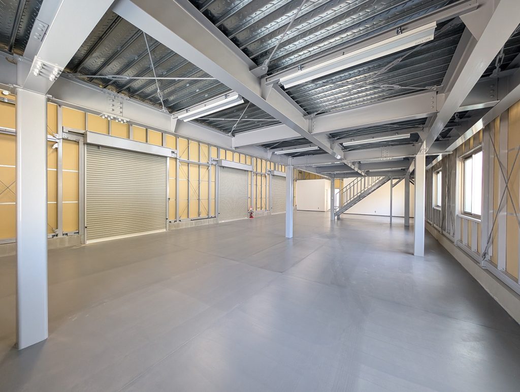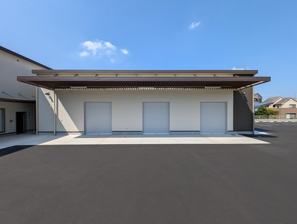TDシリーズ 「TDシリーズ」 オリエントハウスプレハブシリーズのロングセラーシリーズです。設計の自由度が高くデザイン性の高い建築が可能で、準耐火建築物にも対応しています。シリーズ詳細はこちら>more で施工した事務所棟と倉庫棟です。設計段階では、施主様のご意向を踏まえて、建物の配置や出入り口の位置を慎重に決定。建物の構造には 軽量鉄骨造 「軽量鉄骨造」 主に板厚6mm未満の軽量鋼材を柱・梁などの主要骨組みに使用する鉄骨構造。部材が軽く、工場でのプレハブ化・ユニット化がしやすいため、短工期で高精度な施工が可能。more を採用しながらも、倉庫棟の中2階部分には 重量鉄骨造 「重量鉄骨造」 主にH形鋼などの厚みのある鋼材(板厚6mm以上)を柱・梁などの主要骨組みに使用する鉄骨構造。柱や梁が太く剛性が高いため、大スパンや高層建築、大型倉庫・工場などに適している。軽量鉄骨...more を採用することで、重さのある荷物にも対応した耐久性を確保しました。事務所棟の正面には 風除室 「風除室」 風や外気が直接居室に流入しないよう、建物の玄関前などに設けられる小部屋です。more を設置し、暴風対策や防犯性にも配慮。また、倉庫棟には軽量電動シャッター(高さ3.0m x 幅2.5m)を3か所に設置し、製品の搬入出をスムーズに行える設計としました。シャッター前面には、動線の確保に優れている柱の無い大型の吊り庇(幅16.8 m x 奥行き3.0 m)を採用し、雨の日の作業にも配慮。倉庫棟の 梁下 「梁下」 梁(はり)の下端から床仕上げ面までの高さを示す寸法。意匠的な天井仕上げの高さ(天井高)とは異なり、構造体としての制限寸法を表す。 梁下:梁の下端まで 天井高:内装仕上げ後の天井面ま...more 有効高は5.3mで、広い空間を確保しています。倉庫1階の床面積は177㎡、中2階の床面積55㎡とし、中2階の高さは既存倉庫に合わせ約2.5mに調整しました。外壁には16mm厚の窯業系サイディングを採用し、一部を張り分けることでアクセントをつけたデザインに仕上げています。