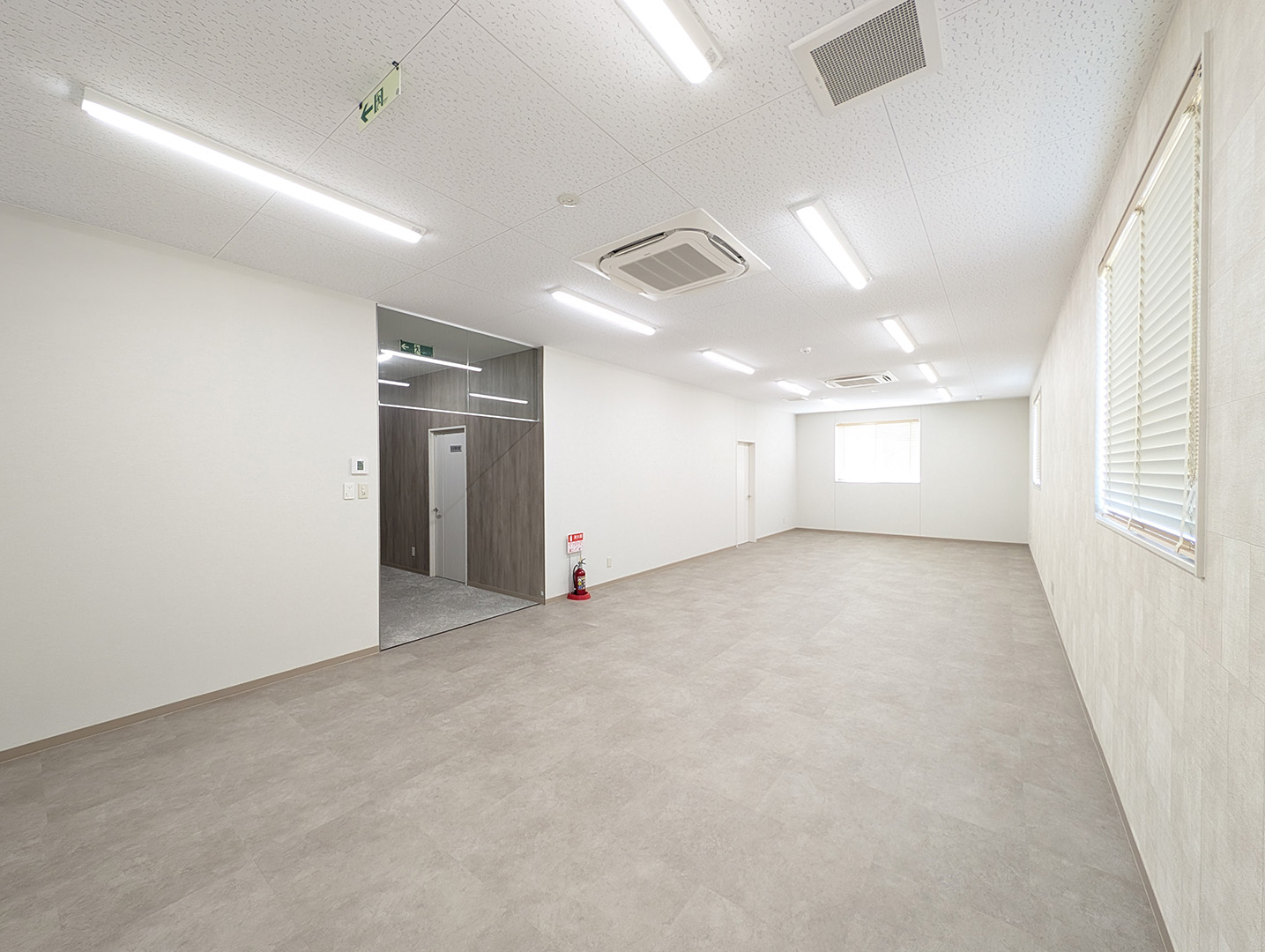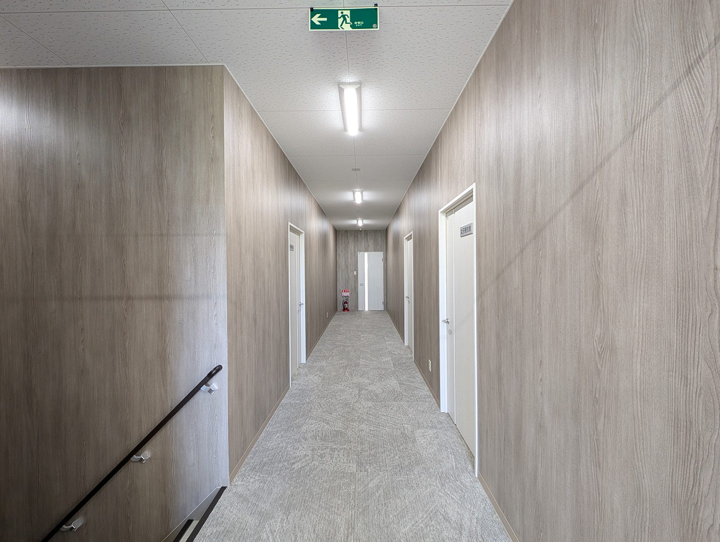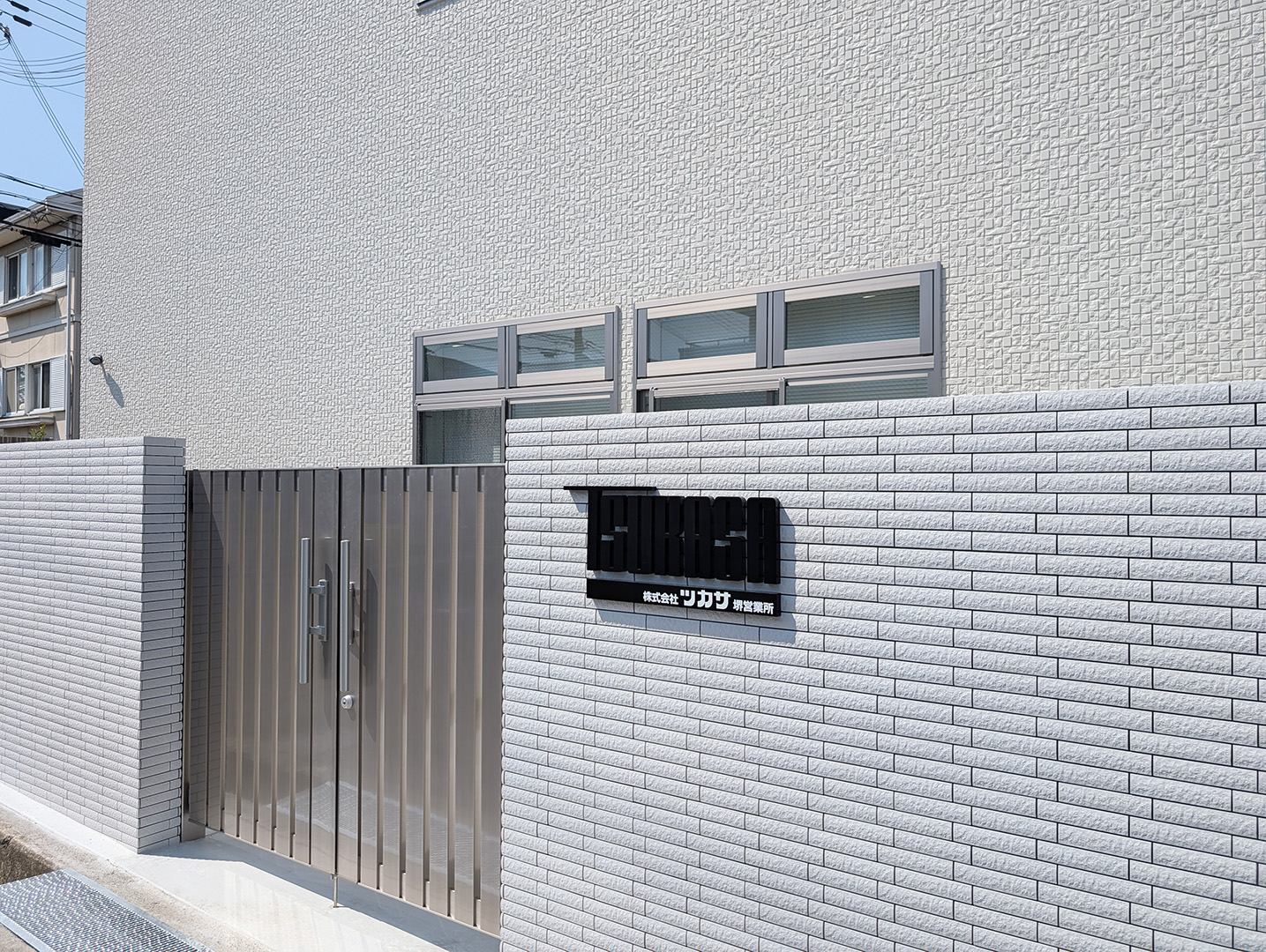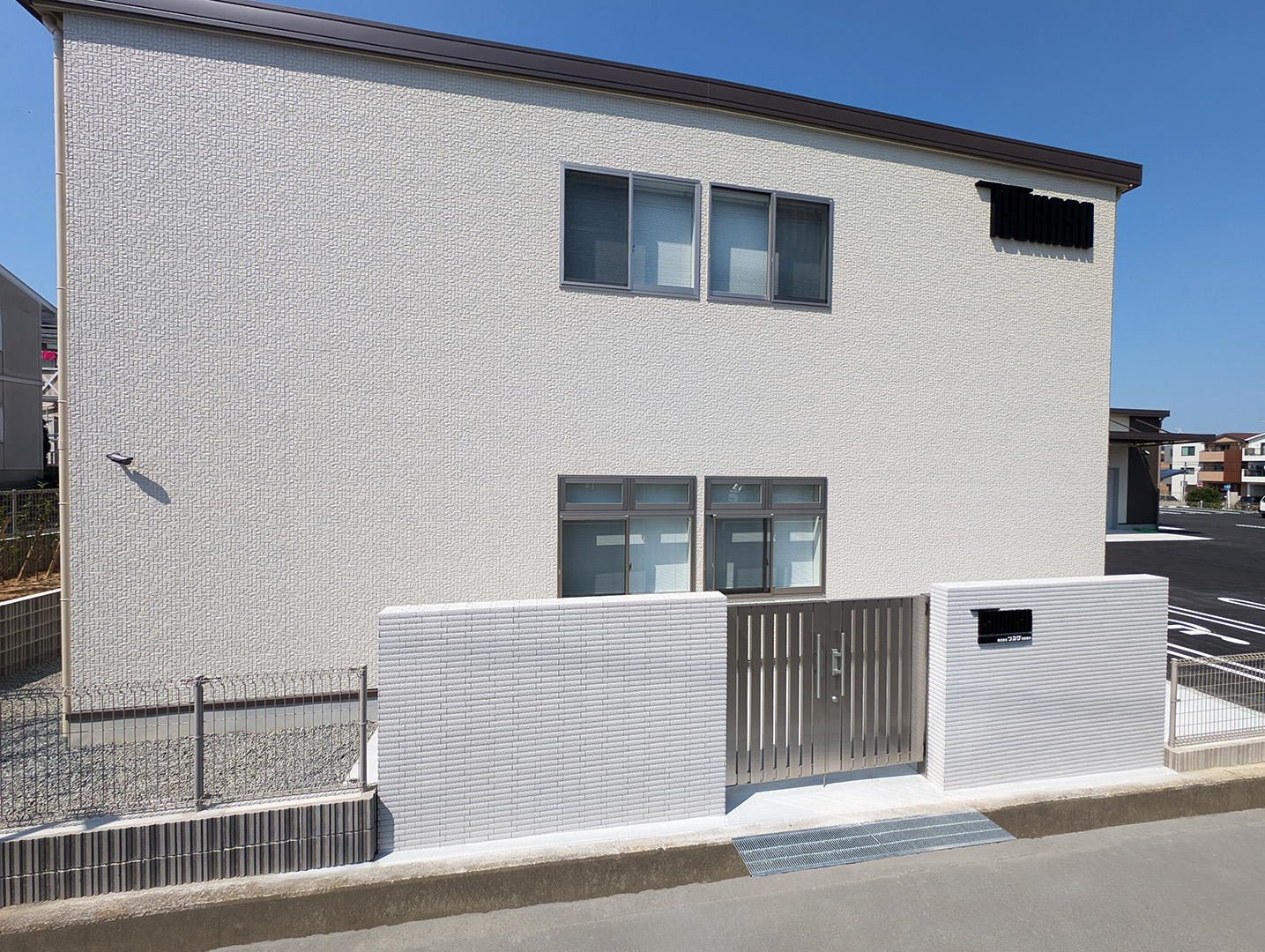 TDシリーズ 「TDシリーズ」 オリエントハウスプレハブシリーズのロングセラーシリーズです。設計の自由度が高くデザイン性の高い建築が可能で、準耐火建築物にも対応しています。シリーズ詳細はこちら>more で施工した事務所棟と倉庫棟です。設計段階では、施主様のご意向を踏まえて、建物の配置や出入り口の位置を慎重に決定。建物の構造には 軽量鉄骨造 「軽量鉄骨造」 主に板厚6mm未満の軽量鋼材を柱・梁などの主要骨組みに使用する鉄骨構造。部材が軽く、工場でのプレハブ化・ユニット化がしやすいため、短工期で高精度な施工が可能。more を採用しながらも、倉庫棟の中2階部分には 重量鉄骨造 「重量鉄骨造」 主にH形鋼などの厚みのある鋼材(板厚6mm以上)を柱・梁などの主要骨組みに使用する鉄骨構造。柱や梁が太く剛性が高いため、大スパンや高層建築、大型倉庫・工場などに適している。軽量鉄骨...more を採用することで、重さのある荷物にも対応した耐久性を確保しました。事務所棟の正面には 風除室 「風除室」 風や外気が直接居室に流入しないよう、建物の玄関前などに設けられる小部屋です。more を設置し、暴風対策や防犯性にも配慮。また、倉庫棟には軽量電動シャッター(高さ3.0m x 幅2.5m)を3か所に設置し、製品の搬入出をスムーズに行える設計としました。シャッター前面には、動線の確保に優れている柱の無い大型の吊り庇(幅16.8 m x 奥行き3.0 m)を採用し、雨の日の作業にも配慮。倉庫棟の 梁下 「梁下」 梁(はり)の下端から床仕上げ面までの高さを示す寸法。意匠的な天井仕上げの高さ(天井高)とは異なり、構造体としての制限寸法を表す。 梁下:梁の下端まで 天井高:内装仕上げ後の天井面ま...more 有効高は5.3mで、広い空間を確保しています。倉庫1階の床面積は177㎡、中2階の床面積55㎡とし、中2階の高さは既存倉庫に合わせ約2.5mに調整しました。外壁には16mm厚の窯業系サイディングを採用し、一部を張り分けることでアクセントをつけたデザインに仕上げています。