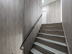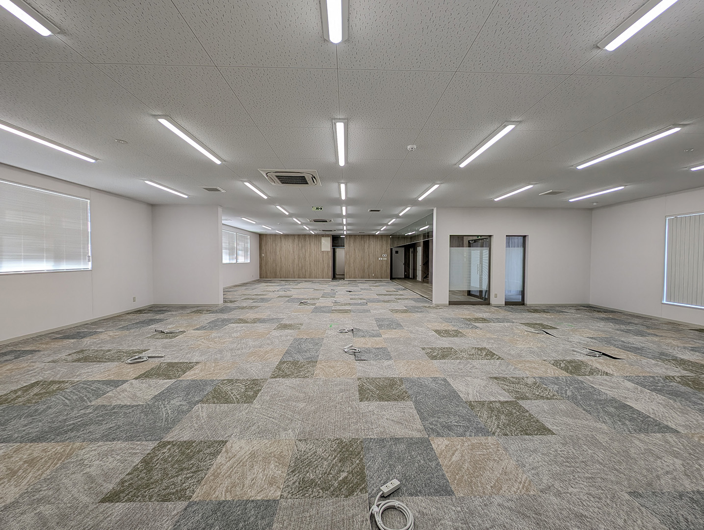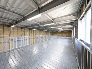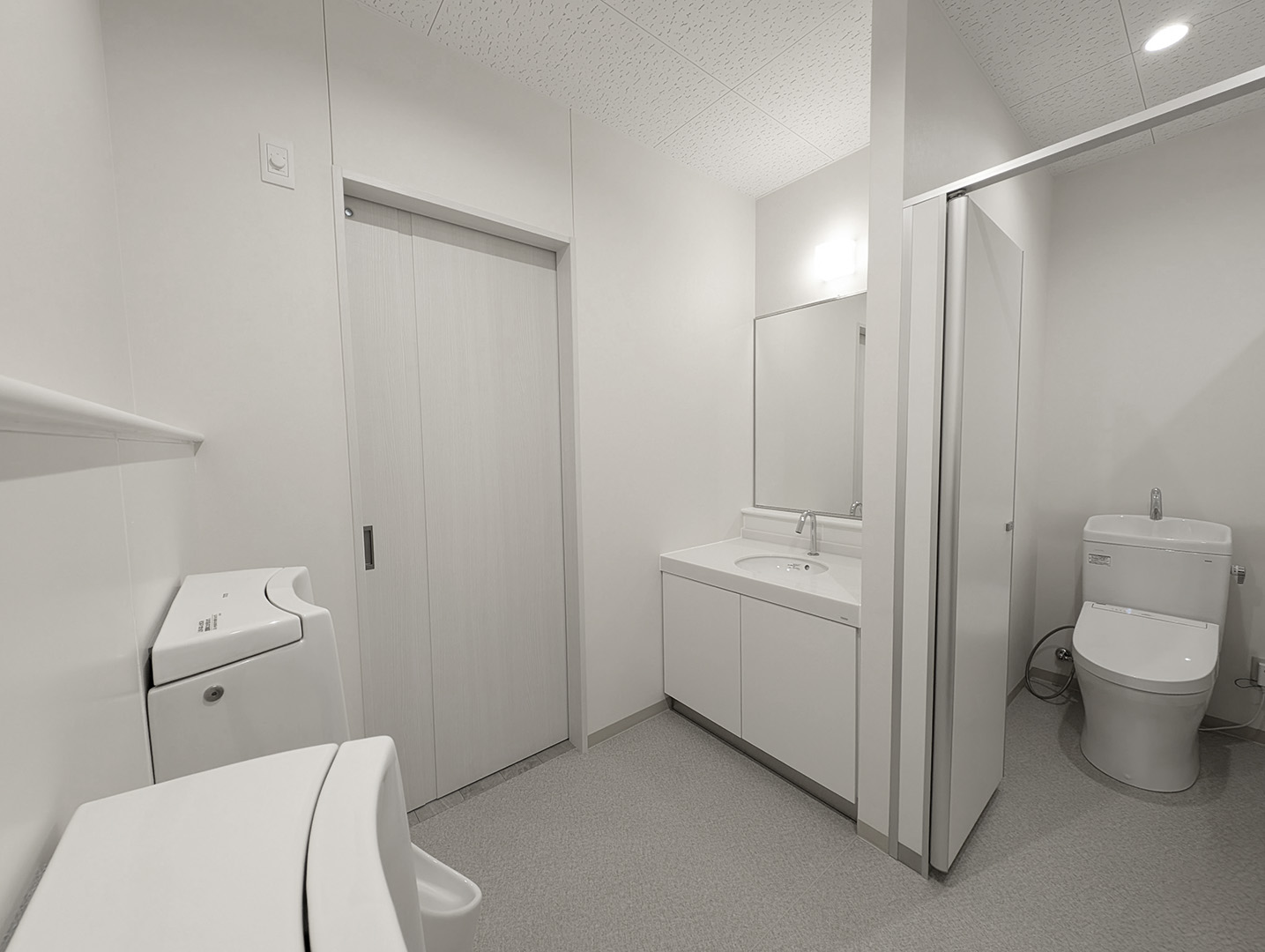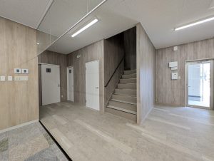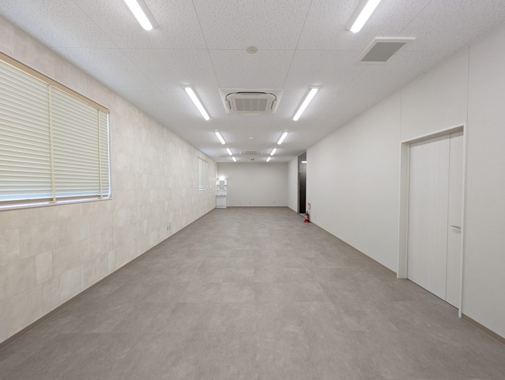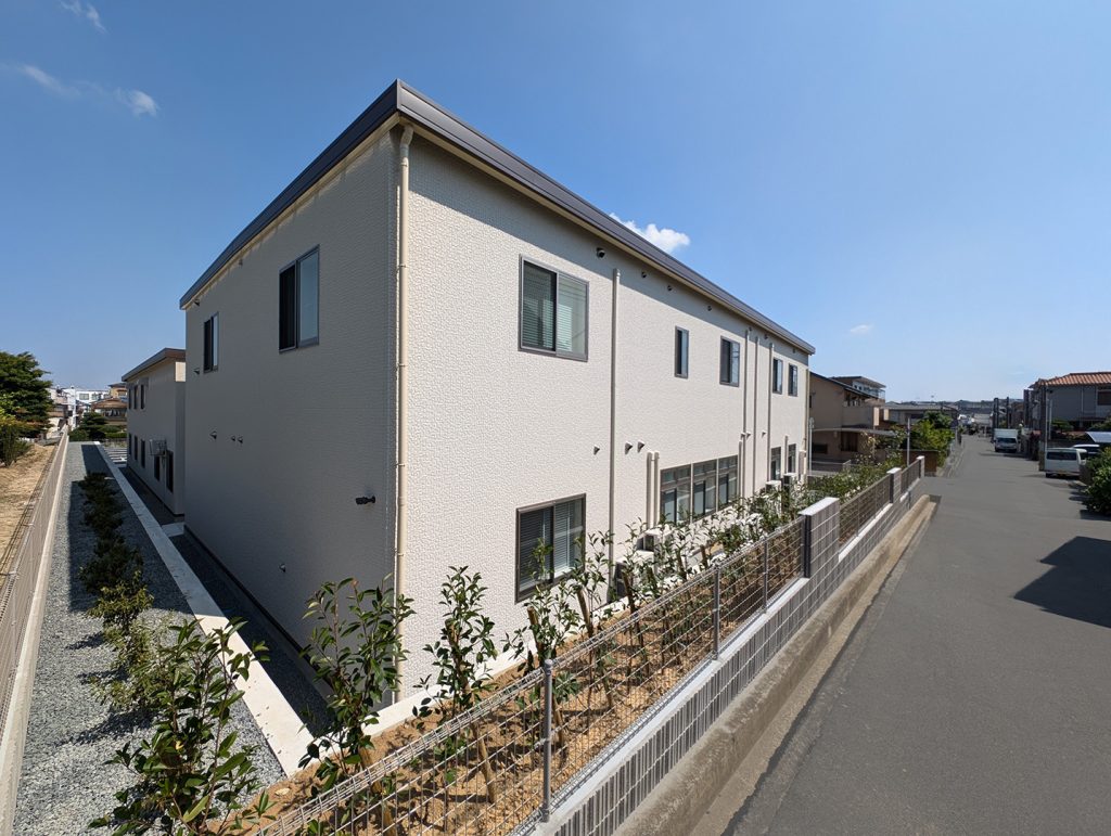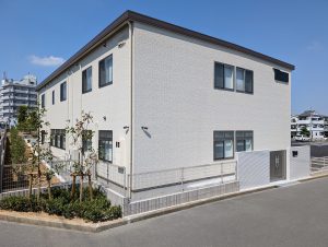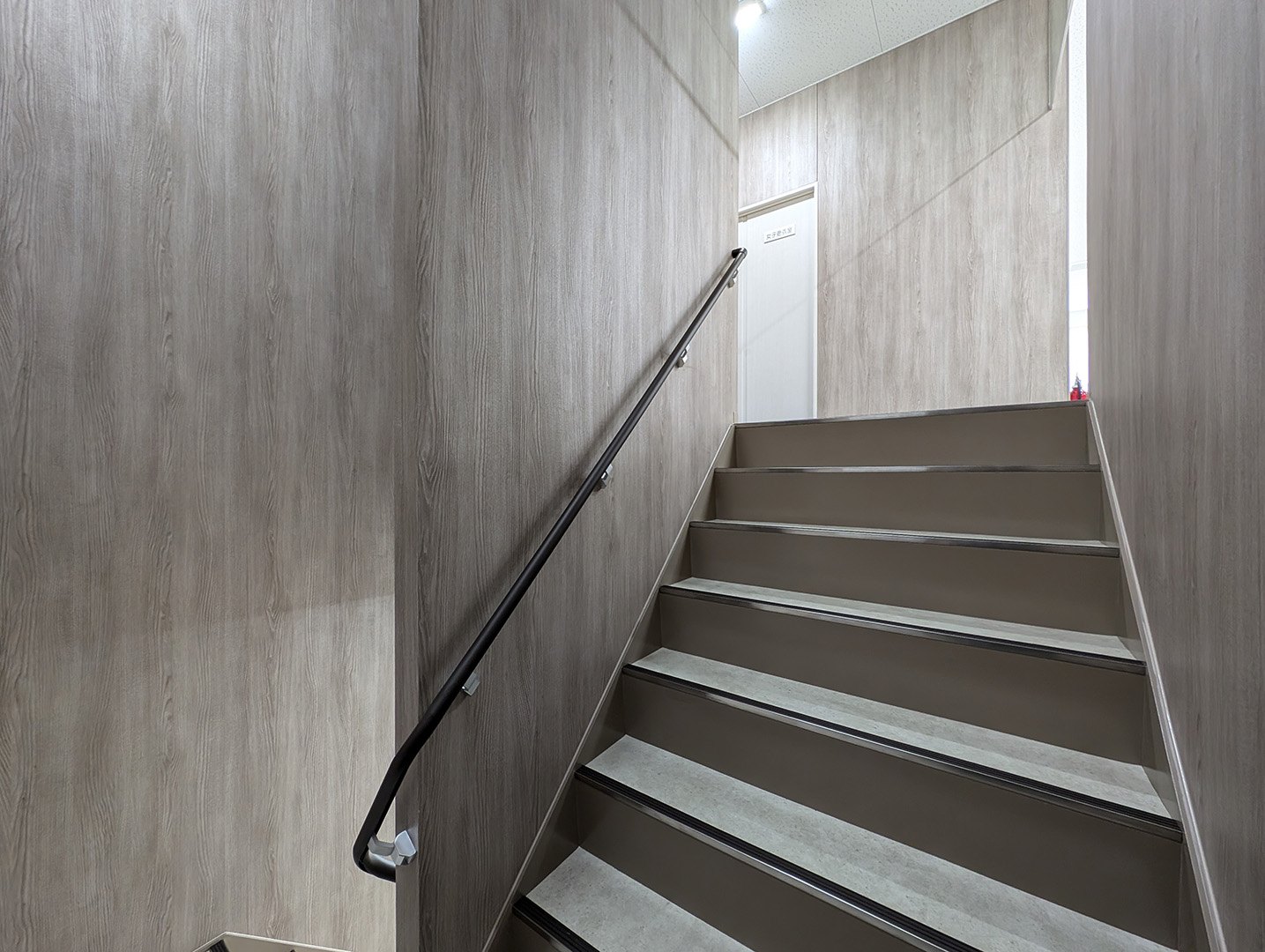 TDシリーズ 「TDシリーズ」 オリエントハウスプレハブシリーズのロングセラーシリーズです。設計の自由度が高くデザイン性の高い建築が可能で、準耐火建築物にも対応しています。シリーズ詳細はこちら>more で施工した事務所棟と倉庫棟です。設計段階では、施主様のご意向を踏まえて、建物の配置や出入り口の位置を慎重に決定。建物の構造には 軽量鉄骨造 「軽量鉄骨造」 主に板厚6mm未満の軽量鋼材を柱・梁などの主要骨組みに使用する鉄骨構造。部材が軽く、工場でのプレハブ化・ユニット化がしやすいため、短工期で高精度な施工が可能。more を採用しながらも、倉庫棟の中2階部分には 重量鉄骨造 「重量鉄骨造」 主にH形鋼などの厚みのある鋼材(板厚6mm以上)を柱・梁などの主要骨組みに使用する鉄骨構造。柱や梁が太く剛性が高いため、大スパンや高層建築、大型倉庫・工場などに適している。軽量鉄骨...more を採用することで、重さのある荷物にも対応した耐久性を確保しました。事務所棟の正面には 風除室 「風除室」 風や外気が直接居室に流入しないよう、建物の玄関前などに設けられる小部屋です。more を設置し、暴風対策や防犯性にも配慮。また、倉庫棟には軽量電動シャッター(高さ3.0m x 幅2.5m)を3か所に設置し、製品の搬入出をスムーズに行える設計としました。シャッター前面には、動線の確保に優れている柱の無い大型の吊り庇(幅16.8 m x 奥行き3.0 m)を採用し、雨の日の作業にも配慮。倉庫棟の 梁下 「梁下」 梁(はり)の下端から床仕上げ面までの高さを示す寸法。意匠的な天井仕上げの高さ(天井高)とは異なり、構造体としての制限寸法を表す。 梁下:梁の下端まで 天井高:内装仕上げ後の天井面ま...more 有効高は5.3mで、広い空間を確保しています。倉庫1階の床面積は177㎡、中2階の床面積55㎡とし、中2階の高さは既存倉庫に合わせ約2.5mに調整しました。外壁には16mm厚の窯業系サイディングを採用し、一部を張り分けることでアクセントをつけたデザインに仕上げています。