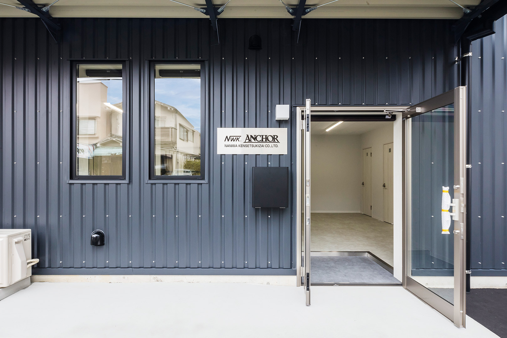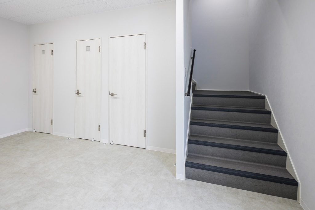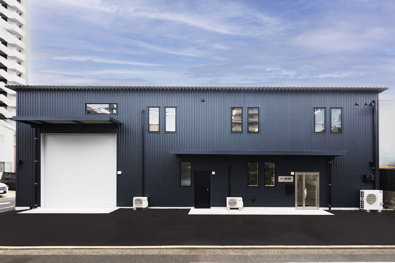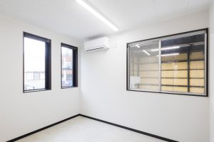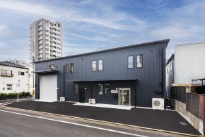 TDシリーズ 「TDシリーズ」 オリエントハウスプレハブシリーズのロングセラーシリーズです。設計の自由度が高くデザイン性の高い建築が可能で、準耐火建築物にも対応しています。シリーズ詳細はこちら>more で設計・施工した事務所兼倉庫です。準 防火地域 「防火地域」 防火や延焼の防止を目的として指定される地域で、構造、屋根、外壁などの材料が厳しく制限される。それ以外では建築基準法22条指定区域という地域もある。more 内での建築計画であったため、耐火性に優れた TDシリーズ 「TDシリーズ」 オリエントハウスプレハブシリーズのロングセラーシリーズです。設計の自由度が高くデザイン性の高い建築が可能で、準耐火建築物にも対応しています。シリーズ詳細はこちら>more を採用し、安全性を確保しました。防犯性を考慮し、窓を最小限の数に抑え、1階の倉庫には縦長の FIX窓 「FIX窓」 開閉しない固定窓です。採光や眺望の確保に適しています。more を、2階の事務所には縦すべり出し窓を採用。事務所には OAフロア 「OAフロア」 事務所向けの二重床です。床下にLANや電源を収め、レイアウト変更にも柔軟に対応可能です。フリーアクセスフロアとも呼ばれます。more を採用し、床下配線をすっきりと隠すことで快適な作業環境を実現しました。 梁下 「梁下」 梁(はり)の下端から床仕上げ面までの高さを示す寸法。意匠的な天井仕上げの高さ(天井高)とは異なり、構造体としての制限寸法を表す。 梁下:梁の下端まで 天井高:内装仕上げ後の天井面ま...more 高5.9mの倉庫には幅4m×高さ4mの軽量電動シャッターを設置し、倉庫2階部分はフォークリフトを使用した荷下ろしが可能な高さに調整しています。外壁には耐久性とデザイン性を兼ね備えた金属角波サイディングを採用し、シンプルかつ機能的な仕上がりとなっています。