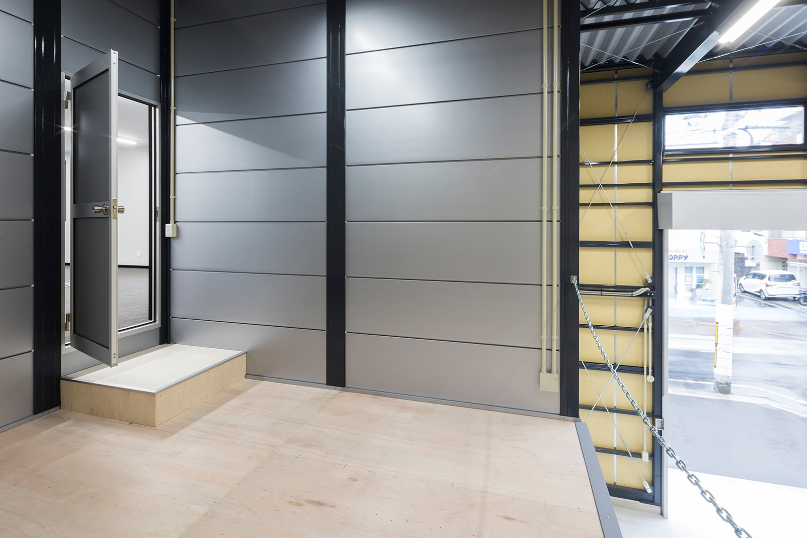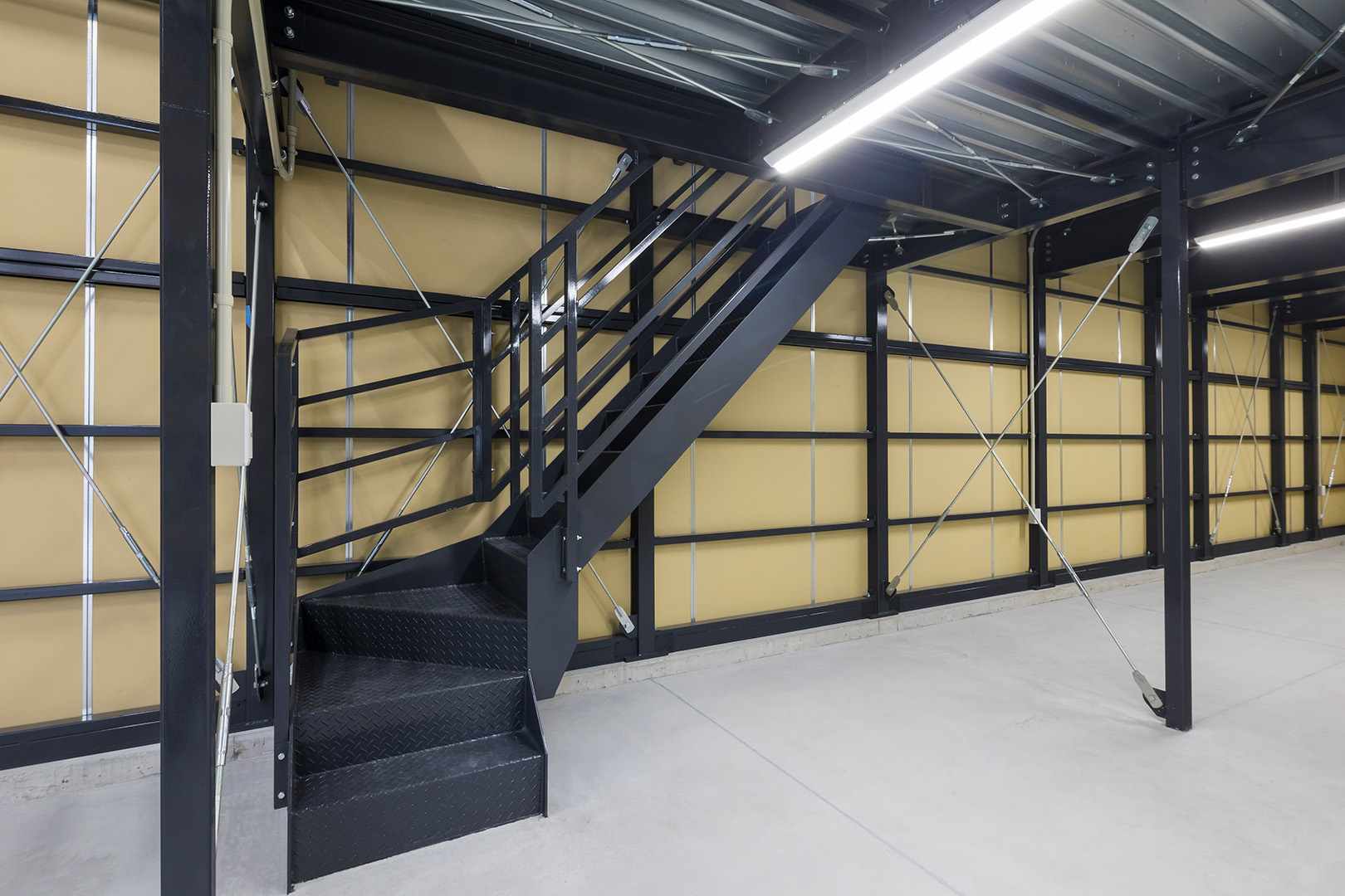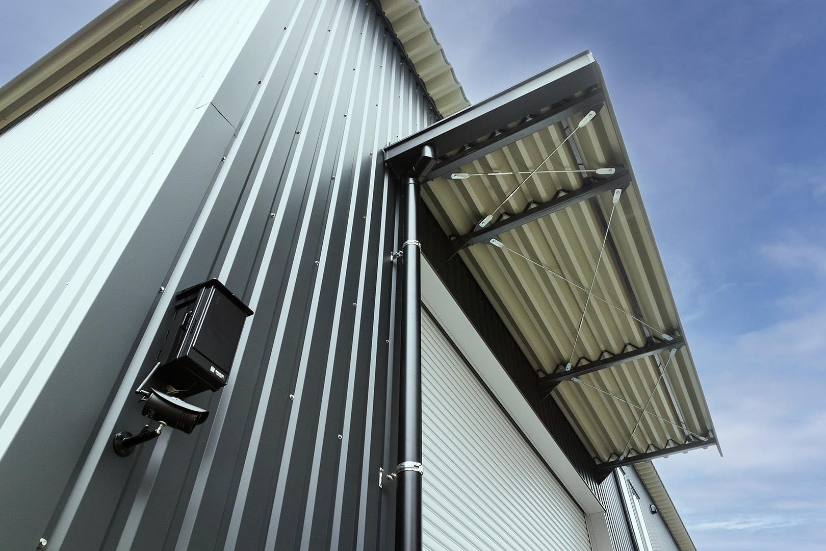 TDシリーズ 「TDシリーズ」 オリエントハウスプレハブシリーズのロングセラーシリーズです。設計の自由度が高くデザイン性の高い建築が可能で、準耐火建築物にも対応しています。シリーズ詳細はこちら>more で設計・施工した事務所兼倉庫です。準 防火地域 「防火地域」 防火や延焼の防止を目的として指定される地域で、構造、屋根、外壁などの材料が厳しく制限される。それ以外では建築基準法22条指定区域という地域もある。more 内での建築計画であったため、耐火性に優れた TDシリーズ 「TDシリーズ」 オリエントハウスプレハブシリーズのロングセラーシリーズです。設計の自由度が高くデザイン性の高い建築が可能で、準耐火建築物にも対応しています。シリーズ詳細はこちら>more を採用し、安全性を確保しました。防犯性を考慮し、窓を最小限の数に抑え、1階の倉庫には縦長の FIX窓 「FIX窓」 開閉しない固定窓です。採光や眺望の確保に適しています。more を、2階の事務所には縦すべり出し窓を採用。事務所には OAフロア 「OAフロア」 事務所向けの二重床です。床下にLANや電源を収め、レイアウト変更にも柔軟に対応可能です。フリーアクセスフロアとも呼ばれます。more を採用し、床下配線をすっきりと隠すことで快適な作業環境を実現しました。 梁下 「梁下」 梁(はり)の下端から床仕上げ面までの高さを示す寸法。意匠的な天井仕上げの高さ(天井高)とは異なり、構造体としての制限寸法を表す。 梁下:梁の下端まで 天井高:内装仕上げ後の天井面ま...more 高5.9mの倉庫には幅4m×高さ4mの軽量電動シャッターを設置し、倉庫2階部分はフォークリフトを使用した荷下ろしが可能な高さに調整しています。外壁には耐久性とデザイン性を兼ね備えた金属角波サイディングを採用し、シンプルかつ機能的な仕上がりとなっています。