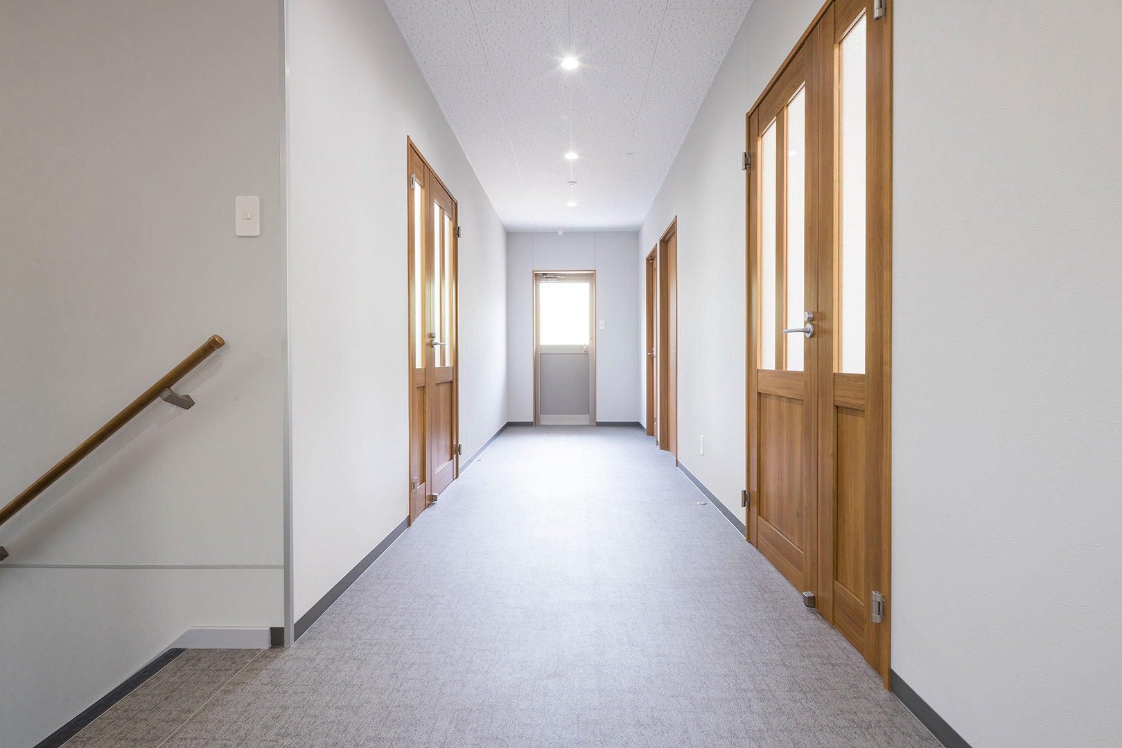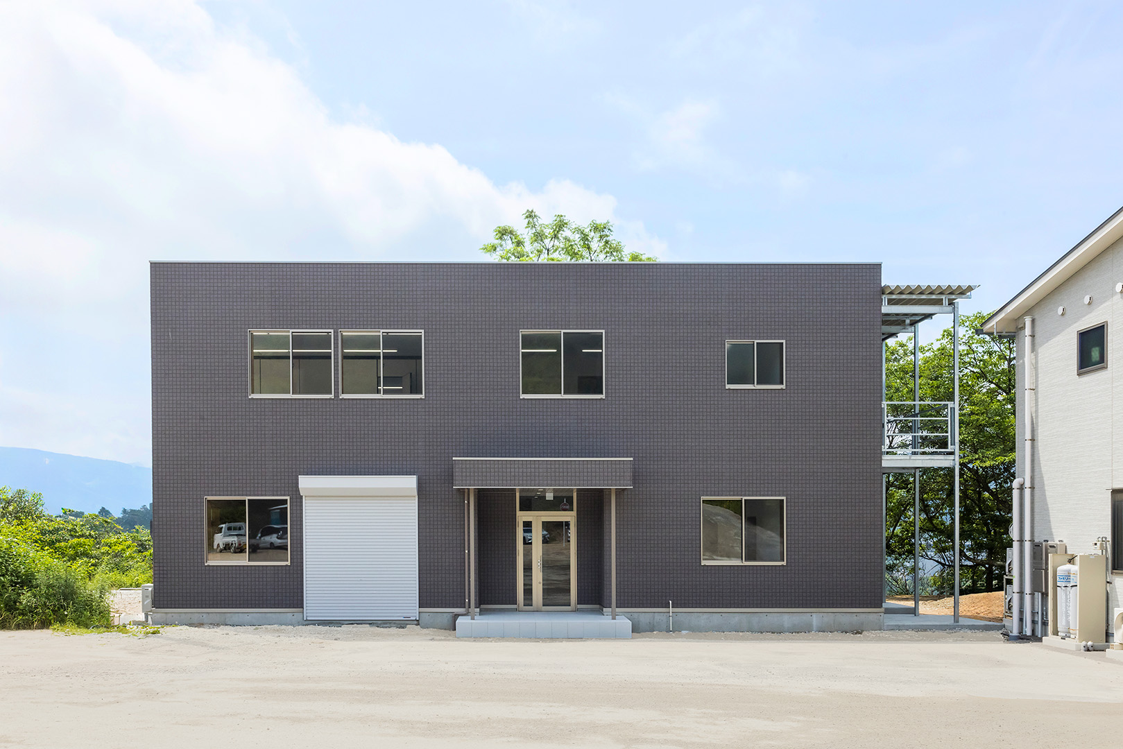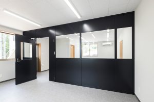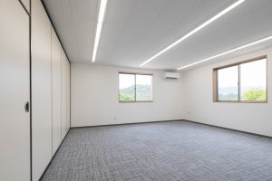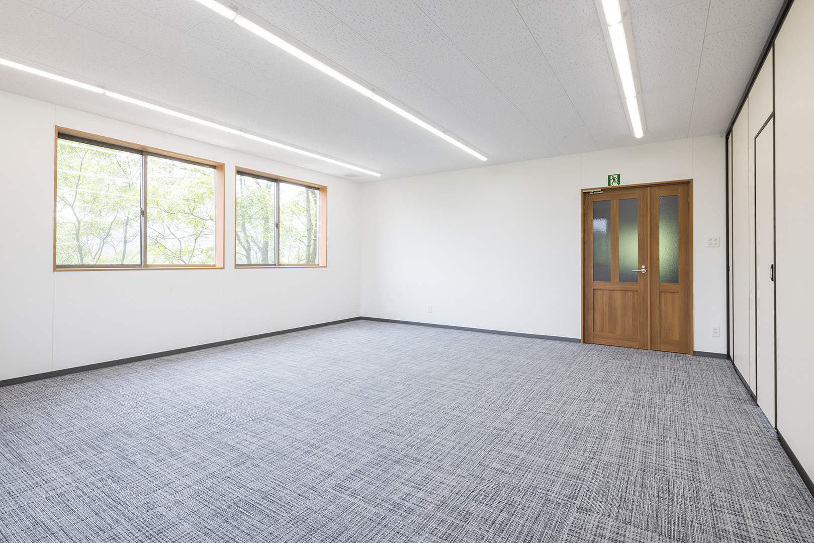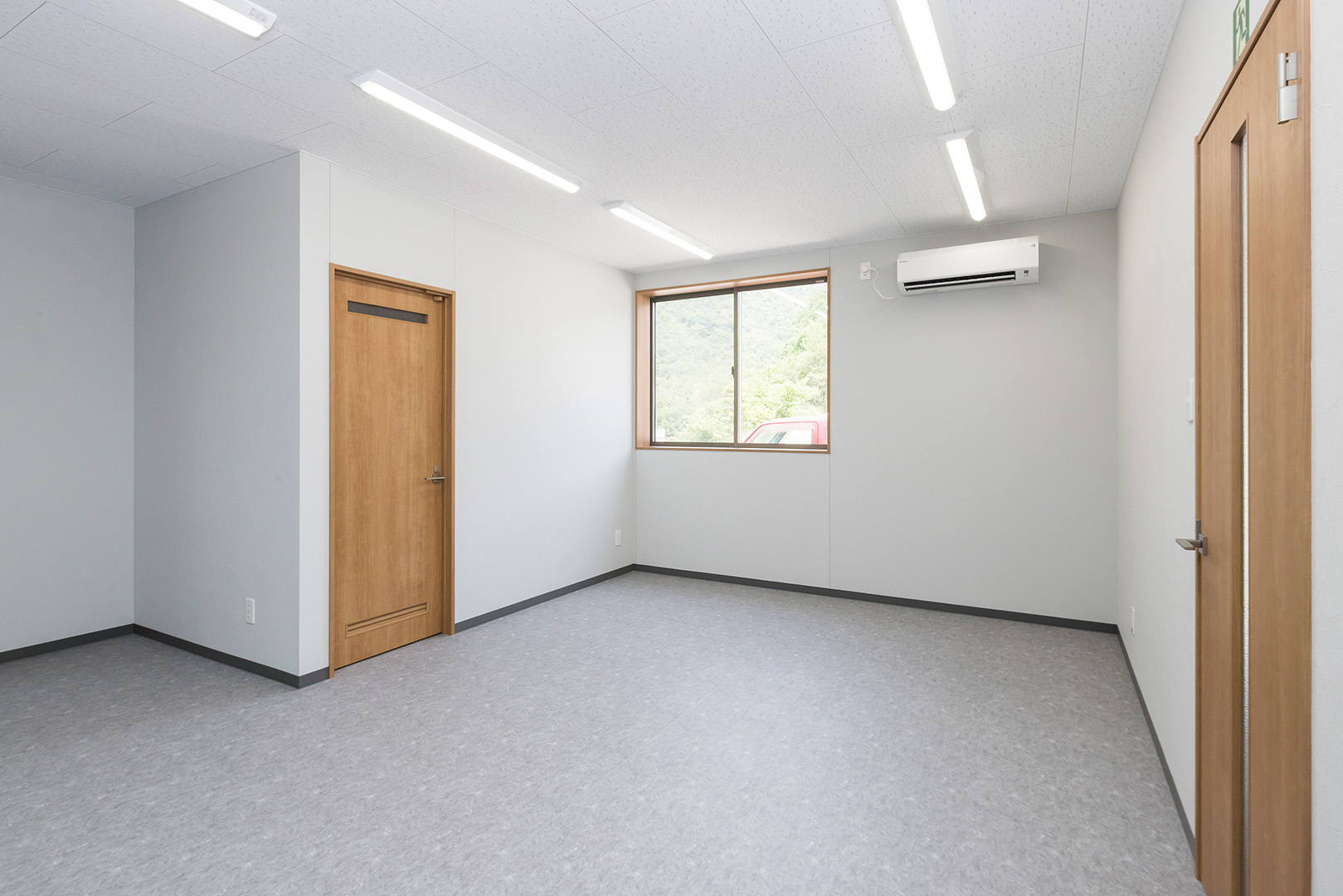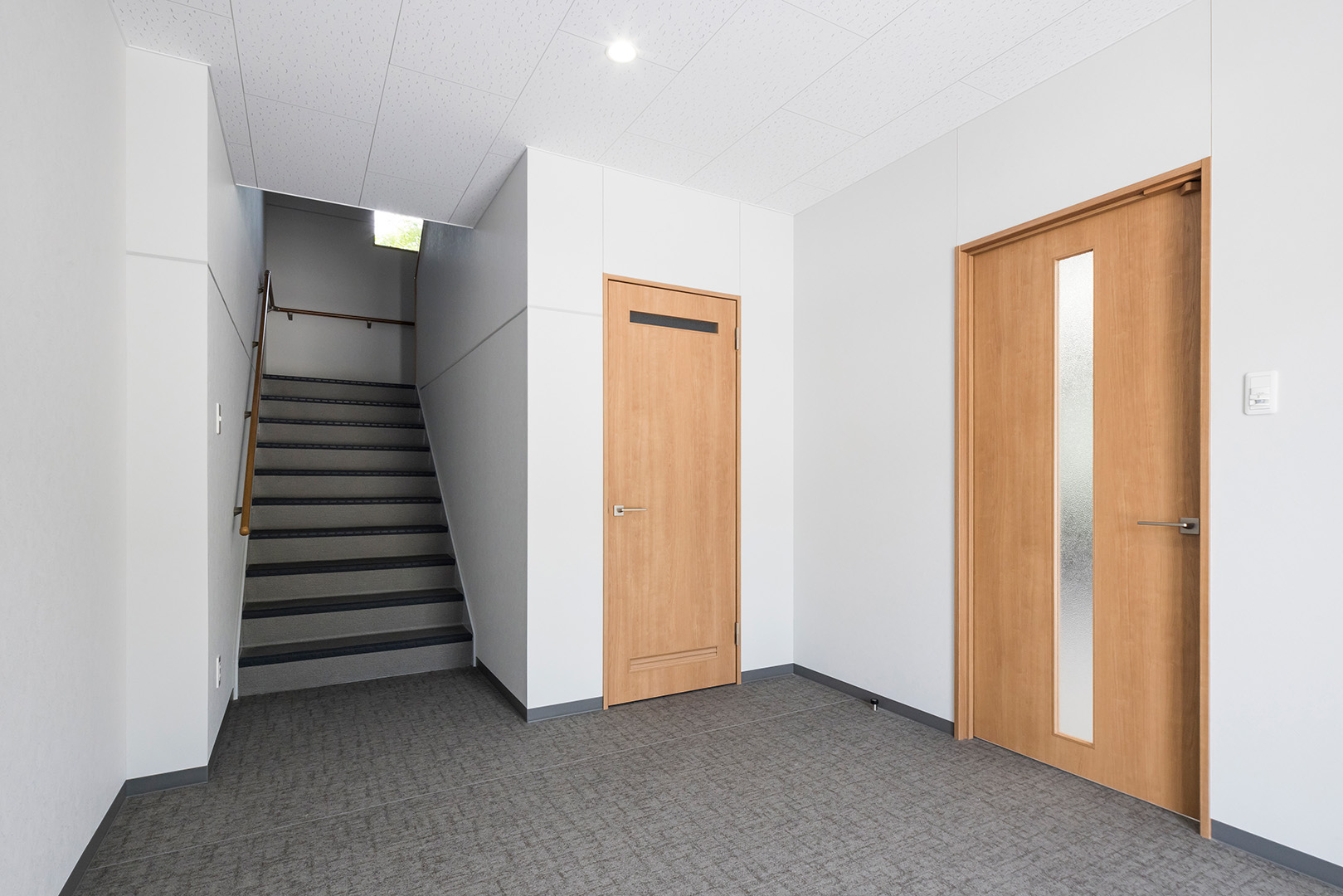 TDシリーズ 「TDシリーズ」 オリエントハウスプレハブシリーズのロングセラーシリーズです。設計の自由度が高くデザイン性の高い建築が可能で、準耐火建築物にも対応しています。シリーズ詳細はこちら>more で設計・施工した事務所です。社内会議や研修、来客対応などに活用できる施設として計画されました。会議室のほか、給湯室やお手洗いを配置し、木目の建具を採用することで温かみのある内装に仕上げています。2階の大会議室は可動式間仕切りを備え、用途に応じたレイアウト変更が可能です。建物前面には幅2.2m×高さ2.5mの軽量バランスシャッターを設置。外壁には落ち着いた色合いの窯業系サイディングを使用し、調和のとれた外観に仕上げました。玄関庇には通常の鼻隠しではなく、外壁と同じサイディングを使用し、建物との一体感を持たせています。また、軒裏にはガルバリウム鋼板を採用し、上質な印象を演出しました。