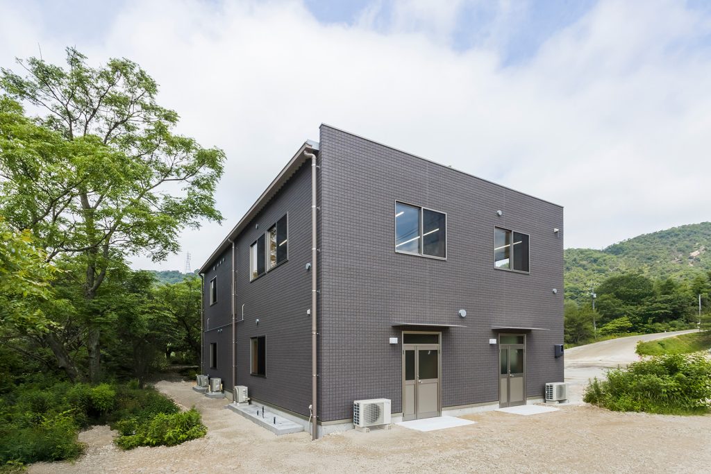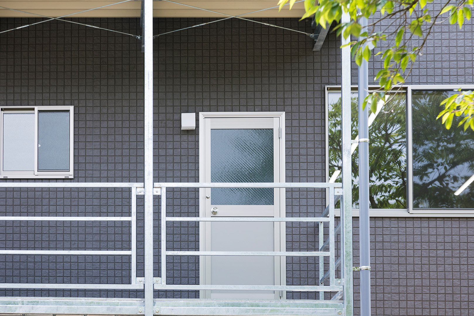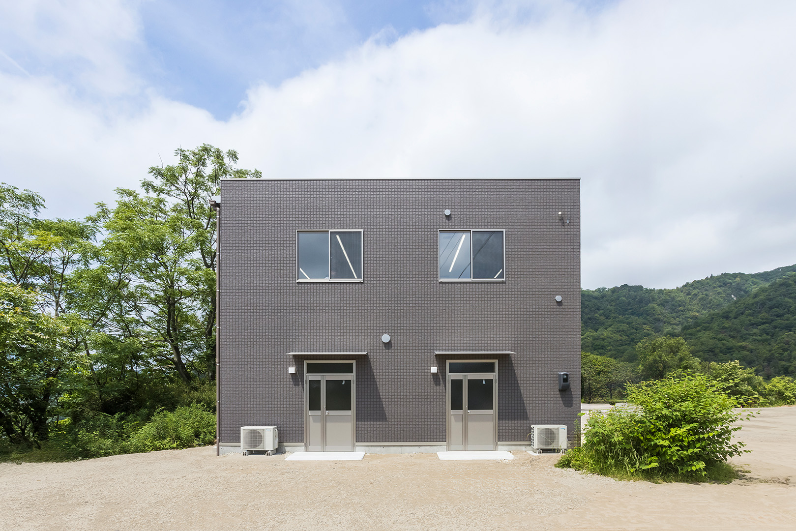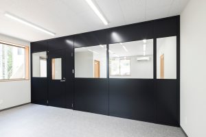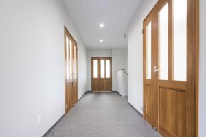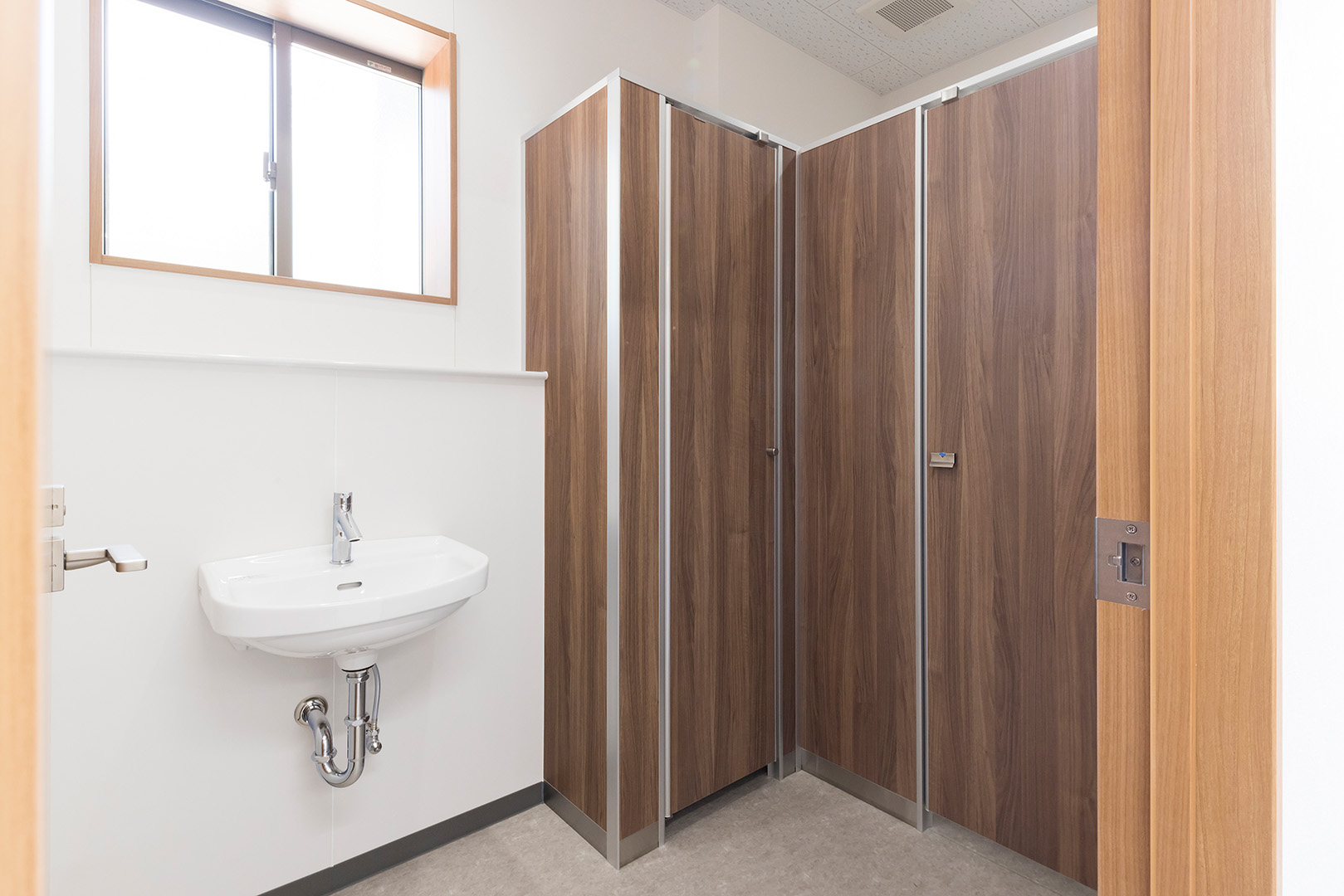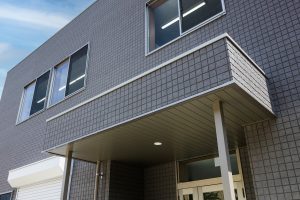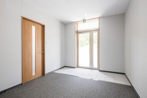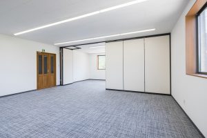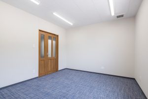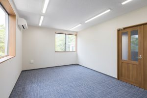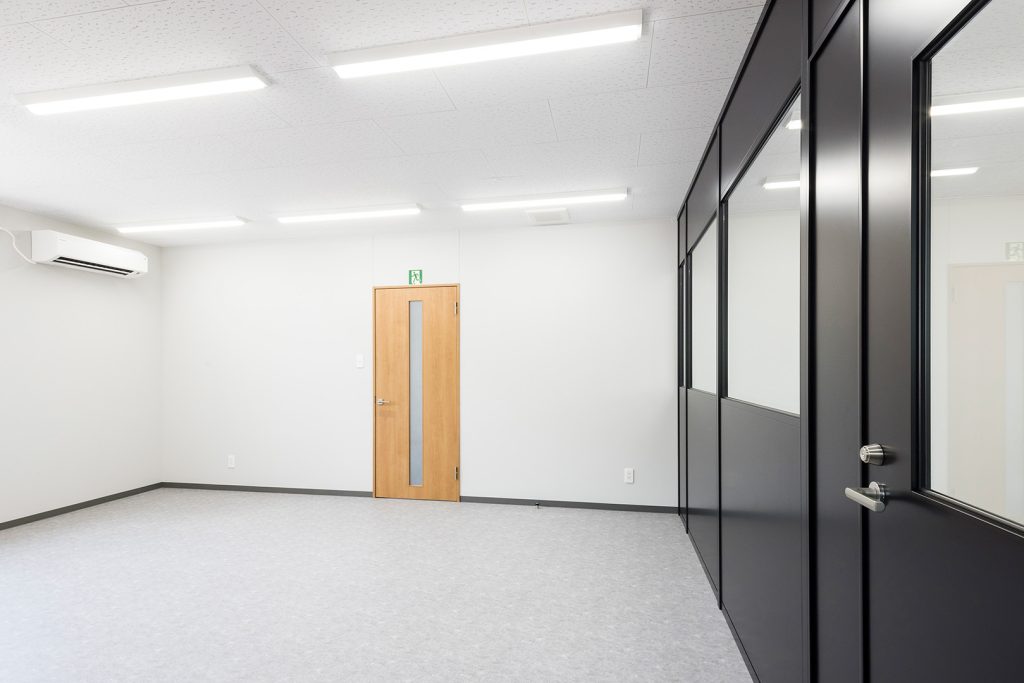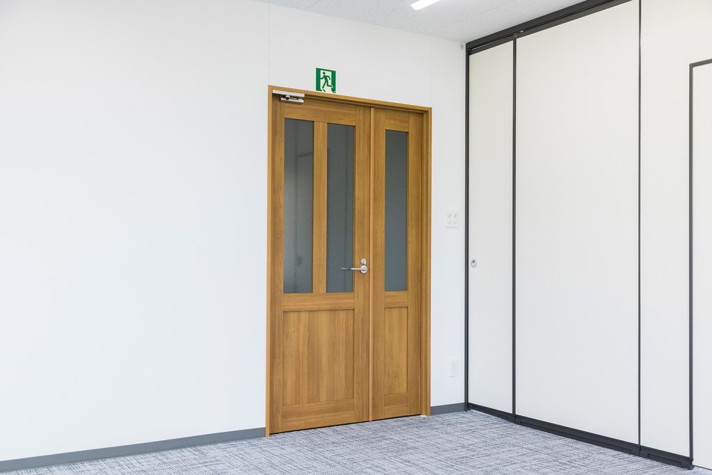 TDシリーズ 「TDシリーズ」 オリエントハウスプレハブシリーズのロングセラーシリーズです。設計の自由度が高くデザイン性の高い建築が可能で、準耐火建築物にも対応しています。シリーズ詳細はこちら>more で設計・施工した事務所です。社内会議や研修、来客対応などに活用できる施設として計画されました。会議室のほか、給湯室やお手洗いを配置し、木目の建具を採用することで温かみのある内装に仕上げています。2階の大会議室は可動式間仕切りを備え、用途に応じたレイアウト変更が可能です。建物前面には幅2.2m×高さ2.5mの軽量バランスシャッターを設置。外壁には落ち着いた色合いの窯業系サイディングを使用し、調和のとれた外観に仕上げました。玄関庇には通常の鼻隠しではなく、外壁と同じサイディングを使用し、建物との一体感を持たせています。また、軒裏にはガルバリウム鋼板を採用し、上質な印象を演出しました。