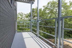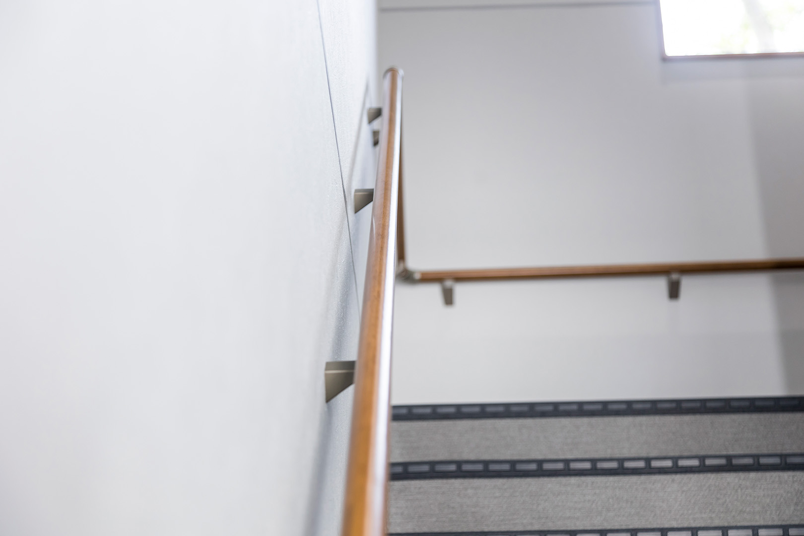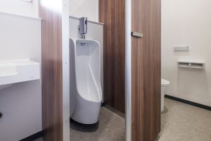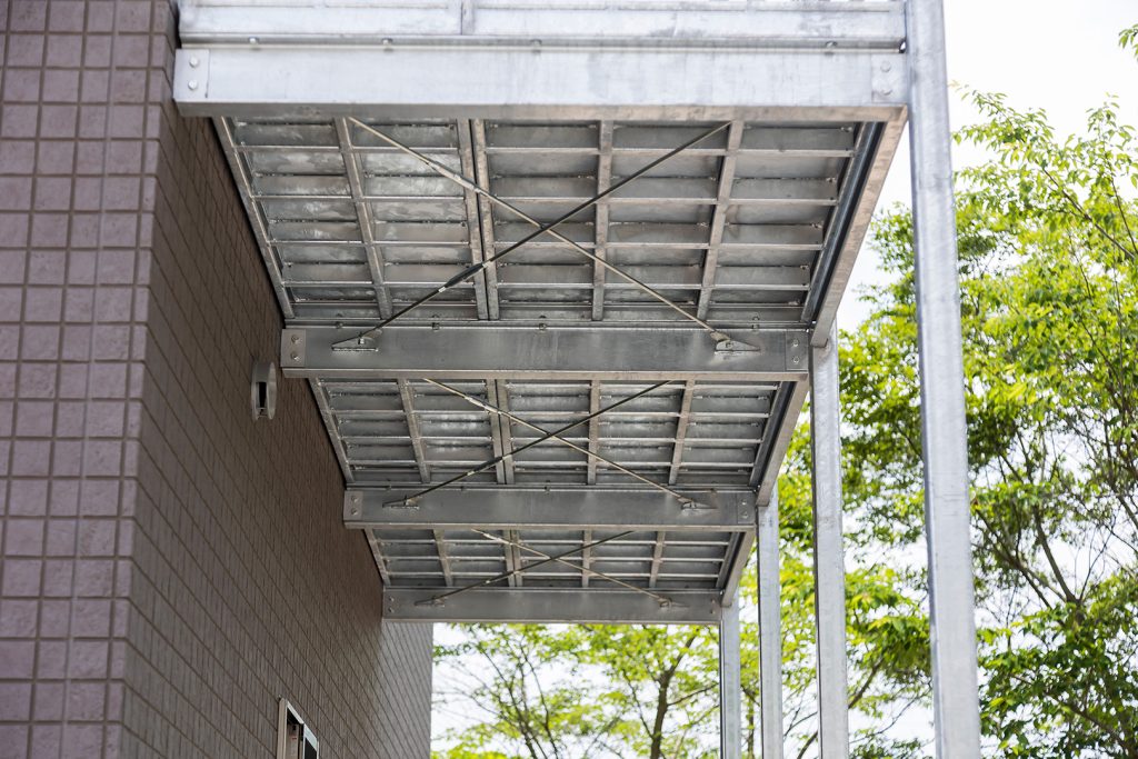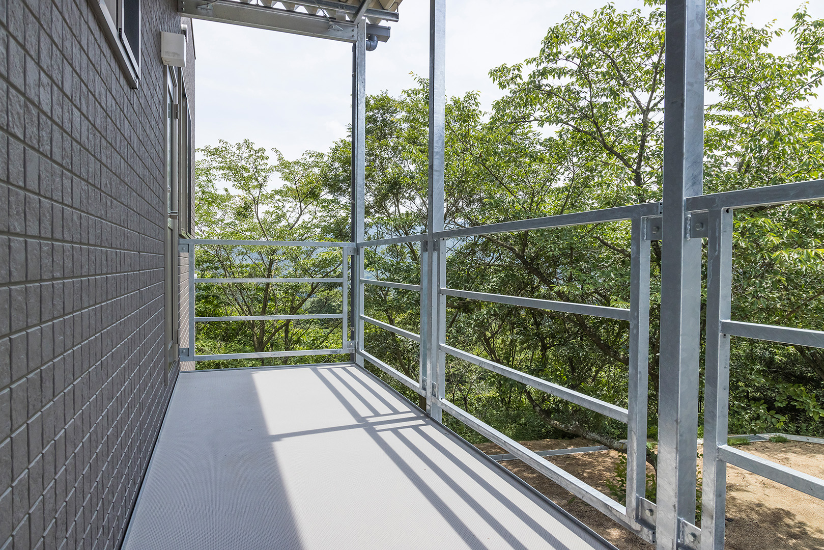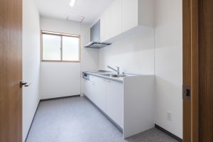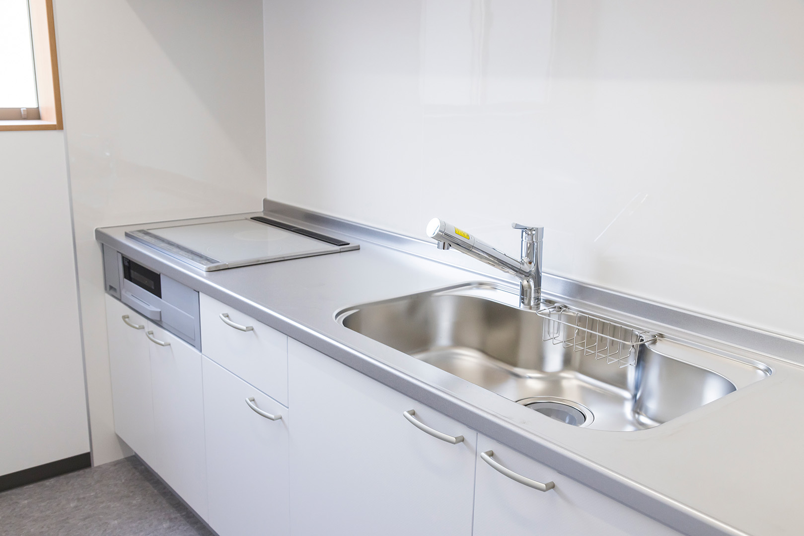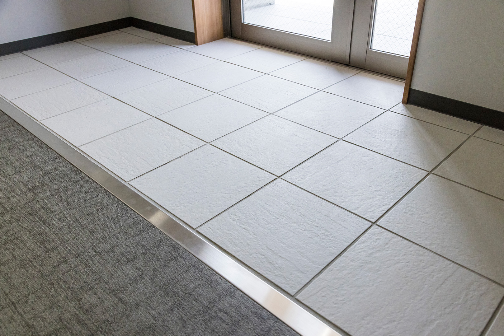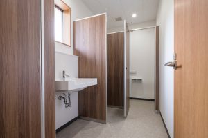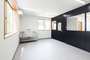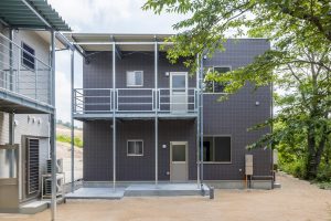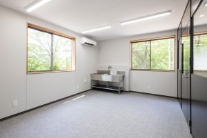 TDシリーズ 「TDシリーズ」 オリエントハウスプレハブシリーズのロングセラーシリーズです。設計の自由度が高くデザイン性の高い建築が可能で、準耐火建築物にも対応しています。シリーズ詳細はこちら>more で設計・施工した事務所です。社内会議や研修、来客対応などに活用できる施設として計画されました。会議室のほか、給湯室やお手洗いを配置し、木目の建具を採用することで温かみのある内装に仕上げています。2階の大会議室は可動式間仕切りを備え、用途に応じたレイアウト変更が可能です。建物前面には幅2.2m×高さ2.5mの軽量バランスシャッターを設置。外壁には落ち着いた色合いの窯業系サイディングを使用し、調和のとれた外観に仕上げました。玄関庇には通常の鼻隠しではなく、外壁と同じサイディングを使用し、建物との一体感を持たせています。また、軒裏にはガルバリウム鋼板を採用し、上質な印象を演出しました。
