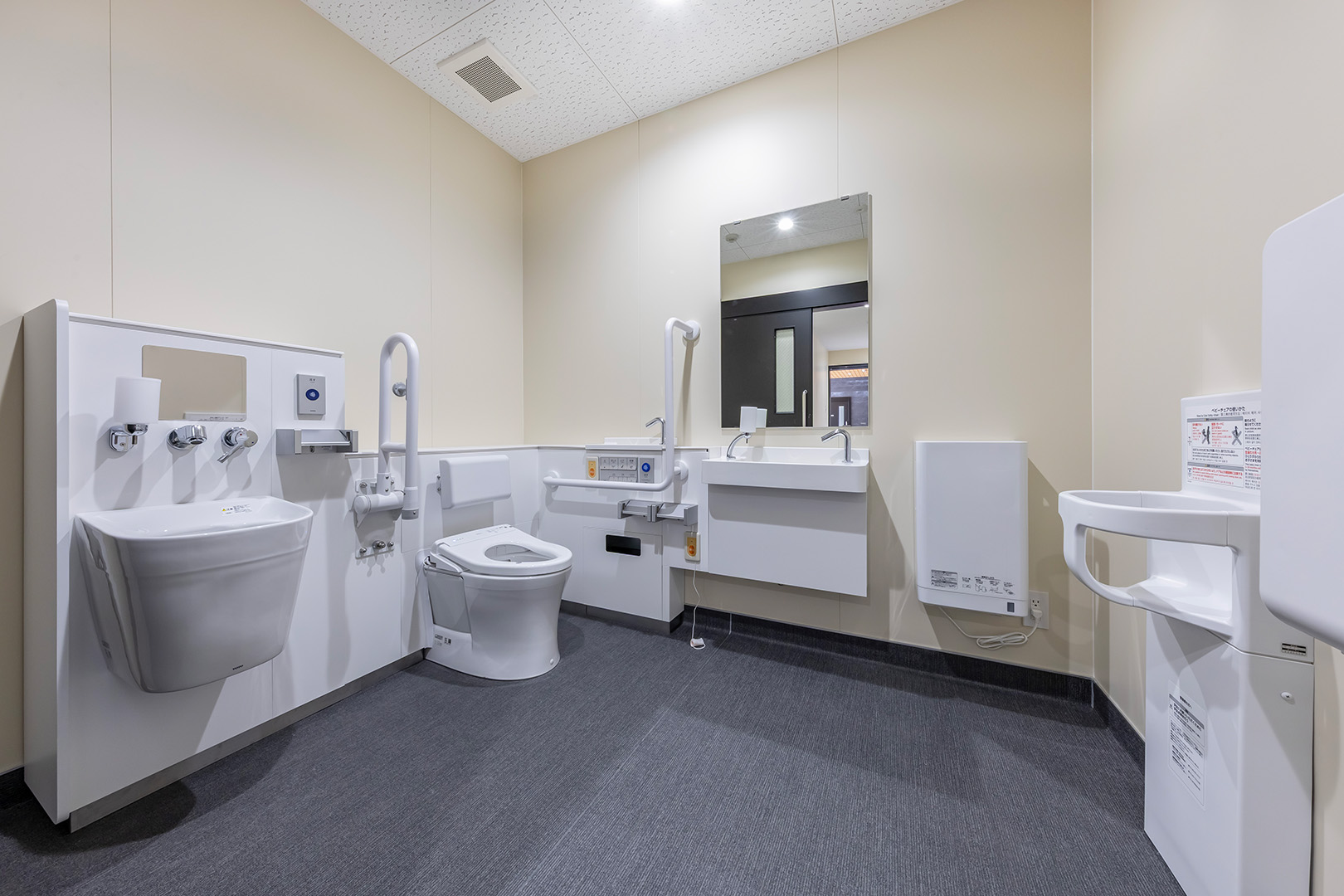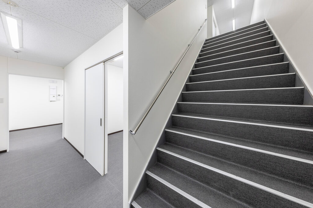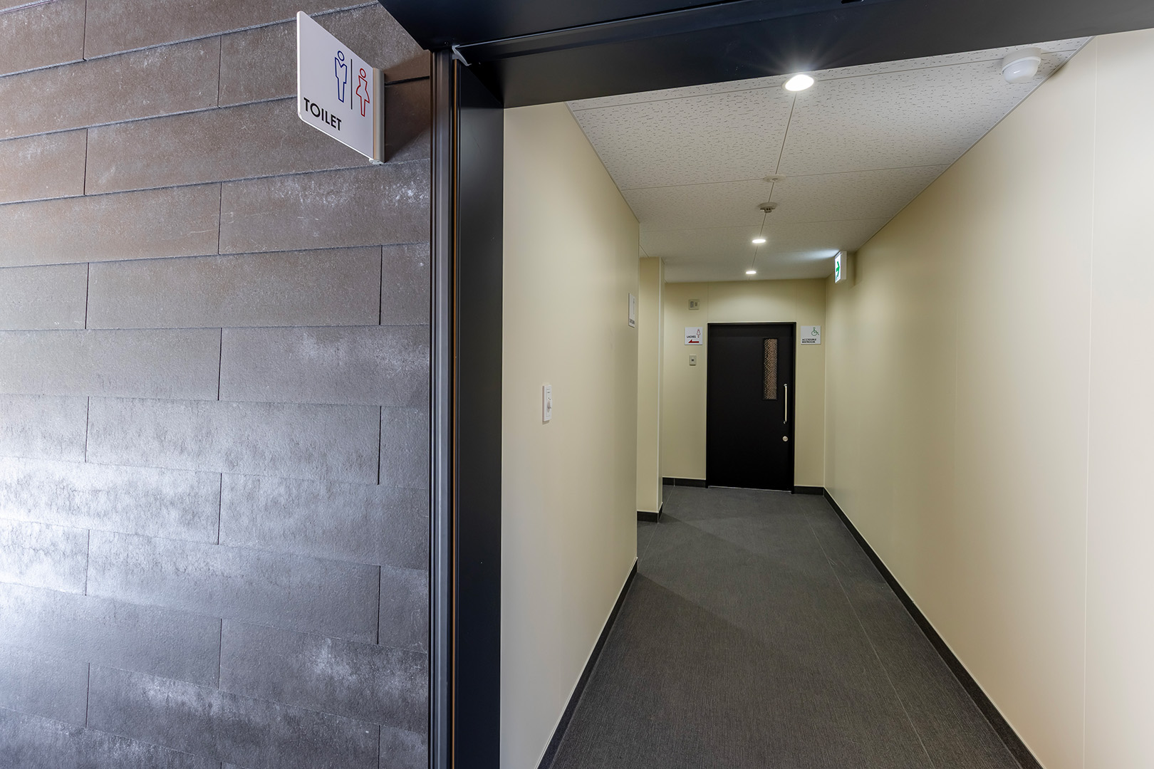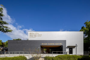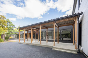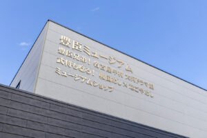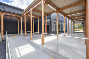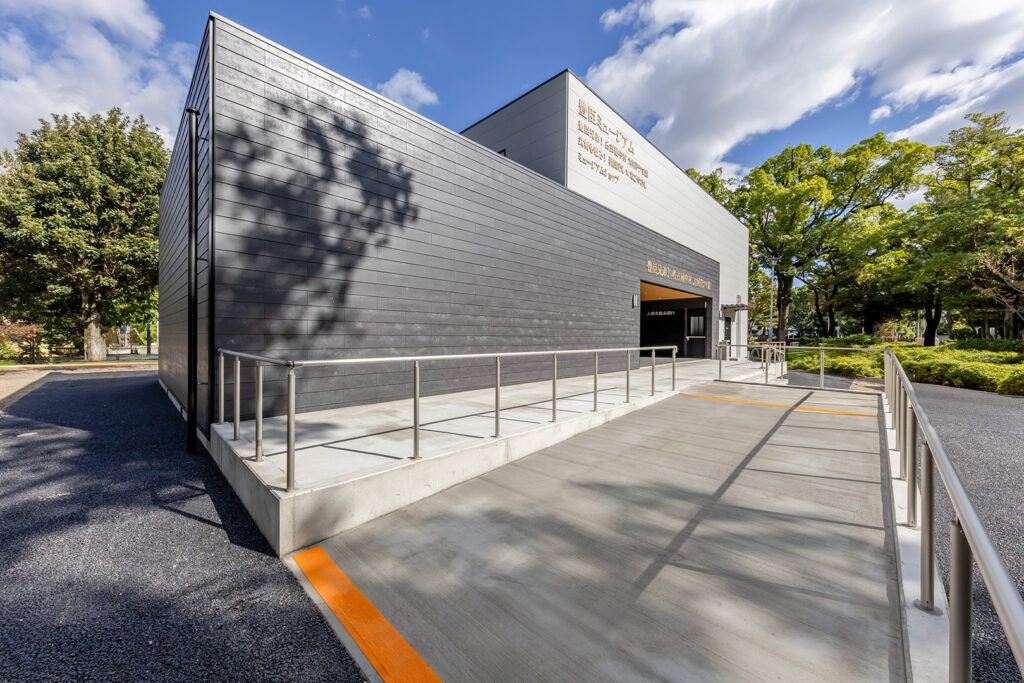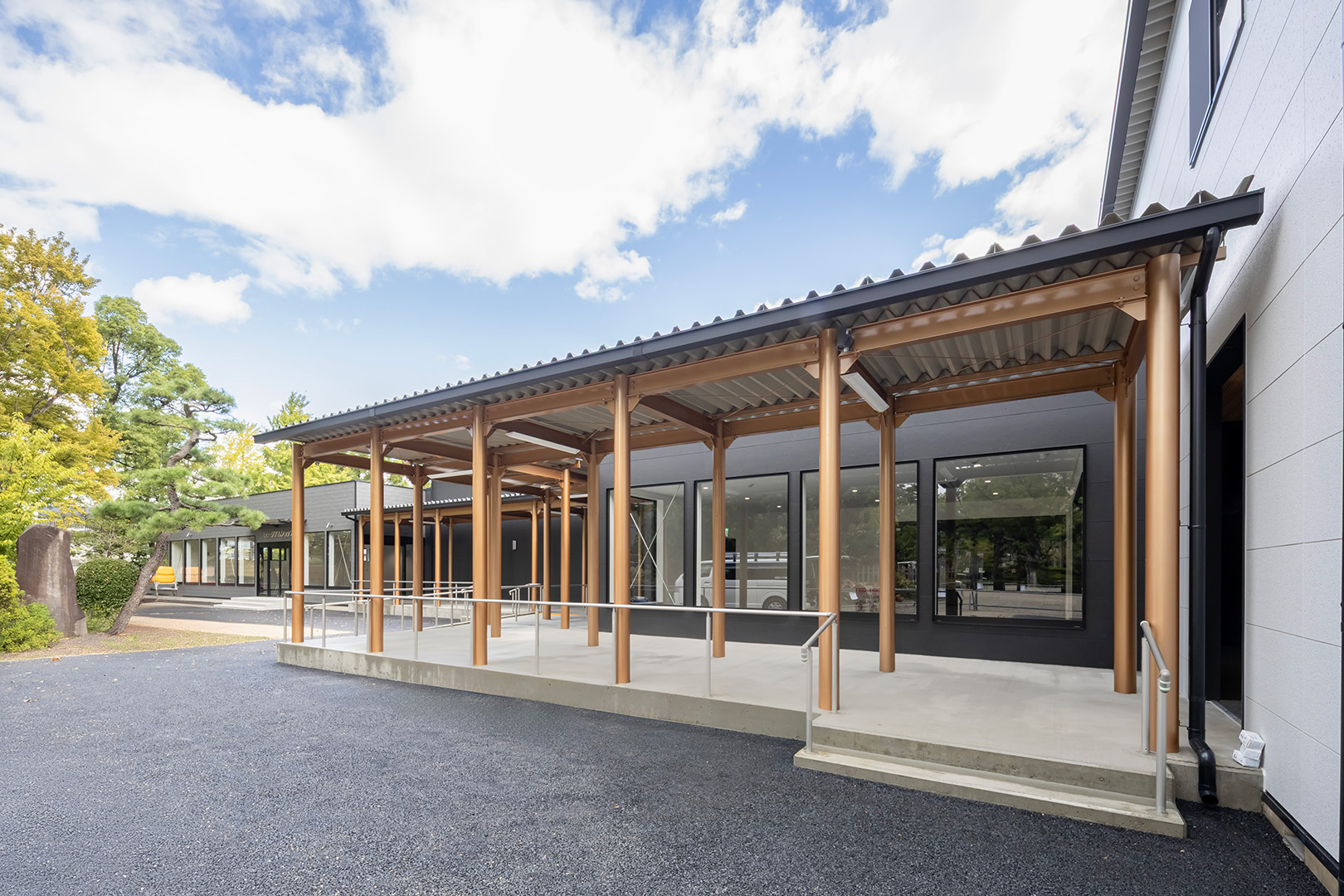 外装は、公園景観に調和する無彩色の窯業系サイディングを基調とし、アクセントとして素材感を活かした建材であるKMEW「SOLIDO typeM_LAP 鉄黒」を採用。尾張名古屋が輩出した豊臣兄弟をはじめとした、数々の名だたる戦国武将の甲冑を連想させる鎧張りの意匠としています。また、物販棟とピロティを繋ぐ渡り廊下の鉄骨部分には、公園内に設置された豊臣秀吉生誕地のシンボルであるひょうたんと同じ金色を用いて塗装し、地域の象徴的な色を採り入れた印象的なアクセントとしました。