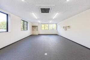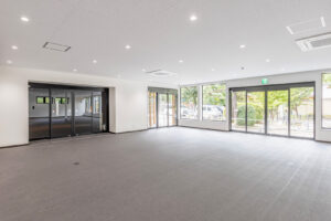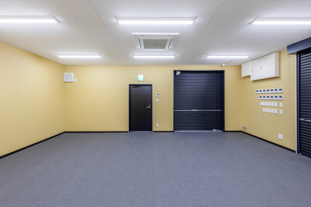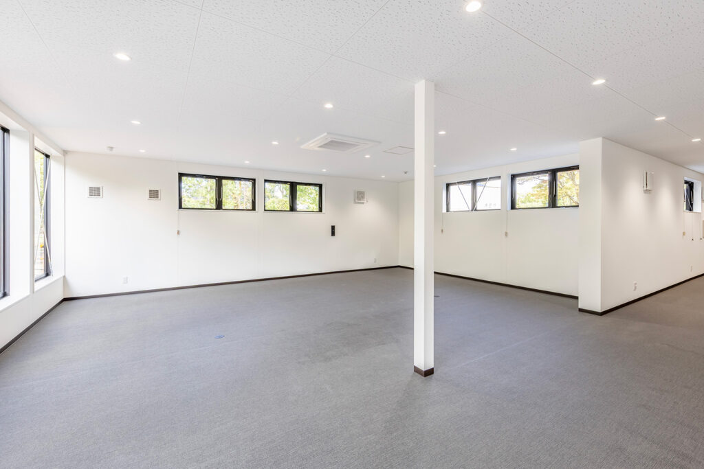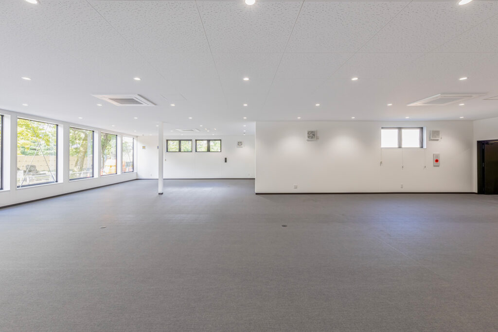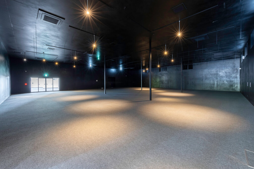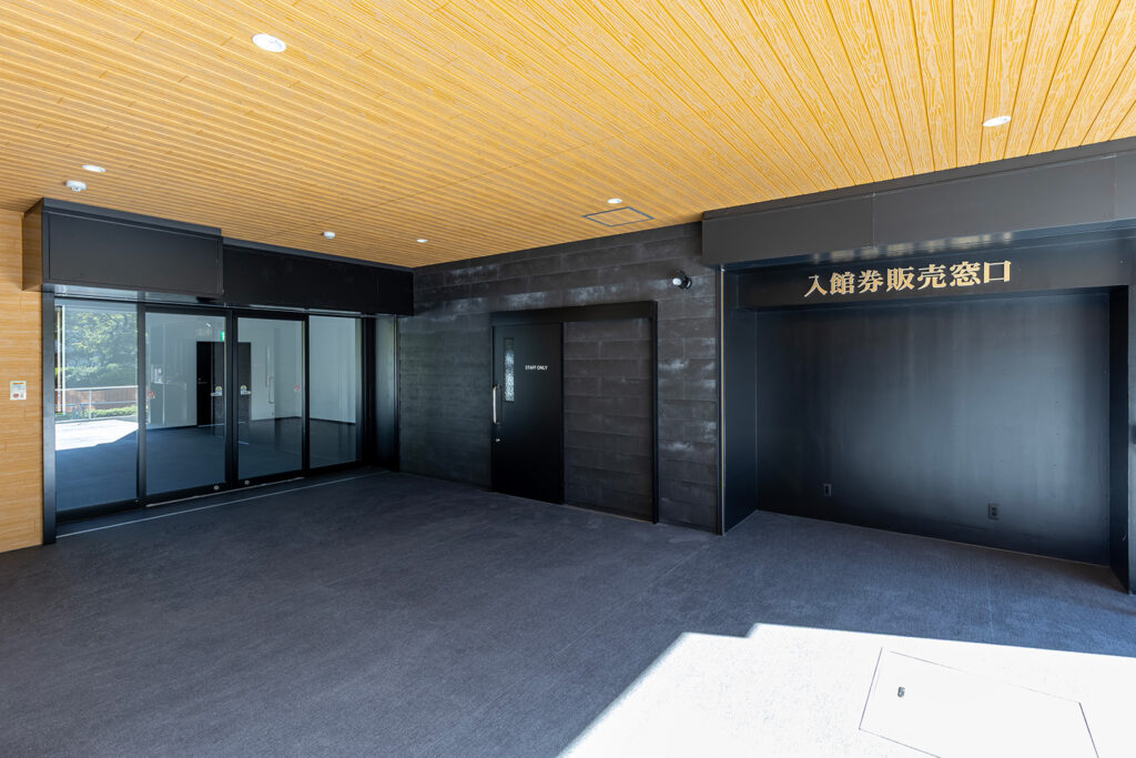 約450㎡のメイン展示室ではブレースを設けず、内部は4本の中柱のみで成立する架構を採用することで、展示物を自由に配置できる大空間を実現しました。各棟を構造的に独立させることで用途に応じた計画が可能となり、天井高については展示室4.5m、物販棟2.7m、事務所棟2.4mとそれぞれ用途に適した高さに設定しています。